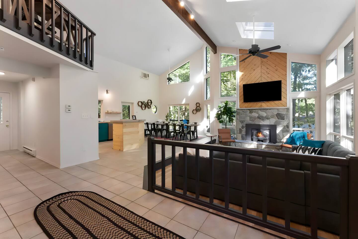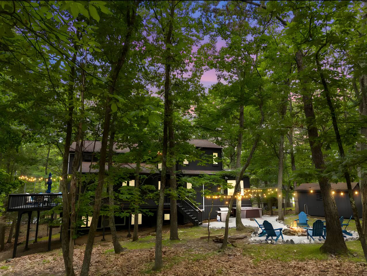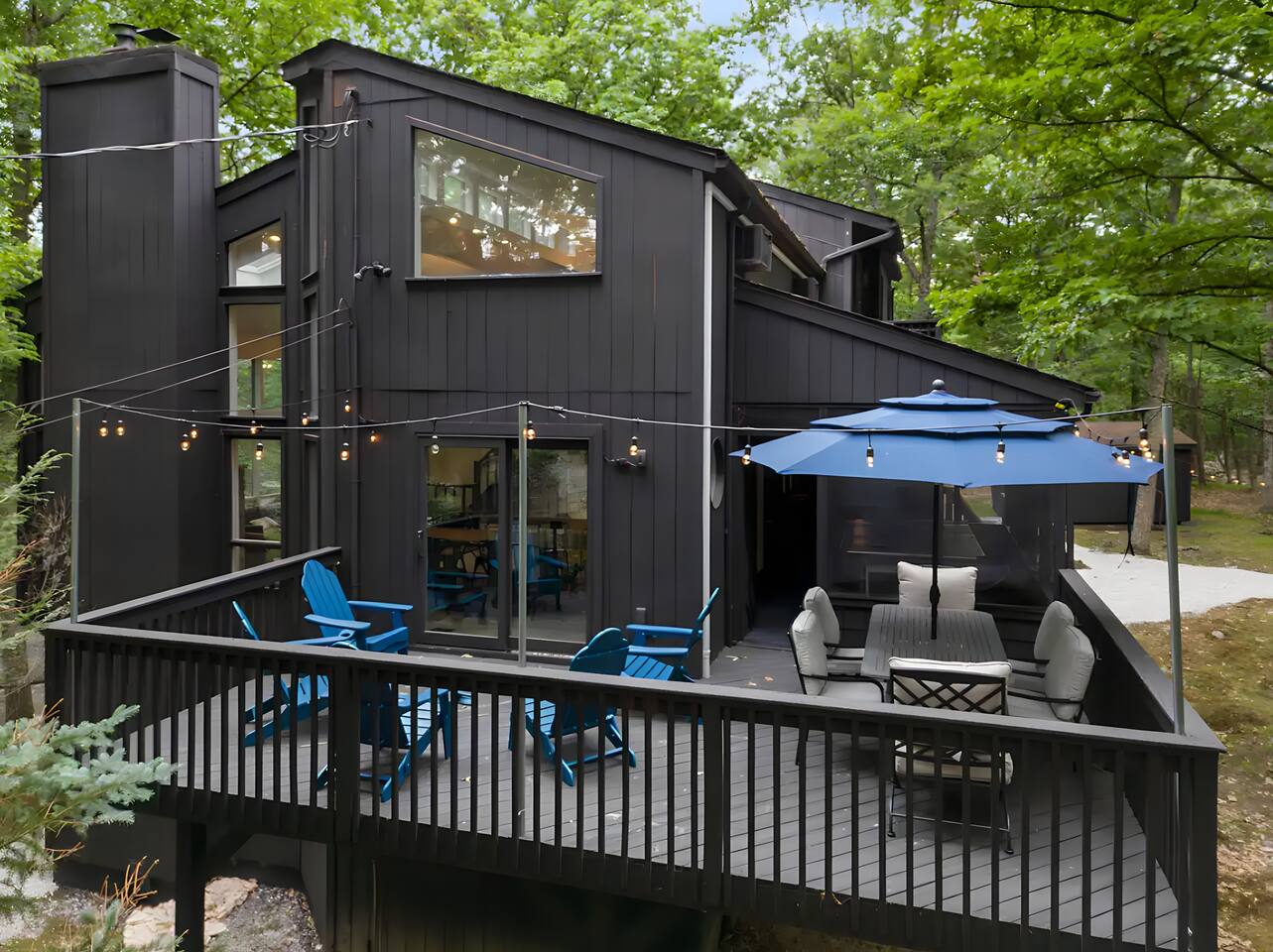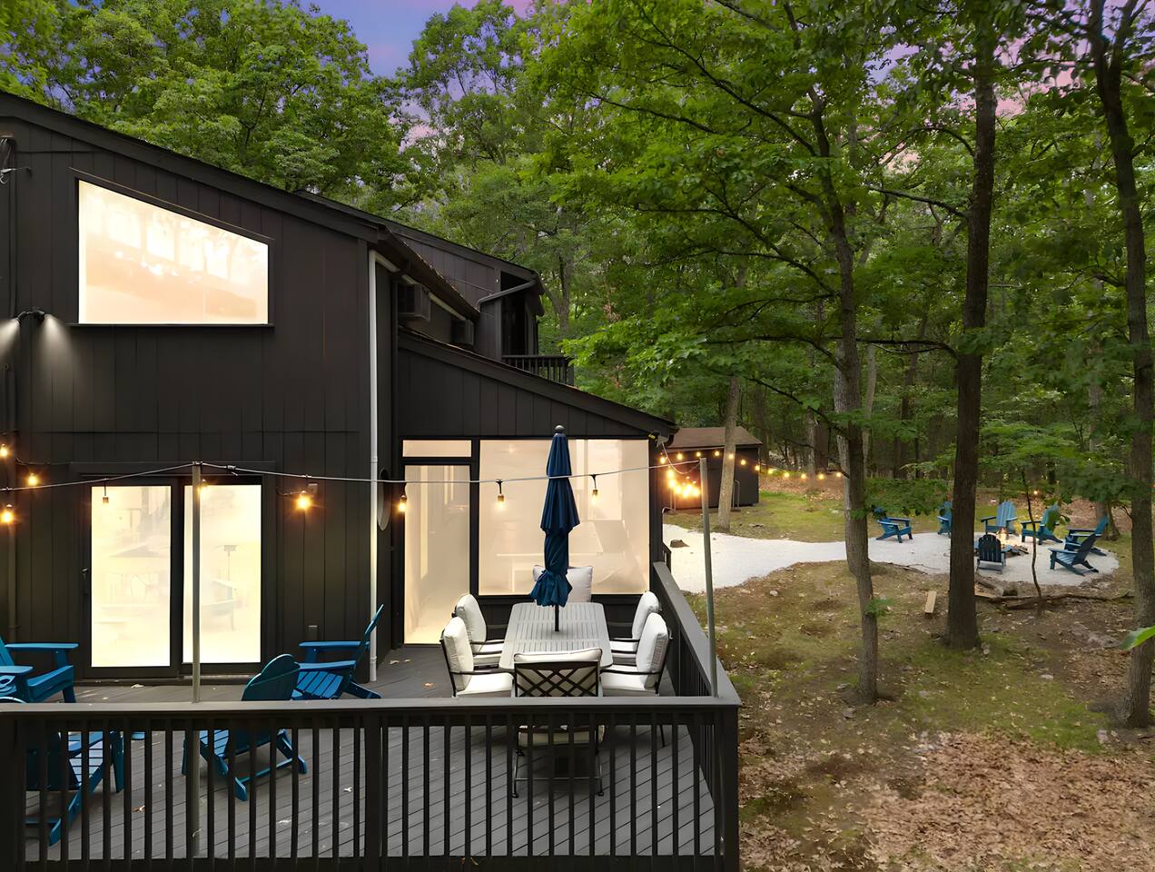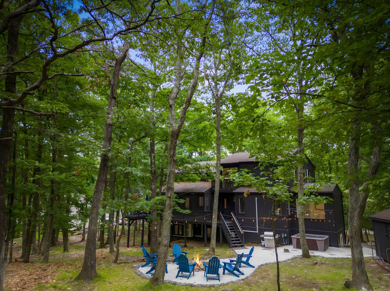 **During the summer months (Memorial Day weekend - Labor Day weekend), you will receive amenity badges that allow you to access the following amenities. If you’re staying with us outside of these dates, these amenities will be closed.** ☀ Lakes (with beach access - swimming allowed!) ☀ Pools ☀ Tennis courts ☀ Basketball courts ☀ Volleyball courts ☀ Dog park ☀ Playground areas KEY FEATURES: ☀ 5 beautiful bedrooms with comfortable beds; 1 king, 4 queens ☀ 4 full bathrooms; one on every floor! ☀ Completely remodeled kitchen with new, modern appliances ☀ Absolutely stunning living area; high vaulted ceilings & tons of comfy seating ☀ Enough dining space for a whole village; seating up to 12! ☀ Massive back deck with tons of seating & outdoor grill ☀ Screened-in porch with ping pong ☀ Speakeasy-themed lower level with wet bar, dining, & pool table ☀ Bonus game room with arcade games right off of the speakeasy! ☀ Additional fun loft with foosball & air hockey! Here Are A Few Kind Words From Our Past Guests: “This was a great place to stay! The morning light through the windows was so beautiful. Overall, just a relaxing experience. The hosts were super responsive whenever I had a question. I would stay again!” - Emily “Sabrina was very accommodating and communicative. the house is beautiful and very comfortable, close to nature hikes.” - Jennifer “This place was lovely! Exactly as pictured! Very clean and excellent host experience!!! I plan to come back again!” - Regina ☆☆ BEDROOMS ☆☆ This home has five bedrooms spread across all floors. On the main level, the master bedroom is equipped with a king bed & master ensuite, with large windows & breathtaking views of the surrounding Poconos nature. Right down the hall is the second bedroom, with one queen bunkbed & access to a hallway bathroom. Just upstairs, you will find one bedroom with two queen beds & another with one queen bed. These two bedrooms share one full bathroom right across the hallway. ☆☆ BATHROOMS ☆☆ You will have bathroom access on each floor of this massive house! Right off of the speakeasy on the bottom floor, you will find one of the full bathrooms. On the second level, the master bedroom has its own private ensuite bathroom, with a separate tub & standing shower. Right down the hallway from the master is another modern, full bathroom. On the top level, the two bedrooms share yet another beautiful, completely remodeled full bathroom. ☆☆ KITCHEN & DINING ☆☆ The majority of the main level is dedicated to the central living area of the home, which includes the kitchen & dining in the complete open concept. The unique, turquoise kitchen has been completely renovated to include modern appliances and a fun, colorful design! Adjacent to the kitchen, you will find the dining area, equipped with a humungous table with enough seating to accommodate 12! On top of all this space, you are surrounded by panoramic views of the serene, peaceful woodlands. ☆☆ LIVING ROOM ☆☆ The "WOW" factor of the house! This living room is one of a kind - super high vaulted ceilings, walls of windows, massive TV, comfy seating, and gorgeous design. This room is the epitome of getting to experience the Poconos; you will stay cozy and comfy inside, while getting to enjoy all of the stunning views that surround this house right from the living room! ☆☆ LOUNGE AREAS ☆☆ Beyond the main living room, you will have your choice of three additional living spaces to entertain! Downstairs, the entire bottom floor has been converted into a speakeasy-style space. A pool table, wet bar, poker set, and space for dining & drinking is all at your fingertips here! You will not find another home in the Poconos that will give you an experience like this space here. Right beyond the speakeasy, you will enter a game room, filled with entertainment like arcade games, pop-a-shot basketball hoops, and a large smart TV with comfy bean bag seating. On the complete opposite wing of the house, when you enter the third level, you are greeted with a unique loft space. This loft boasts an amazing Poconos-themed mural, air hockey, foosball, and a dedicated workspace - all while overlooking the amazing living area below. Truly a must-see to experience this home's beauty! ☆☆ OUTDOOR SPACE ☆☆ What would the Poconos be without a killer outdoor area? To stay protected from the bugs that come along with the beautiful Poconos nature, consider staying inside the screened-in porch while enjoying a game of ping pong. Wanting to get the full nature experience? Venture out onto the large deck to grill a full-course meal for your family and friends, or enjoy a cup of coffee in the vast amounts of seating offered out here! Just down the steps of the deck, you are greeted by even more amenities. The hot tub is tucked away in the corner of the lot, so that you will have true privacy as you relax with panoramic views surrounding you. Beyond the hot tub, you can follow the path down to our wood-burning fire pit, hidden back in the woods where you will have complete privacy. Even though this home is in the residential neighborhood of Penn Estates, this lot is right on the corner of a cul-de-sac, so you will feel completely separated from the surrounding neighbors! ★☆ Book Now & Let Us Take Care Of You In The Poconos! ☆★