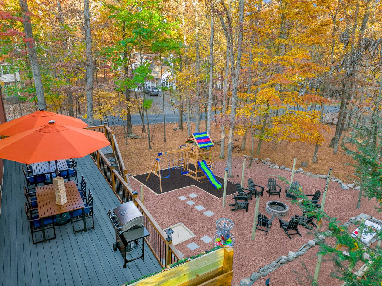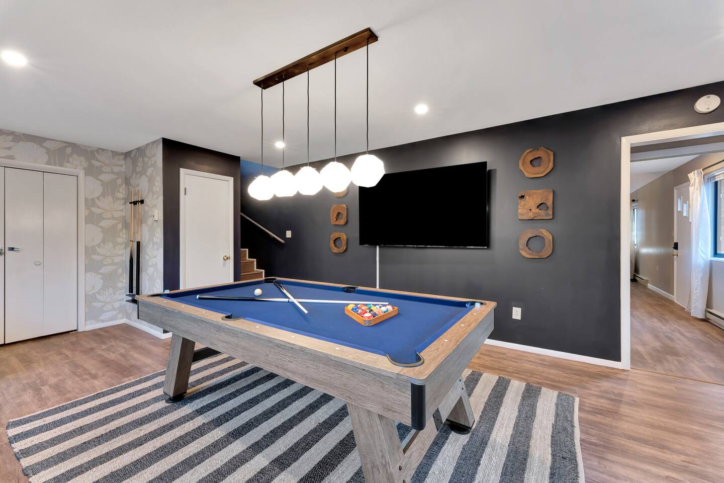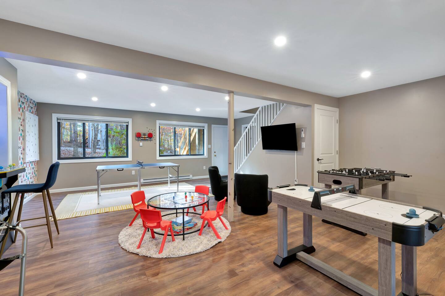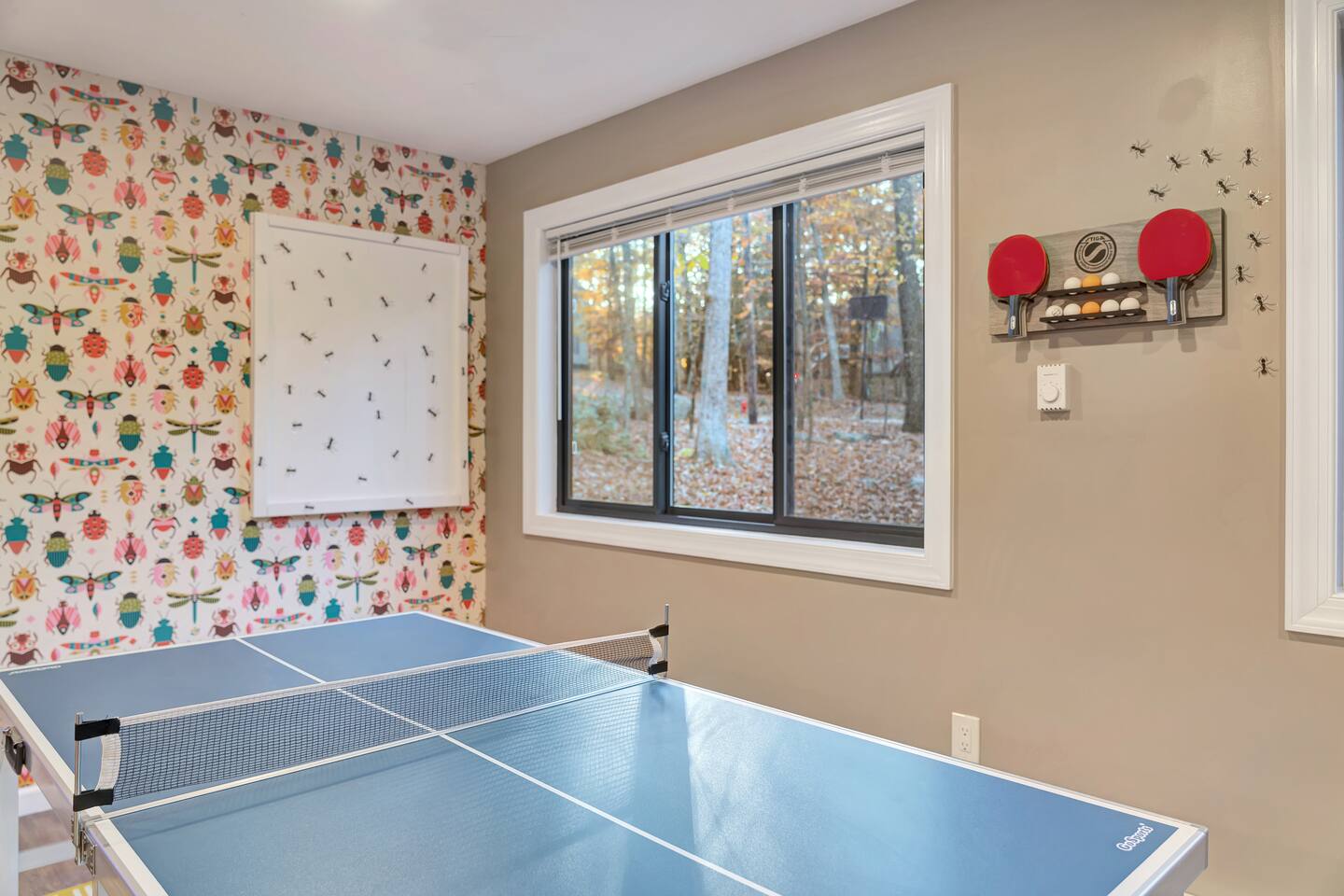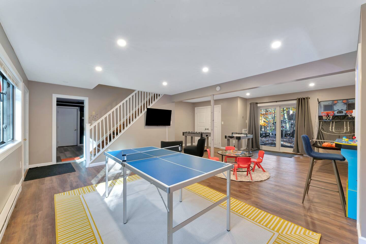 **During the summer months (Memorial Day weekend - Labor Day weekend), you will receive amenity badges that allow you to access the following amenities. If you’re staying with us outside of these dates, these amenities will be closed.** ☀ Lakes (with beach access - swimming allowed!) ☀ Pools ☀ Tennis courts ☀ Basketball courts ☀ Volleyball courts ☀ Dog park ☀ Playground areas KEY FEATURES: ☀ 5 beautiful bedrooms; 2 kings, 2 queens, 1 full, & 2 twin beds ☀ 3 full bathrooms ☀ Modern kitchen with new, stainless steel appliances ☀ Grand living room with lots of comfy seating & smart TV ☀ Dining room with seating to comfortably accommodate 8 (plus countertop seating & outdoor dining) ☀ TWO amazing game rooms; pool table, arcade games, ping pong, foosball, & more! ☀ Private movie theater with classic theater seating & fun ambiance! ☀ Private & peaceful resort-style backyard surrounded by nature; hot tub, fire pit, jungle gym, & TONS more! Here Are A Few Kind Words From Our Past Guests: “This was a great place to stay! The morning light through the windows was so beautiful. Overall, just a relaxing experience. The hosts were super responsive whenever I had a question. I would stay again!” - Emily “Sabrina was very accommodating and communicative. the house is beautiful and very comfortable, close to nature hikes.” - Jennifer “This place was lovely! Exactly as pictured! Very clean and excellent host experience!!! I plan to come back again!” - Regina ☆☆ BEDROOMS ☆☆ This three-level home has 5 bedrooms throughout. On the main floor, there is one bedroom with a king bed, smart TV, and attached ensuite bathroom. There are two separate entrances to the top level - one goes to its own private master suite, totally separated from the rest of the home. The master suite has a king bed, smart TV, and private ensuite bathroom. On the other side of the third floor are the remaining bedrooms. The third and fourth bedrooms have a queen in each, while the fifth bedroom has a twin-over-full bunk & a separate twin bed. ☆☆ BATHROOMS ☆☆ There are three full bathrooms in this home. The main floor bathroom has a sink, toilet, and shower/tub combo. The private ensuite bathroom on the third floor has a sink, toilet, walk-in shower, & soaking tub. The third bathroom, which is accessible by the other three bedrooms on this floor, has a sink, toilet, and shower/tub combo. ☆☆ KITCHEN & DINING ☆☆ The modern kitchen is located right off of the main living areas, and is loaded with all new stainless steel appliances & a coffee station (including a Keurig & coffee pods). The dining room is right next to the kitchen, with enough seating to comfortably fit 8 people, and opens right up to the rest of the living areas & also has direct access to the private back deck. There is additional countertop seating in the kitchen, as well as plenty of seating on the private back deck. ☆☆ LIVING ROOM ☆☆ In the living room, you’ll be greeted with lots of comfy seating, a big smart TV, and beautiful, modern design that will catch your eye as soon as you enter! This is the perfect spot to host your movie nights & games with your friends and family. ☆☆ GAME ROOMS ☆☆ Keep your family and friends entertained throughout your stay in our TWO amenity-filled game rooms! Pool table, ping pong, foosball, air hockey, basketball (Pop-a-Shot), arcade games, board games, card games, and seating to enjoy the TVs in each game room. Whether your reason for staying is to explore the town or stay at home and relax, this place will be the perfect spot to unwind! ☆☆ MOVIE THEATER ☆☆ Right off of the game room is your private movie theater! A big smart TV, classic movie theater seating, and true theater ambiance to feel like you really are right in your own private movie theater. ☆☆ OUTDOOR SPACE ☆☆ This backyard is everything you could ask for, and more! ☀ Hot tub ☀ Fire pit ☀ Jungle gym ☀ Bowling ☀ Corn hole ☀ Ring toss ☀ Frisbee golf ☀ Giant Connect 4 ☀ Giant Jenga ☀ Outdoor lounge seating ☀ Outdoor dining There is so much to do here, that all of your friends & family will be thoroughly entertained throughout your entire stay. No matter the season, this backyard has it all. Book your stay with us today and you will NOT be disappointed. Get ready for a vacation you will never forget! ★☆ Book Now & Let Us Take Care Of You In The Poconos! ☆★