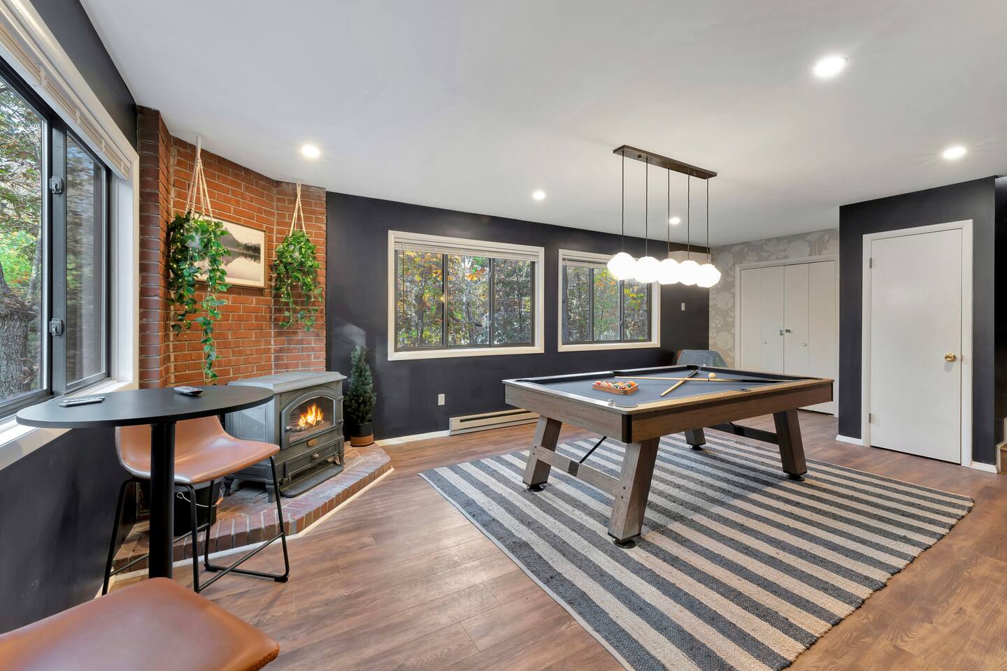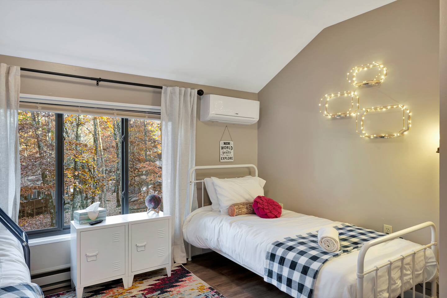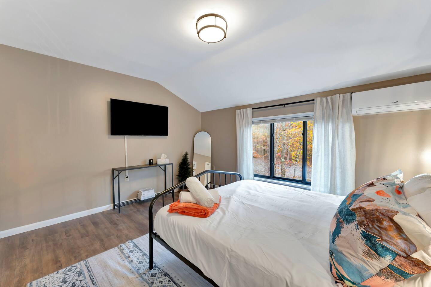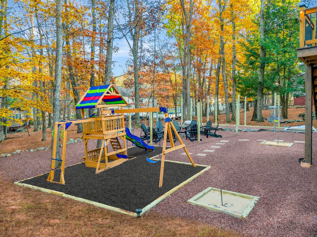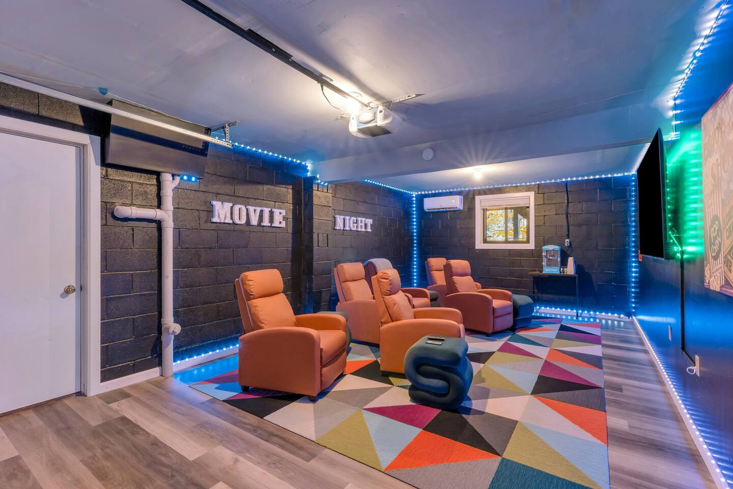 **During the summer months (Memorial Day weekend - Labor Day weekend), you will receive amenity badges that allow you to access the following amenities. If you’re staying with us outside of these dates, these amenities will be closed.** ☀ Lakes (with beach access - swimming allowed!) ☀ Pools ☀ Tennis courts ☀ Basketball courts ☀ Volleyball courts ☀ Dog park ☀ Playground areas KEY FEATURES: ☀ 5 beautiful bedrooms; 2 kings, 2 queens, 1 full, & 2 twin beds ☀ 3 full bathrooms ☀ Modern kitchen with new, stainless steel appliances ☀ Grand living room with lots of comfy seating & smart TV ☀ Dining room with seating to comfortably accommodate 8 (plus countertop seating & outdoor dining) ☀ TWO amazing game rooms; pool table, arcade games, ping pong, foosball, & more! ☀ Private movie theater with classic theater seating & fun ambiance! ☀ Private & peaceful resort-style backyard surrounded by nature; hot tub, fire pit, jungle gym, & TONS more! Here Are A Few Kind Words From Our Past Guests: “This was a great place to stay! The morning light through the windows was so beautiful. Overall, just a relaxing experience. The hosts were super responsive whenever I had a question. I would stay again!” - Emily “Sabrina was very accommodating and communicative. the house is beautiful and very comfortable, close to nature hikes.” - Jennifer “This place was lovely! Exactly as pictured! Very clean and excellent host experience!!! I plan to come back again!” - Regina ☆☆ BEDROOMS ☆☆ This three-level home has 5 bedrooms throughout. On the main floor, there is one bedroom with a king bed, smart TV, and attached ensuite bathroom. There are two separate entrances to the top level - one goes to its own private master suite, totally separated from the rest of the home. The master suite has a king bed, smart TV, and private ensuite bathroom. On the other side of the third floor are the remaining bedrooms. The third and fourth bedrooms have a queen in each, while the fifth bedroom has a twin-over-full bunk & a separate twin bed. ☆☆ BATHROOMS ☆☆ There are three full bathrooms in this home. The main floor bathroom has a sink, toilet, and shower/tub combo. The private ensuite bathroom on the third floor has a sink, toilet, walk-in shower, & soaking tub. The third bathroom, which is accessible by the other three bedrooms on this floor, has a sink, toilet, and shower/tub combo. ☆☆ KITCHEN & DINING ☆☆ The modern kitchen is located right off of the main living areas, and is loaded with all new stainless steel appliances & a coffee station (including a Keurig & coffee pods). The dining room is right next to the kitchen, with enough seating to comfortably fit 8 people, and opens right up to the rest of the living areas & also has direct access to the private back deck. There is additional countertop seating in the kitchen, as well as plenty of seating on the private back deck. ☆☆ LIVING ROOM ☆☆ In the living room, you’ll be greeted with lots of comfy seating, a big smart TV, and beautiful, modern design that will catch your eye as soon as you enter! This is the perfect spot to host your movie nights & games with your friends and family. ☆☆ GAME ROOMS ☆☆ Keep your family and friends entertained throughout your stay in our TWO amenity-filled game rooms! Pool table, ping pong, foosball, air hockey, basketball (Pop-a-Shot), arcade games, board games, card games, and seating to enjoy the TVs in each game room. Whether your reason for staying is to explore the town or stay at home and relax, this place will be the perfect spot to unwind! ☆☆ MOVIE THEATER ☆☆ Right off of the game room is your private movie theater! A big smart TV, classic movie theater seating, and true theater ambiance to feel like you really are right in your own private movie theater. ☆☆ OUTDOOR SPACE ☆☆ This backyard is everything you could ask for, and more! ☀ Hot tub ☀ Fire pit ☀ Jungle gym ☀ Bowling ☀ Corn hole ☀ Ring toss ☀ Frisbee golf ☀ Giant Connect 4 ☀ Giant Jenga ☀ Outdoor lounge seating ☀ Outdoor dining There is so much to do here, that all of your friends & family will be thoroughly entertained throughout your entire stay. No matter the season, this backyard has it all. Book your stay with us today and you will NOT be disappointed. Get ready for a vacation you will never forget! ★☆ Book Now & Let Us Take Care Of You In The Poconos! ☆★