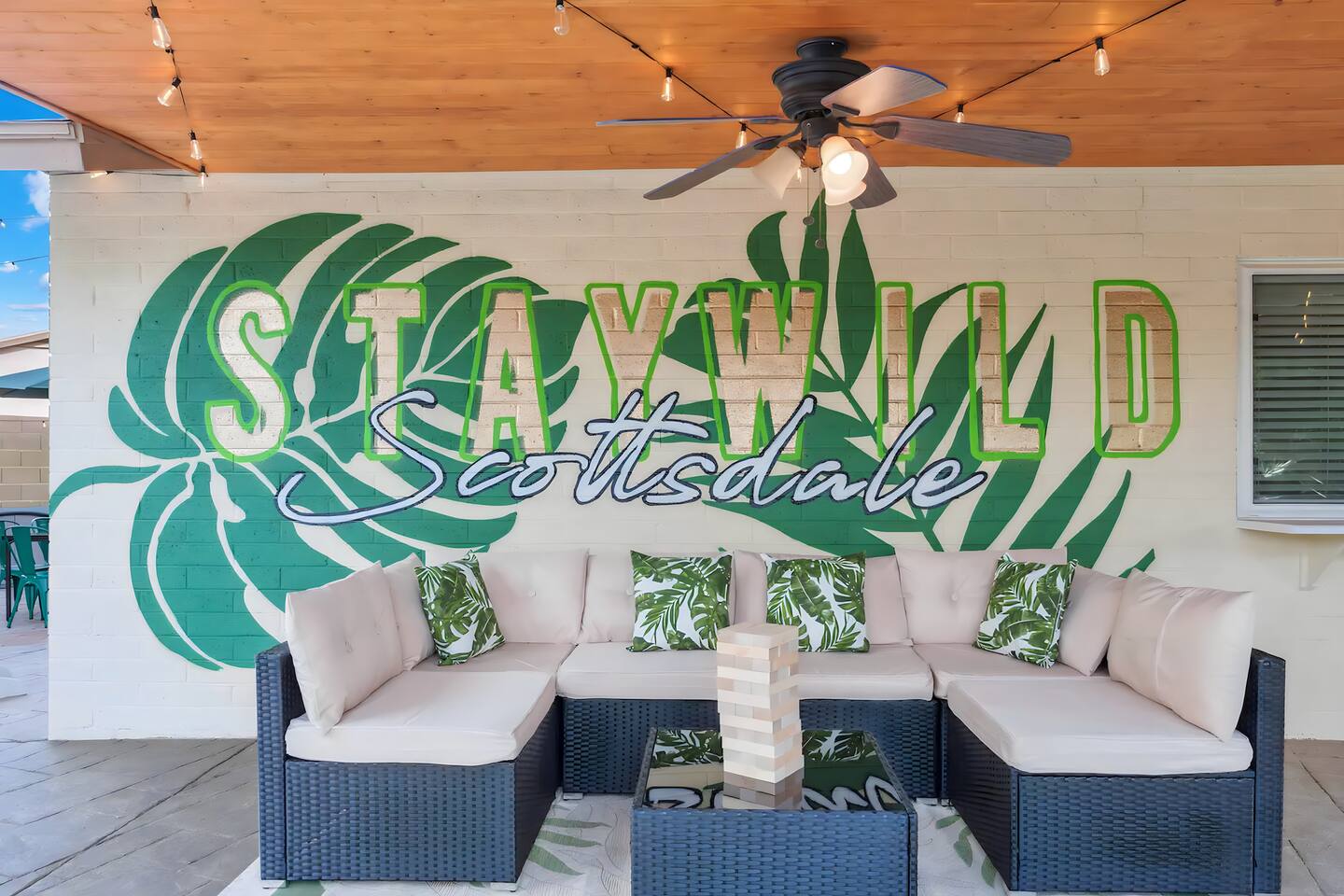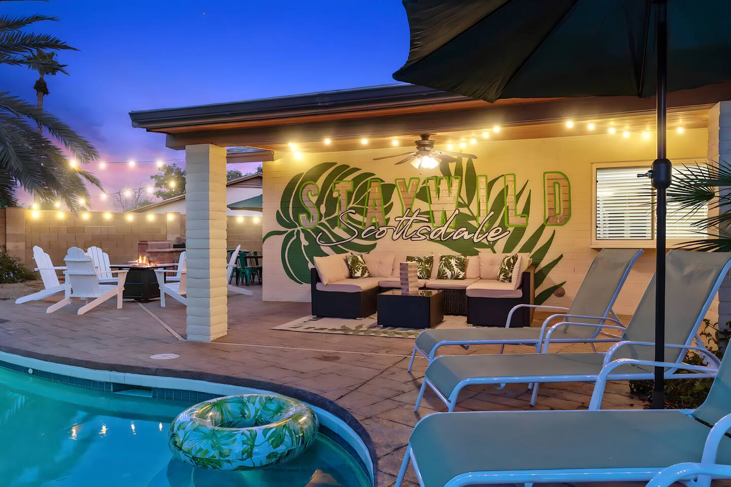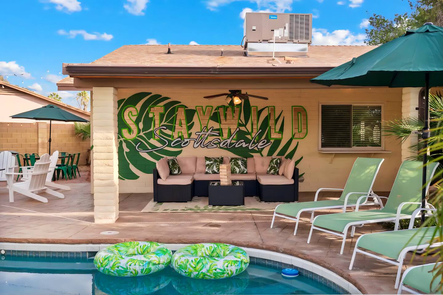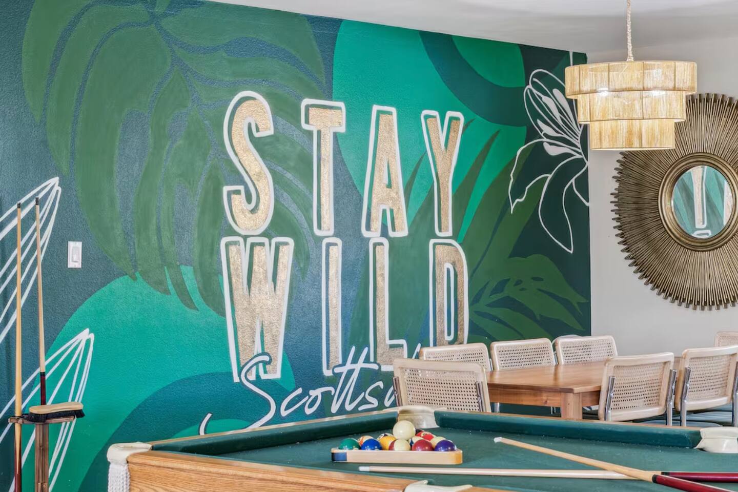 KEY FEATURES: ☀ UNREAL backyard - so tropical and filled with amenities! ☀ Pool table, putting green, fire pit, BBQ + much more! ☀ Heated pool + hot tub ☀ Tiki bar, outdoor dining, and outdoor lounge seating ☀ 4 comfy bedrooms; 1 king, 1 queen, 2 fulls (bunk bed), and 2 twin beds ☀ 2 full bathrooms; master ensuite & hallway bathroom ☀ Modern kitchen with stainless steel appliances ☀ Open living room with modern design - opens up to the rest of the entertainment space ☀ Fun mural backdrop behind the main dining space Here Are A Few Kind Words From Our Past Guests: “This was a great place to stay! The morning light through the windows was so beautiful. Overall, just a relaxing experience. The hosts were super responsive whenever I had a question. I would stay again!” - Emily “Sabrina was very accommodating and communicative. the house is beautiful and very comfortable, close to nature hikes.” - Jennifer “This place was lovely! Exactly as pictured! Very clean and excellent host experience!!! I plan to come back again!” - Regina ☆☆ BEDROOMS ☆☆ 4 comfy bedrooms, all masterfully designed! The master is equipped with a king bed, smart TV, and direct access to the backyard (ensuite bathroom is attached), on its own private wing of the house. The other three bedrooms are across the other end of the living space, consisting of one bedroom with a queen bed, one with two fulls (bunk bed), and one with two twin beds. ☆☆ BATHROOMS ☆☆ The master ensuite has two sinks & a walk-in shower, with complete privacy from the rest of the home. The second bathroom is shared by the remaining bedrooms, with one sink and a shower/tub combo. ☆☆ KITCHEN & DINING ☆☆ The modern kitchen opens right up to the rest of the living space, with new, modern appliances and fully stocked with all the cooking essentials you will need (including a Keurig & coffee pods). The dining area is right across from the kitchen, with seating for 8 right in front of a fun, vibrant "Scottsdale" themed mural! ☆☆ LIVING ROOM ☆☆ The open living space will take your breath away as you enter the home. A giant, comfy sectional, tropical design, pool table, and a big smart TV - the perfect spot for movie nights with your friends and family! Of course, this living area opens up directly to the rest of the attractions of the home: the game room, dining/kitchen, and backyard. It's a perfect entertaining space! ☆☆ OUTDOOR SPACE ☆☆ A backyard like you have never seen in Scottsdale! Trees and bushes surround this yard, giving you complete privacy to enjoy your own private oasis. Take a dip in the heated pool, or sun bathe in the comfy lounge chairs beside all of the other lounge seating that this yard has to offer. Another large comfy sofa, propane fire pit, an outdoor dining table, & a unique set up at a tiki bar provides you with many options to sit out here and enjoy the beauty of Scottsdale! Looking for family entertainment? Look no further than this amazing yard! Putting green, hot tub, and so much more. Whether you are looking for a spot for the kids to have a blast, or if you're looking for an fun adult retreat, this yard has it all! ★☆ Book Now & Let Us Take Care Of You In Scottsdale! ☆★