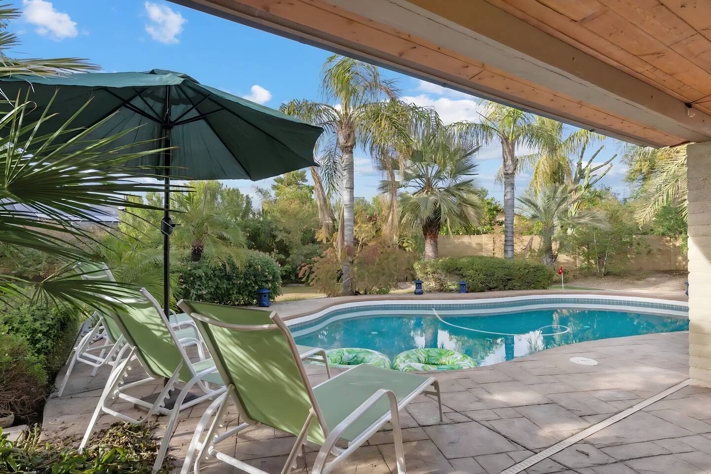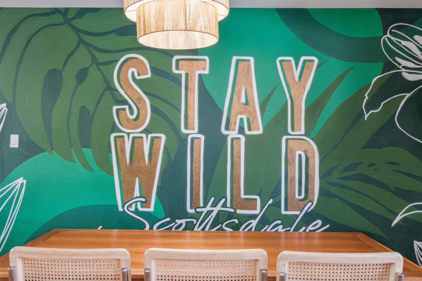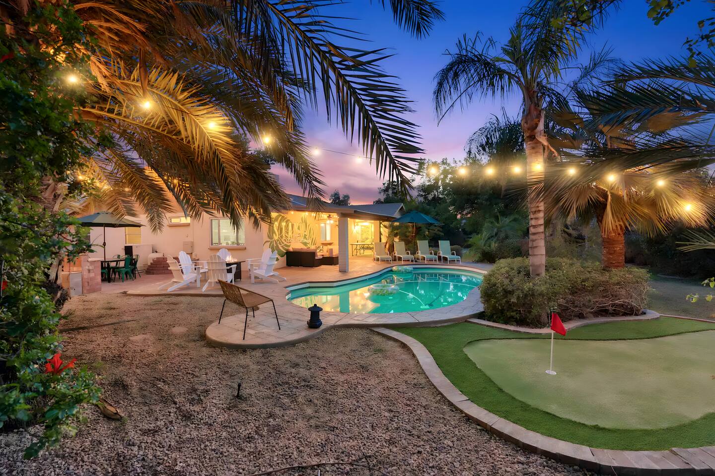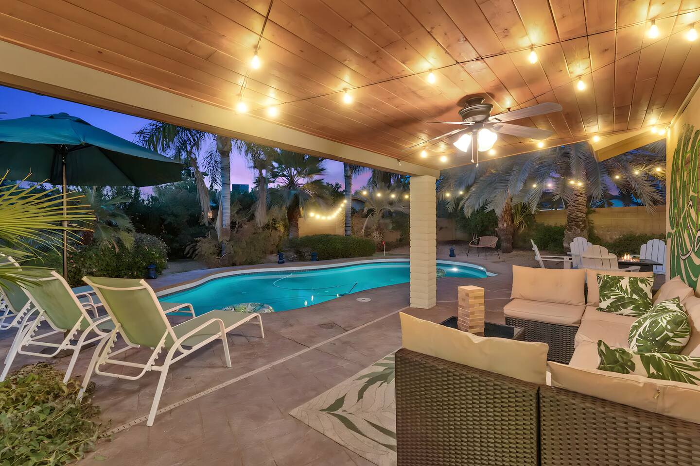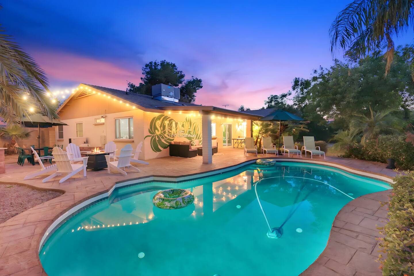 KEY FEATURES: ☀ UNREAL backyard - so tropical and filled with amenities! ☀ Pool table, putting green, fire pit, BBQ + much more! ☀ Heated pool + hot tub ☀ Tiki bar, outdoor dining, and outdoor lounge seating ☀ 4 comfy bedrooms; 1 king, 1 queen, 2 fulls (bunk bed), and 2 twin beds ☀ 2 full bathrooms; master ensuite & hallway bathroom ☀ Modern kitchen with stainless steel appliances ☀ Open living room with modern design - opens up to the rest of the entertainment space ☀ Fun mural backdrop behind the main dining space Here Are A Few Kind Words From Our Past Guests: “This was a great place to stay! The morning light through the windows was so beautiful. Overall, just a relaxing experience. The hosts were super responsive whenever I had a question. I would stay again!” - Emily “Sabrina was very accommodating and communicative. the house is beautiful and very comfortable, close to nature hikes.” - Jennifer “This place was lovely! Exactly as pictured! Very clean and excellent host experience!!! I plan to come back again!” - Regina ☆☆ BEDROOMS ☆☆ 4 comfy bedrooms, all masterfully designed! The master is equipped with a king bed, smart TV, and direct access to the backyard (ensuite bathroom is attached), on its own private wing of the house. The other three bedrooms are across the other end of the living space, consisting of one bedroom with a queen bed, one with two fulls (bunk bed), and one with two twin beds. ☆☆ BATHROOMS ☆☆ The master ensuite has two sinks & a walk-in shower, with complete privacy from the rest of the home. The second bathroom is shared by the remaining bedrooms, with one sink and a shower/tub combo. ☆☆ KITCHEN & DINING ☆☆ The modern kitchen opens right up to the rest of the living space, with new, modern appliances and fully stocked with all the cooking essentials you will need (including a Keurig & coffee pods). The dining area is right across from the kitchen, with seating for 8 right in front of a fun, vibrant "Scottsdale" themed mural! ☆☆ LIVING ROOM ☆☆ The open living space will take your breath away as you enter the home. A giant, comfy sectional, tropical design, pool table, and a big smart TV - the perfect spot for movie nights with your friends and family! Of course, this living area opens up directly to the rest of the attractions of the home: the game room, dining/kitchen, and backyard. It's a perfect entertaining space! ☆☆ OUTDOOR SPACE ☆☆ A backyard like you have never seen in Scottsdale! Trees and bushes surround this yard, giving you complete privacy to enjoy your own private oasis. Take a dip in the heated pool, or sun bathe in the comfy lounge chairs beside all of the other lounge seating that this yard has to offer. Another large comfy sofa, propane fire pit, an outdoor dining table, & a unique set up at a tiki bar provides you with many options to sit out here and enjoy the beauty of Scottsdale! Looking for family entertainment? Look no further than this amazing yard! Putting green, hot tub, and so much more. Whether you are looking for a spot for the kids to have a blast, or if you're looking for an fun adult retreat, this yard has it all! ★☆ Book Now & Let Us Take Care Of You In Scottsdale! ☆★