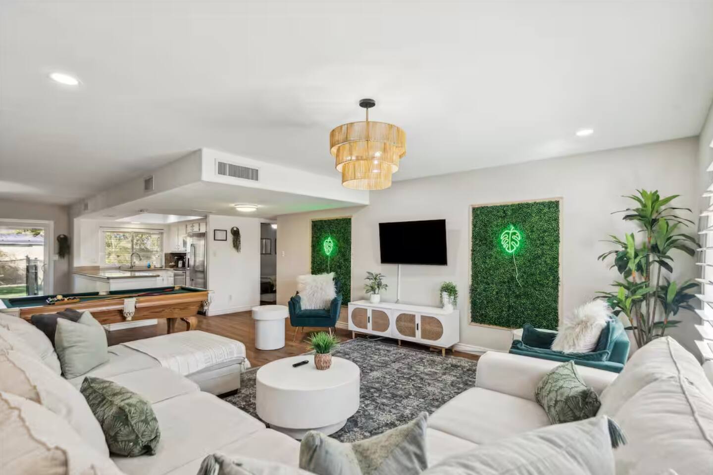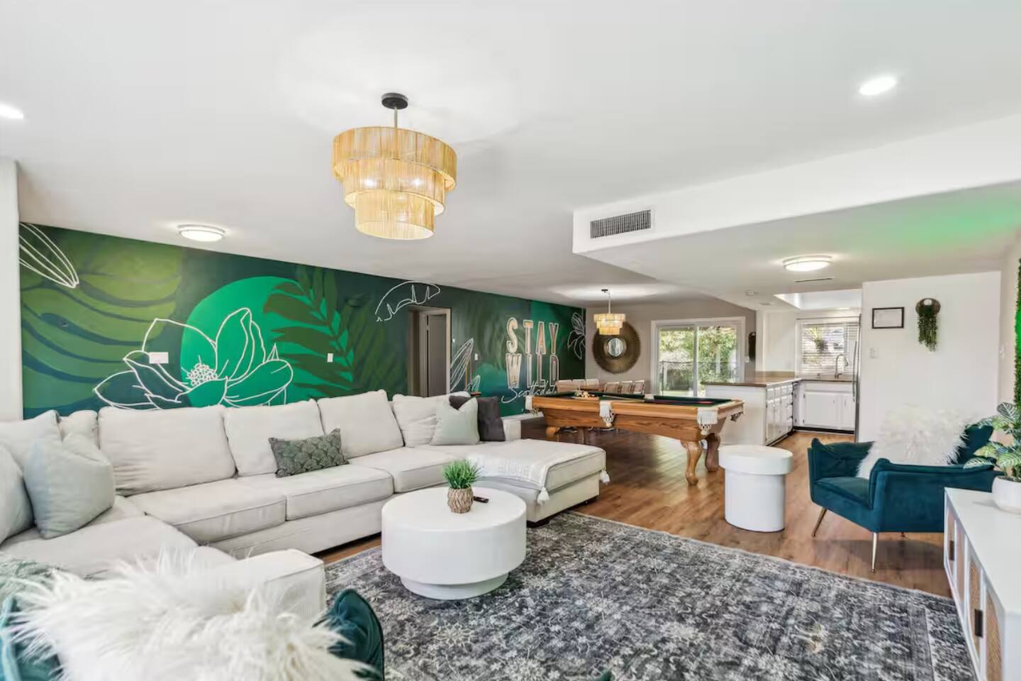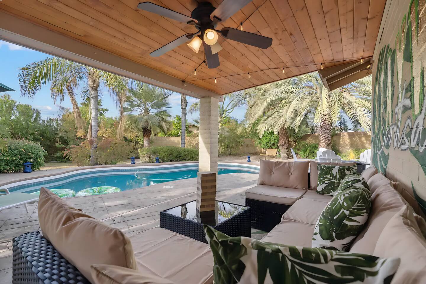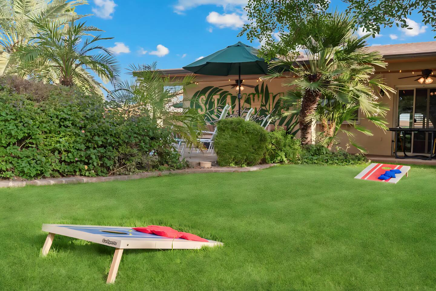 KEY FEATURES: ☀ UNREAL backyard - so tropical and filled with amenities! ☀ Pool table, putting green, fire pit, BBQ + much more! ☀ Heated pool + hot tub ☀ Tiki bar, outdoor dining, and outdoor lounge seating ☀ 4 comfy bedrooms; 1 king, 1 queen, 2 fulls (bunk bed), and 2 twin beds ☀ 2 full bathrooms; master ensuite & hallway bathroom ☀ Modern kitchen with stainless steel appliances ☀ Open living room with modern design - opens up to the rest of the entertainment space ☀ Fun mural backdrop behind the main dining space Here Are A Few Kind Words From Our Past Guests: “This was a great place to stay! The morning light through the windows was so beautiful. Overall, just a relaxing experience. The hosts were super responsive whenever I had a question. I would stay again!” - Emily “Sabrina was very accommodating and communicative. the house is beautiful and very comfortable, close to nature hikes.” - Jennifer “This place was lovely! Exactly as pictured! Very clean and excellent host experience!!! I plan to come back again!” - Regina ☆☆ BEDROOMS ☆☆ 4 comfy bedrooms, all masterfully designed! The master is equipped with a king bed, smart TV, and direct access to the backyard (ensuite bathroom is attached), on its own private wing of the house. The other three bedrooms are across the other end of the living space, consisting of one bedroom with a queen bed, one with two fulls (bunk bed), and one with two twin beds. ☆☆ BATHROOMS ☆☆ The master ensuite has two sinks & a walk-in shower, with complete privacy from the rest of the home. The second bathroom is shared by the remaining bedrooms, with one sink and a shower/tub combo. ☆☆ KITCHEN & DINING ☆☆ The modern kitchen opens right up to the rest of the living space, with new, modern appliances and fully stocked with all the cooking essentials you will need (including a Keurig & coffee pods). The dining area is right across from the kitchen, with seating for 8 right in front of a fun, vibrant "Scottsdale" themed mural! ☆☆ LIVING ROOM ☆☆ The open living space will take your breath away as you enter the home. A giant, comfy sectional, tropical design, pool table, and a big smart TV - the perfect spot for movie nights with your friends and family! Of course, this living area opens up directly to the rest of the attractions of the home: the game room, dining/kitchen, and backyard. It's a perfect entertaining space! ☆☆ OUTDOOR SPACE ☆☆ A backyard like you have never seen in Scottsdale! Trees and bushes surround this yard, giving you complete privacy to enjoy your own private oasis. Take a dip in the heated pool, or sun bathe in the comfy lounge chairs beside all of the other lounge seating that this yard has to offer. Another large comfy sofa, propane fire pit, an outdoor dining table, & a unique set up at a tiki bar provides you with many options to sit out here and enjoy the beauty of Scottsdale! Looking for family entertainment? Look no further than this amazing yard! Putting green, hot tub, and so much more. Whether you are looking for a spot for the kids to have a blast, or if you're looking for an fun adult retreat, this yard has it all! ★☆ Book Now & Let Us Take Care Of You In Scottsdale! ☆★
