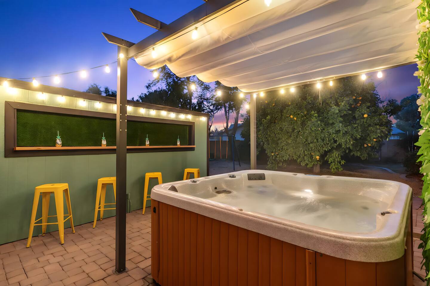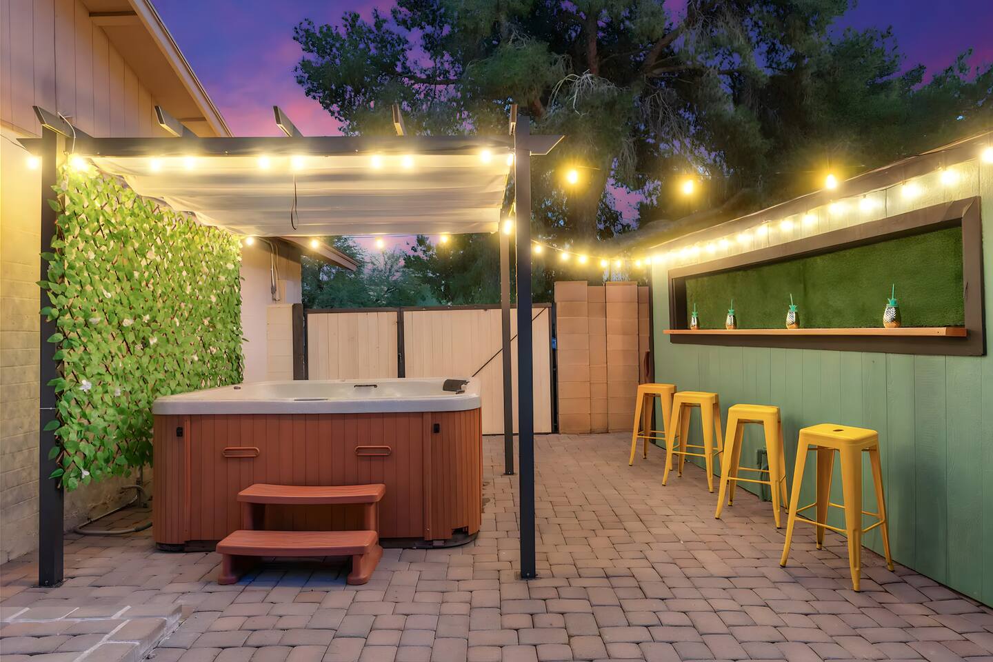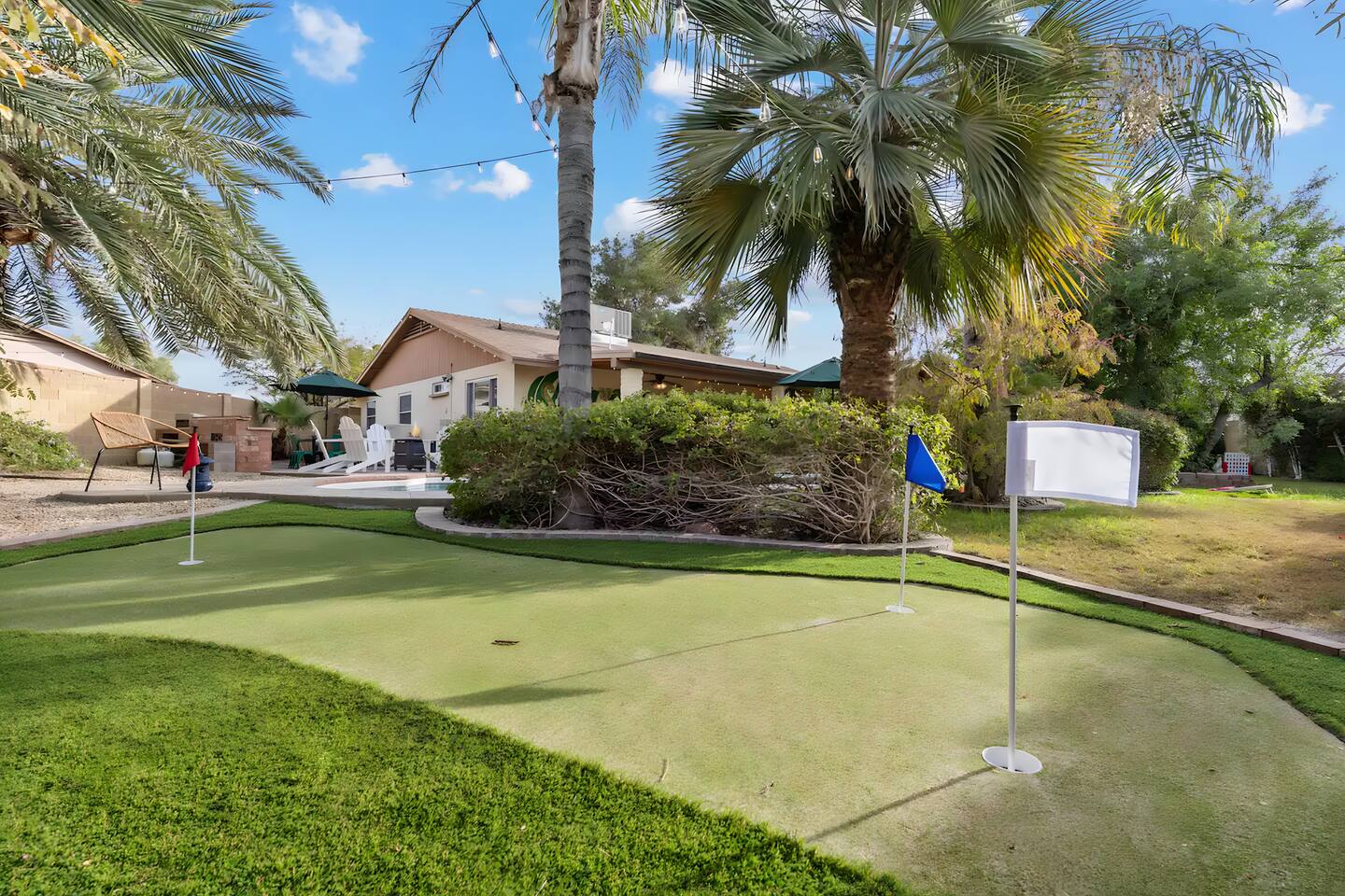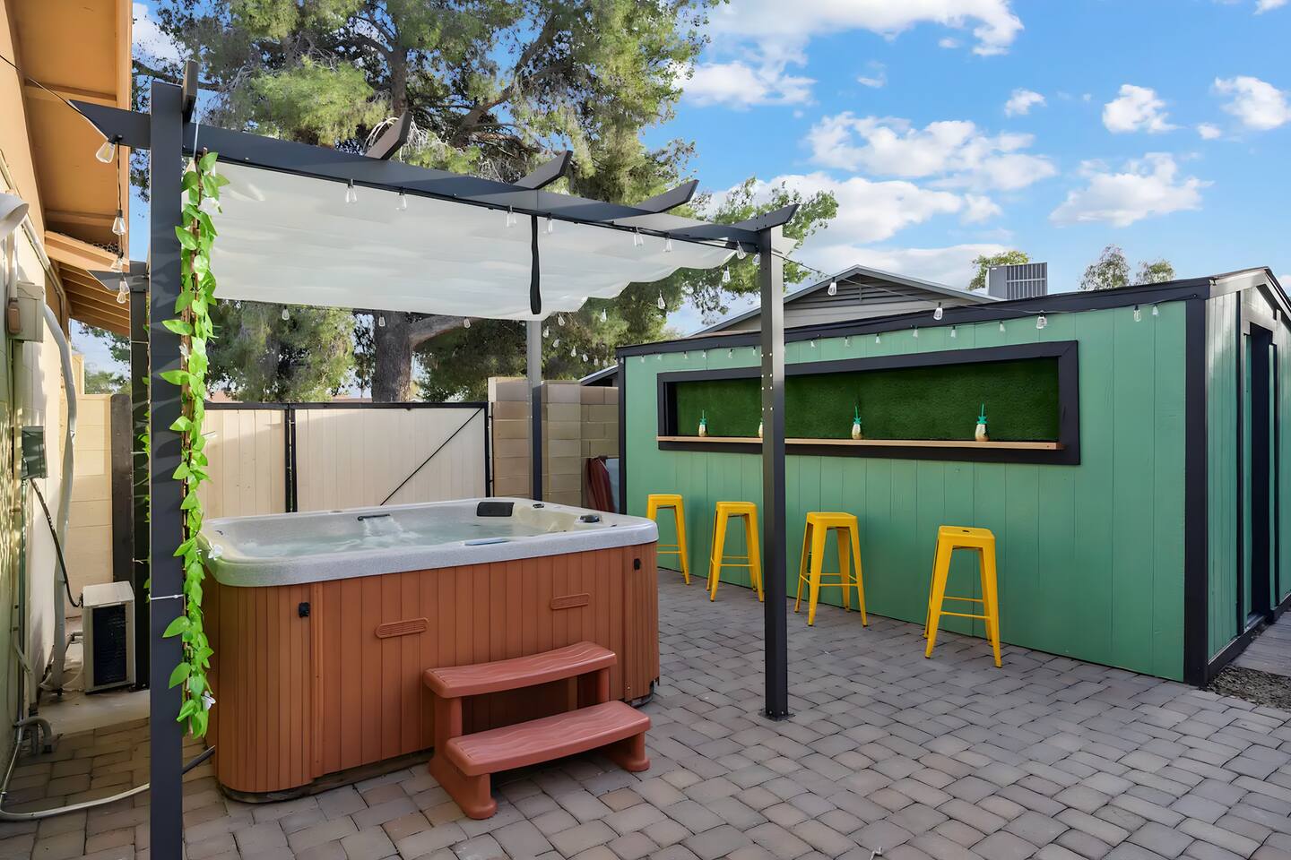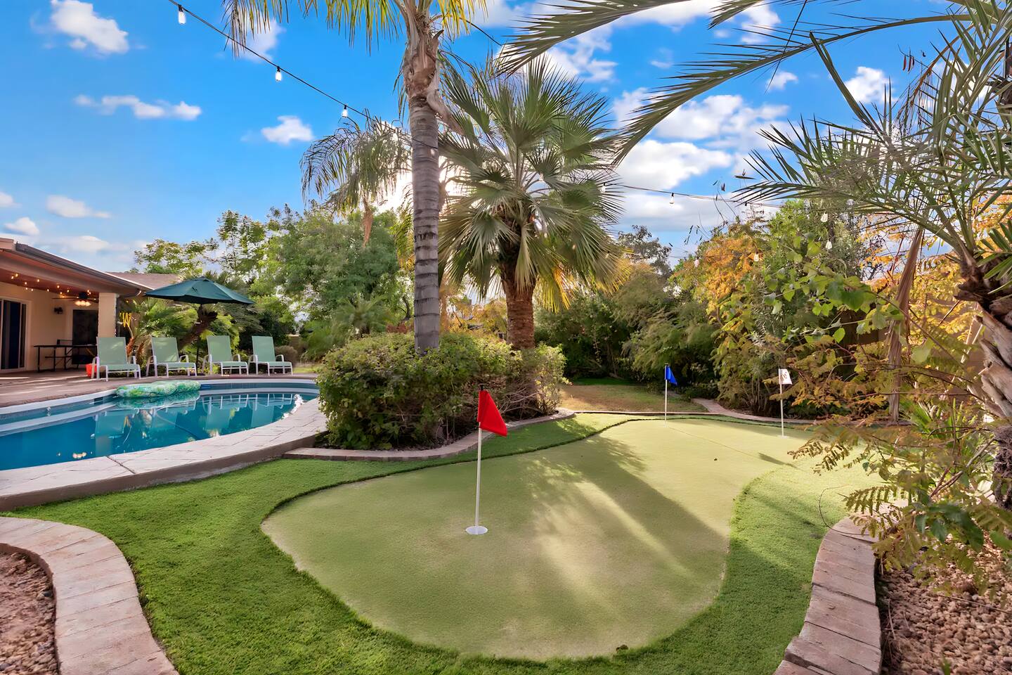 KEY FEATURES: ☀ UNREAL backyard - so tropical and filled with amenities! ☀ Pool table, putting green, fire pit, BBQ + much more! ☀ Heated pool + hot tub ☀ Tiki bar, outdoor dining, and outdoor lounge seating ☀ 4 comfy bedrooms; 1 king, 1 queen, 2 fulls (bunk bed), and 2 twin beds ☀ 2 full bathrooms; master ensuite & hallway bathroom ☀ Modern kitchen with stainless steel appliances ☀ Open living room with modern design - opens up to the rest of the entertainment space ☀ Fun mural backdrop behind the main dining space Here Are A Few Kind Words From Our Past Guests: “This was a great place to stay! The morning light through the windows was so beautiful. Overall, just a relaxing experience. The hosts were super responsive whenever I had a question. I would stay again!” - Emily “Sabrina was very accommodating and communicative. the house is beautiful and very comfortable, close to nature hikes.” - Jennifer “This place was lovely! Exactly as pictured! Very clean and excellent host experience!!! I plan to come back again!” - Regina ☆☆ BEDROOMS ☆☆ 4 comfy bedrooms, all masterfully designed! The master is equipped with a king bed, smart TV, and direct access to the backyard (ensuite bathroom is attached), on its own private wing of the house. The other three bedrooms are across the other end of the living space, consisting of one bedroom with a queen bed, one with two fulls (bunk bed), and one with two twin beds. ☆☆ BATHROOMS ☆☆ The master ensuite has two sinks & a walk-in shower, with complete privacy from the rest of the home. The second bathroom is shared by the remaining bedrooms, with one sink and a shower/tub combo. ☆☆ KITCHEN & DINING ☆☆ The modern kitchen opens right up to the rest of the living space, with new, modern appliances and fully stocked with all the cooking essentials you will need (including a Keurig & coffee pods). The dining area is right across from the kitchen, with seating for 8 right in front of a fun, vibrant "Scottsdale" themed mural! ☆☆ LIVING ROOM ☆☆ The open living space will take your breath away as you enter the home. A giant, comfy sectional, tropical design, pool table, and a big smart TV - the perfect spot for movie nights with your friends and family! Of course, this living area opens up directly to the rest of the attractions of the home: the game room, dining/kitchen, and backyard. It's a perfect entertaining space! ☆☆ OUTDOOR SPACE ☆☆ A backyard like you have never seen in Scottsdale! Trees and bushes surround this yard, giving you complete privacy to enjoy your own private oasis. Take a dip in the heated pool, or sun bathe in the comfy lounge chairs beside all of the other lounge seating that this yard has to offer. Another large comfy sofa, propane fire pit, an outdoor dining table, & a unique set up at a tiki bar provides you with many options to sit out here and enjoy the beauty of Scottsdale! Looking for family entertainment? Look no further than this amazing yard! Putting green, hot tub, and so much more. Whether you are looking for a spot for the kids to have a blast, or if you're looking for an fun adult retreat, this yard has it all! ★☆ Book Now & Let Us Take Care Of You In Scottsdale! ☆★