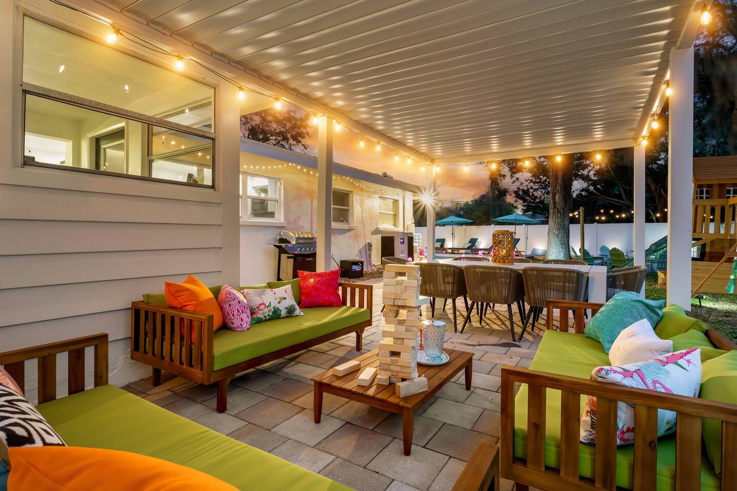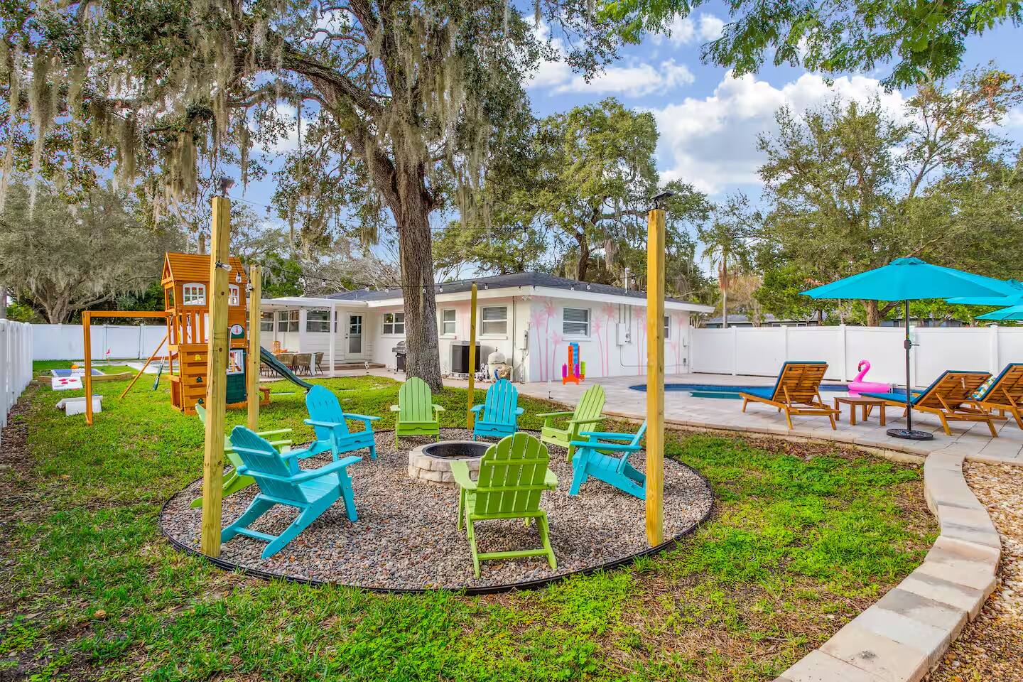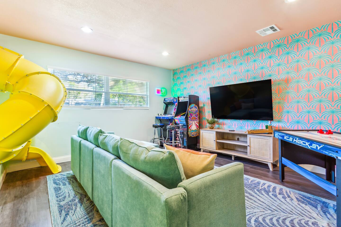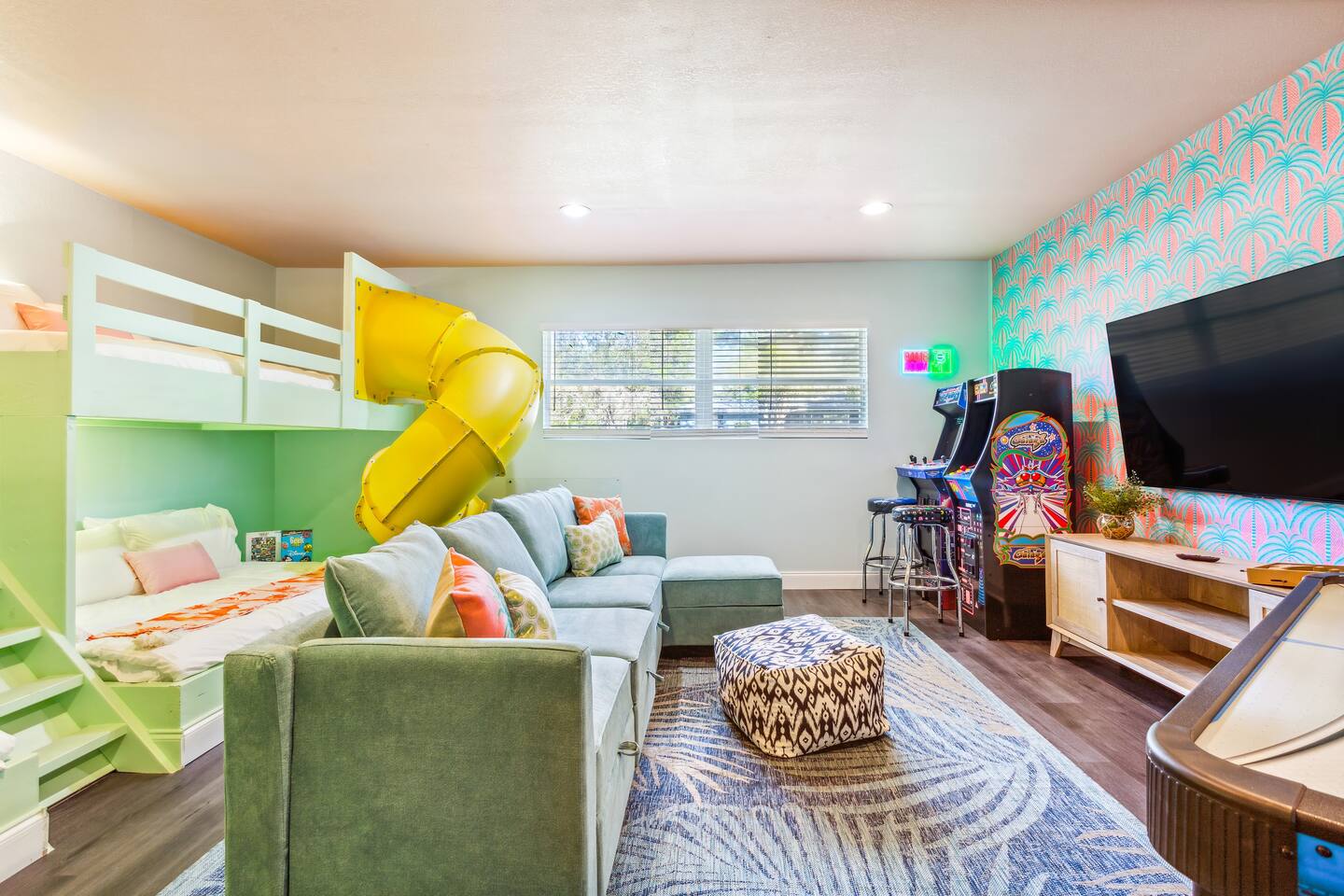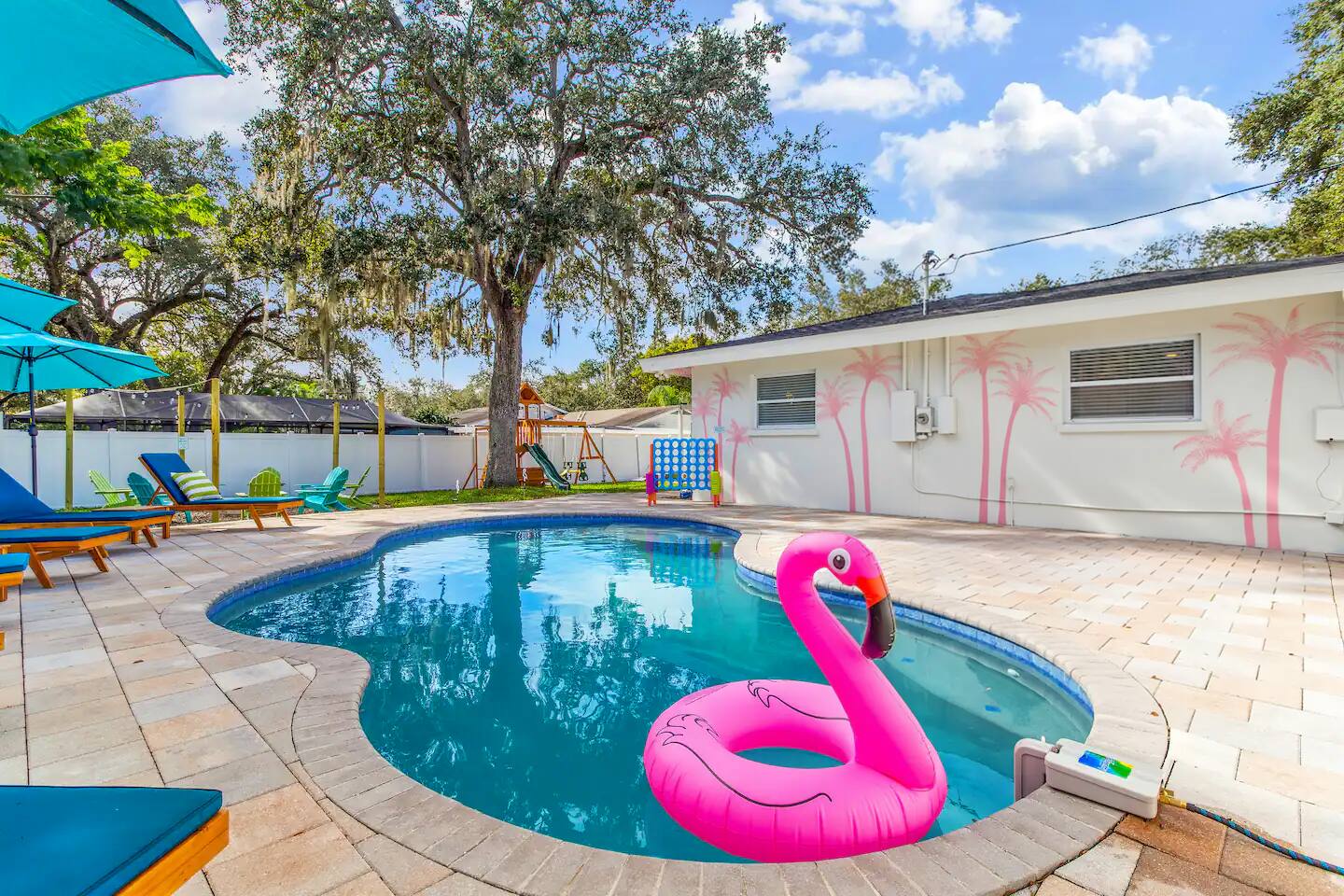 KEY FEATURES: ☀ 5 spacious bedrooms with fun, unique designs; 1 king, 2 queens, 4 fulls, & 2 twin beds ☀ 2 full bathrooms ☀ Beautiful chef's kitchen with modern appliances & design ☀ Living room with lots of comfy seating and large smart TV ☀ Game rooms with pool table, air hockey, arcade games, & more ☀ Vibrant dining room that opens up to the main living area; great for entertaining! ☀ Huge backyard with heated pool, mini golf, fire pit, games, and more ☀ Quiet, private neighborhood just minutes away from beautiful beaches! Here Are A Few Kind Words From Our Past Guests: “This was a great place to stay! The morning light through the windows was so beautiful. Overall, just a relaxing experience. The hosts were super responsive whenever I had a question. I would stay again!” - Emily “Sabrina was very accommodating and communicative. the house is beautiful and very comfortable, close to nature hikes.” - Jennifer “This place was lovely! Exactly as pictured! Very clean and excellent host experience!!! I plan to come back again!” - Regina ☆☆ BEDROOMS ☆☆ There are 5 beautiful bedrooms throughout this home. On one end of the home, you will find the first two bedrooms; one with a king bed (& smart TV), and the other with a queen bed. As you move along to the other side of the house, you'll find the three remaining bedrooms. One with another queen bed, another with 2 full beds, and the fifth (& most fun) room has two twin-over-full bunk beds, two slides, arcade games, air hockey, and lots of comfy seating to enjoy the large smart TV! ☆☆ BATHROOMS ☆☆ There are two full bathrooms in this home. One one end of the home is the first bathroom, with a sink, toilet, & shower/tub combo. On the other end of the house, the second bathroom has two sinks, a toilet, & a walk-in shower. ☆☆ KITCHEN & DINING ☆☆ The modern kitchen continues with the gorgeous, tropical vibe that is so perfectly designed through the entire home. With lots of counter space and bar tops seating, it's a great kitchen for entertaining! Just one room over is the dining room, which is bright, vibrant, and welcoming. The formal dining room seats 12, plus 2 countertop seats. There is also additional dining space right in the backyard, under the covered patio. ☆☆ LIVING ROOM ☆☆ As you walk into the home, you're greeted with the big, open living room, which has lots of comfy seating and a big smart TV. It's a great place for your movie or game nights, where the whole family can sit together in this cozy space! ☆☆ GAME ROOM ☆☆ On top of all the other amenities we offer here, you will find a game room filled with a pool table, smart TV, & hightop seating, of course with a gorgeous beach vibe! ☆☆ OUTDOOR SPACE ☆☆ This backyard is everything you could ask for, and more! ☀ Heated pool ☀ Fire pit ☀ Mini golf ☀ Bowling ☀ Jungle gym ☀ Corn hole ☀ Giant Connect 4 ☀ Giant Jenga ☀ BBQ grill ☀ Covered dining ☀ Covered lounge seating ☀ Sun loungers There is so much to do here, that all of your friends & family will be thoroughly entertained throughout your entire stay. No matter the season, this backyard has it all. Book your stay with us today and you will NOT be disappointed. Get ready for a vacation you will never forget! ★☆ Book Now & Let Us Take Care Of You In Seminole! ☆★