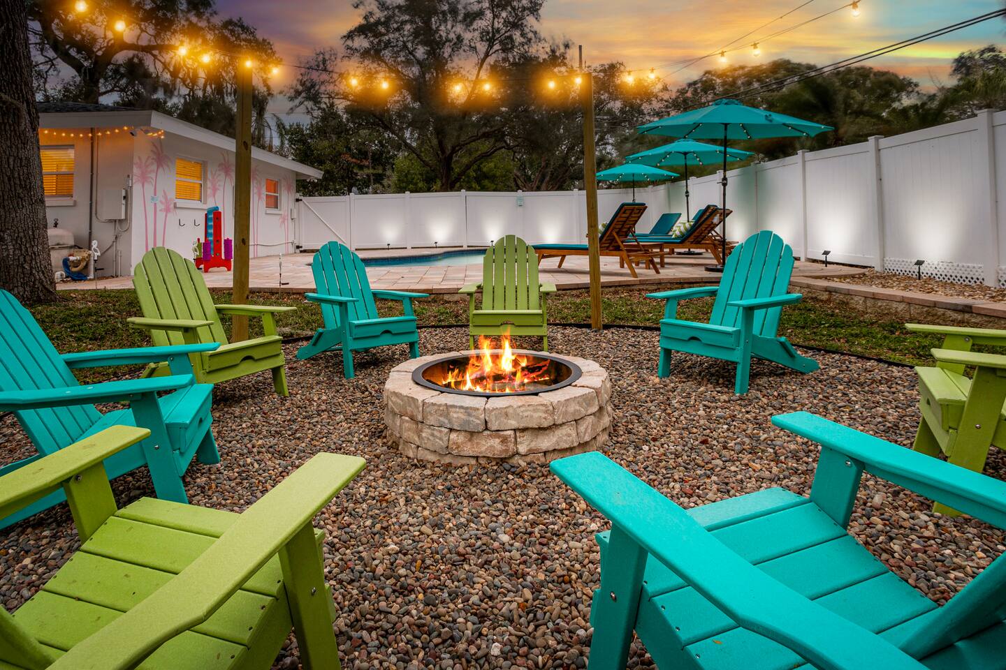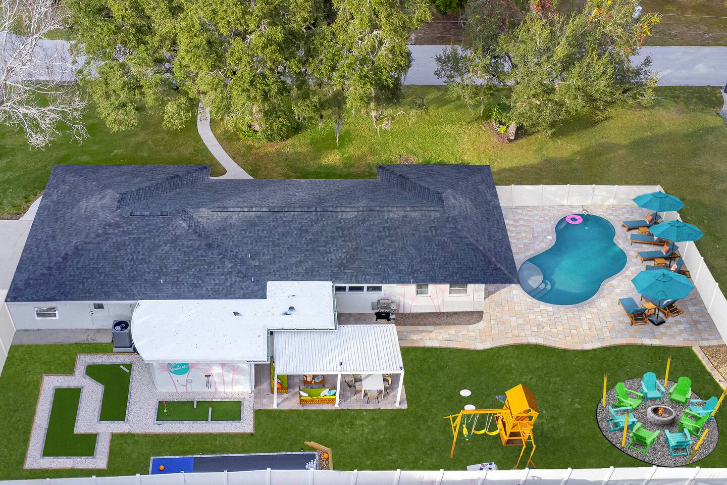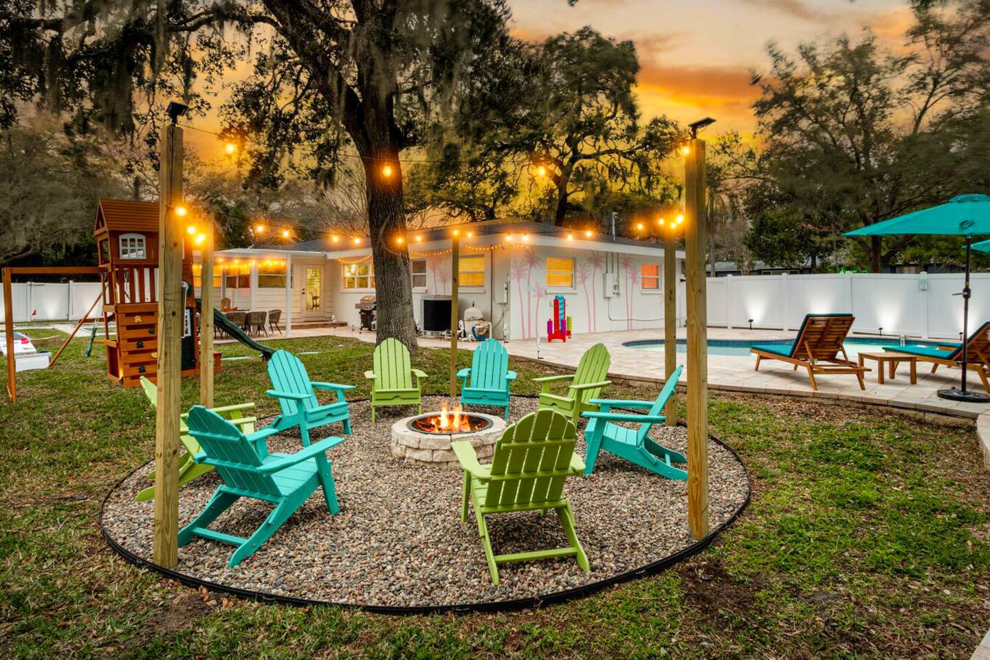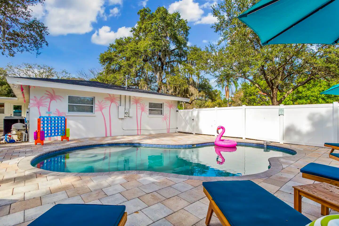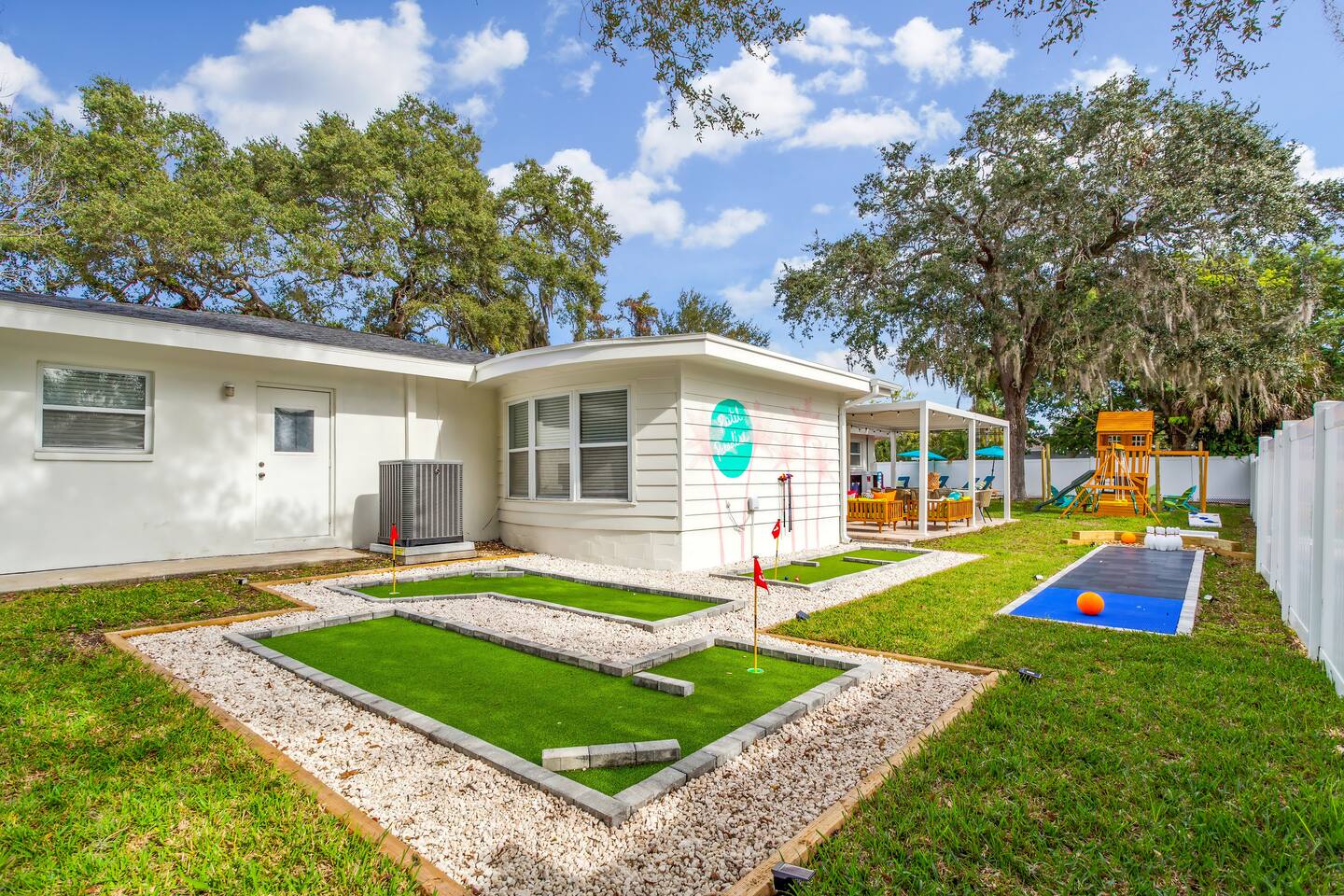KEY FEATURES: ☀ 5 spacious bedrooms with fun, unique designs; 1 king, 2 queens, 4 fulls, & 2 twin beds ☀ 2 full bathrooms ☀ Beautiful chef's kitchen with modern appliances & design ☀ Living room with lots of comfy seating and large smart TV ☀ Game rooms with pool table, air hockey, arcade games, & more ☀ Vibrant dining room that opens up to the main living area; great for entertaining! ☀ Huge backyard with heated pool, mini golf, fire pit, games, and more ☀ Quiet, private neighborhood just minutes away from beautiful beaches! Here Are A Few Kind Words From Our Past Guests: “This was a great place to stay! The morning light through the windows was so beautiful. Overall, just a relaxing experience. The hosts were super responsive whenever I had a question. I would stay again!” - Emily “Sabrina was very accommodating and communicative. the house is beautiful and very comfortable, close to nature hikes.” - Jennifer “This place was lovely! Exactly as pictured! Very clean and excellent host experience!!! I plan to come back again!” - Regina ☆☆ BEDROOMS ☆☆ There are 5 beautiful bedrooms throughout this home. On one end of the home, you will find the first two bedrooms; one with a king bed (& smart TV), and the other with a queen bed. As you move along to the other side of the house, you'll find the three remaining bedrooms. One with another queen bed, another with 2 full beds, and the fifth (& most fun) room has two twin-over-full bunk beds, two slides, arcade games, air hockey, and lots of comfy seating to enjoy the large smart TV! ☆☆ BATHROOMS ☆☆ There are two full bathrooms in this home. One one end of the home is the first bathroom, with a sink, toilet, & shower/tub combo. On the other end of the house, the second bathroom has two sinks, a toilet, & a walk-in shower. ☆☆ KITCHEN & DINING ☆☆ The modern kitchen continues with the gorgeous, tropical vibe that is so perfectly designed through the entire home. With lots of counter space and bar tops seating, it's a great kitchen for entertaining! Just one room over is the dining room, which is bright, vibrant, and welcoming. The formal dining room seats 12, plus 2 countertop seats. There is also additional dining space right in the backyard, under the covered patio. ☆☆ LIVING ROOM ☆☆ As you walk into the home, you're greeted with the big, open living room, which has lots of comfy seating and a big smart TV. It's a great place for your movie or game nights, where the whole family can sit together in this cozy space! ☆☆ GAME ROOM ☆☆ On top of all the other amenities we offer here, you will find a game room filled with a pool table, smart TV, & hightop seating, of course with a gorgeous beach vibe! ☆☆ OUTDOOR SPACE ☆☆ This backyard is everything you could ask for, and more! ☀ Heated pool ☀ Fire pit ☀ Mini golf ☀ Bowling ☀ Jungle gym ☀ Corn hole ☀ Giant Connect 4 ☀ Giant Jenga ☀ BBQ grill ☀ Covered dining ☀ Covered lounge seating ☀ Sun loungers There is so much to do here, that all of your friends & family will be thoroughly entertained throughout your entire stay. No matter the season, this backyard has it all. Book your stay with us today and you will NOT be disappointed. Get ready for a vacation you will never forget! ★☆ Book Now & Let Us Take Care Of You In Seminole! ☆★