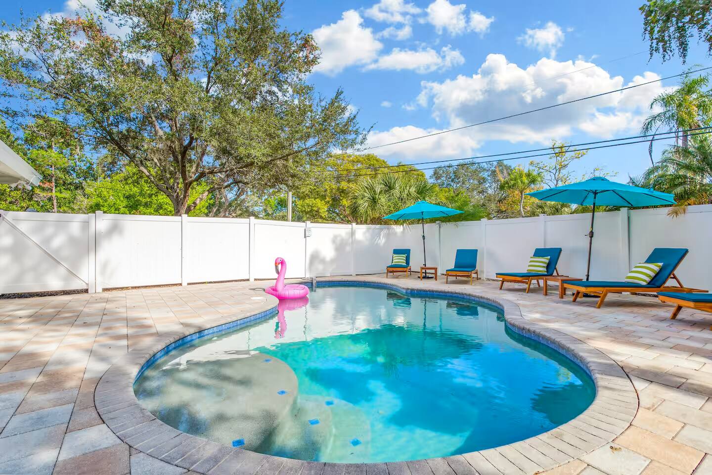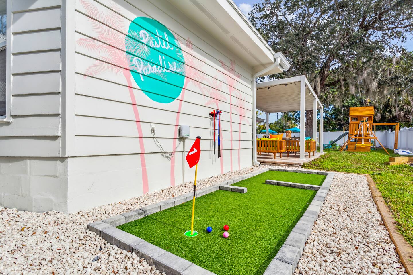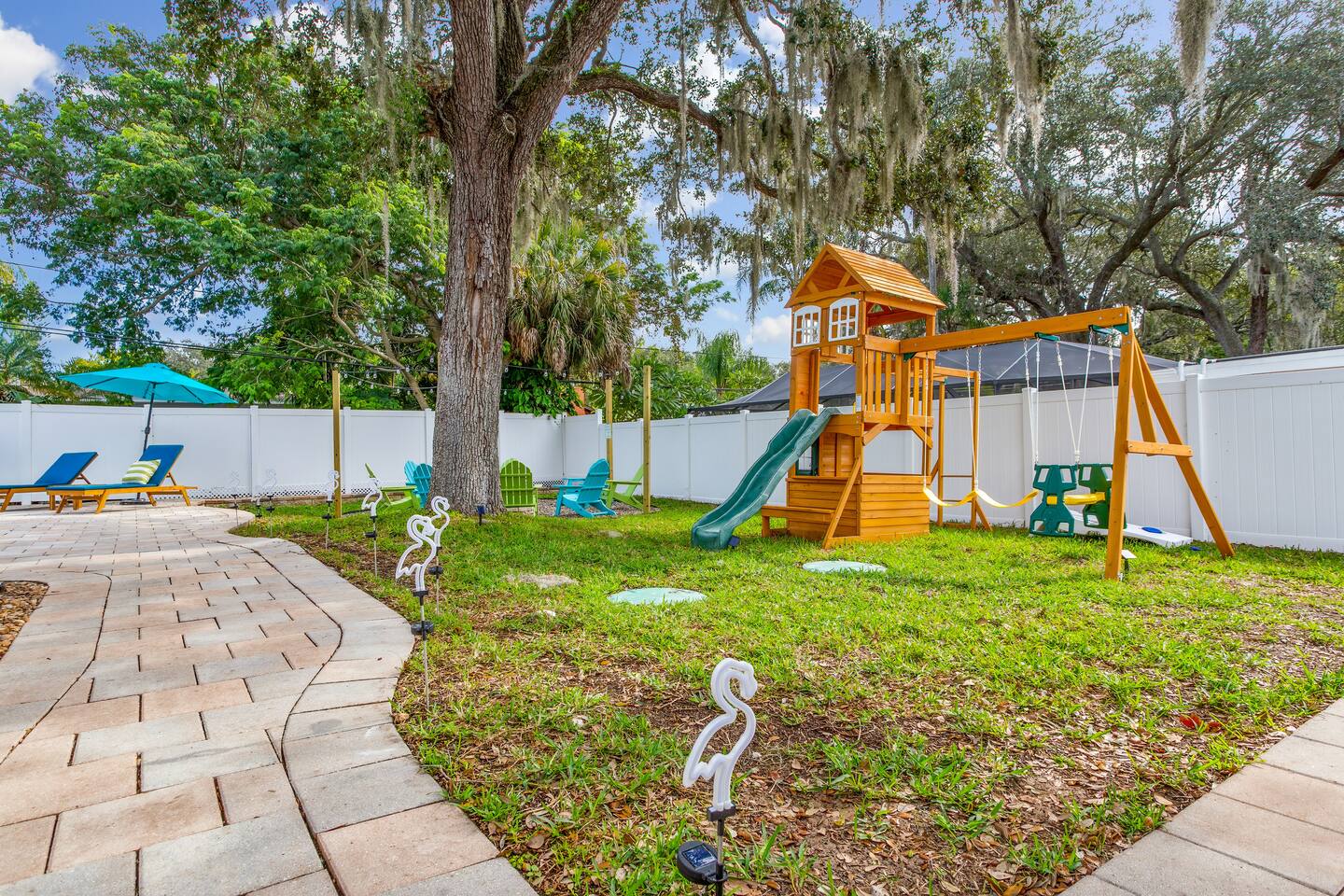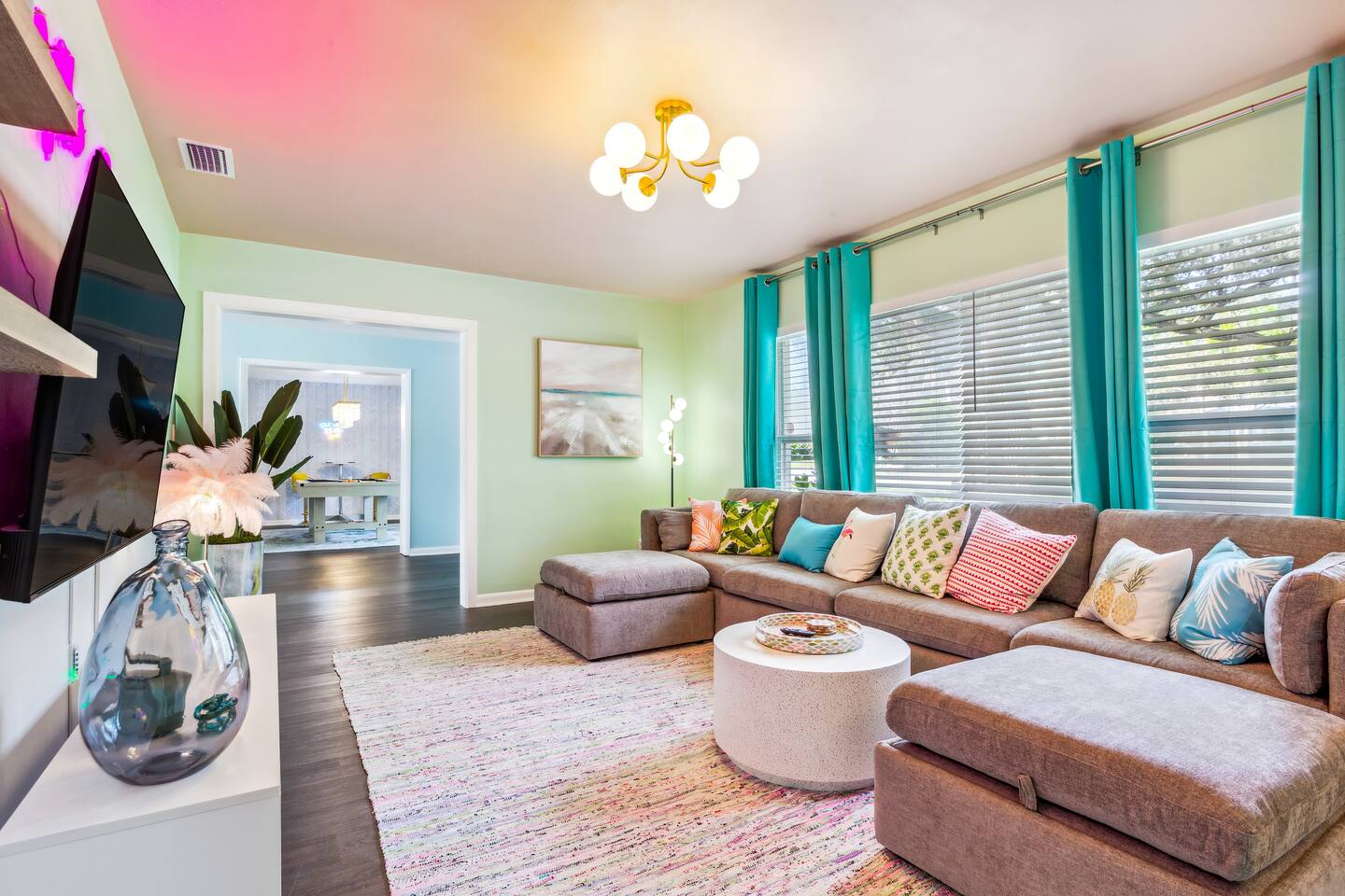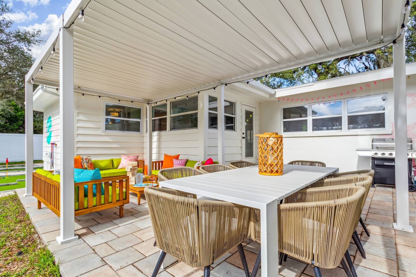 KEY FEATURES: ☀ 5 spacious bedrooms with fun, unique designs; 1 king, 2 queens, 4 fulls, & 2 twin beds ☀ 2 full bathrooms ☀ Beautiful chef's kitchen with modern appliances & design ☀ Living room with lots of comfy seating and large smart TV ☀ Game rooms with pool table, air hockey, arcade games, & more ☀ Vibrant dining room that opens up to the main living area; great for entertaining! ☀ Huge backyard with heated pool, mini golf, fire pit, games, and more ☀ Quiet, private neighborhood just minutes away from beautiful beaches! Here Are A Few Kind Words From Our Past Guests: “This was a great place to stay! The morning light through the windows was so beautiful. Overall, just a relaxing experience. The hosts were super responsive whenever I had a question. I would stay again!” - Emily “Sabrina was very accommodating and communicative. the house is beautiful and very comfortable, close to nature hikes.” - Jennifer “This place was lovely! Exactly as pictured! Very clean and excellent host experience!!! I plan to come back again!” - Regina ☆☆ BEDROOMS ☆☆ There are 5 beautiful bedrooms throughout this home. On one end of the home, you will find the first two bedrooms; one with a king bed (& smart TV), and the other with a queen bed. As you move along to the other side of the house, you'll find the three remaining bedrooms. One with another queen bed, another with 2 full beds, and the fifth (& most fun) room has two twin-over-full bunk beds, two slides, arcade games, air hockey, and lots of comfy seating to enjoy the large smart TV! ☆☆ BATHROOMS ☆☆ There are two full bathrooms in this home. One one end of the home is the first bathroom, with a sink, toilet, & shower/tub combo. On the other end of the house, the second bathroom has two sinks, a toilet, & a walk-in shower. ☆☆ KITCHEN & DINING ☆☆ The modern kitchen continues with the gorgeous, tropical vibe that is so perfectly designed through the entire home. With lots of counter space and bar tops seating, it's a great kitchen for entertaining! Just one room over is the dining room, which is bright, vibrant, and welcoming. The formal dining room seats 12, plus 2 countertop seats. There is also additional dining space right in the backyard, under the covered patio. ☆☆ LIVING ROOM ☆☆ As you walk into the home, you're greeted with the big, open living room, which has lots of comfy seating and a big smart TV. It's a great place for your movie or game nights, where the whole family can sit together in this cozy space! ☆☆ GAME ROOM ☆☆ On top of all the other amenities we offer here, you will find a game room filled with a pool table, smart TV, & hightop seating, of course with a gorgeous beach vibe! ☆☆ OUTDOOR SPACE ☆☆ This backyard is everything you could ask for, and more! ☀ Heated pool ☀ Fire pit ☀ Mini golf ☀ Bowling ☀ Jungle gym ☀ Corn hole ☀ Giant Connect 4 ☀ Giant Jenga ☀ BBQ grill ☀ Covered dining ☀ Covered lounge seating ☀ Sun loungers There is so much to do here, that all of your friends & family will be thoroughly entertained throughout your entire stay. No matter the season, this backyard has it all. Book your stay with us today and you will NOT be disappointed. Get ready for a vacation you will never forget! ★☆ Book Now & Let Us Take Care Of You In Seminole! ☆★