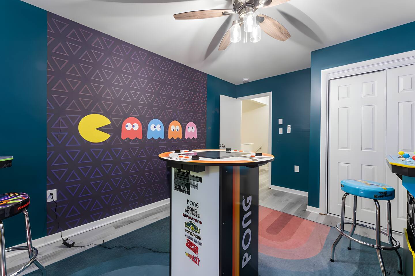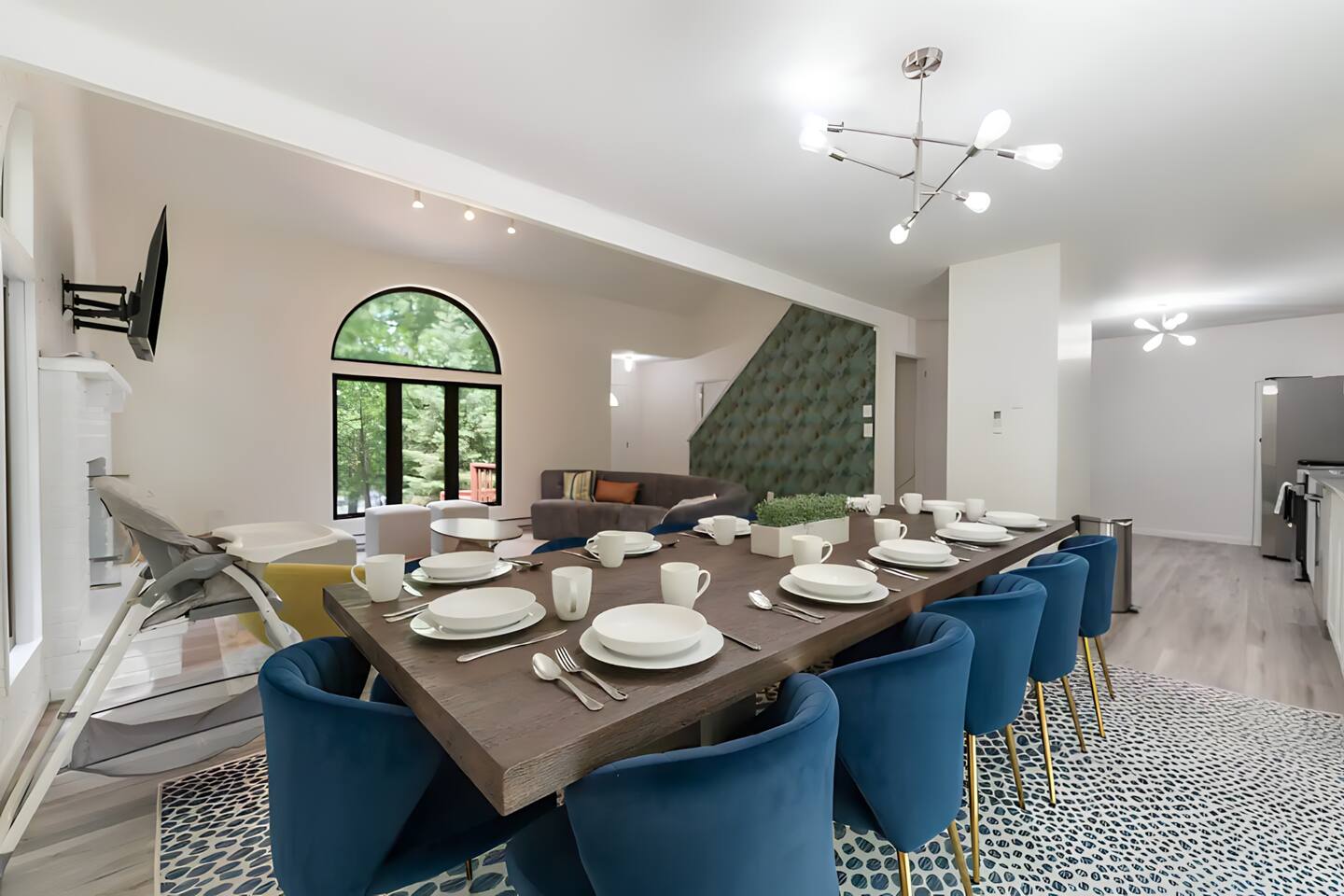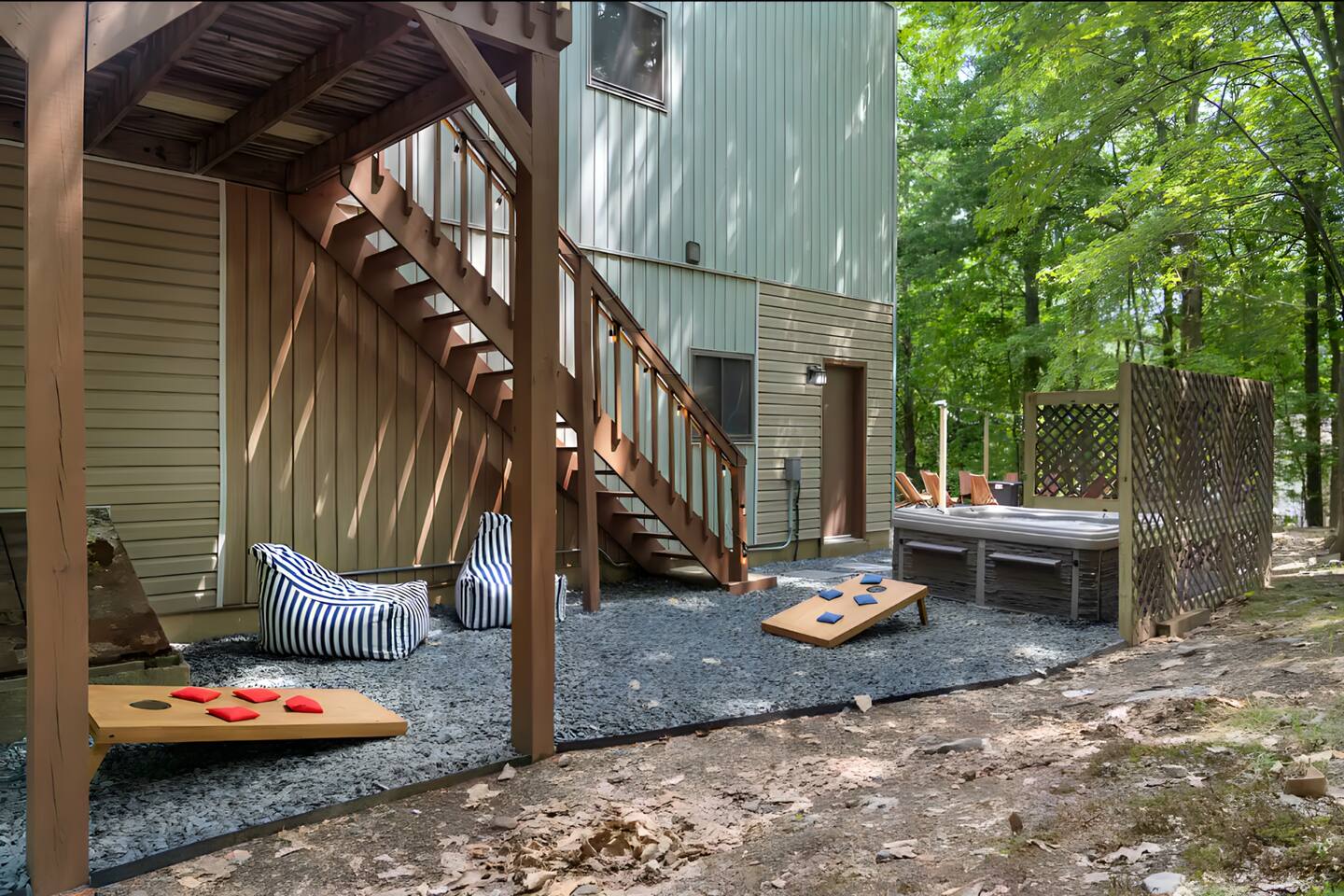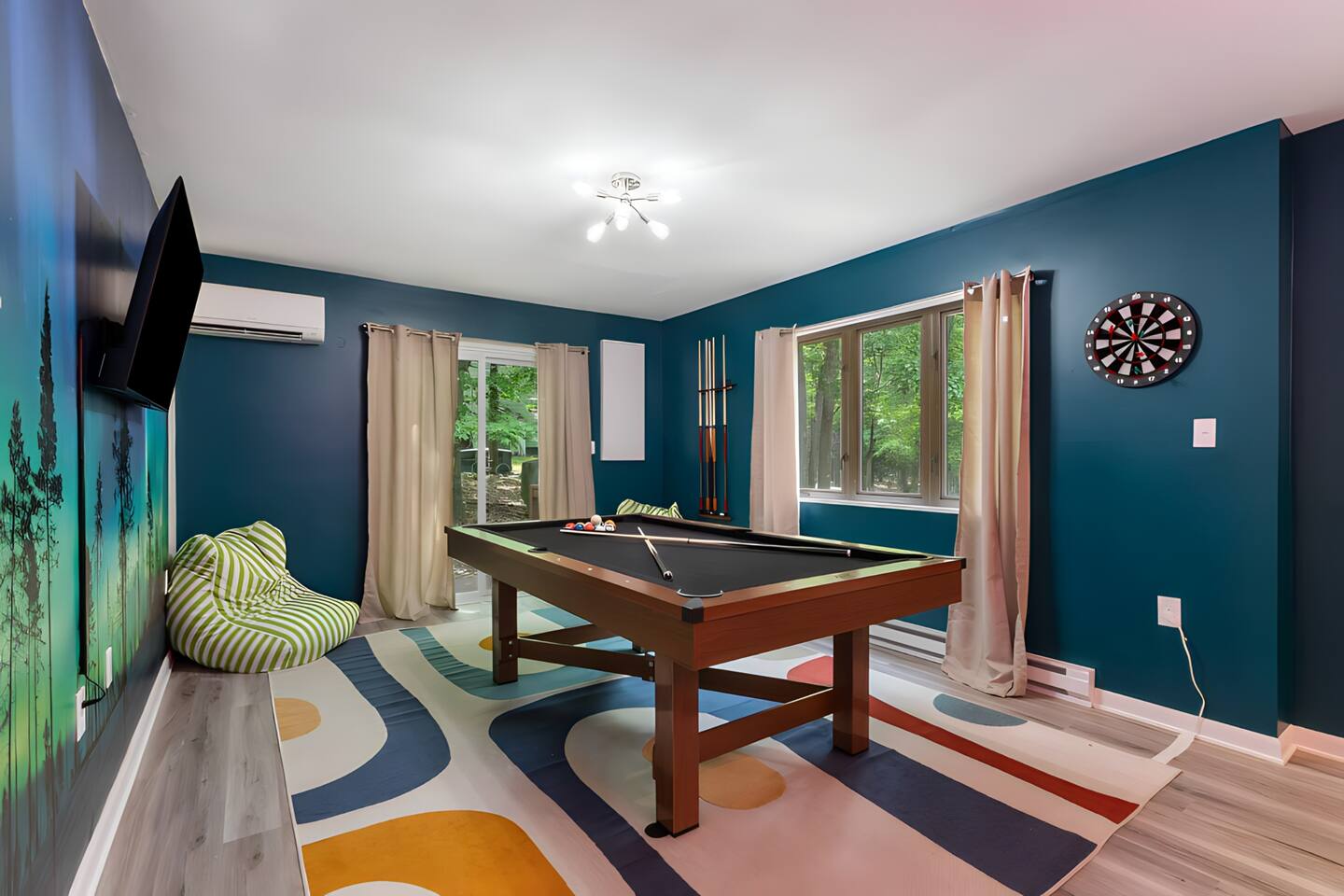 **During the summer months (Memorial Day weekend - Labor Day weekend), you will receive amenity badges that allow you to access the following amenities. If you’re staying with us outside of these dates, these amenities will be closed.** ☀ Lakes (with beach access - swimming allowed!) ☀ Pools ☀ Tennis courts ☀ Basketball courts ☀ Volleyball courts ☀ Dog park ☀ Playground areas KEY FEATURES: ☀ 5 beautiful bedrooms; 2 kings, 1 queen, 2 fulls, & 3 twin beds ☀ 3 full bathrooms ☀ Modern kitchen with new, stainless steel appliances ☀ Open living room with lots of comfy seating & smart TV ☀ Dining room with seating to comfortably accommodate 12 ☀ TWO amazing game rooms; pool table, arcade games, board games, darts, & more! ☀ Private & peaceful backyard surrounded by nature; hot tub, fire pit, & more! Here Are A Few Kind Words From Our Past Guests: “This was a great place to stay! The morning light through the windows was so beautiful. Overall, just a relaxing experience. The hosts were super responsive whenever I had a question. I would stay again!” - Emily “Sabrina was very accommodating and communicative. the house is beautiful and very comfortable, close to nature hikes.” - Jennifer “This place was lovely! Exactly as pictured! Very clean and excellent host experience!!! I plan to come back again!” - Regina ☆☆ BEDROOMS ☆☆ This three-level home has 5 bedrooms throughout. On the ground level, there are two bedrooms. One bedroom has a king bed, while the other has two twins & one full bed, plus two designated workspaces. On the second level, there is one bedroom with a king bed, smart TV, & private ensuite bathroom. The third level has the two remaining bedrooms. One bedroom has a full size bed, while the other has one queen & one twin. ☆☆ BATHROOMS ☆☆ There are three full bathrooms in this home; one on each level. The ground level bathroom has one sink, toilet, and shower/tub combo. The second level bathroom (private master ensuite) has two sinks, toilet, and shower/tub combo. The last bathroom on the third level has one sink, toilet, and shower/tub combo. ☆☆ KITCHEN & DINING ☆☆ The modern kitchen is located right off of the main living areas, and is loaded with all new stainless steel appliances & a coffee station (including a Keurig & coffee pods). The dining room is right next to the kitchen, with enough seating to comfortably fit 12 people, and opens right up to the rest of the living areas & also has direct access to the private back deck. ☆☆ LIVING ROOM ☆☆ In the living room, you’ll be greeted with lots of comfy seating, a big smart TV, and beautiful, modern design that will catch your eye as soon as you enter! This is the perfect spot to host your movie nights & games with your friends and family. ☆☆ GAME ROOMS ☆☆ Keep your family and friends entertained throughout your stay in our TWO amenity-filled game rooms! Pool table, darts, smart TV, and LOTS of arcade games. Whether your reason for staying is to explore the town or stay at home and relax, this place will be the perfect spot to unwind! ☆☆ OUTDOOR SPACE ☆☆ This backyard is everything you could ask for, and more! ☀ TWO fire pits (one on the second level deck & one in the backyard) ☀ Private hot tub ☀ Comfy lounge seating ☀ Corn hole ☀ BBQ grill There is so much to do here, that all of your friends & family will be thoroughly entertained throughout your entire stay. No matter the season, this backyard has it all. Book your stay with us today and you will NOT be disappointed. Get ready for a vacation you will never forget! ★☆ Book Now & Let Us Take Care Of You In The Poconos! ☆★