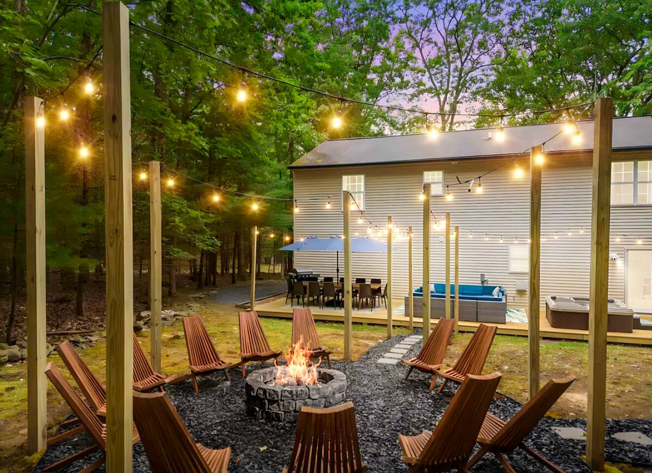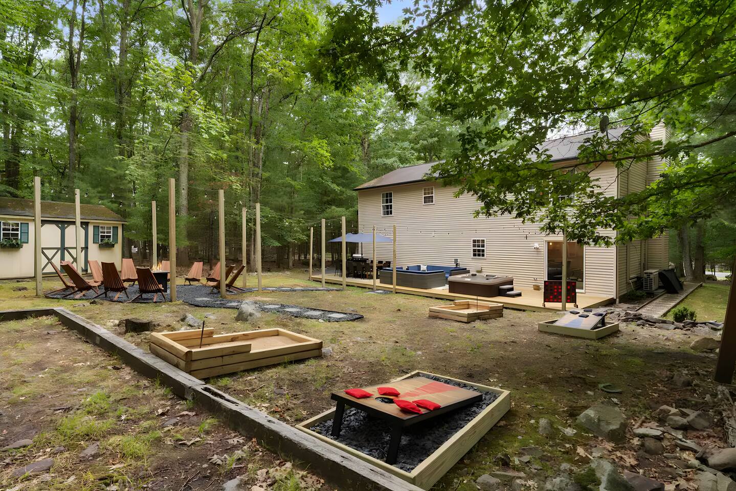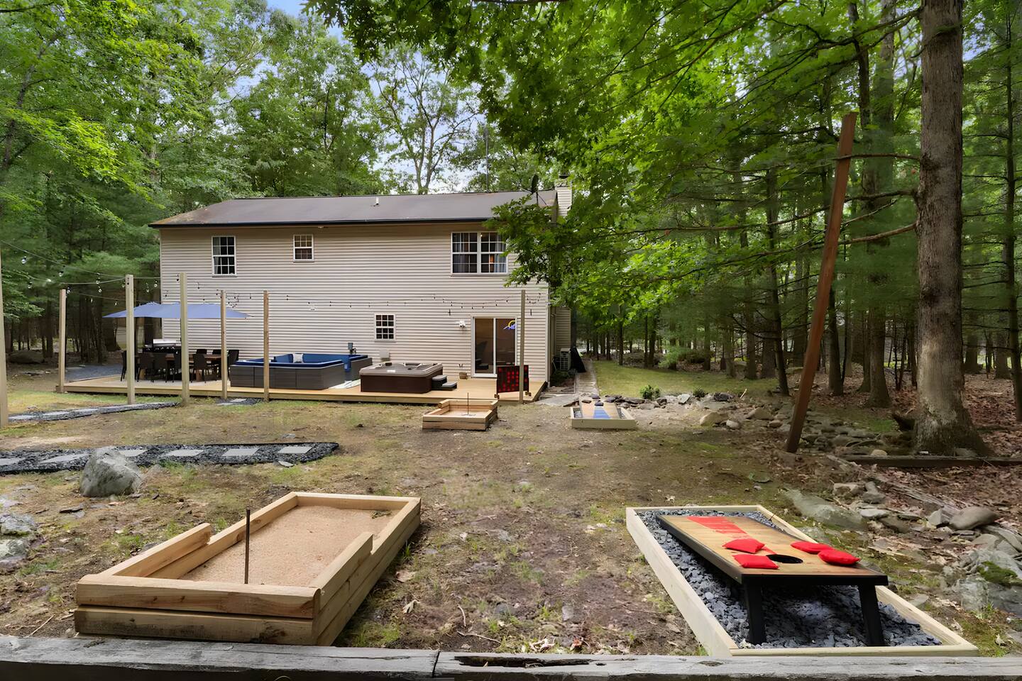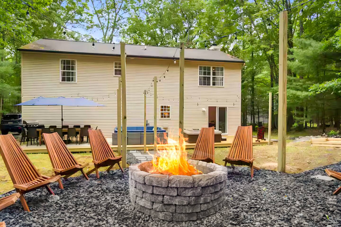 **During the summer months (Memorial Day weekend - Labor Day weekend), you will receive amenity badges that allow you to access the following amenities. If you’re staying with us outside of these dates, these amenities will be closed.** ☀ Lakes (with beach access - swimming allowed!) ☀ Pools ☀ Tennis courts ☀ Basketball courts ☀ Volleyball courts ☀ Dog park ☀ Playground areas KEY FEATURES: ☀ 5 beautiful bedrooms; 2 kings, 1 full, & 6 twin beds (including 2 sets of bunk beds) ☀ 2 full bathrooms ☀ Modern kitchen with new, stainless steel appliances ☀ Open living room with lots of comfy seating & smart TV ☀ Dining room with seating to accommodate 10 (+ 2 countertop seats) ☀ Fun game room with pool table, arcade games, & more! ☀ TONS of amenities in the private backyard; hot tub, fire pit, corn hole, ring toss, jungle gym, & more! Here Are A Few Kind Words From Our Past Guests: “This was a great place to stay! The morning light through the windows was so beautiful. Overall, just a relaxing experience. The hosts were super responsive whenever I had a question. I would stay again!” - Emily “Sabrina was very accommodating and communicative. the house is beautiful and very comfortable, close to nature hikes.” - Jennifer “This place was lovely! Exactly as pictured! Very clean and excellent host experience!!! I plan to come back again!” - Regina ☆☆ BEDROOMS ☆☆ Each of the 5 bedrooms in this home have been masterfully designed for beauty & comfort, all of which are upstairs. Two bedrooms have one king bed & smart TV in each, the third bedroom has one full size bed, the fourth has two twins (& arcade games!), and the fifth bedroom has 4 twin beds (2 bunk beds) & an attached bathroom. ☆☆ BATHROOMS ☆☆ There are two full bathrooms in this home. The first is on the lower level, with a sink, toilet, and walk-in shower. The other bathroom is on the second level, with one sink, toilet, and shower/tub combo. ☆☆ KITCHEN & DINING ☆☆ The modern kitchen is located right off of the main living areas, and is loaded with all new stainless steel appliances & a coffee station (including a Keurig & coffee pods). The dining room is right next to the kitchen, with enough seating to fit 10 people, plus two countertop seats. ☆☆ LIVING ROOM ☆☆ In the living room, you’ll be greeted with lots of comfy seating & a big smart TV. This is the perfect spot to host your movie nights & games with your friends and family! ☆☆ GAME ROOM ☆☆ Keep your family and friends entertained throughout your stay in our amenity-filled game room! Pool table, two arcade games, and darts. Whether your reason for staying is to explore the town or stay at home and relax, this place will be the perfect spot to unwind! ☆☆ OUTDOOR SPACE ☆☆ This backyard is everything you could ask for, and more! ☀ Hot tub ☀ Fire pit ☀ Jungle gym ☀ Corn hole ☀ Ring toss ☀ BBQ grill ☀ Covered outdoor dining ☀ Outdoor lounge seating There is so much to do here, that all of your friends & family will be thoroughly entertained throughout your entire stay. No matter the season, this backyard has it all. Book your stay with us today and you will NOT be disappointed. Get ready for a vacation you will never forget! ★☆ Book Now & Let Us Take Care Of You In The Poconos! ☆★