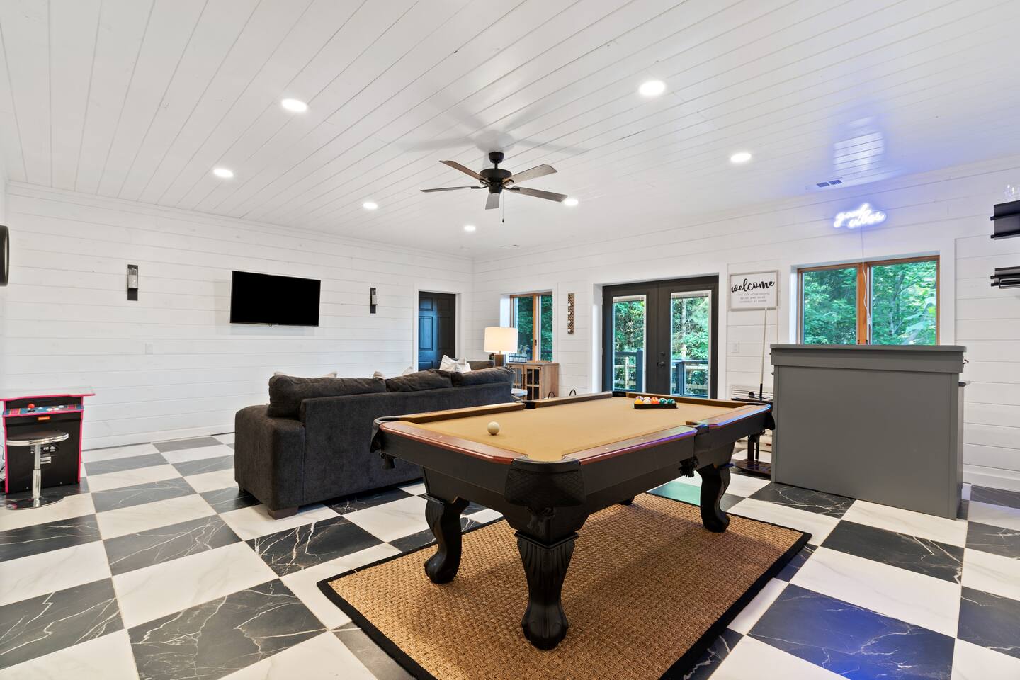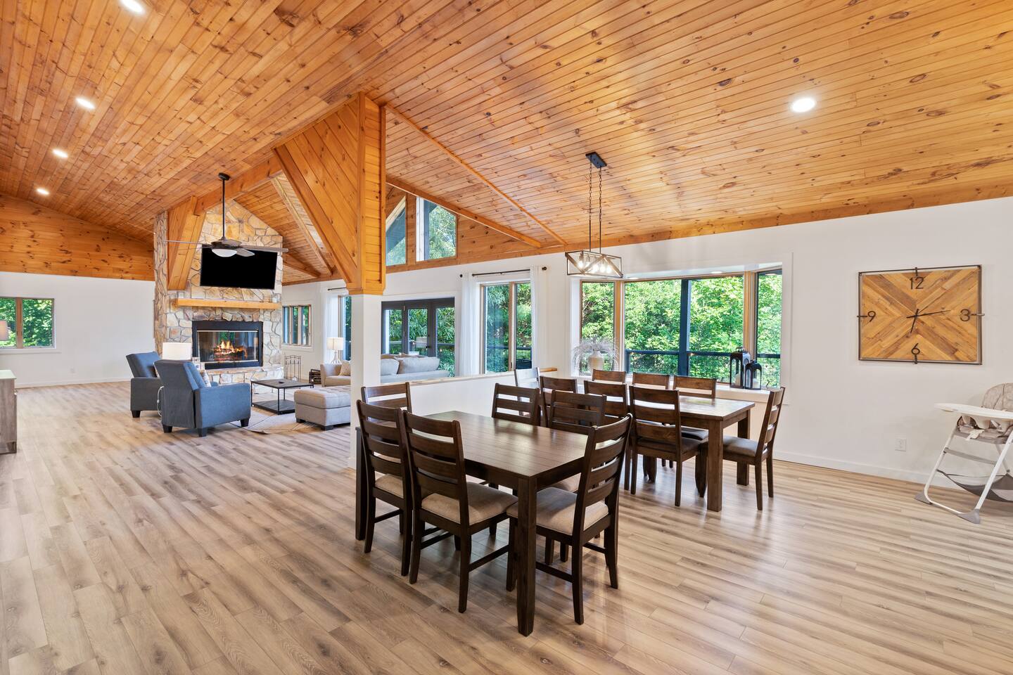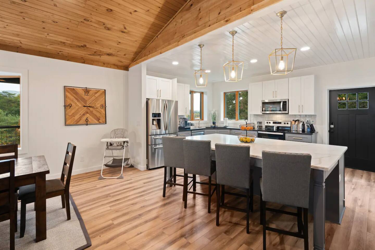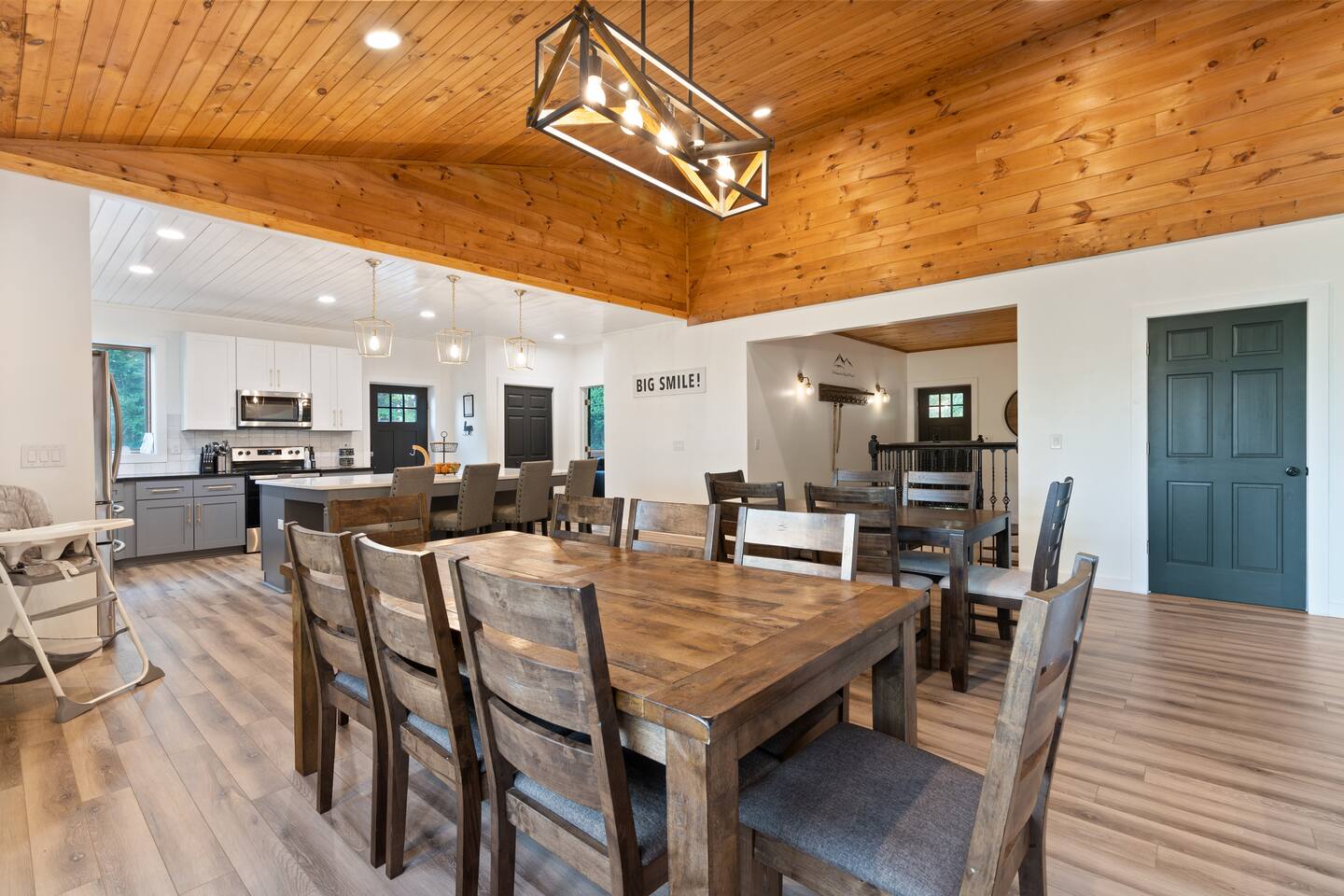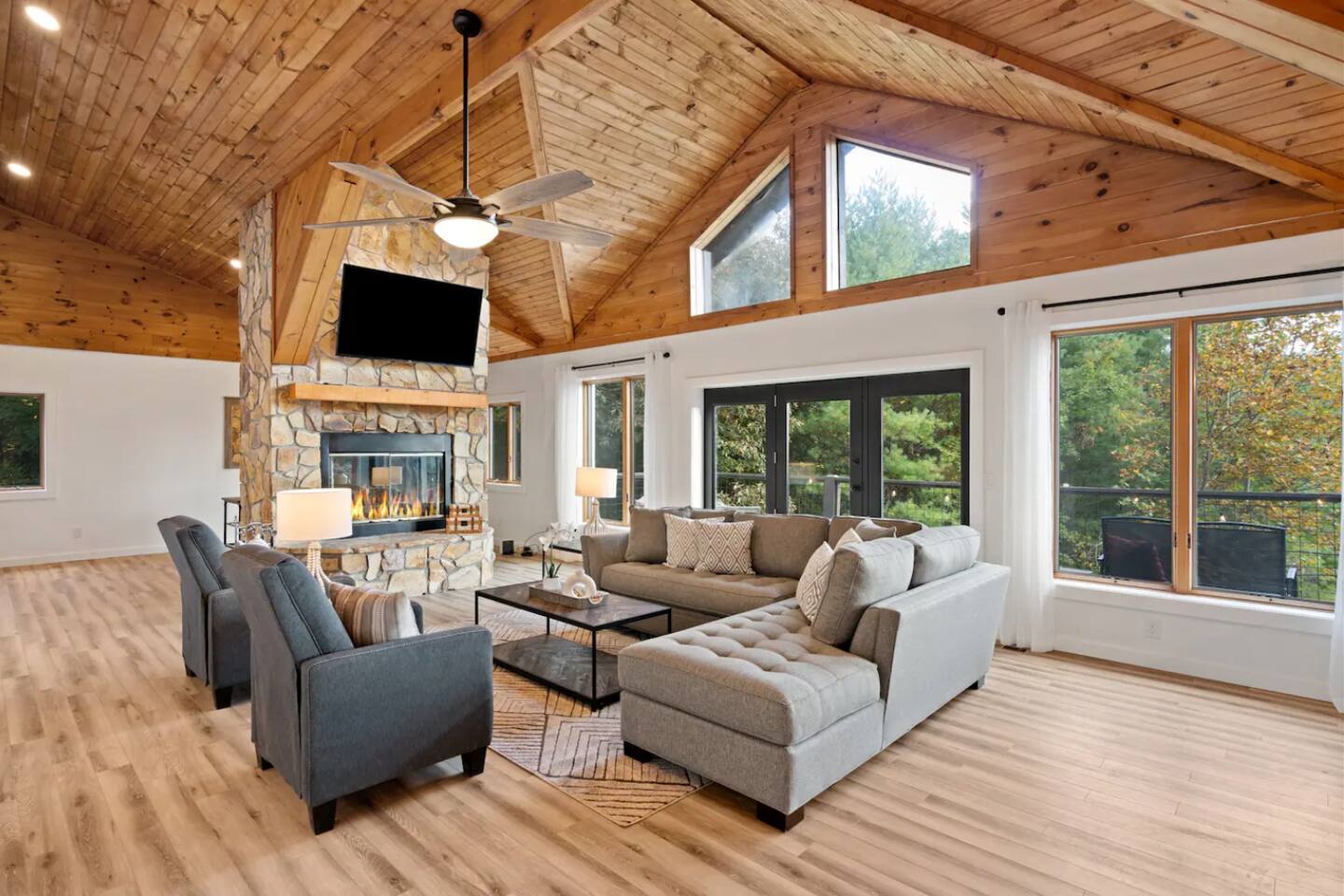 KEY FEATURES: ☀ 6 spacious bedrooms; 3 kings, 2 queens, 2 fulls, & 2 twins ☀ 4 full bathrooms + 1 half bath (beautifully renovated!) ☀ Brand new modern chef's kitchen ☀ Open-concept living space with panoramic views of the mountains & high vaulted ceilings ☀ Huge, private deck with tons of seating, entertainment, and open space! ☀ Private hot tub below the deck with an unbelievable view ☀ Game room with tons of entertainment ☀ High-speed wifi and smart TVs throughout the home ☀ Complete privacy from the neighbors ☀ VIEWS, VIEWS VIEWS!!! Here Are A Few Kind Words From Our Past Guests: "House is beautiful! Very clean, great location, easy check in, and great communication! Would definitely come back!" - Patty "We loved staying here! The location is perfect and the house was just as pictured. The hosts are super responsive and would definitely book again!" - Ashley "We had a great time staying here! The location was secluded, but not completely remote. The house was clean and comfortable with plenty of amenities. It was a perfect place for our pup too." - Michael ☆☆ BEDROOMS ☆☆ Tons to pick from! This home provides you with six bedrooms. On the main level, you will find the master bedroom with a king bed, smart TV, and attached master ensuite bathroom. On the other end of the main level, the second bedroom has another king bed and its own private entrance from the outside! The half bathroom on this level is just right down the hallway from this bedroom. The remaining four bedrooms are spread across the lower level. Right upon entering the bottom floor, you are greeted with a long hallway of bedrooms. First up is the bunk bedroom, with two twin-over-full bunk beds (total of 4 beds). This bedroom shares a full Jack-&-Jill bathroom with the adjacent bedroom, which has one queen bed. Further down the hall, you will find the third downstairs bedroom with a king bed and an attached full bathroom. As you keep walking, you will pass through the game room and into the fourth and final downstairs bedroom, with complete privacy on its own end of the floor. This bedroom has a queen bed with an attached full bathroom. ☆☆ BATHROOMS ☆☆ Each bathroom in this home has been completely renovated and beautifully designed. Starting in the master ensuite, you will have two separate sinks, a walk-in shower with two separate shower heads, and a standalone bath tub. The common bathroom on this level is accessible right off of the living area, with just one toilet & a sink (half bathroom). Downstairs, the Jack-&-Jill bathroom that connects two bedrooms has one sink and a walk-in shower. The bedroom across the hall has an attached bathroom equipped with one sink & shower/tub combo. The final bathroom on this floor is attached to the bedroom adjacent to the game room, which also has one sink & a shower/tub combo. ☆☆ KITCHEN & DINING ☆☆ When you walk through the front door and you are greeted with the absolutely stunning kitchen/dining room area, you won't believe your eyes. It's BREATHTAKING!! A completely redone, modern chef's kitchen with an oversized island and surrounding views of the Blue Ridge Mountains, fully stocked with all of the cooking essentials (yes, including a Keurig and coffee pods). The kitchen opens right up into the massive dining area with a huge bay window, featuring more fantastic views of the surrounding mountains. ☆☆ LIVING SPACE ☆☆ WOW! This living room makes such a grand statement as you walk into this house. A massive wood-burning fireplace, a smart TV, tons of comfy seating, and walls of windows so that you can enjoy the mountain views all from the comfort of the cozy living room. Just around the back side of the fireplace is a dedicated workspace with privacy from the rest of the living area. ☆☆ GAME ROOM ☆☆ The massive game room on the lower level is jam-packed with all the entertainment you need! A big smart TV, lots of comfy seating, a bar area, arcade games (Ms. Pac Man), and shuffleboard in the main room, with a ping pong table room just right next door. Of course, this space has also been completely remodeled to meet the modern luxury standards of the rest of the home. Oh, and just like every other part of this house, you will have easy access onto the back deck (steps away from the hot tub) and unbelievable views around every corner. ☆☆ OUTDOOR SPACE ☆☆ OMG! You won't find another outdoor space like we have here. Tons more comfy seating all across the multiple decks that wrap around the house, a wood-burning fire pit, swinging chairs, outdoor dining, a grill, and a hot tub that is located in one of the best viewpoints of the entire home! Sit back and relax in the steaming hot tub with some of the most breathtaking views you will ever see. What more could you ask for! ★☆ Book Today & Let Us Take Care Of You In Blue Ridge! ☆★