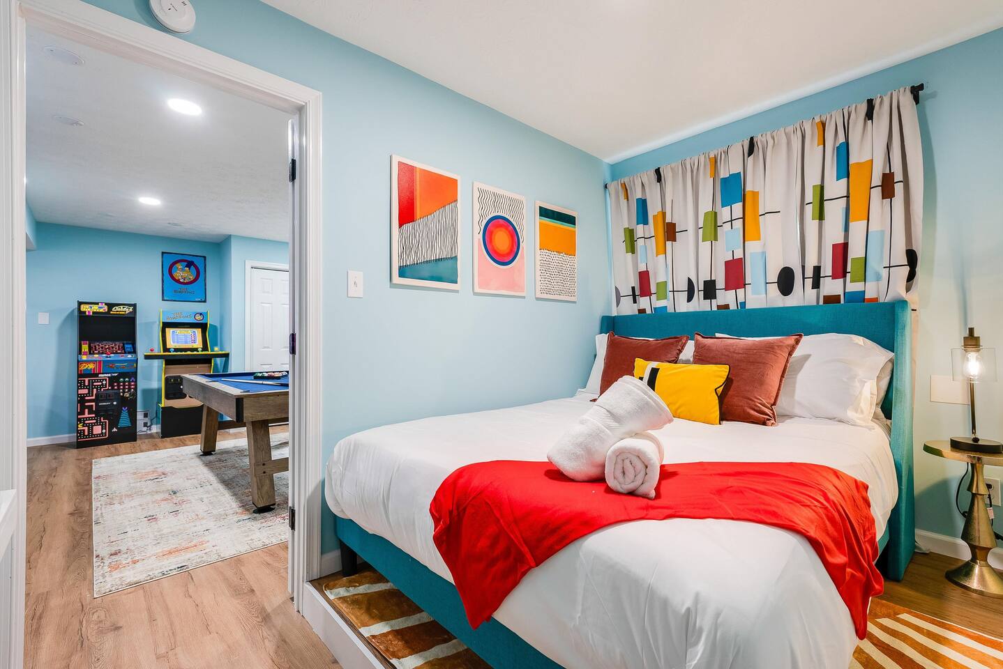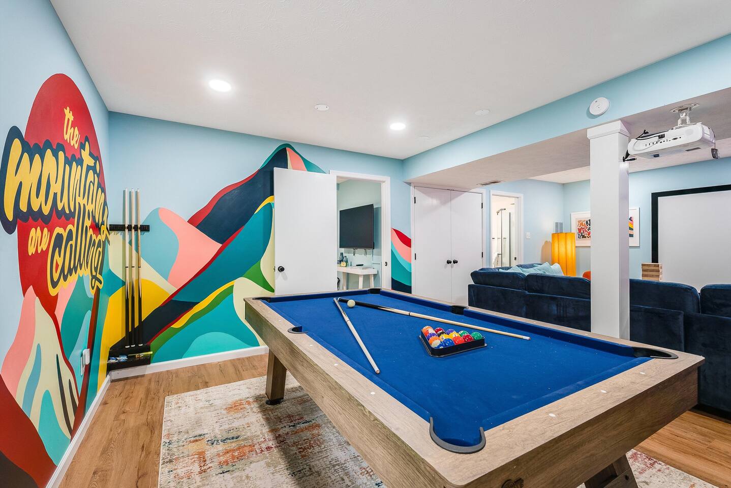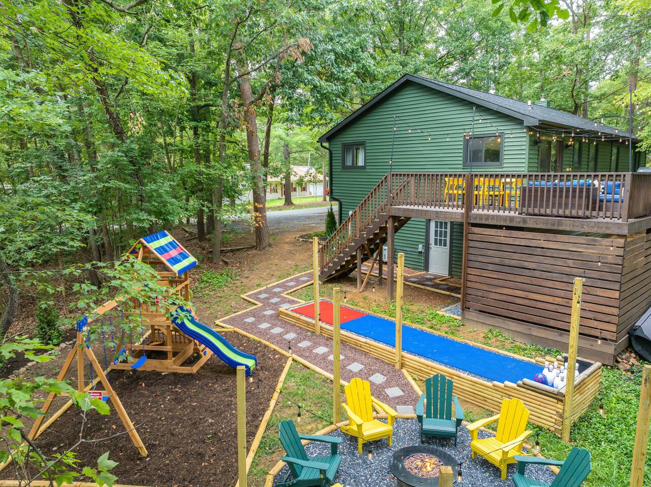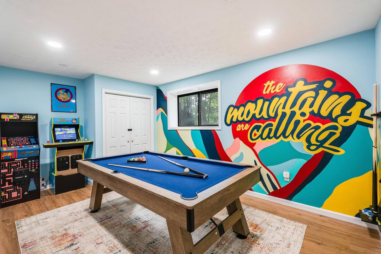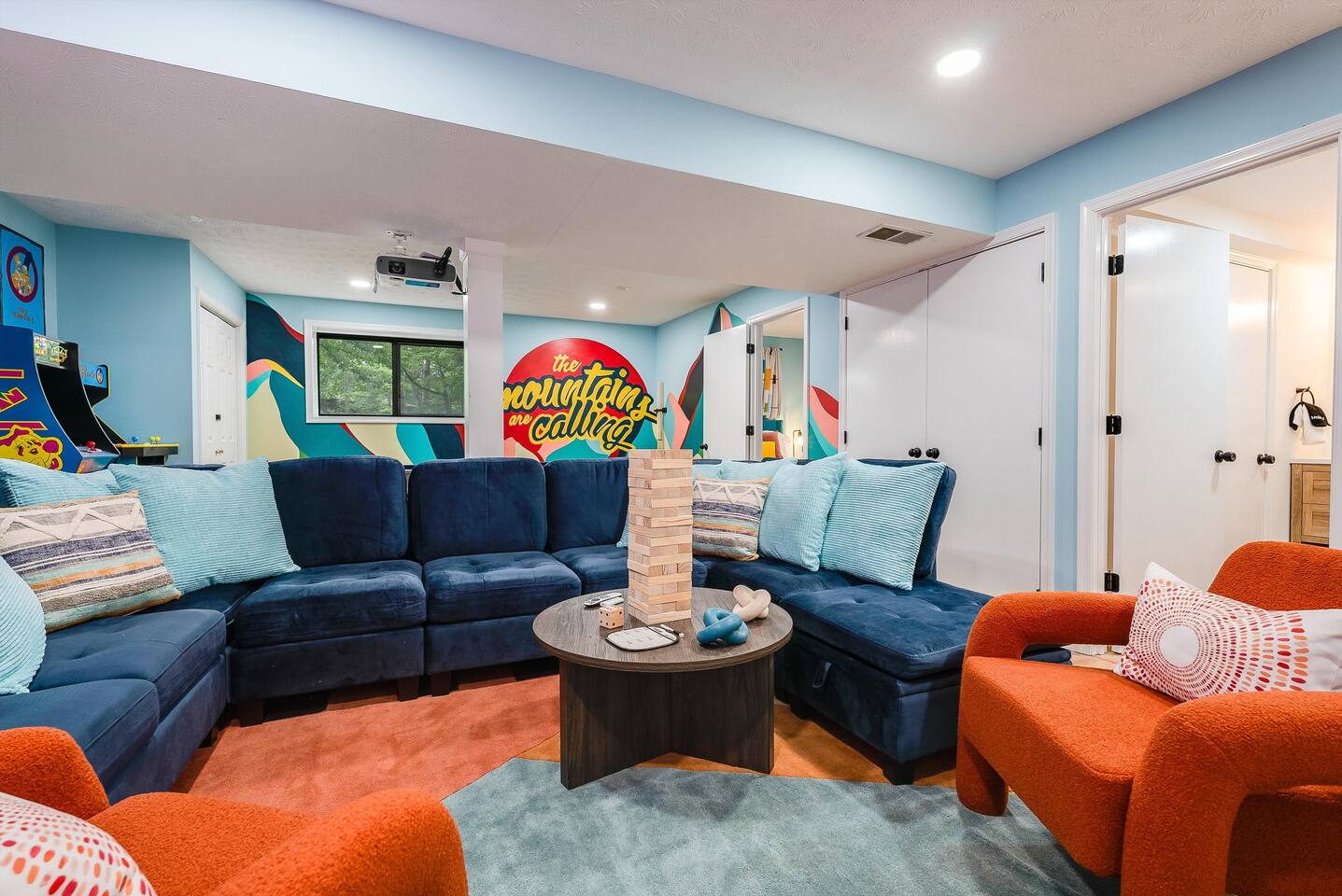 KEY FEATURES: ☀ 6 beautiful bedrooms; 1 king, 4 queens, & 3 full beds ☀ 3 clean, modern bathrooms ☀ Modern kitchen with new, stainless steel appliances ☀ Open living room with lots of comfy seating & smart TV ☀ Dining room with seating to comfortably accommodate 10 (+outdoor dining) ☀ AMAZING game room; pool table & arcade games! ☀ One-of-a-kind movie theater set-up, with huge projector screen & a big, comfy sectional! ☀ Beautiful, private backyard; hot tub, fire pit, bowling, jungle gym, games & more! Here Are A Few Kind Words From Our Past Guests: “This was a great place to stay! The morning light through the windows was so beautiful. Overall, just a relaxing experience. The hosts were super responsive whenever I had a question. I would stay again!” - Emily “Sabrina was very accommodating and communicative. the house is beautiful and very comfortable, close to nature hikes.” - Jennifer “This place was lovely! Exactly as pictured! Very clean and excellent host experience!!! I plan to come back again!” - Regina ☆☆ BEDROOMS ☆☆ There are 6 gorgeous bedrooms throughout this home. On the main floor, you'll find the master bedroom, with a king bed, smart TV, and ensuite master bathroom. Right across the hall you'll find two more bedrooms; one with a full bed & the other with a full-over-full bunk. Downstairs, there are three more bedrooms. Two with one queen bed in each, and the final bedroom with one queen-over-queen bunk bed. ☆☆ BATHROOMS ☆☆ This home has 3 full, modern bathrooms. The master ensuite bathroom has two sinks, a toilet, and a shower/tub combo. Right across the hall, the second full bathroom has a sink, toilet, and shower/tub combo. Downstairs, the third bathroom has a sink, toilet, and walk-in shower only. ☆☆ KITCHEN & DINING ☆☆ The modern kitchen is located right off of the main living areas, and is loaded with all new stainless steel appliances & a coffee station (including a Keurig & coffee pods). The dining room is right next to the kitchen, with enough seating to comfortably fit 10 people, plus additional dining space on the huge back deck! ☆☆ LIVING ROOM ☆☆ In the living room, you’ll be greeted with lots of comfy seating, a big smart TV, and gorgeous, colorful design along with a massive, fun mural. This is the perfect spot to host your movie nights & games with your friends and family! ☆☆ GAME ROOM ☆☆ Keep your family and friends entertained throughout your stay in our super fun game room! With a pool table & arcade games, this is the ideal hangout spot to keep you entertained for hours! ☆☆ MOVIE THEATER ☆☆ A truly unique space! In this home, you'll find a special theater set-up right off of the game room, with a big, comfy sectional couch & a HUGE projector screen. ☆☆ OUTDOOR SPACE ☆☆ This backyard is everything you could ask for, and more! ☀ Hot tub ☀ Fire pit ☀ Bowling ☀ Jungle gym ☀ Corn hole ☀ Giant Connect 4 ☀ BBQ grill ☀ Comfy lounge seating ☀ Outdoor dining There is so much to do here, that all of your friends & family will be thoroughly entertained throughout your entire stay. No matter the season, this backyard has it all. Book your stay with us today and you will NOT be disappointed. Get ready for a vacation you will never forget! ★☆ Book Now & Let Us Take Care Of You In Shenandoah Valley ! ☆★
