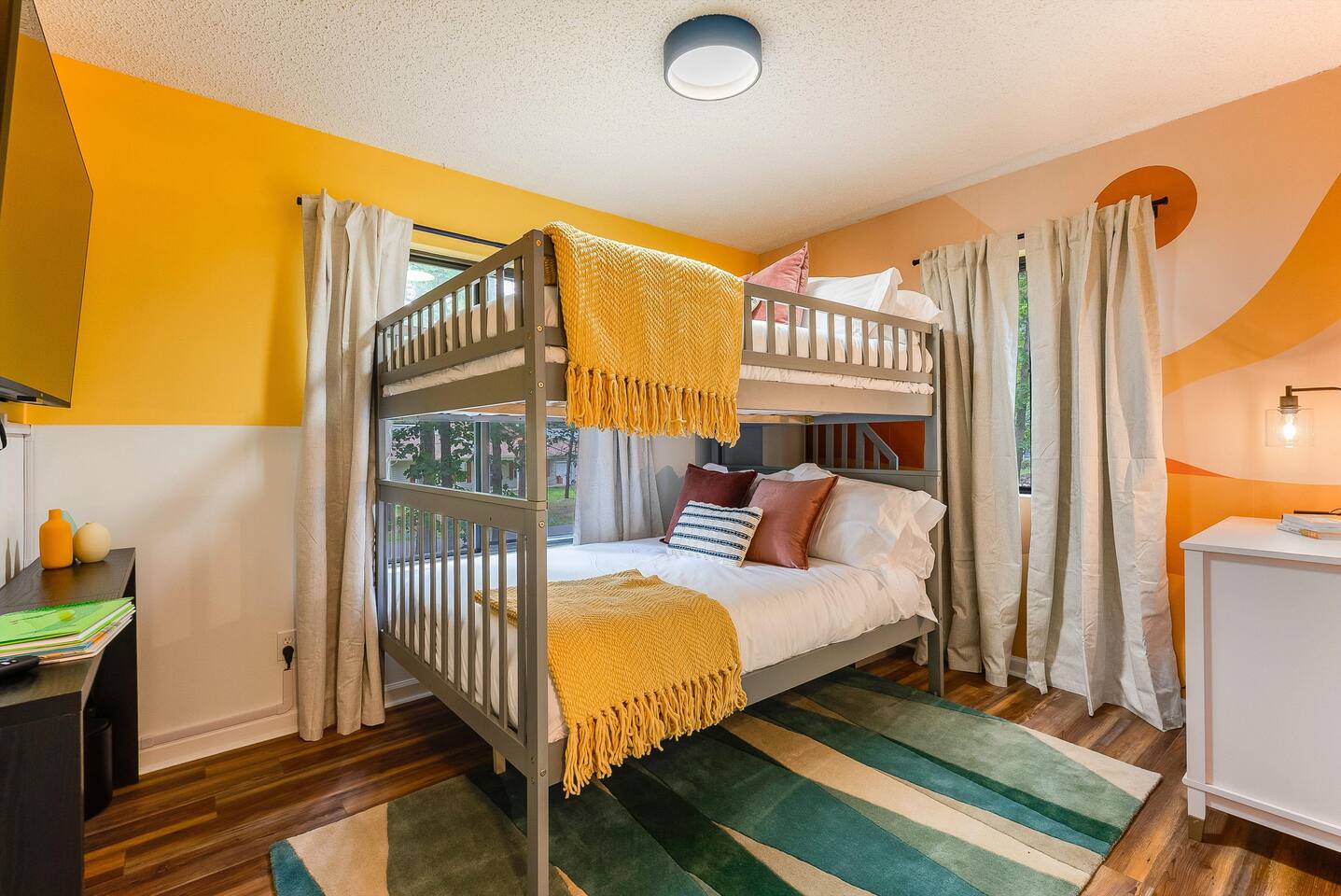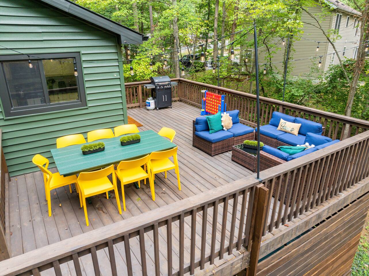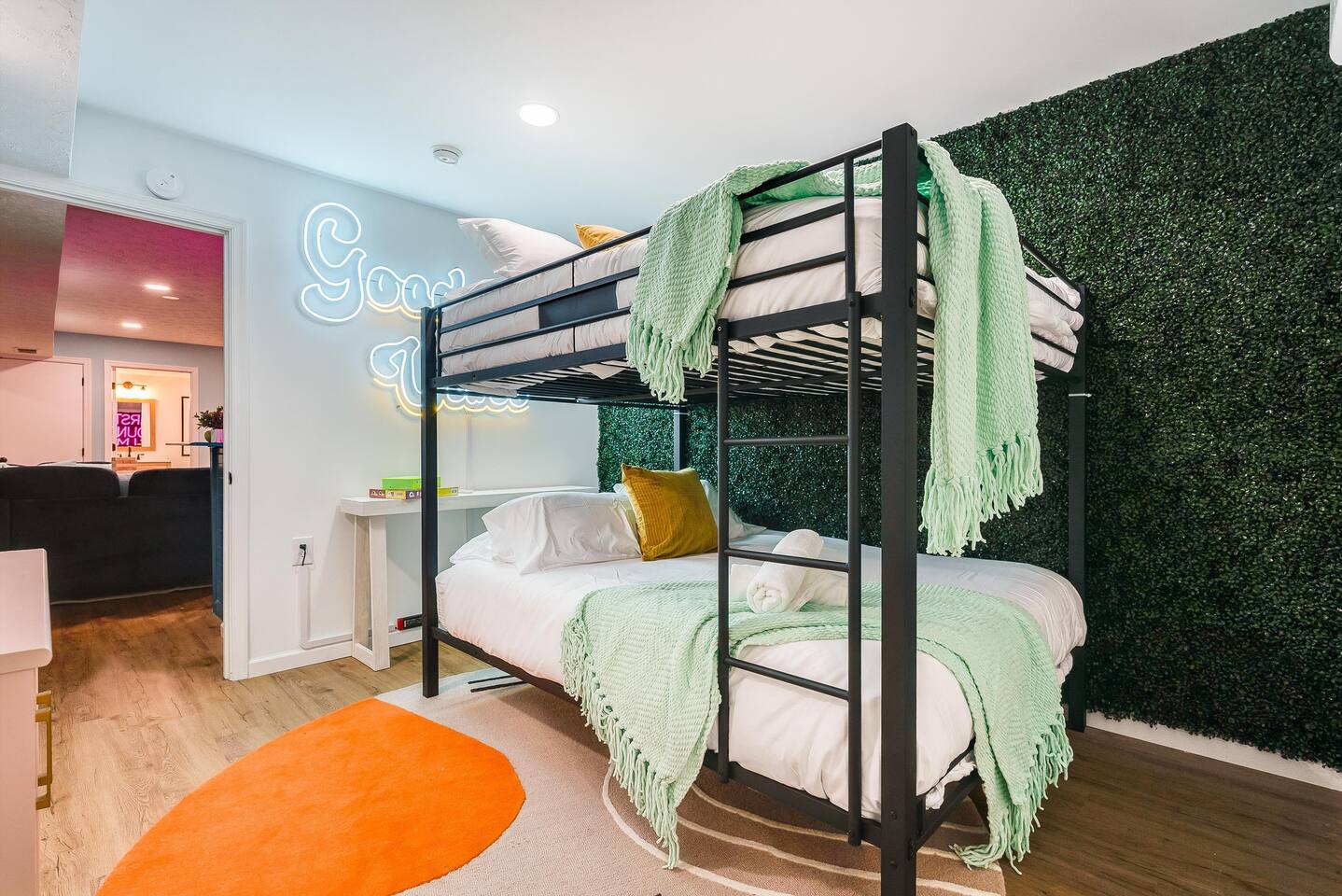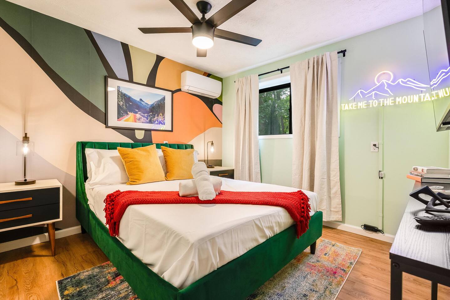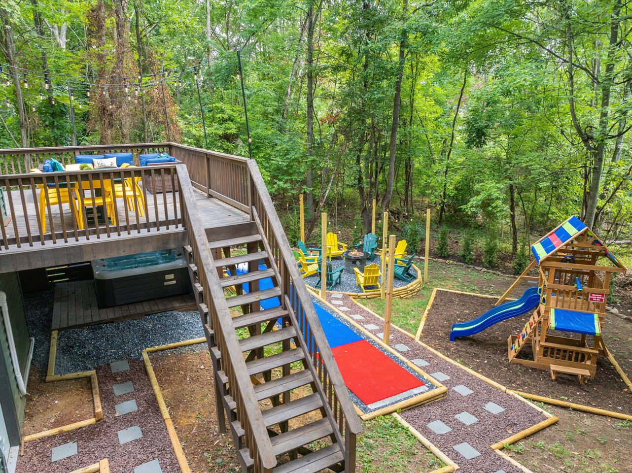 KEY FEATURES: ☀ 6 beautiful bedrooms; 1 king, 4 queens, & 3 full beds ☀ 3 clean, modern bathrooms ☀ Modern kitchen with new, stainless steel appliances ☀ Open living room with lots of comfy seating & smart TV ☀ Dining room with seating to comfortably accommodate 10 (+outdoor dining) ☀ AMAZING game room; pool table & arcade games! ☀ One-of-a-kind movie theater set-up, with huge projector screen & a big, comfy sectional! ☀ Beautiful, private backyard; hot tub, fire pit, bowling, jungle gym, games & more! Here Are A Few Kind Words From Our Past Guests: “This was a great place to stay! The morning light through the windows was so beautiful. Overall, just a relaxing experience. The hosts were super responsive whenever I had a question. I would stay again!” - Emily “Sabrina was very accommodating and communicative. the house is beautiful and very comfortable, close to nature hikes.” - Jennifer “This place was lovely! Exactly as pictured! Very clean and excellent host experience!!! I plan to come back again!” - Regina ☆☆ BEDROOMS ☆☆ There are 6 gorgeous bedrooms throughout this home. On the main floor, you'll find the master bedroom, with a king bed, smart TV, and ensuite master bathroom. Right across the hall you'll find two more bedrooms; one with a full bed & the other with a full-over-full bunk. Downstairs, there are three more bedrooms. Two with one queen bed in each, and the final bedroom with one queen-over-queen bunk bed. ☆☆ BATHROOMS ☆☆ This home has 3 full, modern bathrooms. The master ensuite bathroom has two sinks, a toilet, and a shower/tub combo. Right across the hall, the second full bathroom has a sink, toilet, and shower/tub combo. Downstairs, the third bathroom has a sink, toilet, and walk-in shower only. ☆☆ KITCHEN & DINING ☆☆ The modern kitchen is located right off of the main living areas, and is loaded with all new stainless steel appliances & a coffee station (including a Keurig & coffee pods). The dining room is right next to the kitchen, with enough seating to comfortably fit 10 people, plus additional dining space on the huge back deck! ☆☆ LIVING ROOM ☆☆ In the living room, you’ll be greeted with lots of comfy seating, a big smart TV, and gorgeous, colorful design along with a massive, fun mural. This is the perfect spot to host your movie nights & games with your friends and family! ☆☆ GAME ROOM ☆☆ Keep your family and friends entertained throughout your stay in our super fun game room! With a pool table & arcade games, this is the ideal hangout spot to keep you entertained for hours! ☆☆ MOVIE THEATER ☆☆ A truly unique space! In this home, you'll find a special theater set-up right off of the game room, with a big, comfy sectional couch & a HUGE projector screen. ☆☆ OUTDOOR SPACE ☆☆ This backyard is everything you could ask for, and more! ☀ Hot tub ☀ Fire pit ☀ Bowling ☀ Jungle gym ☀ Corn hole ☀ Giant Connect 4 ☀ BBQ grill ☀ Comfy lounge seating ☀ Outdoor dining There is so much to do here, that all of your friends & family will be thoroughly entertained throughout your entire stay. No matter the season, this backyard has it all. Book your stay with us today and you will NOT be disappointed. Get ready for a vacation you will never forget! ★☆ Book Now & Let Us Take Care Of You In Shenandoah Valley ! ☆★