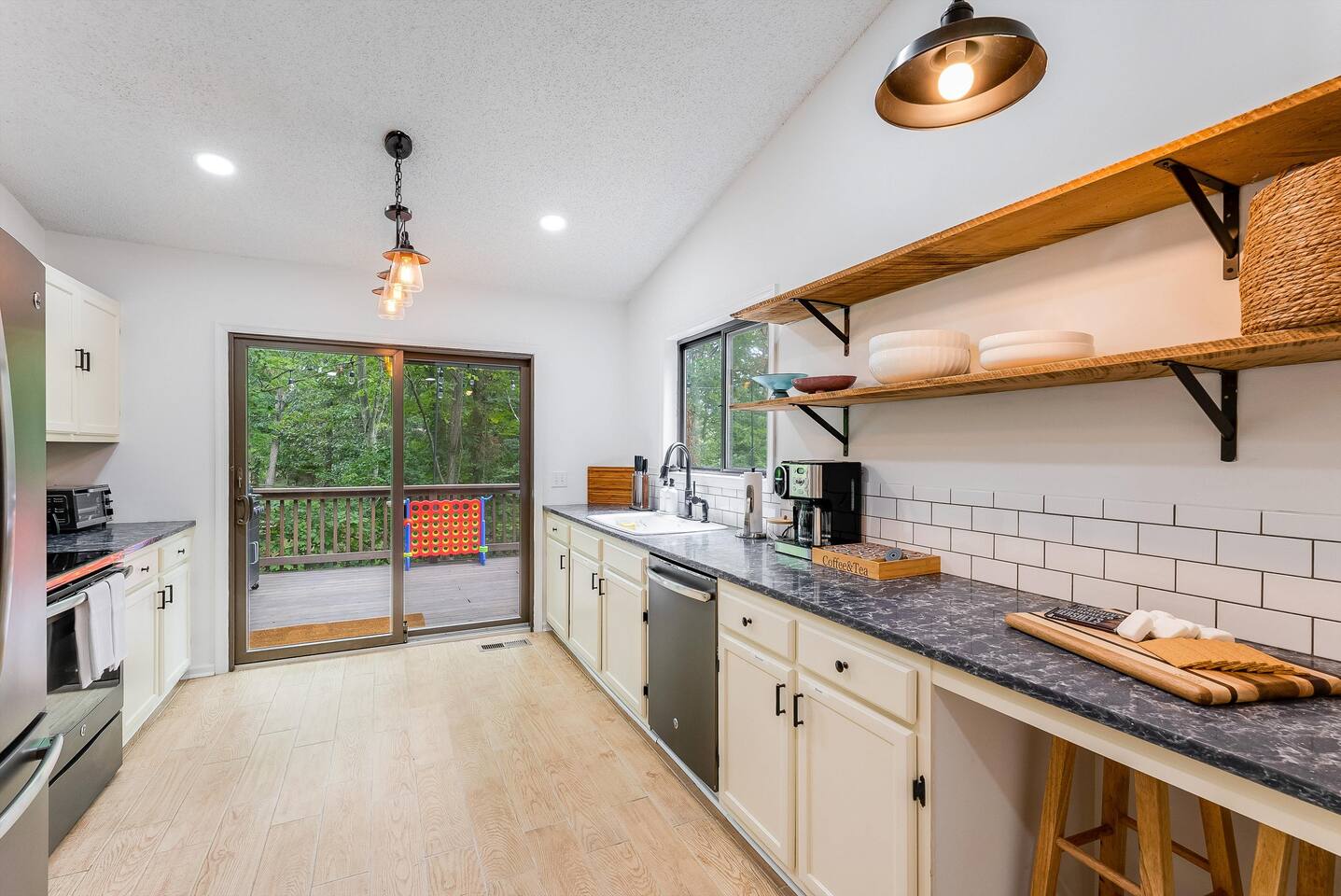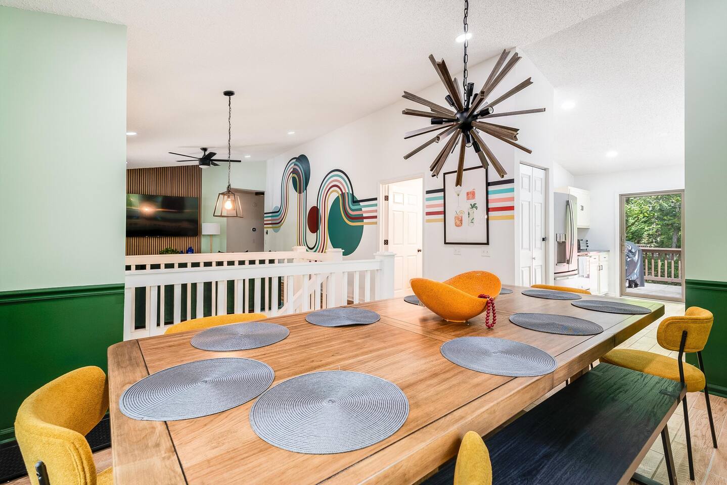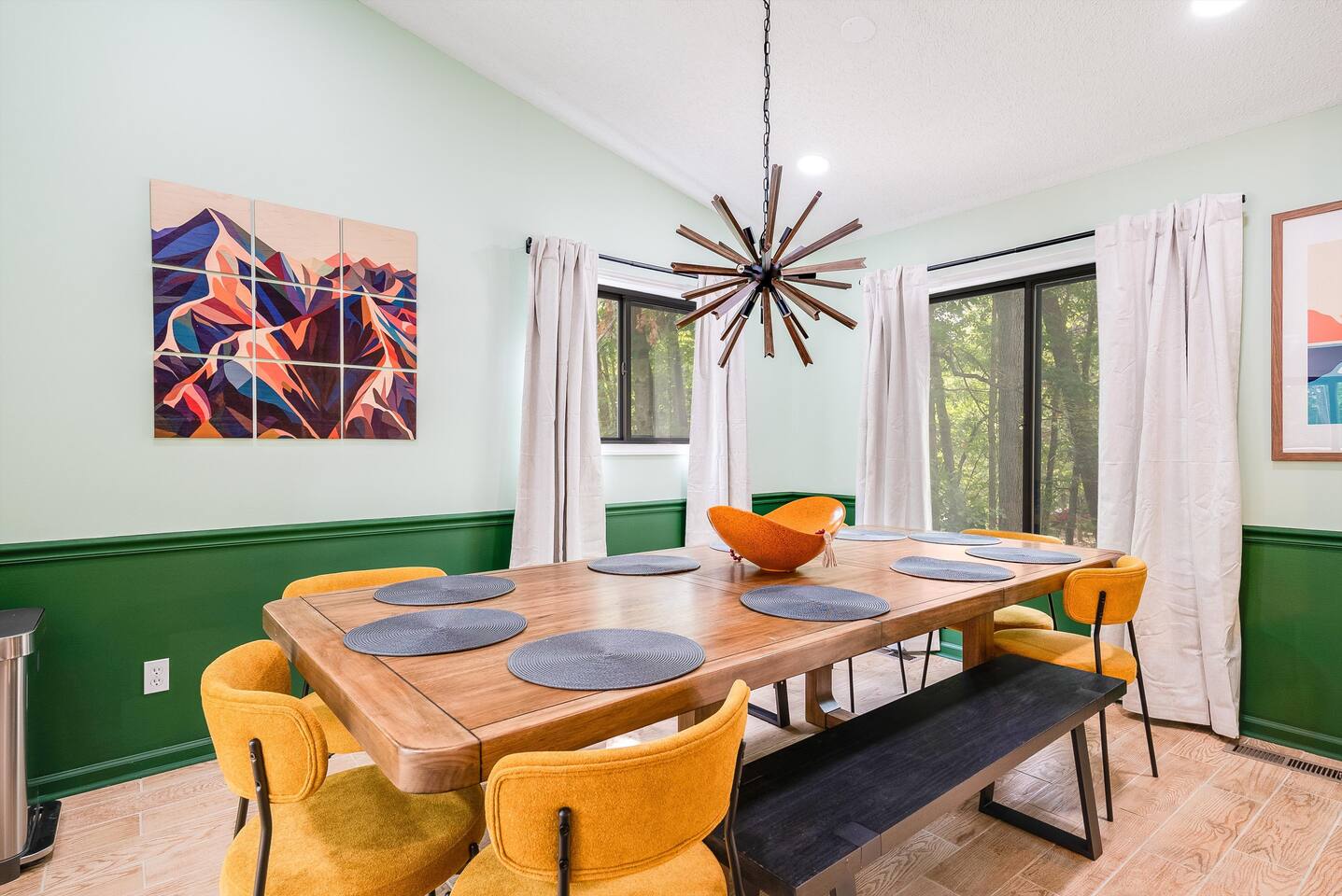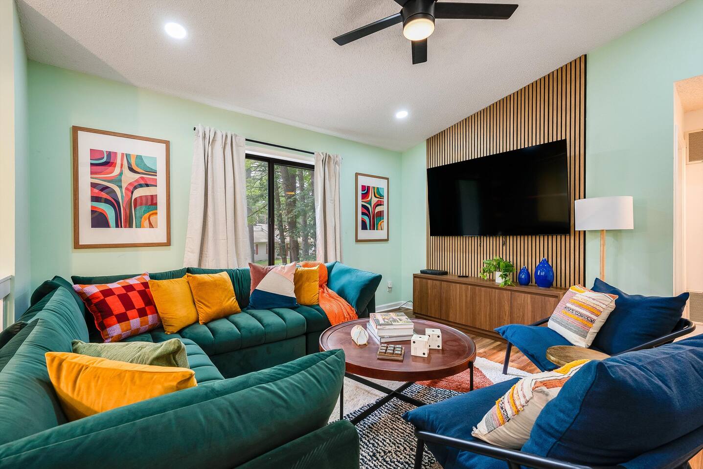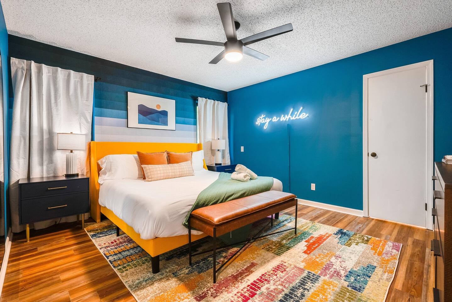 KEY FEATURES: ☀ 6 beautiful bedrooms; 1 king, 4 queens, & 3 full beds ☀ 3 clean, modern bathrooms ☀ Modern kitchen with new, stainless steel appliances ☀ Open living room with lots of comfy seating & smart TV ☀ Dining room with seating to comfortably accommodate 10 (+outdoor dining) ☀ AMAZING game room; pool table & arcade games! ☀ One-of-a-kind movie theater set-up, with huge projector screen & a big, comfy sectional! ☀ Beautiful, private backyard; hot tub, fire pit, bowling, jungle gym, games & more! Here Are A Few Kind Words From Our Past Guests: “This was a great place to stay! The morning light through the windows was so beautiful. Overall, just a relaxing experience. The hosts were super responsive whenever I had a question. I would stay again!” - Emily “Sabrina was very accommodating and communicative. the house is beautiful and very comfortable, close to nature hikes.” - Jennifer “This place was lovely! Exactly as pictured! Very clean and excellent host experience!!! I plan to come back again!” - Regina ☆☆ BEDROOMS ☆☆ There are 6 gorgeous bedrooms throughout this home. On the main floor, you'll find the master bedroom, with a king bed, smart TV, and ensuite master bathroom. Right across the hall you'll find two more bedrooms; one with a full bed & the other with a full-over-full bunk. Downstairs, there are three more bedrooms. Two with one queen bed in each, and the final bedroom with one queen-over-queen bunk bed. ☆☆ BATHROOMS ☆☆ This home has 3 full, modern bathrooms. The master ensuite bathroom has two sinks, a toilet, and a shower/tub combo. Right across the hall, the second full bathroom has a sink, toilet, and shower/tub combo. Downstairs, the third bathroom has a sink, toilet, and walk-in shower only. ☆☆ KITCHEN & DINING ☆☆ The modern kitchen is located right off of the main living areas, and is loaded with all new stainless steel appliances & a coffee station (including a Keurig & coffee pods). The dining room is right next to the kitchen, with enough seating to comfortably fit 10 people, plus additional dining space on the huge back deck! ☆☆ LIVING ROOM ☆☆ In the living room, you’ll be greeted with lots of comfy seating, a big smart TV, and gorgeous, colorful design along with a massive, fun mural. This is the perfect spot to host your movie nights & games with your friends and family! ☆☆ GAME ROOM ☆☆ Keep your family and friends entertained throughout your stay in our super fun game room! With a pool table & arcade games, this is the ideal hangout spot to keep you entertained for hours! ☆☆ MOVIE THEATER ☆☆ A truly unique space! In this home, you'll find a special theater set-up right off of the game room, with a big, comfy sectional couch & a HUGE projector screen. ☆☆ OUTDOOR SPACE ☆☆ This backyard is everything you could ask for, and more! ☀ Hot tub ☀ Fire pit ☀ Bowling ☀ Jungle gym ☀ Corn hole ☀ Giant Connect 4 ☀ BBQ grill ☀ Comfy lounge seating ☀ Outdoor dining There is so much to do here, that all of your friends & family will be thoroughly entertained throughout your entire stay. No matter the season, this backyard has it all. Book your stay with us today and you will NOT be disappointed. Get ready for a vacation you will never forget! ★☆ Book Now & Let Us Take Care Of You In Shenandoah Valley ! ☆★