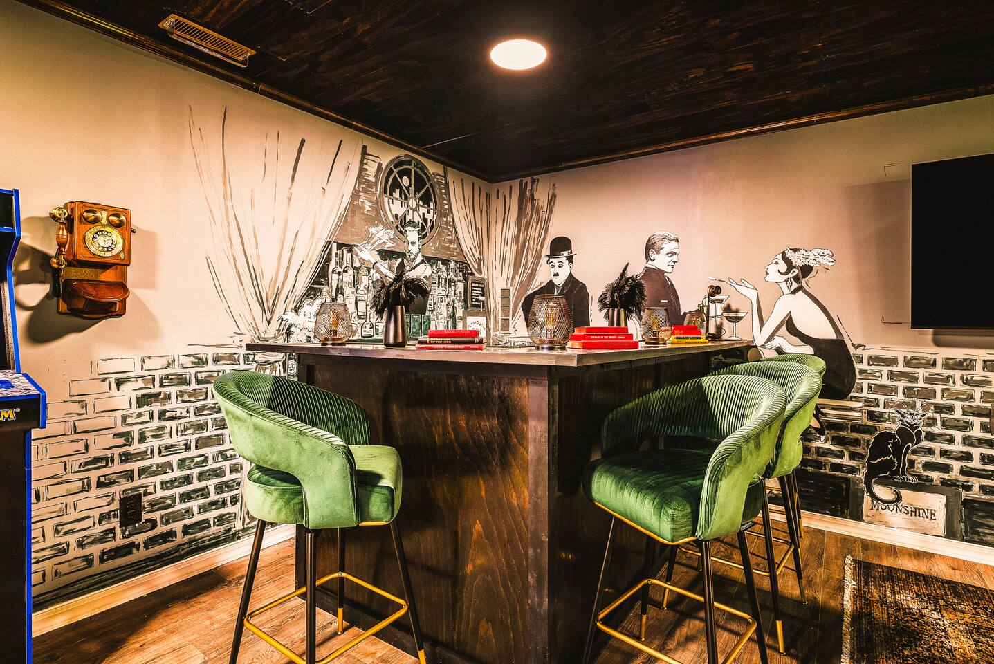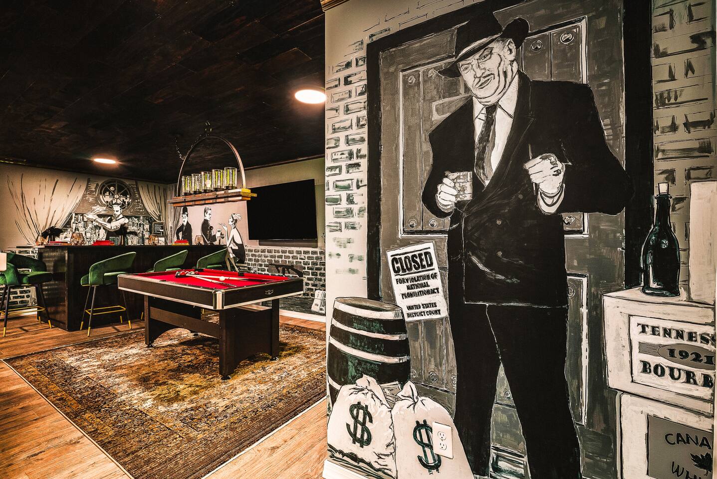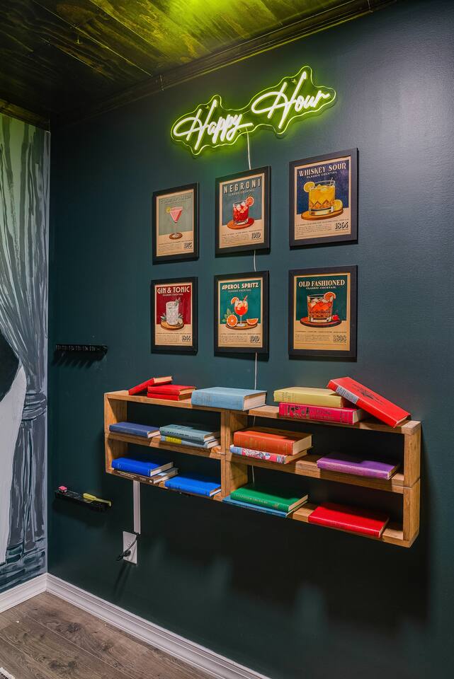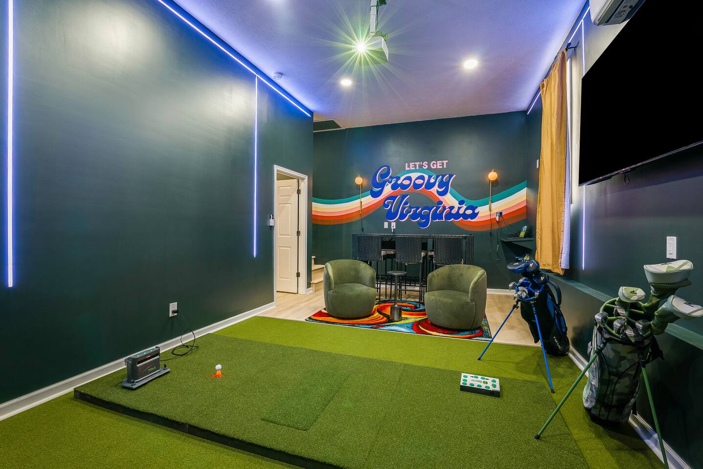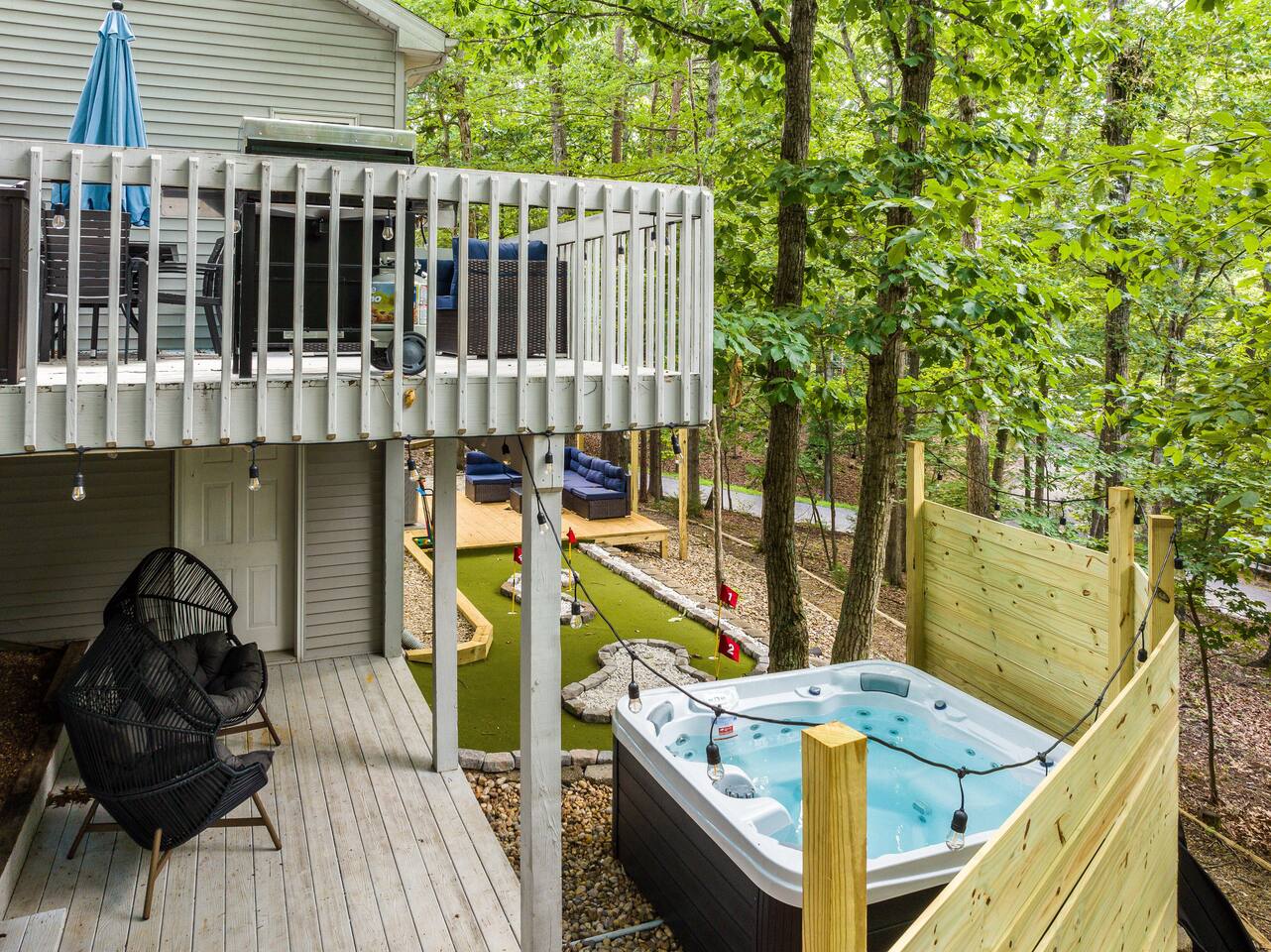 KEY FEATURES: ☀ 7 beautiful bedrooms; 4 kings, 1 queen, & 5 full beds (including two sets of full-over-full bunks) ☀ 3 full bathrooms ☀ Open, modern kitchen with stainless steel appliances ☀ Grand living room with lots of comfy seating & smart TV ☀ HUGE dining room with seating to comfortably accommodate 14 (+ kitchen countertop seating & outdoor dining) ☀ AMAZING speakeasy/game room; pool table, arcade games & more! ☀ One-of-a-kind CUSTOM golf simulator ☀ More games and relaxation in the backyard, with mini golf, hot tub, and more! Here Are A Few Kind Words From Our Past Guests: “This was a great place to stay! The morning light through the windows was so beautiful. Overall, just a relaxing experience. The hosts were super responsive whenever I had a question. I would stay again!” - Emily “Sabrina was very accommodating and communicative. the house is beautiful and very comfortable, close to nature hikes.” - Jennifer “This place was lovely! Exactly as pictured! Very clean and excellent host experience!!! I plan to come back again!” - Regina ☆☆ BEDROOMS ☆☆ There are 7 gorgeous bedrooms throughout this home, each with their own smart TV! On the bottom floor, there are 3 bedrooms. One has a king bed, the second has a queen, and the third has a full. On the main floor, the primary bedroom has a king bed & ensuite bathroom. Right down the hall, the second bedroom on this floor has two full-over-full bunk beds (total of 4 full beds) + a SLIDE! The two remaining bedrooms are on the top floor, with 1 king bed in each. ☆☆ BATHROOMS ☆☆ This home has 3 full bathrooms, one on each floor. On the bottom floor, the bathroom is accessible right off of the hallway, and has a sink, toilet, and walk-in shower only. The bathroom on the second floor is accessible from the primary bedroom & hallway, and has a sink, toilet, and walk-in shower. The bathroom on the top floor is accessible from the hallway, and has a sink, toilet, and shower/tub combo. ☆☆ KITCHEN & DINING ☆☆ The kitchen is oversized, with lots of counter-space, and located right off of the main living room. With all stainless steel appliances and a coffee machine (Keurig), this kitchen is ready for cooking for the entire group! The HUGE dining room is right next to the kitchen, with enough seating to comfortably fit 14 people, plus additional seating at the kitchen countertop and another dining table on the back deck, right off of the dining room. ☆☆ LIVING ROOM ☆☆ In this grand living room, you’ll be greeted with high vaulted ceilings, lots of comfy seating, a big smart TV, a fireplace, and gorgeous, colorful design. This is the perfect spot to host your movie nights & games with your friends and family! ☆☆ SPEAKEASY ☆☆ As you walk down to the bottom floor, you will feel like you have been transported into the 1920s! A stunning, hyper-realistic mural will make you feel as if you walked right into a private speakeasy, complete with a pool table, bar with a mini fridge, arcade games, smart TV, and a cozy, welcoming vibe to keep you down here for hours! ☆☆ GOLF SIMULATOR ☆☆ OMG! This room will take your breath away! Right off of the main living area, you will step down into a completely custom, unique golf simulator room, where you can practice your golf game on a huge projector screen. Unlike anything you have ever experienced! ☆☆ OUTDOOR SPACE ☆☆ This backyard is everything you could ask for, and more! ☀ Hot tub ☀ Fire pit ☀ Mini golf ☀ BBQ grill ☀ Outdoor dining ☀ Outdoor lounge seating There is so much to do here, that all of your friends & family will be thoroughly entertained throughout your entire stay. No matter the season, this backyard has it all. Book your stay with us today and you will NOT be disappointed. Get ready for a vacation you will never forget! ★☆ Book Now & Let Us Take Care Of You In Shenandoah Valley ! ☆★