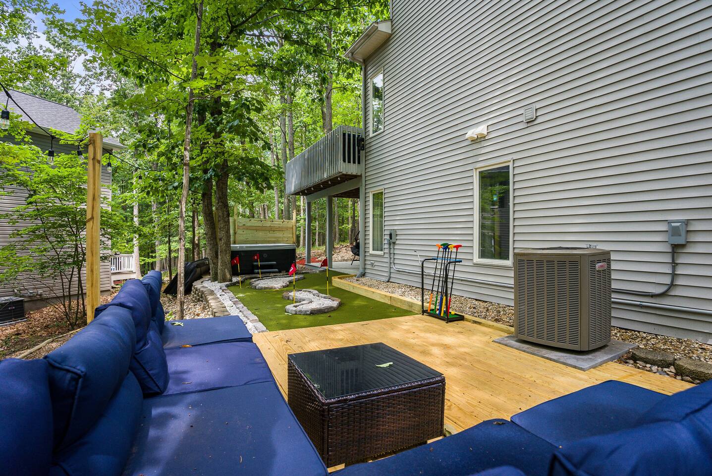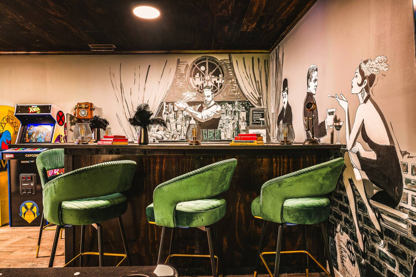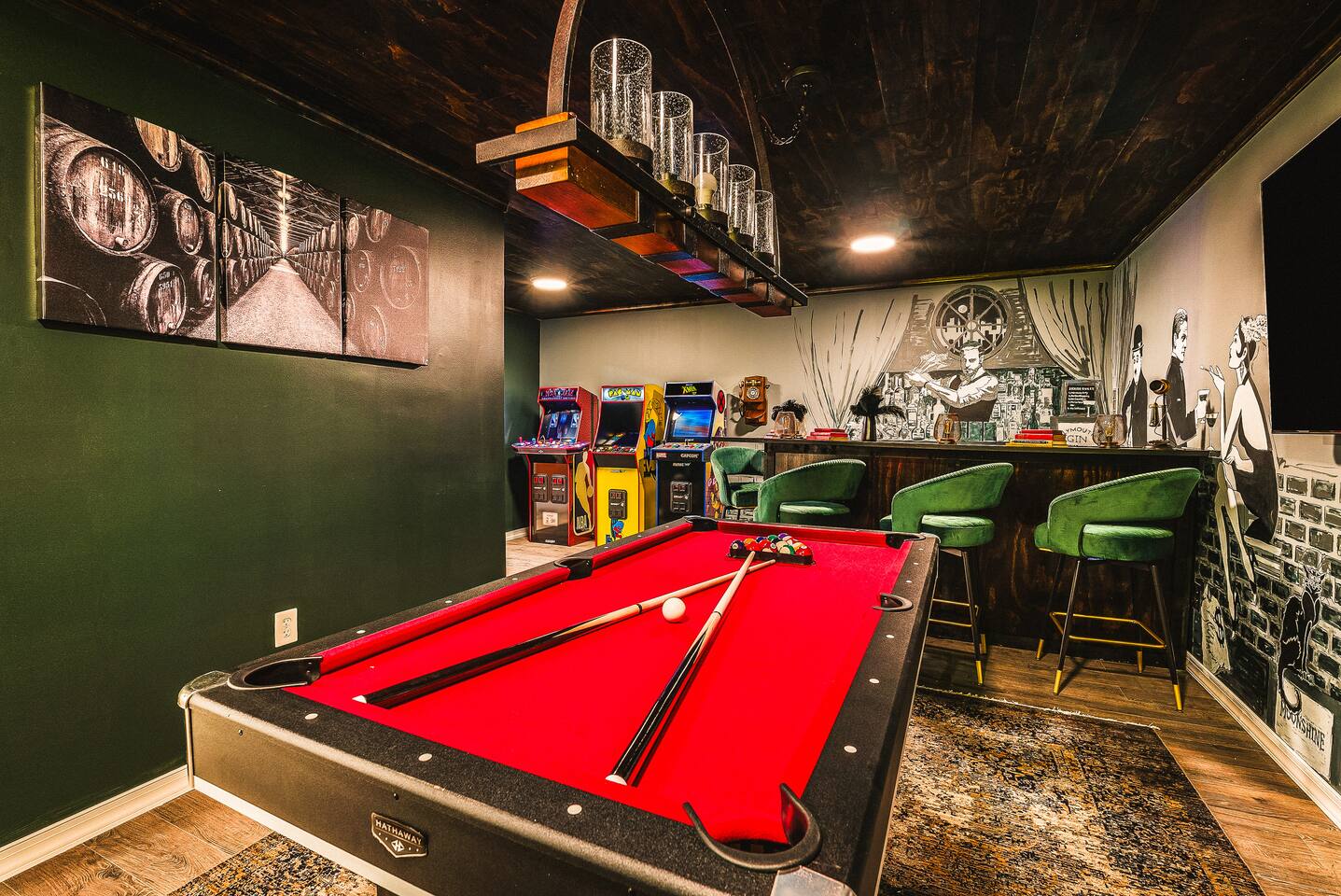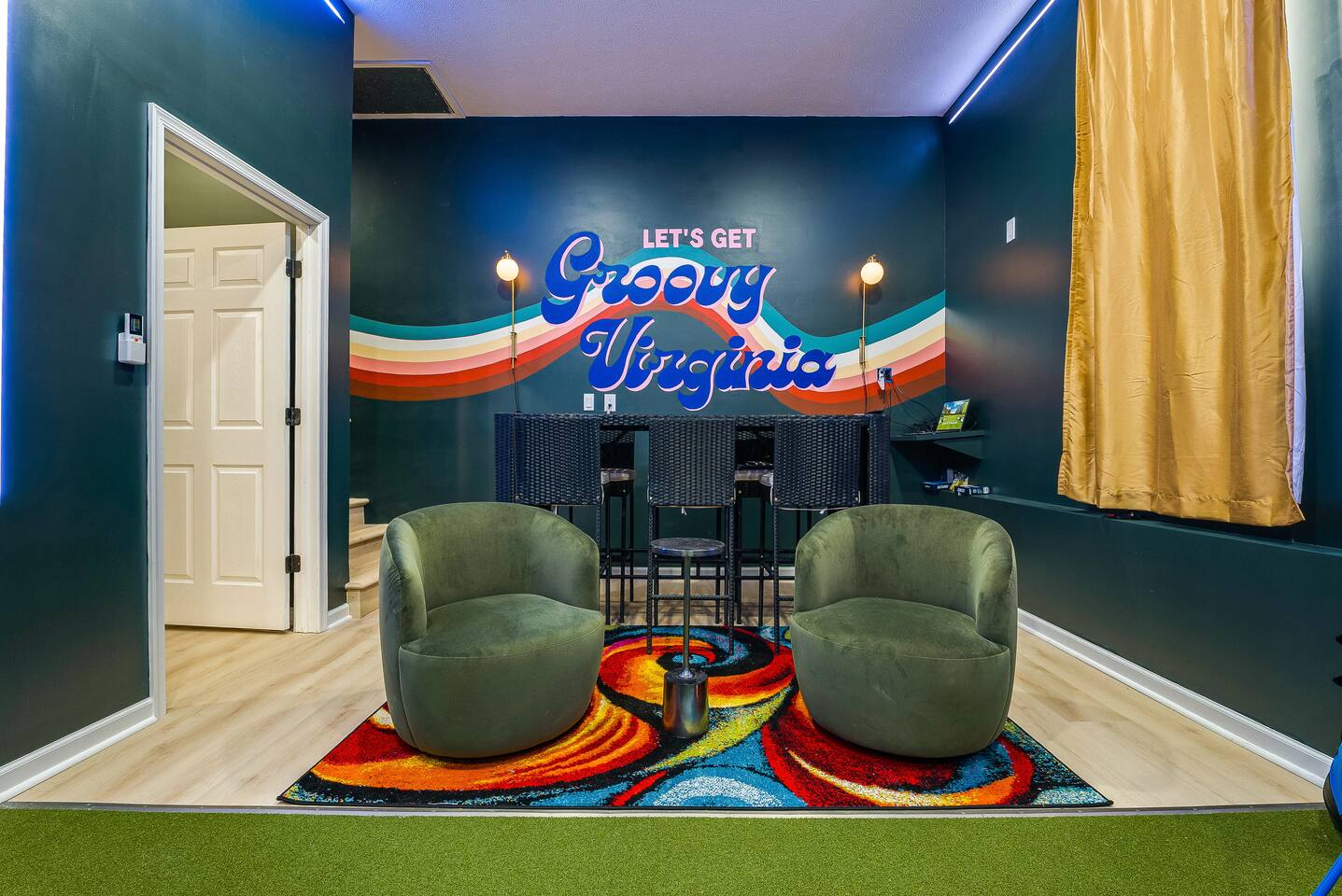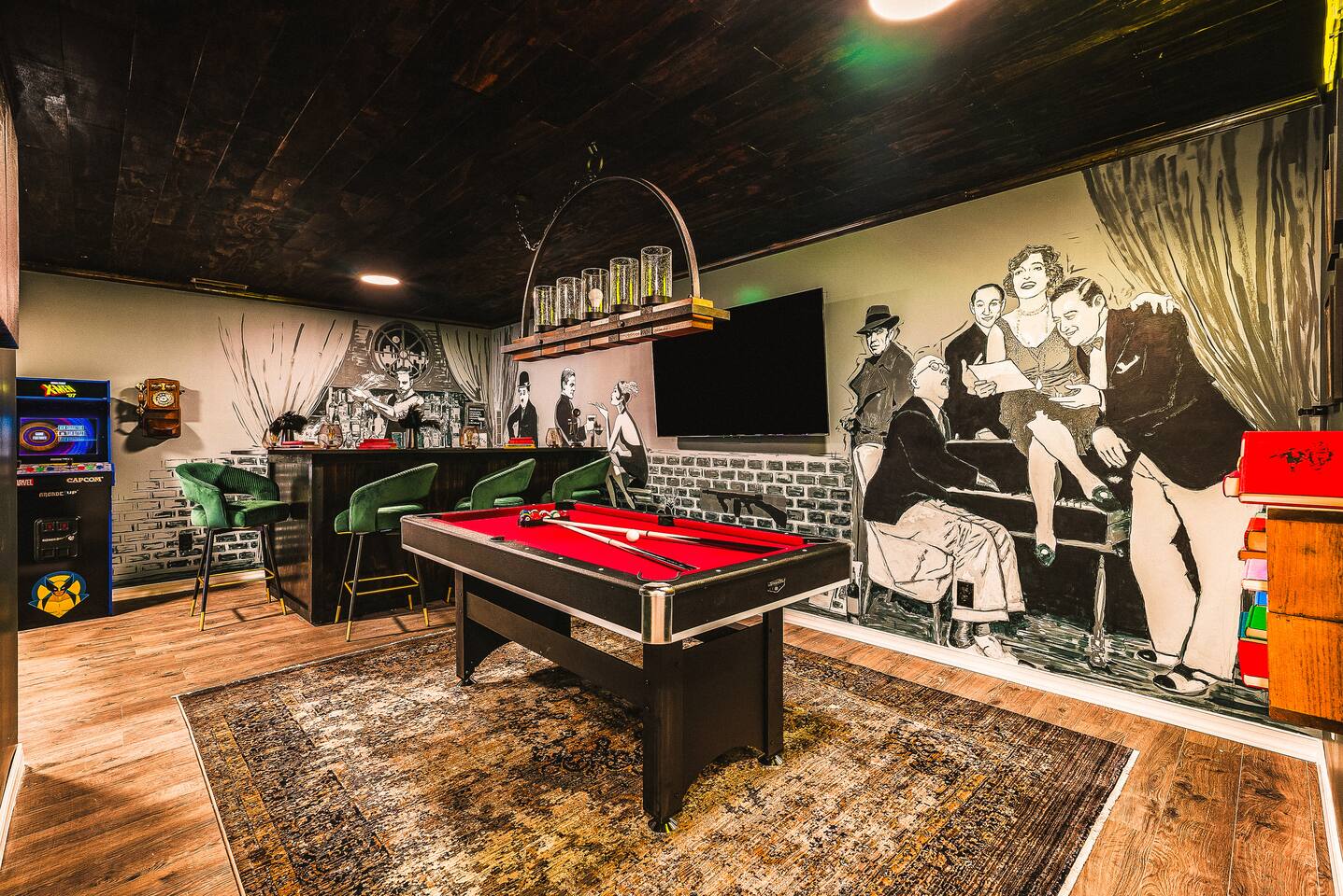 KEY FEATURES: ☀ 7 beautiful bedrooms; 4 kings, 1 queen, & 5 full beds (including two sets of full-over-full bunks) ☀ 3 full bathrooms ☀ Open, modern kitchen with stainless steel appliances ☀ Grand living room with lots of comfy seating & smart TV ☀ HUGE dining room with seating to comfortably accommodate 14 (+ kitchen countertop seating & outdoor dining) ☀ AMAZING speakeasy/game room; pool table, arcade games & more! ☀ One-of-a-kind CUSTOM golf simulator ☀ More games and relaxation in the backyard, with mini golf, hot tub, and more! Here Are A Few Kind Words From Our Past Guests: “This was a great place to stay! The morning light through the windows was so beautiful. Overall, just a relaxing experience. The hosts were super responsive whenever I had a question. I would stay again!” - Emily “Sabrina was very accommodating and communicative. the house is beautiful and very comfortable, close to nature hikes.” - Jennifer “This place was lovely! Exactly as pictured! Very clean and excellent host experience!!! I plan to come back again!” - Regina ☆☆ BEDROOMS ☆☆ There are 7 gorgeous bedrooms throughout this home, each with their own smart TV! On the bottom floor, there are 3 bedrooms. One has a king bed, the second has a queen, and the third has a full. On the main floor, the primary bedroom has a king bed & ensuite bathroom. Right down the hall, the second bedroom on this floor has two full-over-full bunk beds (total of 4 full beds) + a SLIDE! The two remaining bedrooms are on the top floor, with 1 king bed in each. ☆☆ BATHROOMS ☆☆ This home has 3 full bathrooms, one on each floor. On the bottom floor, the bathroom is accessible right off of the hallway, and has a sink, toilet, and walk-in shower only. The bathroom on the second floor is accessible from the primary bedroom & hallway, and has a sink, toilet, and walk-in shower. The bathroom on the top floor is accessible from the hallway, and has a sink, toilet, and shower/tub combo. ☆☆ KITCHEN & DINING ☆☆ The kitchen is oversized, with lots of counter-space, and located right off of the main living room. With all stainless steel appliances and a coffee machine (Keurig), this kitchen is ready for cooking for the entire group! The HUGE dining room is right next to the kitchen, with enough seating to comfortably fit 14 people, plus additional seating at the kitchen countertop and another dining table on the back deck, right off of the dining room. ☆☆ LIVING ROOM ☆☆ In this grand living room, you’ll be greeted with high vaulted ceilings, lots of comfy seating, a big smart TV, a fireplace, and gorgeous, colorful design. This is the perfect spot to host your movie nights & games with your friends and family! ☆☆ SPEAKEASY ☆☆ As you walk down to the bottom floor, you will feel like you have been transported into the 1920s! A stunning, hyper-realistic mural will make you feel as if you walked right into a private speakeasy, complete with a pool table, bar with a mini fridge, arcade games, smart TV, and a cozy, welcoming vibe to keep you down here for hours! ☆☆ GOLF SIMULATOR ☆☆ OMG! This room will take your breath away! Right off of the main living area, you will step down into a completely custom, unique golf simulator room, where you can practice your golf game on a huge projector screen. Unlike anything you have ever experienced! ☆☆ OUTDOOR SPACE ☆☆ This backyard is everything you could ask for, and more! ☀ Hot tub ☀ Fire pit ☀ Mini golf ☀ BBQ grill ☀ Outdoor dining ☀ Outdoor lounge seating There is so much to do here, that all of your friends & family will be thoroughly entertained throughout your entire stay. No matter the season, this backyard has it all. Book your stay with us today and you will NOT be disappointed. Get ready for a vacation you will never forget! ★☆ Book Now & Let Us Take Care Of You In Shenandoah Valley ! ☆★