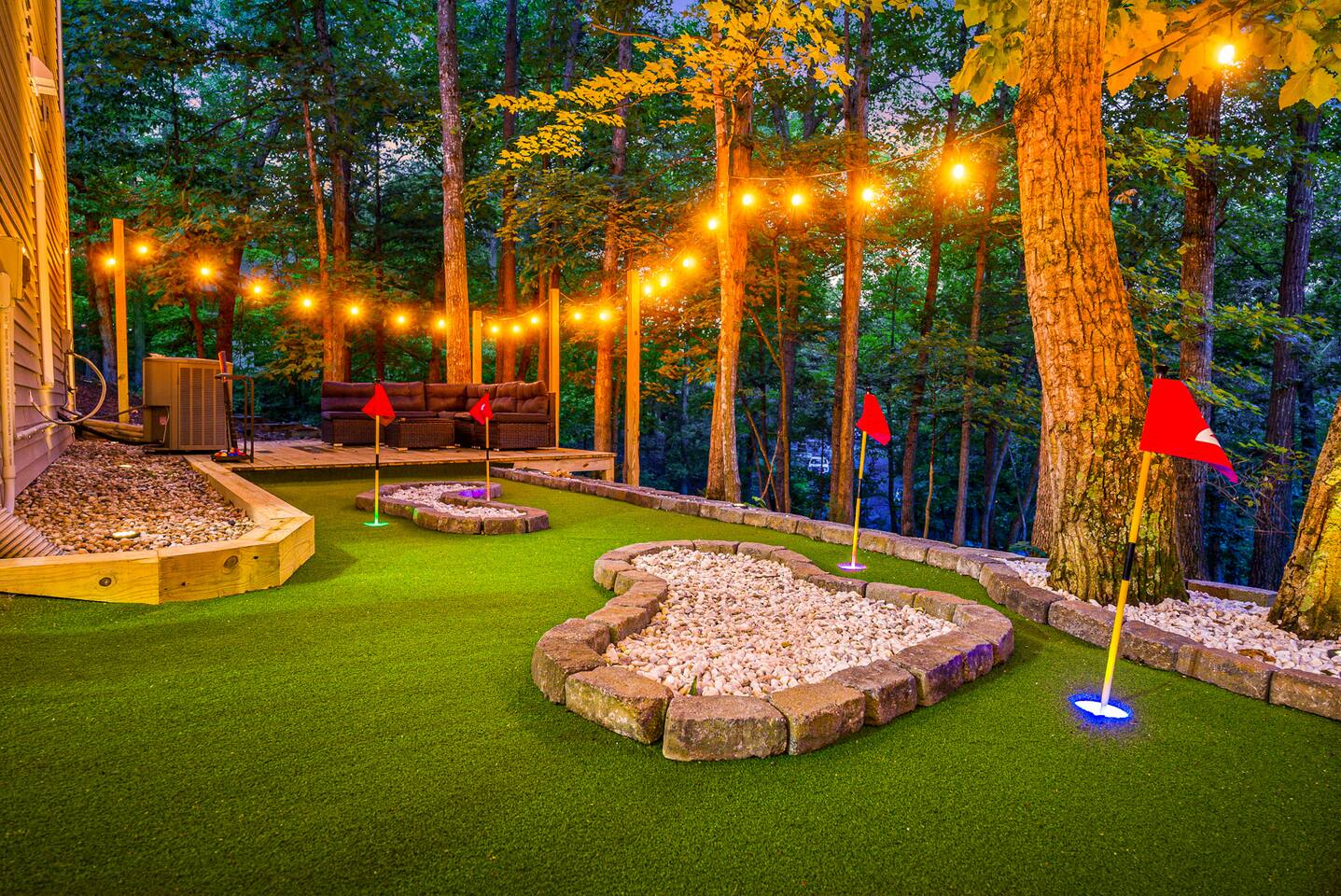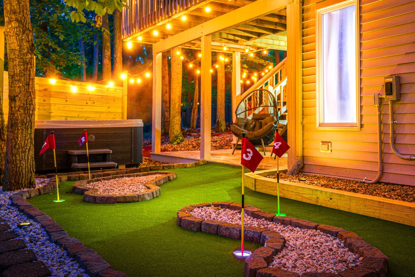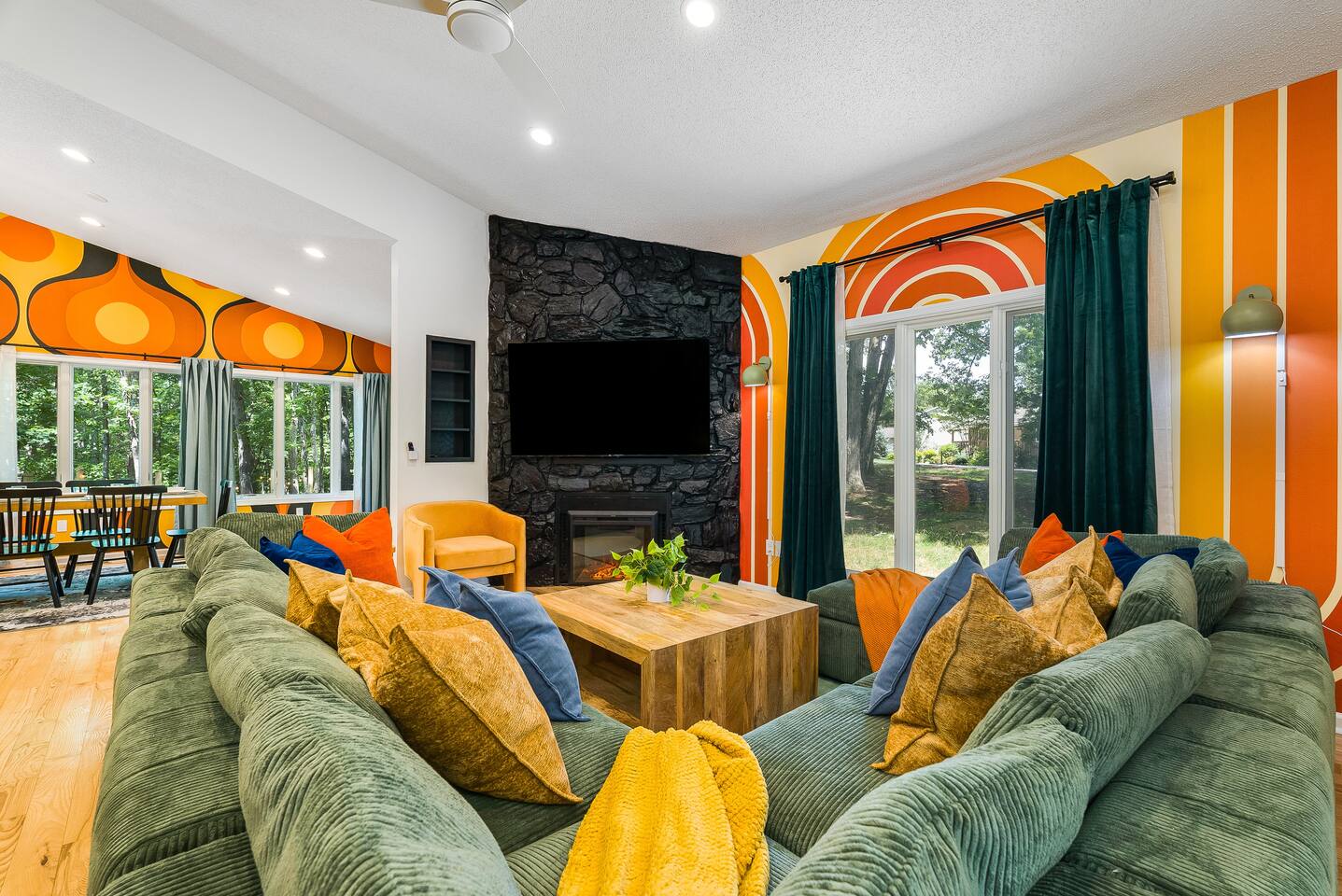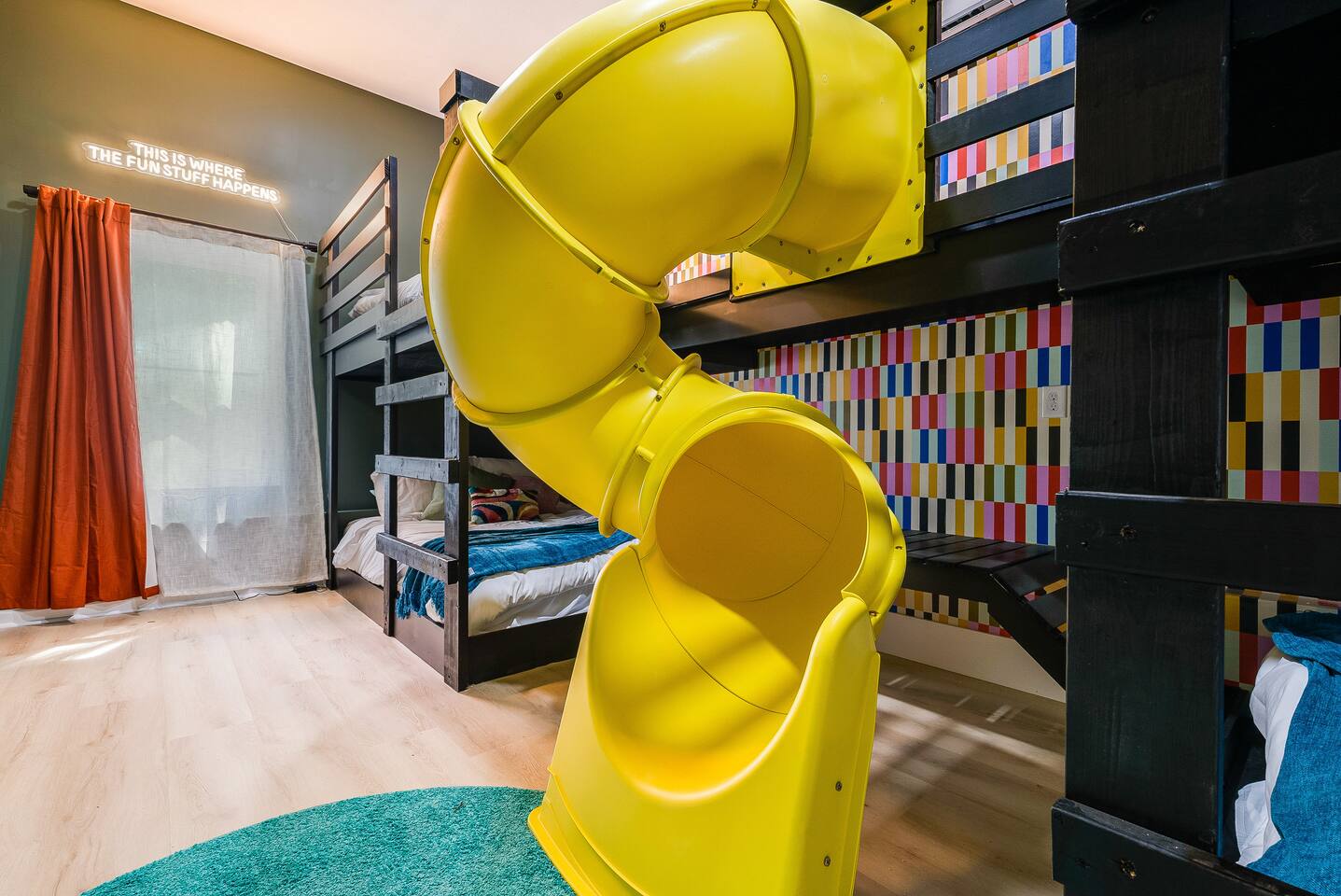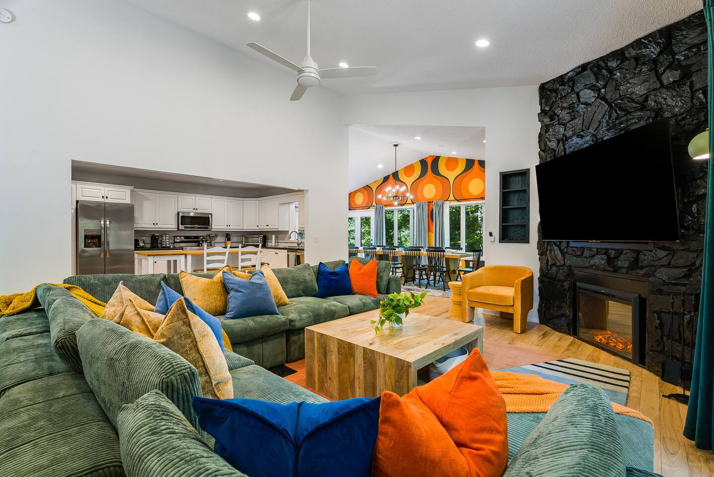 KEY FEATURES: ☀ 7 beautiful bedrooms; 4 kings, 1 queen, & 5 full beds (including two sets of full-over-full bunks) ☀ 3 full bathrooms ☀ Open, modern kitchen with stainless steel appliances ☀ Grand living room with lots of comfy seating & smart TV ☀ HUGE dining room with seating to comfortably accommodate 14 (+ kitchen countertop seating & outdoor dining) ☀ AMAZING speakeasy/game room; pool table, arcade games & more! ☀ One-of-a-kind CUSTOM golf simulator ☀ More games and relaxation in the backyard, with mini golf, hot tub, and more! Here Are A Few Kind Words From Our Past Guests: “This was a great place to stay! The morning light through the windows was so beautiful. Overall, just a relaxing experience. The hosts were super responsive whenever I had a question. I would stay again!” - Emily “Sabrina was very accommodating and communicative. the house is beautiful and very comfortable, close to nature hikes.” - Jennifer “This place was lovely! Exactly as pictured! Very clean and excellent host experience!!! I plan to come back again!” - Regina ☆☆ BEDROOMS ☆☆ There are 7 gorgeous bedrooms throughout this home, each with their own smart TV! On the bottom floor, there are 3 bedrooms. One has a king bed, the second has a queen, and the third has a full. On the main floor, the primary bedroom has a king bed & ensuite bathroom. Right down the hall, the second bedroom on this floor has two full-over-full bunk beds (total of 4 full beds) + a SLIDE! The two remaining bedrooms are on the top floor, with 1 king bed in each. ☆☆ BATHROOMS ☆☆ This home has 3 full bathrooms, one on each floor. On the bottom floor, the bathroom is accessible right off of the hallway, and has a sink, toilet, and walk-in shower only. The bathroom on the second floor is accessible from the primary bedroom & hallway, and has a sink, toilet, and walk-in shower. The bathroom on the top floor is accessible from the hallway, and has a sink, toilet, and shower/tub combo. ☆☆ KITCHEN & DINING ☆☆ The kitchen is oversized, with lots of counter-space, and located right off of the main living room. With all stainless steel appliances and a coffee machine (Keurig), this kitchen is ready for cooking for the entire group! The HUGE dining room is right next to the kitchen, with enough seating to comfortably fit 14 people, plus additional seating at the kitchen countertop and another dining table on the back deck, right off of the dining room. ☆☆ LIVING ROOM ☆☆ In this grand living room, you’ll be greeted with high vaulted ceilings, lots of comfy seating, a big smart TV, a fireplace, and gorgeous, colorful design. This is the perfect spot to host your movie nights & games with your friends and family! ☆☆ SPEAKEASY ☆☆ As you walk down to the bottom floor, you will feel like you have been transported into the 1920s! A stunning, hyper-realistic mural will make you feel as if you walked right into a private speakeasy, complete with a pool table, bar with a mini fridge, arcade games, smart TV, and a cozy, welcoming vibe to keep you down here for hours! ☆☆ GOLF SIMULATOR ☆☆ OMG! This room will take your breath away! Right off of the main living area, you will step down into a completely custom, unique golf simulator room, where you can practice your golf game on a huge projector screen. Unlike anything you have ever experienced! ☆☆ OUTDOOR SPACE ☆☆ This backyard is everything you could ask for, and more! ☀ Hot tub ☀ Fire pit ☀ Mini golf ☀ BBQ grill ☀ Outdoor dining ☀ Outdoor lounge seating There is so much to do here, that all of your friends & family will be thoroughly entertained throughout your entire stay. No matter the season, this backyard has it all. Book your stay with us today and you will NOT be disappointed. Get ready for a vacation you will never forget! ★☆ Book Now & Let Us Take Care Of You In Shenandoah Valley ! ☆★