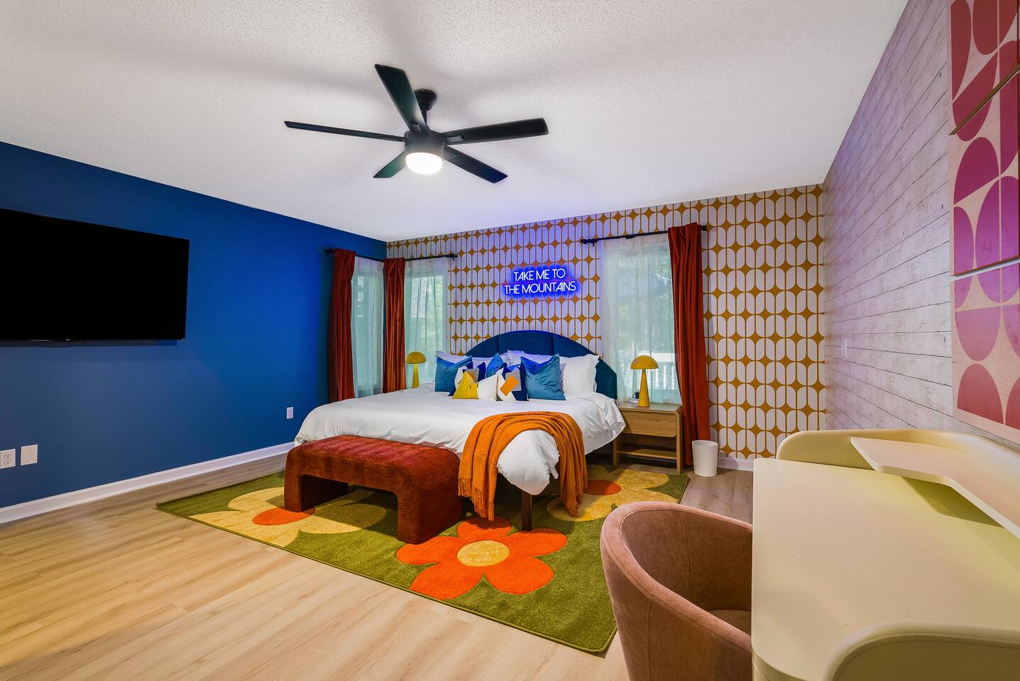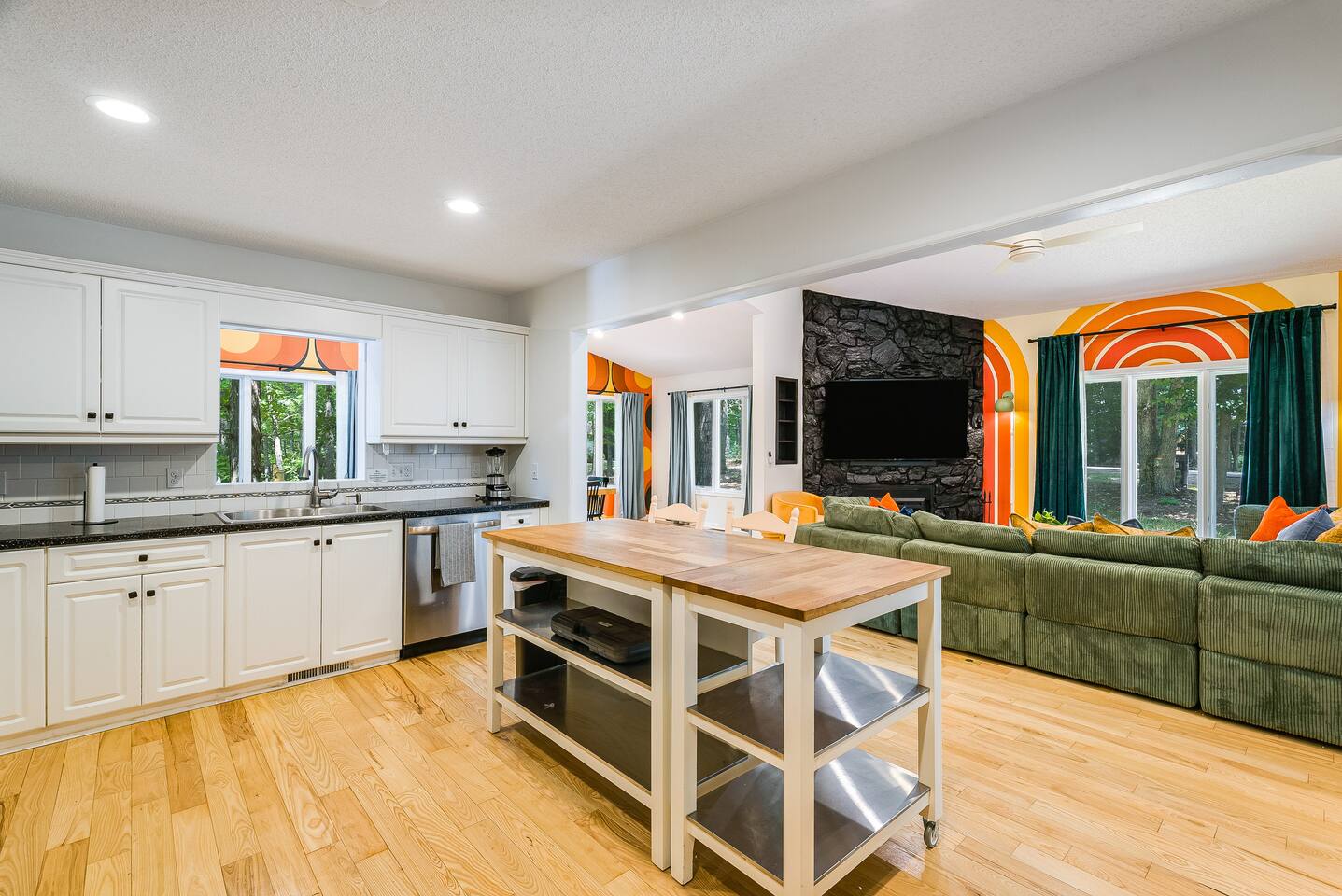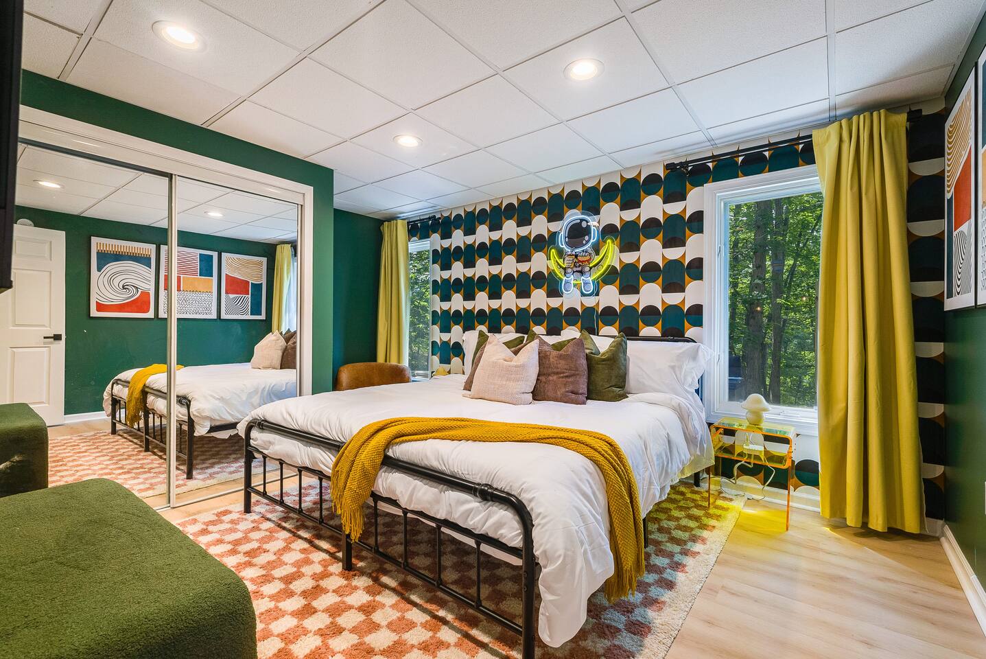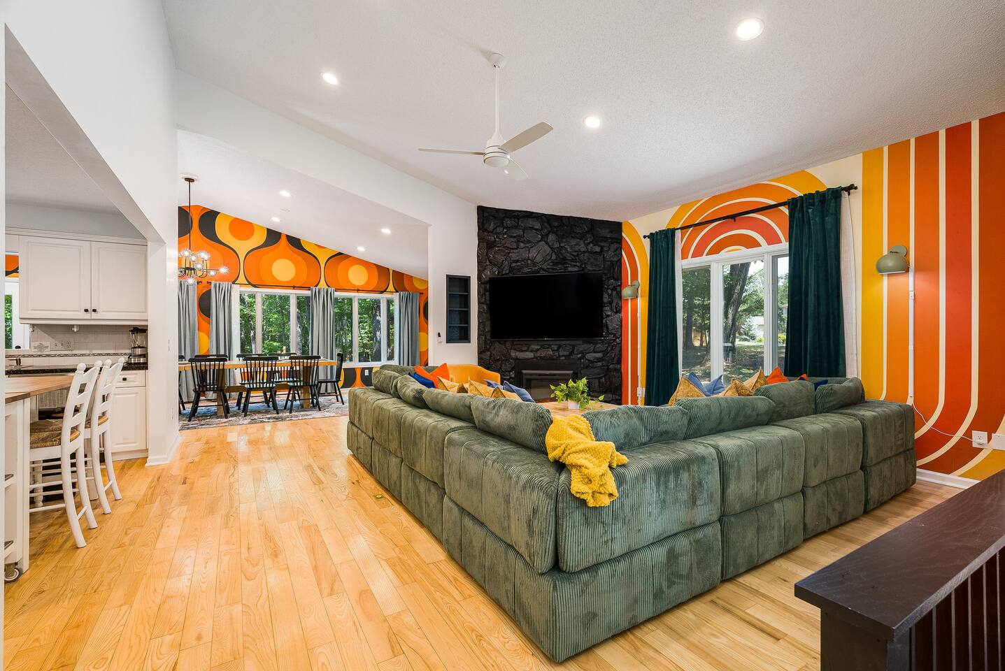 KEY FEATURES: ☀ 7 beautiful bedrooms; 4 kings, 1 queen, & 5 full beds (including two sets of full-over-full bunks) ☀ 3 full bathrooms ☀ Open, modern kitchen with stainless steel appliances ☀ Grand living room with lots of comfy seating & smart TV ☀ HUGE dining room with seating to comfortably accommodate 14 (+ kitchen countertop seating & outdoor dining) ☀ AMAZING speakeasy/game room; pool table, arcade games & more! ☀ One-of-a-kind CUSTOM golf simulator ☀ More games and relaxation in the backyard, with mini golf, hot tub, and more! Here Are A Few Kind Words From Our Past Guests: “This was a great place to stay! The morning light through the windows was so beautiful. Overall, just a relaxing experience. The hosts were super responsive whenever I had a question. I would stay again!” - Emily “Sabrina was very accommodating and communicative. the house is beautiful and very comfortable, close to nature hikes.” - Jennifer “This place was lovely! Exactly as pictured! Very clean and excellent host experience!!! I plan to come back again!” - Regina ☆☆ BEDROOMS ☆☆ There are 7 gorgeous bedrooms throughout this home, each with their own smart TV! On the bottom floor, there are 3 bedrooms. One has a king bed, the second has a queen, and the third has a full. On the main floor, the primary bedroom has a king bed & ensuite bathroom. Right down the hall, the second bedroom on this floor has two full-over-full bunk beds (total of 4 full beds) + a SLIDE! The two remaining bedrooms are on the top floor, with 1 king bed in each. ☆☆ BATHROOMS ☆☆ This home has 3 full bathrooms, one on each floor. On the bottom floor, the bathroom is accessible right off of the hallway, and has a sink, toilet, and walk-in shower only. The bathroom on the second floor is accessible from the primary bedroom & hallway, and has a sink, toilet, and walk-in shower. The bathroom on the top floor is accessible from the hallway, and has a sink, toilet, and shower/tub combo. ☆☆ KITCHEN & DINING ☆☆ The kitchen is oversized, with lots of counter-space, and located right off of the main living room. With all stainless steel appliances and a coffee machine (Keurig), this kitchen is ready for cooking for the entire group! The HUGE dining room is right next to the kitchen, with enough seating to comfortably fit 14 people, plus additional seating at the kitchen countertop and another dining table on the back deck, right off of the dining room. ☆☆ LIVING ROOM ☆☆ In this grand living room, you’ll be greeted with high vaulted ceilings, lots of comfy seating, a big smart TV, a fireplace, and gorgeous, colorful design. This is the perfect spot to host your movie nights & games with your friends and family! ☆☆ SPEAKEASY ☆☆ As you walk down to the bottom floor, you will feel like you have been transported into the 1920s! A stunning, hyper-realistic mural will make you feel as if you walked right into a private speakeasy, complete with a pool table, bar with a mini fridge, arcade games, smart TV, and a cozy, welcoming vibe to keep you down here for hours! ☆☆ GOLF SIMULATOR ☆☆ OMG! This room will take your breath away! Right off of the main living area, you will step down into a completely custom, unique golf simulator room, where you can practice your golf game on a huge projector screen. Unlike anything you have ever experienced! ☆☆ OUTDOOR SPACE ☆☆ This backyard is everything you could ask for, and more! ☀ Hot tub ☀ Fire pit ☀ Mini golf ☀ BBQ grill ☀ Outdoor dining ☀ Outdoor lounge seating There is so much to do here, that all of your friends & family will be thoroughly entertained throughout your entire stay. No matter the season, this backyard has it all. Book your stay with us today and you will NOT be disappointed. Get ready for a vacation you will never forget! ★☆ Book Now & Let Us Take Care Of You In Shenandoah Valley ! ☆★