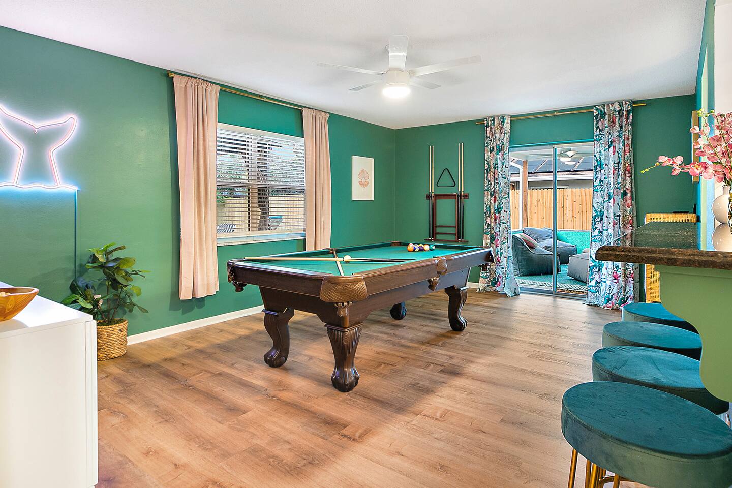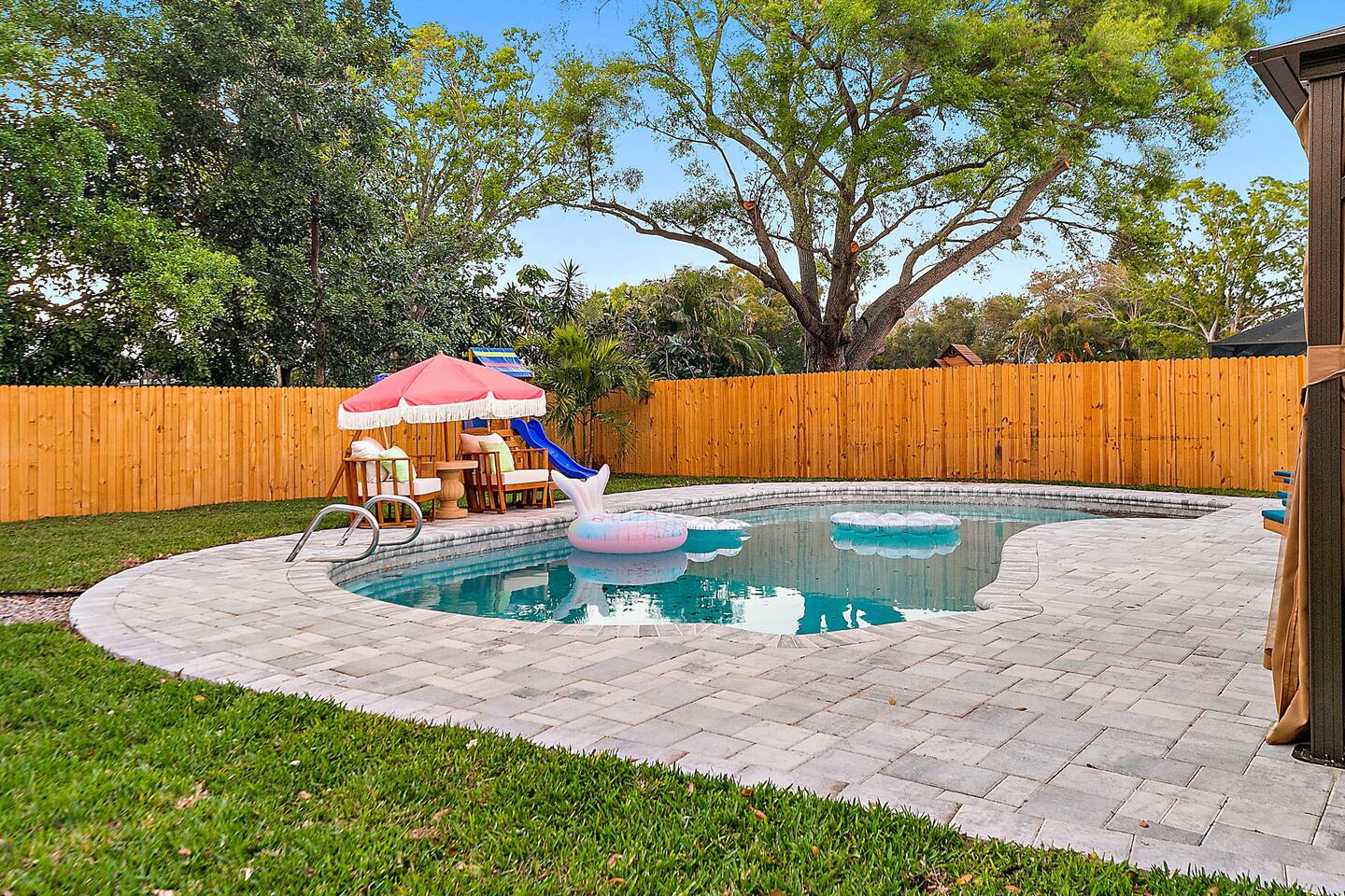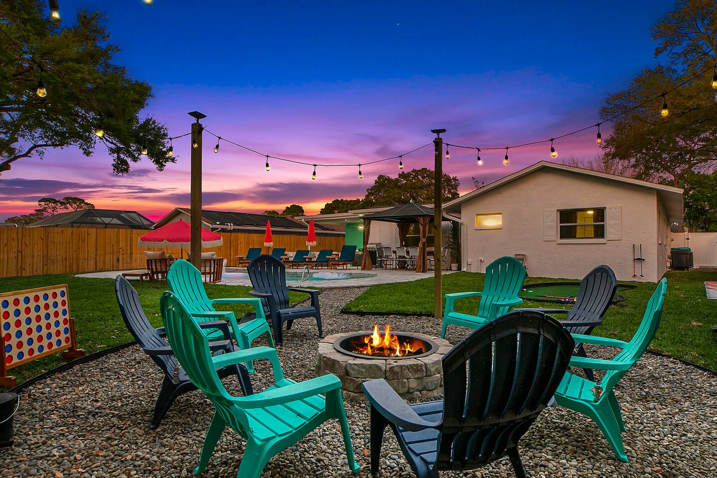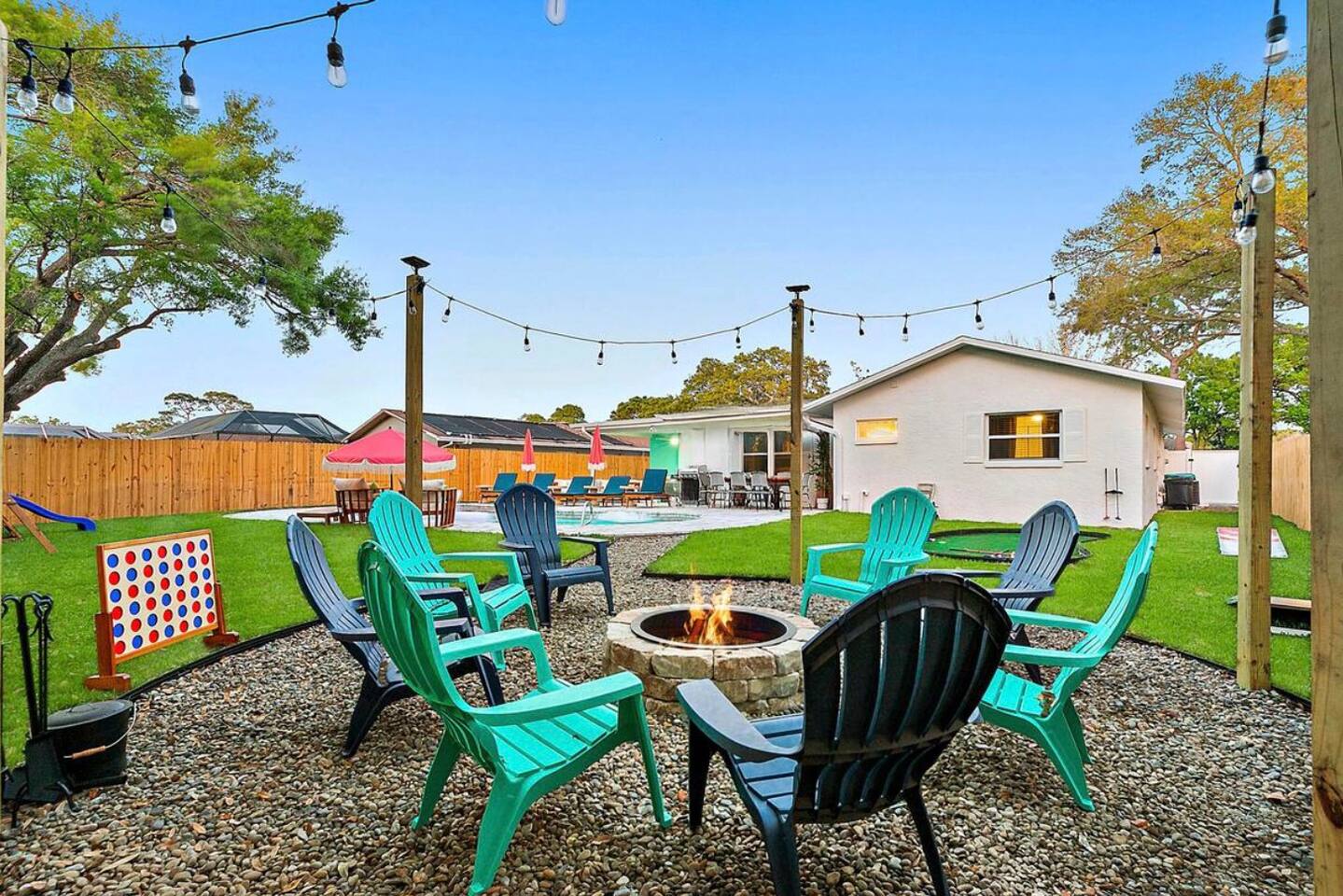 KEY FEATURES: ☀ 3 cozy bedrooms; 1 king, 1 queen, 1 full, & 3 twin beds ☀ 2 full bathrooms; including a master ensuite ☀ Modern kitchen with stainless steel appliances + all kitchen supplies ☀ Open living room with lots of comfy seating & smart TV ☀ Dining room with seating to comfortably accommodate 8 ☀ Fully loaded backyard; heated pool, fire pit, mini golf, and more! (fully fenced - bring your pets!) ☀ Game room with arcade games, foosball, smart TV, and more comfy seating ☀ Pool table room with direct access to the backyard Here Are A Few Kind Words From Our Past Guests: “This was a great place to stay! The morning light through the windows was so beautiful. Overall, just a relaxing experience. The hosts were super responsive whenever I had a question. I would stay again!” - Emily “Sabrina was very accommodating and communicative. the house is beautiful and very comfortable, close to nature hikes.” - Jennifer “This place was lovely! Exactly as pictured! Very clean and excellent host experience!!! I plan to come back again!” - Regina ☆☆ BEDROOMS & BATHROOMS ☆☆ 3 cozy bedrooms, all with a fun, tropical design! On one side of the house, the master has a king bed, smart TV, direct access to the backyard, and attached ensuite bathroom. The ensuite bathroom is equipped with a single vanity, toilet, and walk-in shower. The other end of the home has two more bedrooms; one with a queen bed, and the other with two bunk beds (one twin-over-full & one twin-over-twin).. These two bedrooms share a full bathroom located right off the hallway, with one vanity sink, toilet, and a shower/tub combo. ☆☆ KITCHEN & DINING ☆☆ The kitchen has great visibility into the main entertaining areas of the home, allowing those cooking delicious meals for the entire group in touch with everyone else while they enjoy the amenities! This modern kitchen has all new, stainless steel appliances and a coffee station (including a Keurig & coffee pods). The dining room is adjacent to the kitchen, with enough seating to comfortably seat 8 (plus 4 more bar top seats in the pool table room for casual dining). ☆☆ LIVING ROOM ☆☆ As you enter the home, you'll be greeted with a comfy living room, filled with lots of seating & a big smart TV - perfect for a movie with your close family, or for your group of friends to host a thrilling game night! The beach theme starts in this room, and is tastefully carried out through the rest of this cozy villa! ☆☆ GAME ROOMS ☆☆ Yes, there are two game rooms jam-packed in this house! The first is the pool table room, located right off the dining room. This room has a lounge-vibe, with a cool neon sign and bar top seating that looks into the kitchen. As soon as you're finished with your pool game, you can hop directly into the backyard through the patio access from this room. Right on the other side of this room, you'll have access to the other game room. This room has lots more comfy seating, another big smart TV, arcade games (The Simpsons & Ms. Pac Man), and foosball. So much fun tucked away in this home! ☆☆ OUTDOOR SPACE ☆☆ Your breath will be taken away as you walk out onto this stunning back pool deck! The heated pool is the centerpiece of this yard, but it is also accompanied by lots of seating, outdoor dining, another TV, BBQ, comfy sun lounging chairs, mini golf, fire pit (wood burning), giant Connect 4, corn hole, and a kids' play set. Although the beach is just right down the street, you may very well never need to leave this wonderful home! Get ready for a vacation you'll NEVER forget! ★☆ Book Now & Let Us Take Care Of You In Seminole! ☆★