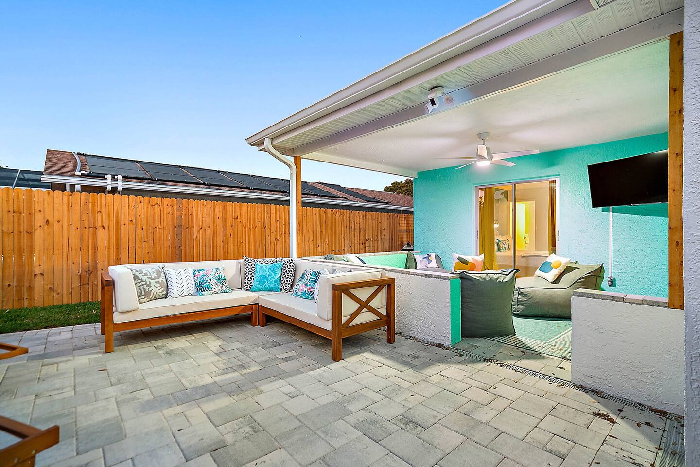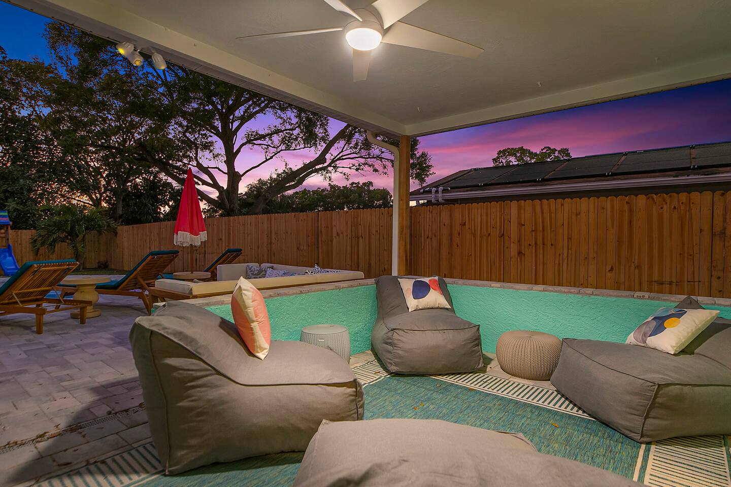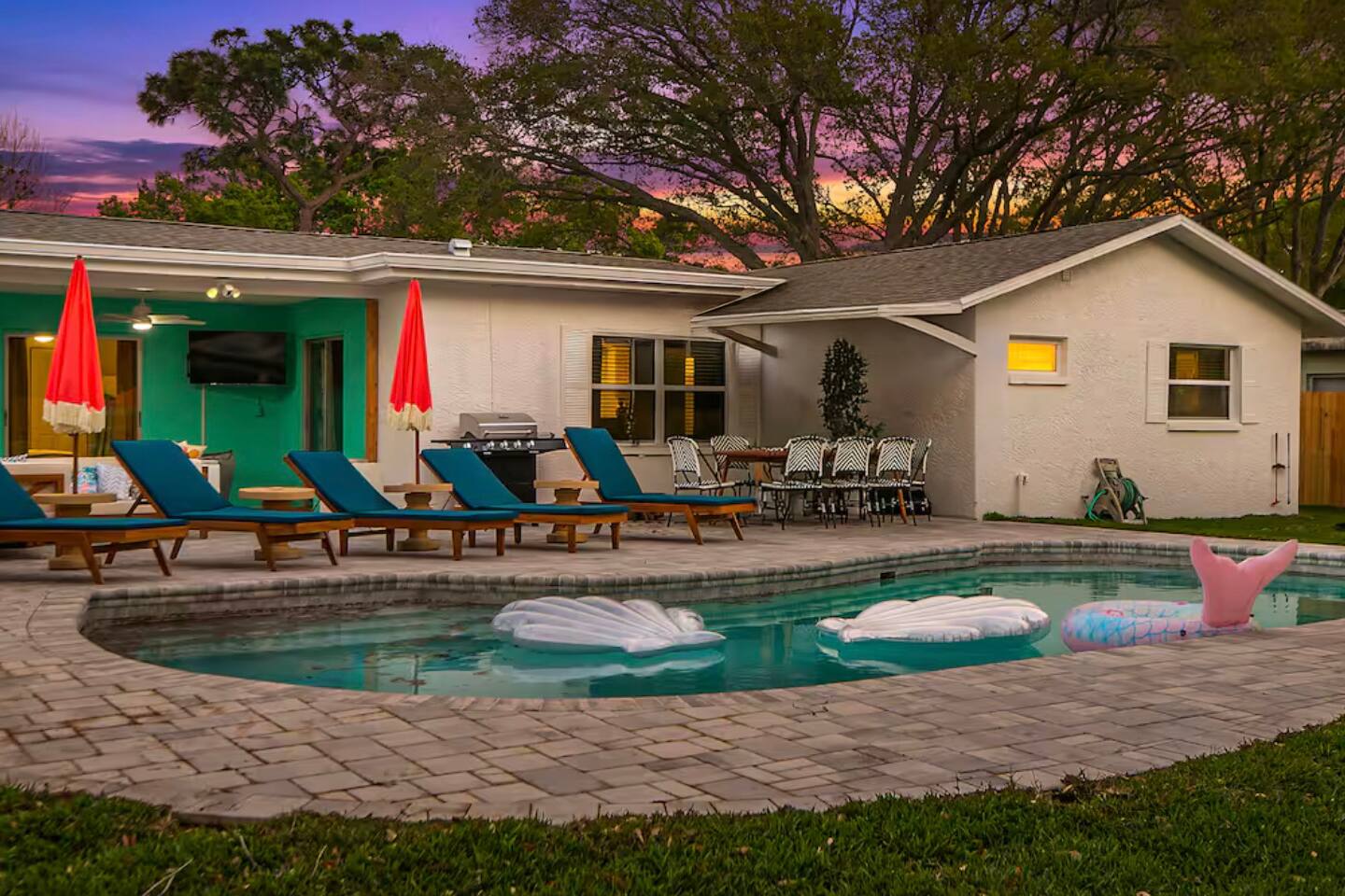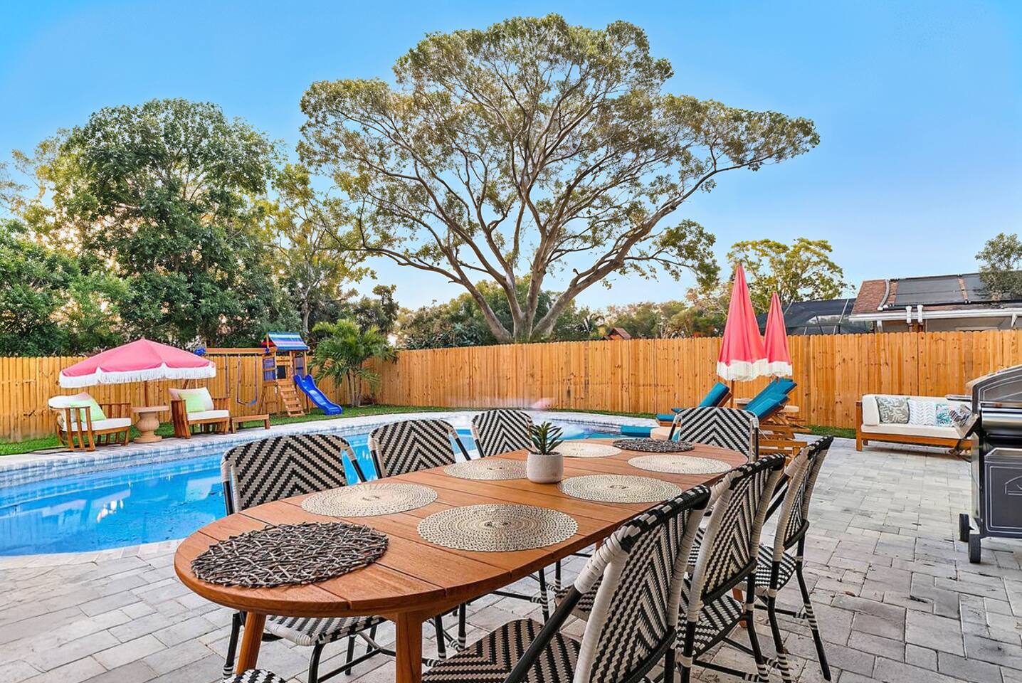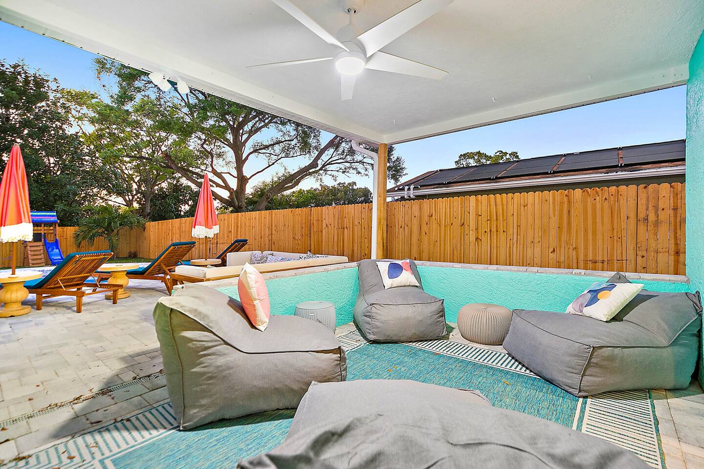 KEY FEATURES: ☀ 3 cozy bedrooms; 1 king, 1 queen, 1 full, & 3 twin beds ☀ 2 full bathrooms; including a master ensuite ☀ Modern kitchen with stainless steel appliances + all kitchen supplies ☀ Open living room with lots of comfy seating & smart TV ☀ Dining room with seating to comfortably accommodate 8 ☀ Fully loaded backyard; heated pool, fire pit, mini golf, and more! (fully fenced - bring your pets!) ☀ Game room with arcade games, foosball, smart TV, and more comfy seating ☀ Pool table room with direct access to the backyard Here Are A Few Kind Words From Our Past Guests: “This was a great place to stay! The morning light through the windows was so beautiful. Overall, just a relaxing experience. The hosts were super responsive whenever I had a question. I would stay again!” - Emily “Sabrina was very accommodating and communicative. the house is beautiful and very comfortable, close to nature hikes.” - Jennifer “This place was lovely! Exactly as pictured! Very clean and excellent host experience!!! I plan to come back again!” - Regina ☆☆ BEDROOMS & BATHROOMS ☆☆ 3 cozy bedrooms, all with a fun, tropical design! On one side of the house, the master has a king bed, smart TV, direct access to the backyard, and attached ensuite bathroom. The ensuite bathroom is equipped with a single vanity, toilet, and walk-in shower. The other end of the home has two more bedrooms; one with a queen bed, and the other with two bunk beds (one twin-over-full & one twin-over-twin).. These two bedrooms share a full bathroom located right off the hallway, with one vanity sink, toilet, and a shower/tub combo. ☆☆ KITCHEN & DINING ☆☆ The kitchen has great visibility into the main entertaining areas of the home, allowing those cooking delicious meals for the entire group in touch with everyone else while they enjoy the amenities! This modern kitchen has all new, stainless steel appliances and a coffee station (including a Keurig & coffee pods). The dining room is adjacent to the kitchen, with enough seating to comfortably seat 8 (plus 4 more bar top seats in the pool table room for casual dining). ☆☆ LIVING ROOM ☆☆ As you enter the home, you'll be greeted with a comfy living room, filled with lots of seating & a big smart TV - perfect for a movie with your close family, or for your group of friends to host a thrilling game night! The beach theme starts in this room, and is tastefully carried out through the rest of this cozy villa! ☆☆ GAME ROOMS ☆☆ Yes, there are two game rooms jam-packed in this house! The first is the pool table room, located right off the dining room. This room has a lounge-vibe, with a cool neon sign and bar top seating that looks into the kitchen. As soon as you're finished with your pool game, you can hop directly into the backyard through the patio access from this room. Right on the other side of this room, you'll have access to the other game room. This room has lots more comfy seating, another big smart TV, arcade games (The Simpsons & Ms. Pac Man), and foosball. So much fun tucked away in this home! ☆☆ OUTDOOR SPACE ☆☆ Your breath will be taken away as you walk out onto this stunning back pool deck! The heated pool is the centerpiece of this yard, but it is also accompanied by lots of seating, outdoor dining, another TV, BBQ, comfy sun lounging chairs, mini golf, fire pit (wood burning), giant Connect 4, corn hole, and a kids' play set. Although the beach is just right down the street, you may very well never need to leave this wonderful home! Get ready for a vacation you'll NEVER forget! ★☆ Book Now & Let Us Take Care Of You In Seminole! ☆★