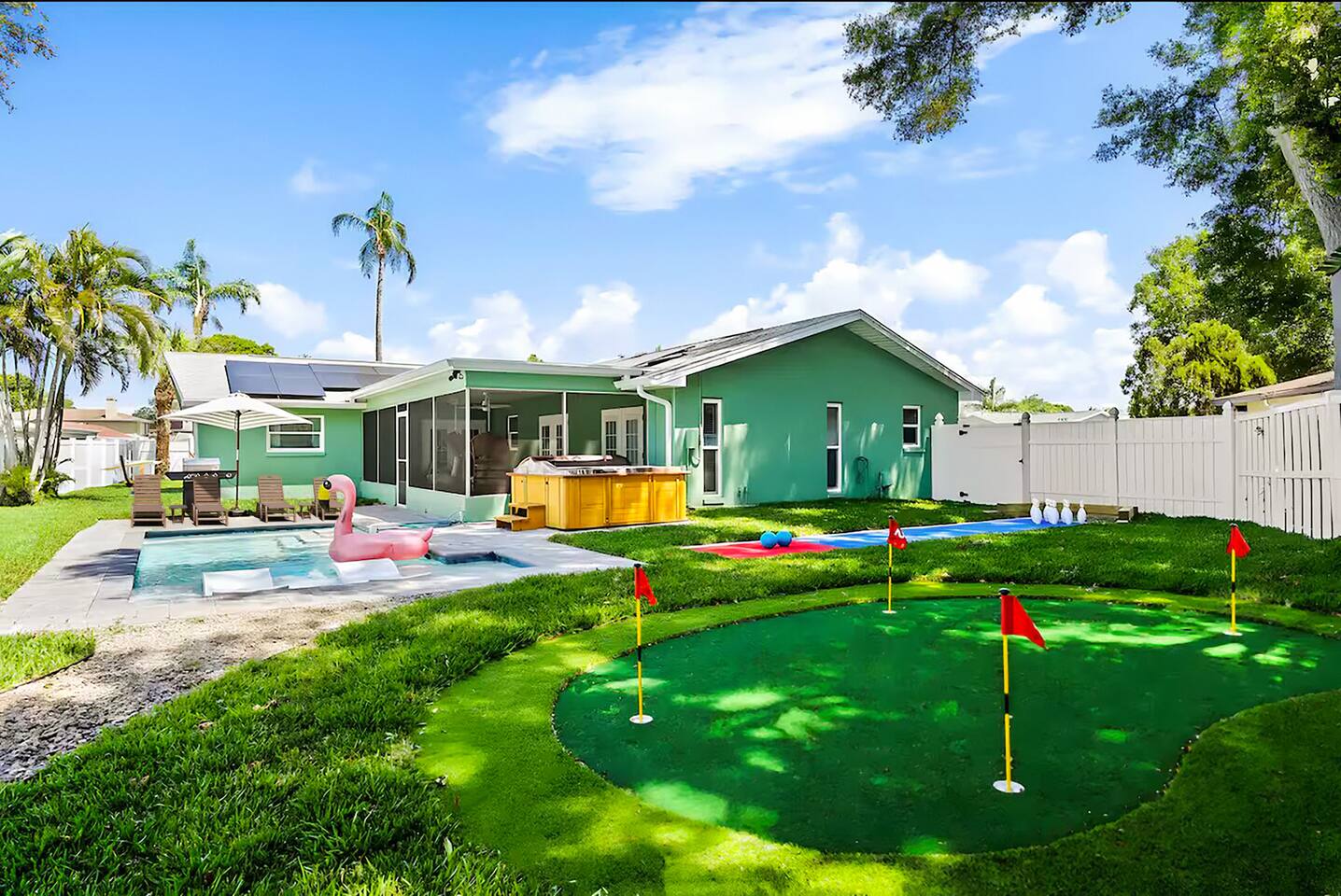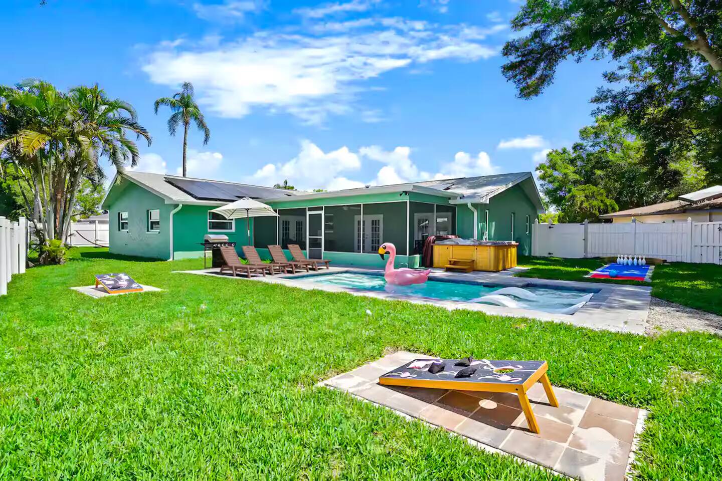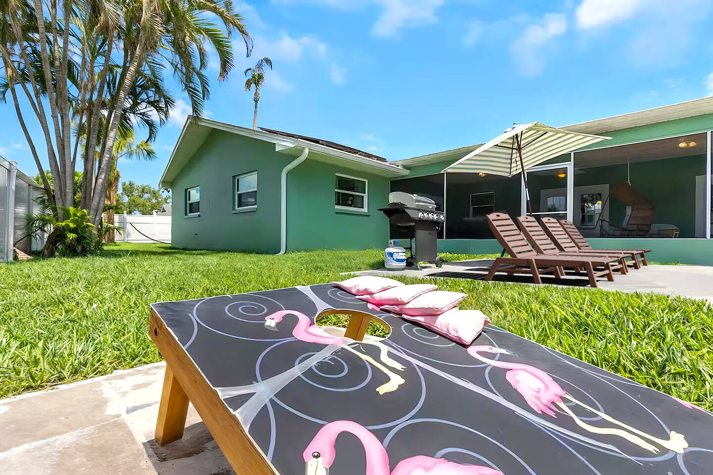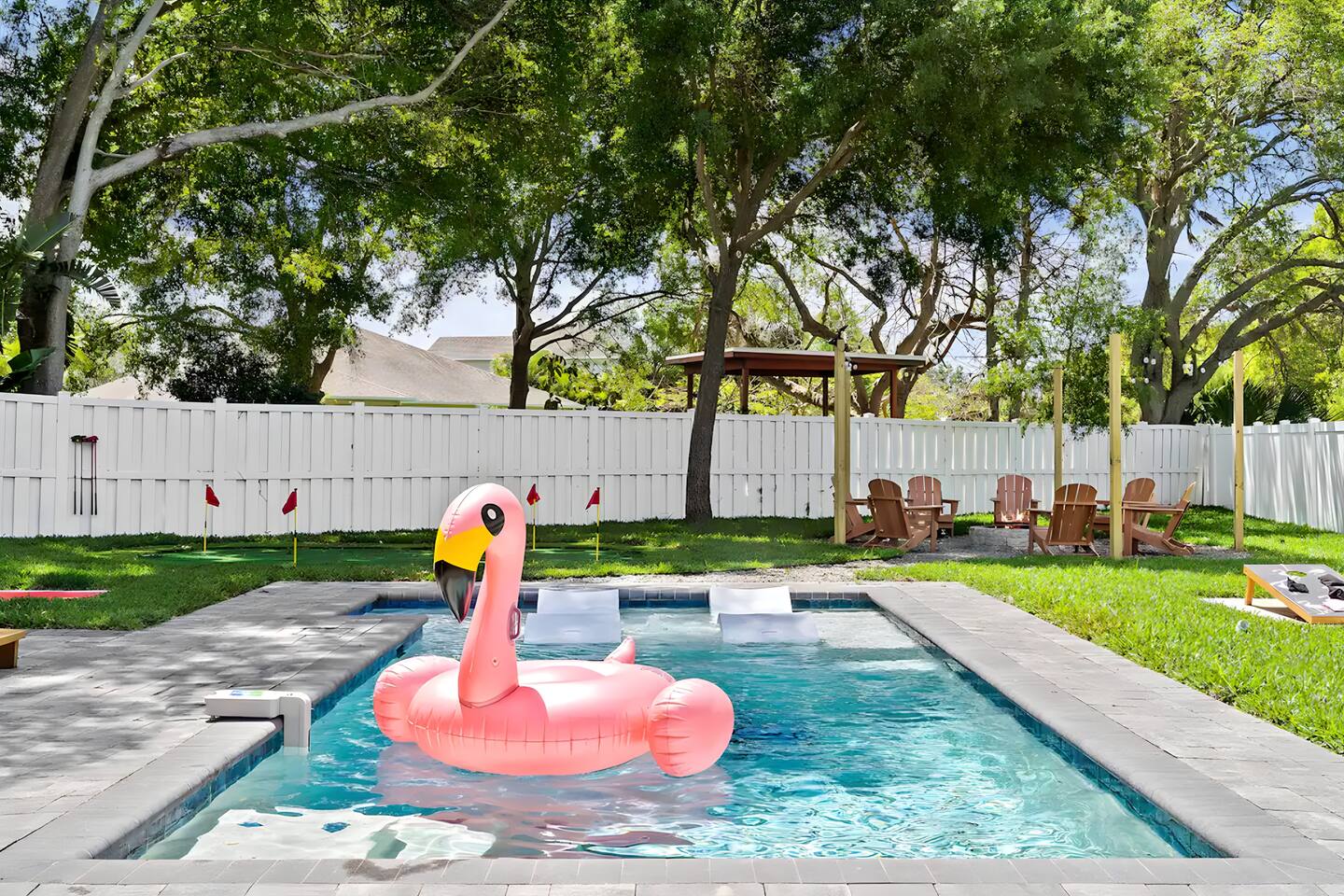 KEY FEATURES: ☀ Four spacious bedrooms; 1 king, 2 queens, & 2 full beds ☀ Two full bathrooms ☀ Open, modern kitchen with all the cooking essentials ☀ Bright dining room with seating for 8 ☀ Vibrant living room with comfy seating & beautiful design ☀ Game room with pool table, smart TV, and additional seating ☀ Additional game room with ping pong, foosball, and basketball ☀ Screened-in back porch with additional dining space, seating, and games ☀ Fully-fenced backyard, loaded with amenities! (Heated pool, hot tub, mini golf, bowling, fire pit, & more) Here Are A Few Kind Words From Our Past Guests: “This was a great place to stay! The morning light through the windows was so beautiful. Overall, just a relaxing experience. The hosts were super responsive whenever I had a question. I would stay again!” - Emily “Sabrina was very accommodating and communicative. the house is beautiful and very comfortable, close to nature hikes.” - Jennifer “This place was lovely! Exactly as pictured! Very clean and excellent host experience!!! I plan to come back again!” - Regina ☆☆ BEDROOMS ☆☆ There are four bedrooms spread across this home. The master bedroom has a king bed, smart TV, and direct access to the backyard. The next two bedrooms have one queen bed in each, while the fourth bedroom has a full-over-full bunk bed. Each bedroom is masterfully designed to carry the tropical, beach theme throughout! ☆☆ BATHROOMS ☆☆ This home has two full bathrooms, both of which are clean and modern. The first bathroom has a sink, toilet, and walk-in shower only, while the second bathroom has a sink, toilet, and shower/tub combo. ☆☆ KITCHEN & DINING ☆☆ The kitchen is open and modern, with new, stainless steel appliances (including a coffee station with a Keurig & coffee pods). This space opens up on both sides to the rest of the main living areas. Right across from the kitchen is the formal dining room, with enough seating to comfortably accommodate 8 (plus outdoor dining options). ☆☆ LIVING ROOM ☆☆ As you walk into the home, you'll be greeted with the living room. This space is beautifully crafted to reflect the beach, flamingo theme that is vibrant throughout the entire home. A fun mural of flamingos overlooks the big sectional couch, additional seating, and a smart TV. A great, cozy space for movie nights with your family & friends! ☆☆ GAME ROOMS ☆☆ Right across from the rest of the main living area is the first game room, equipped with a pool table, smart TV, and more seating options. This space is truly one of the centerpieces of the home, with a big mural, marking this home as the "Flamingo Oasis". The garage has been converted into a second game room, with even more games and an additional space to hang out! Ping pong, foosball, Pop-a-Shot (basketball) and some additional seating makes this game room a great addition to the rest of the entertainment you'll find in this home! ☆☆ OUTDOOR SPACE ☆☆ This backyard is unbelievable; it'll take your breath away! ☀ Heated pool ☀ Hot tub ☀ Bowling ☀ Mini golf ☀ Fire pit (wood burning) ☀ Corn hole ☀ Giant Jenga ☀ Giant Connect 4 ☀ Sun lounging chairs ☀ Hammocks ☀ BBQ grill ☀ Outdoor dining (screened-in porch) ☀ Additional lounge seating (screened-in porch) Total privacy & so much to do in this backyard will make this the perfect spot to stay entertained, whether you plan to use this home as a spot to relax after a day at the beach, or spend your entire vacation here at home! ★☆ Book Now & Let Us Take Care Of You In Seminole! ☆★