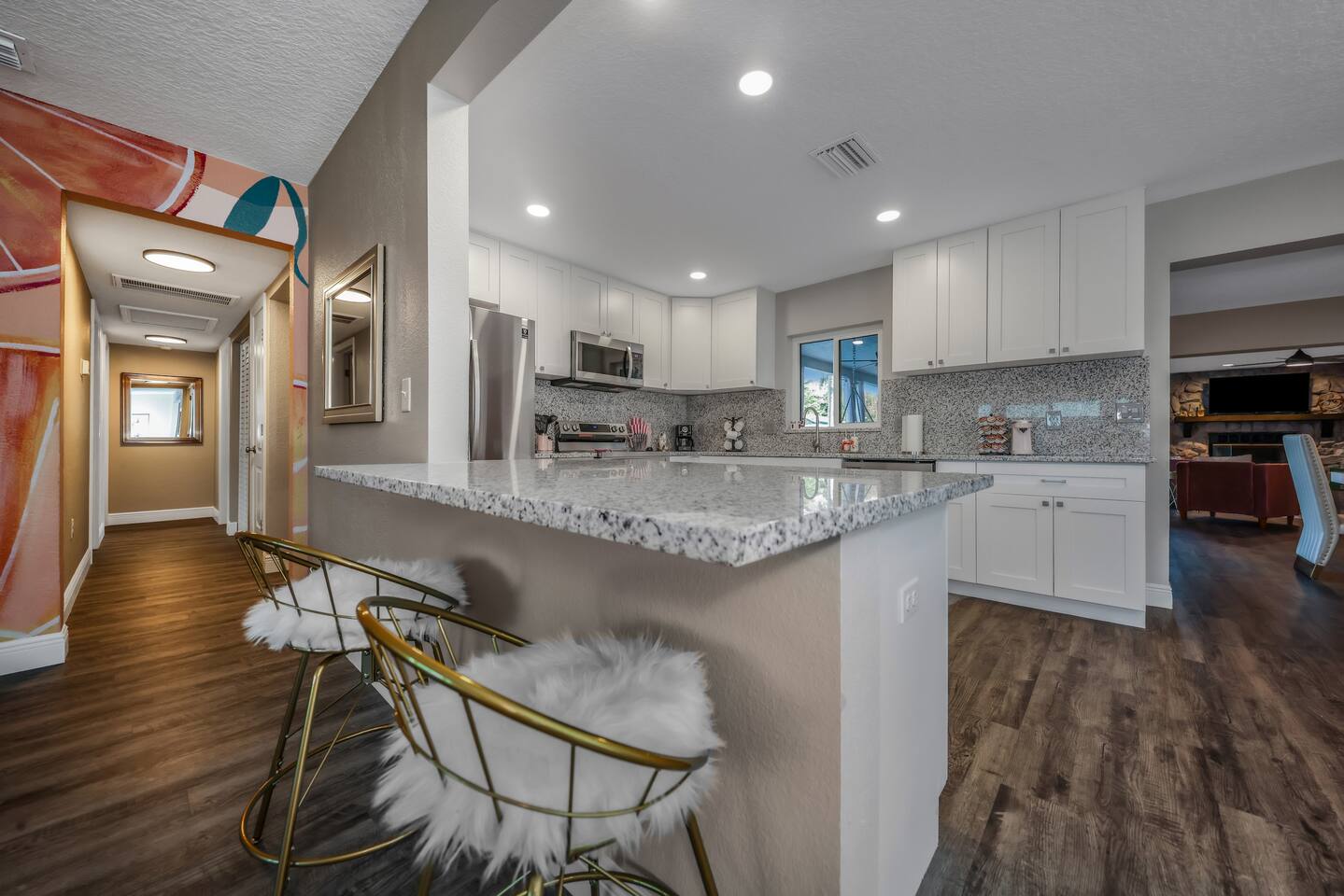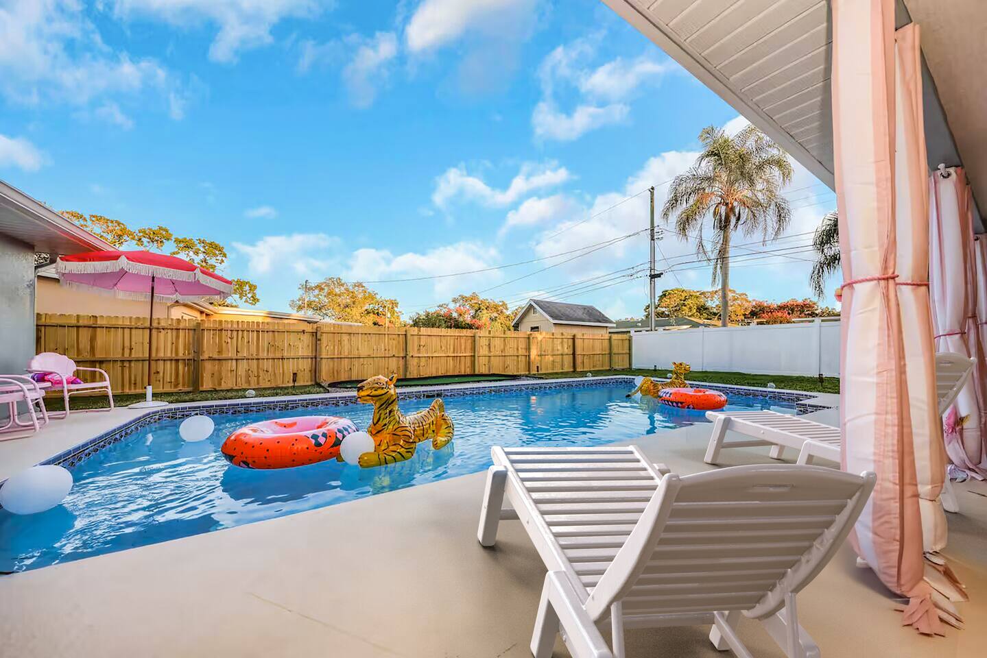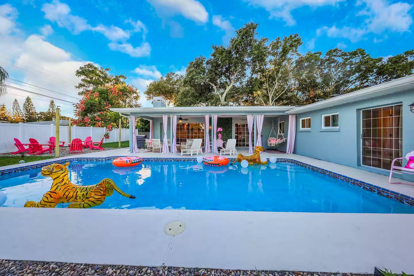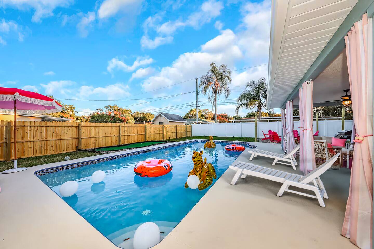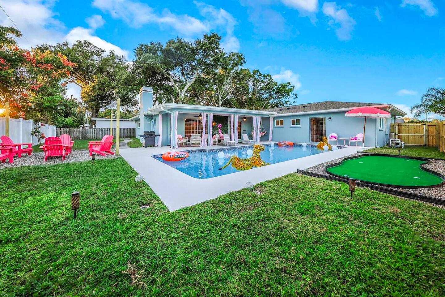 KEY FEATURES: ☀ Four large, extravagant bedrooms (1 king bed & 4 queen beds) ☀ Three modern, full bathrooms ☀ Modern, open concept kitchen with direct access to living areas ☀ Two living rooms with fun, vibrant murals! ☀ Large dining areas w/ seating for 10 (+ 2 bar seats) ☀ Large, fully fenced yard with heated pool (bring your fur babies!) ☀ Fun pool floaties, putting green, fire pit, and much more! ☀ Bonus game room! ☀ Ridiculous, over-the-top design throughout! Here Are A Few Kind Words From Our Past Guests: “This was a great place to stay! The morning light through the windows was so beautiful. Overall, just a relaxing experience. The hosts were super responsive whenever I had a question. I would stay again!” - Emily “Sabrina was very accommodating and communicative. the house is beautiful and very comfortable, close to nature hikes.” - Jennifer “This place was lovely! Exactly as pictured! Very clean and excellent host experience!!! I plan to come back again!” - Regina ☆☆ BEDROOMS ☆☆ Four large bedrooms, each with their own wild design! The master suite is a sight to be seen; completely separate wing of the house from the rest of the bedrooms, equipped with a king bed, smart TV, and opens up to the grand master ensuite bathroom, including tons of walk-in closet space! On the other end of the home, you will find the remaining three bedrooms. One of the most extravagant rooms in the house is one of the secondary bedrooms, with a queen bed dressed in white feathers. Completely ridiculous! A room this outrageous MUST have its own private bathroom, which is does! Right across the hall is the third bedroom, with another queen bed. Next up is the fourth and final bedroom, with two queen beds. These last two rooms share a bathroom right down the same hallway. ☆☆ BATHROOMS ☆☆ Three full bathrooms are spread across this four bedroom home. The master ensuite is attached directly to the master bedroom, and has two sinks, one toilet, and a walk-in shower. The second bathroom is attached to one of the secondary bedrooms, and has one sink, toilet, and a walk-in shower. The third and final bathroom is shared between the two remaining bedrooms, and has one sink, toilet, and a shower/tub combo. ☆☆ KITCHEN & DINING ☆☆ Tons of open space in the kitchen/dining area! The brand new, modern kitchen comes with everything you will need to cook elaborate meals during your vacation, with brand new stainless steel appliances, ridiculous pink utensils and accent pieces, and a Keurig + coffee pods (yes, even this is pink). Opening up to the next room over, you will find the formal dining area, with a bright, fun mural and elaborate decor surrounding the room. This space can seat 8, with an adjacent bistro table to seat 2 more, plus a couple barstool seats in the kitchen. ☆☆ LIVING ROOMS ☆☆ Two living rooms in this home! You are greeted with the first formal living room as you enter the home, with lots of comfy seating and, of course, another bright mural to welcome you into our home. At the other end of the house is the second living area, with a smart TV, lots more comfy seating, and direct access to the backyard. ☆☆ GAME ROOM ☆☆ The garage has been transformed into a game room! Packed with entertainment, you will have your choice of pool table, ping pong, or darts, along with additional high-top table seating to enjoy a drink while hanging out with your friends and family in this cool bonus room. ☆☆ OUTDOOR SPACE ☆☆ Oh, the backyard. The true centerpiece of this home! Elaborate, yet classy, you will most likely find yourself out in the backyard for the duration of your stay. Tons of seating (whether it be outdoor dining or lounging on the couches), heated pool (upon request - additional fee required), putting green, and a fire pit (wood burning)! What else could you possibly ask for? We created this space to provide you with the perfect beach vacation destination home. When not hanging out just minutes away at Clearwater Beach, you will certainly find yourself occupied by the amenities that we offer here! ★☆ Book Now & Let Us Take Care Of You In Clearwater! ☆★
