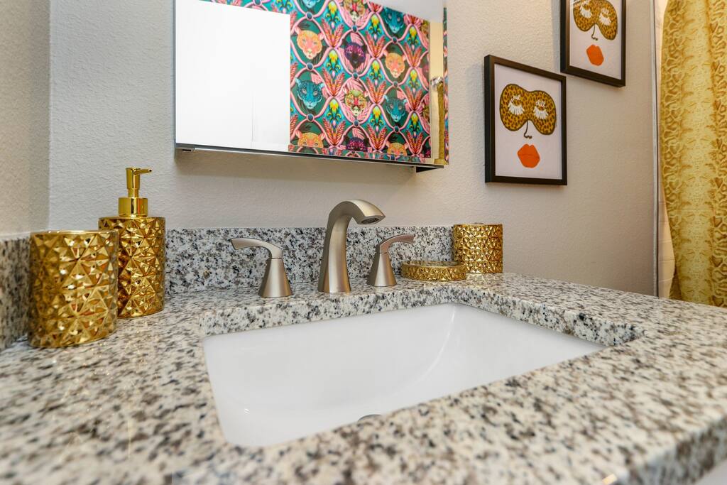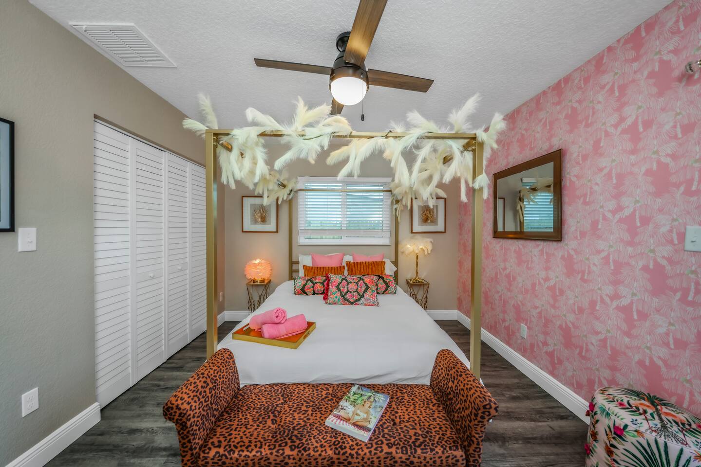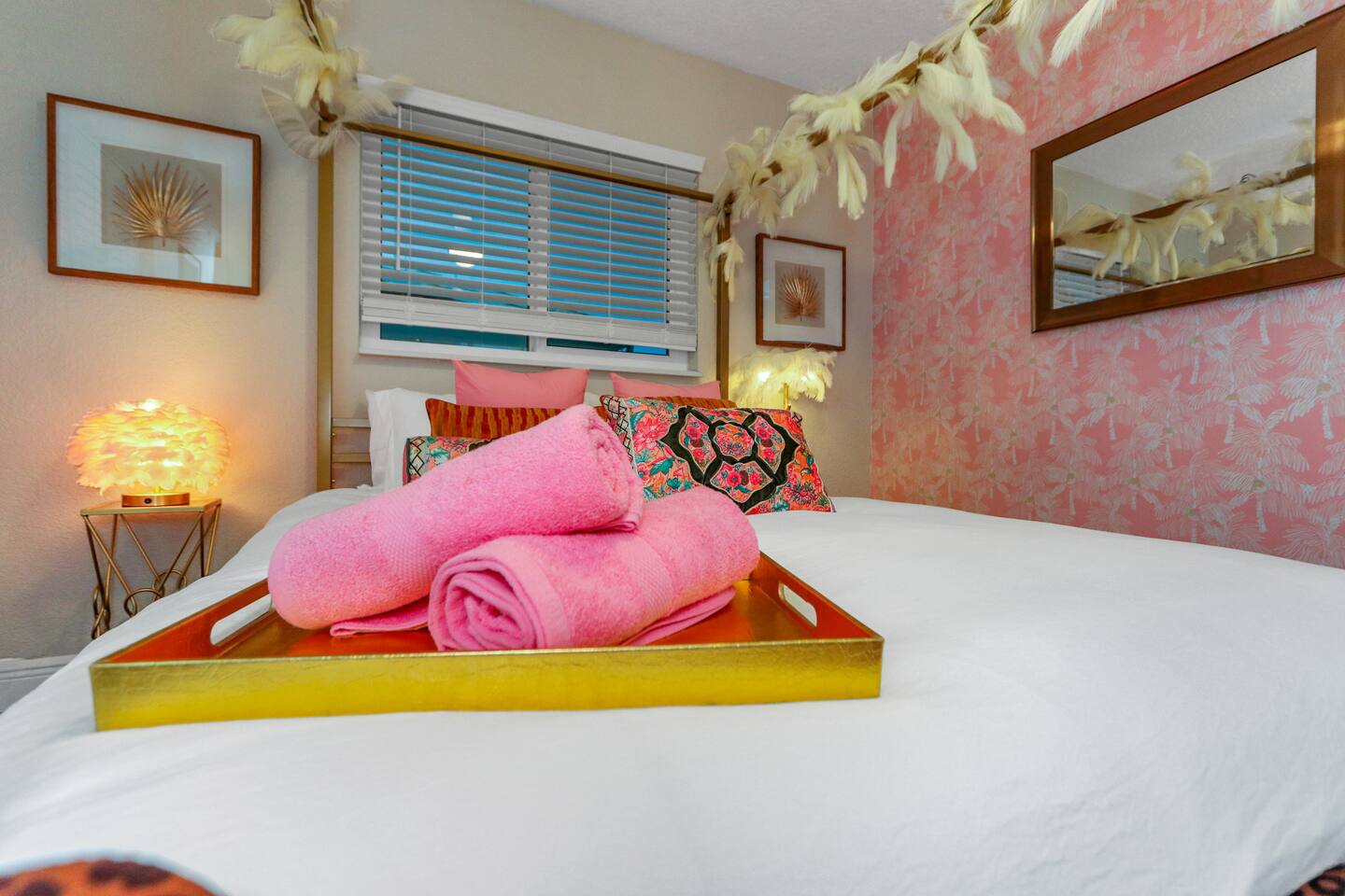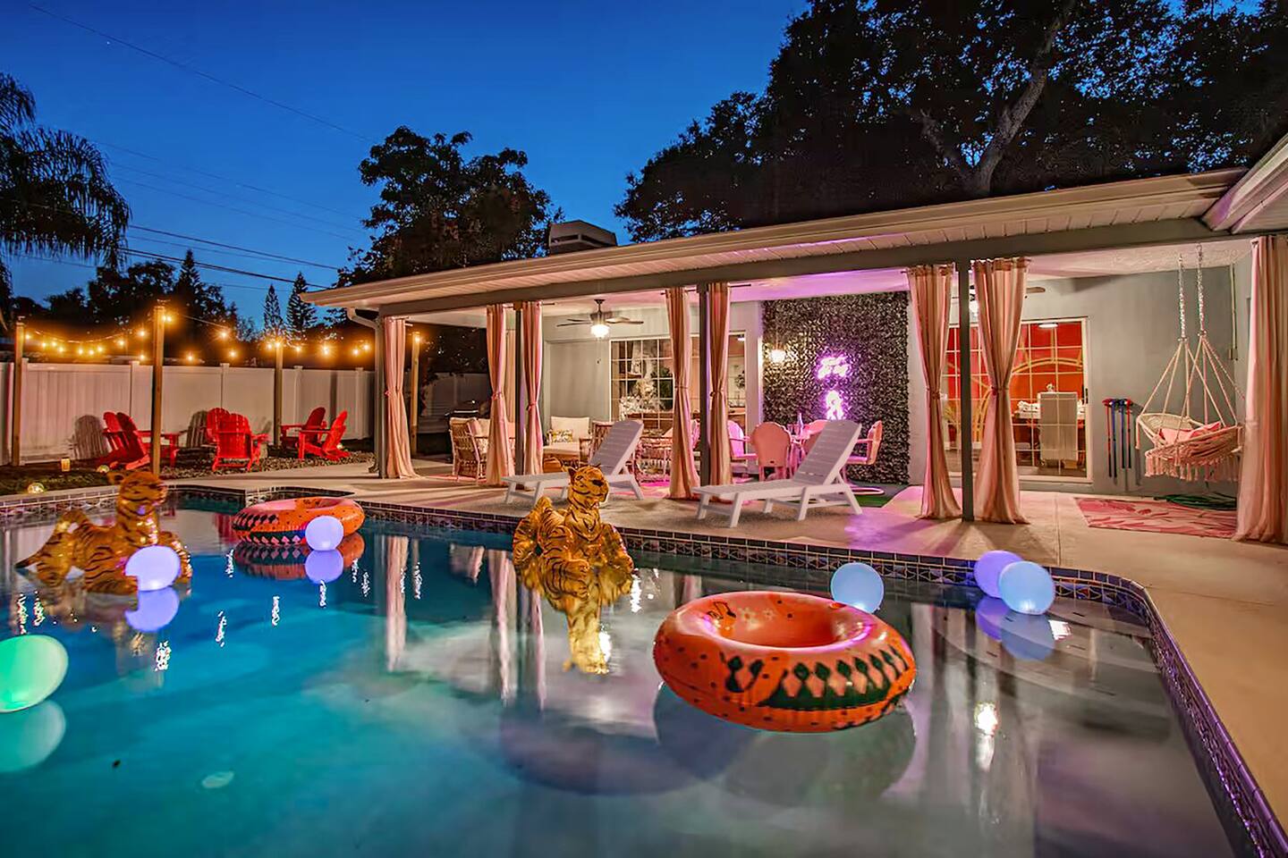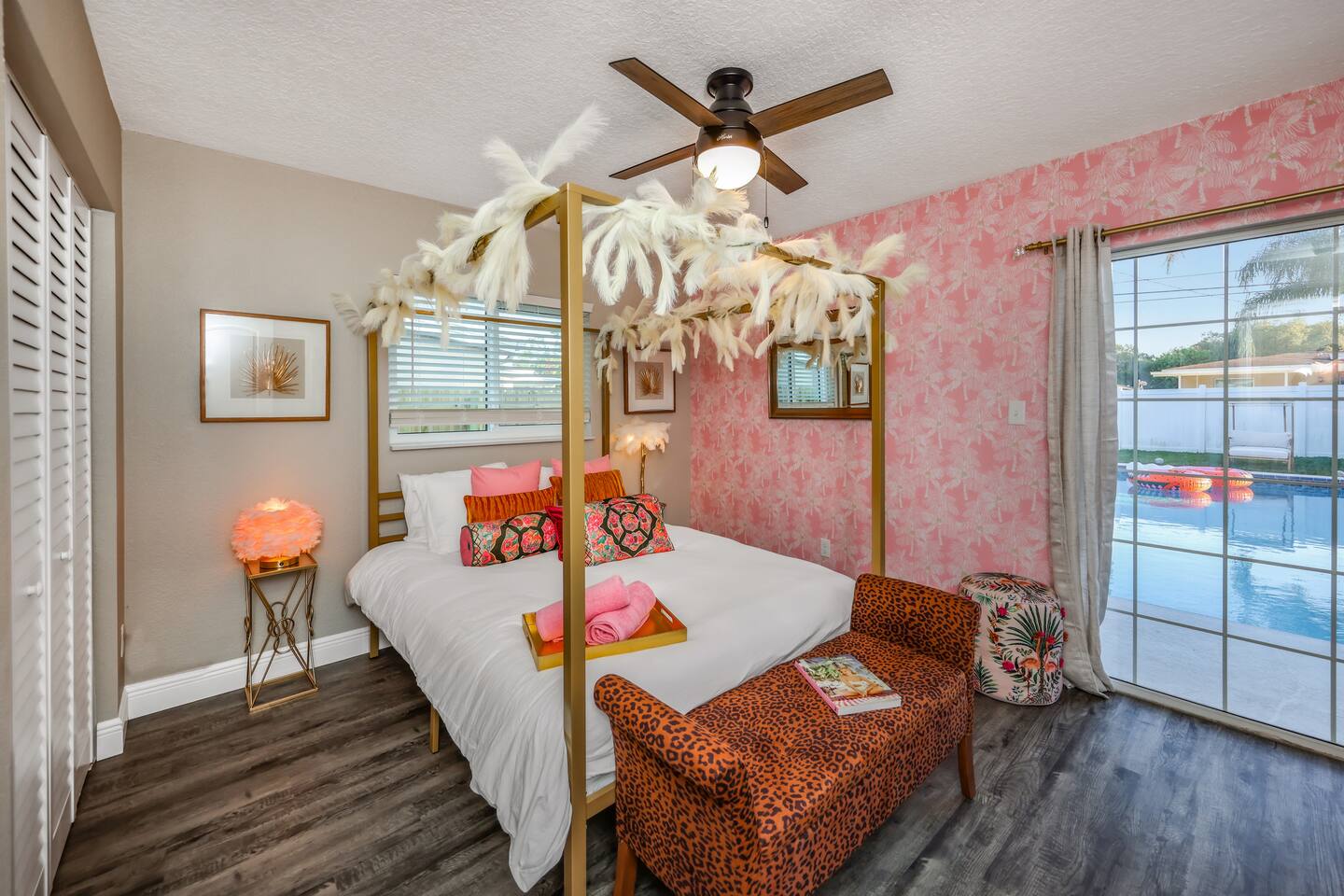 KEY FEATURES: ☀ Four large, extravagant bedrooms (1 king bed & 4 queen beds) ☀ Three modern, full bathrooms ☀ Modern, open concept kitchen with direct access to living areas ☀ Two living rooms with fun, vibrant murals! ☀ Large dining areas w/ seating for 10 (+ 2 bar seats) ☀ Large, fully fenced yard with heated pool (bring your fur babies!) ☀ Fun pool floaties, putting green, fire pit, and much more! ☀ Bonus game room! ☀ Ridiculous, over-the-top design throughout! Here Are A Few Kind Words From Our Past Guests: “This was a great place to stay! The morning light through the windows was so beautiful. Overall, just a relaxing experience. The hosts were super responsive whenever I had a question. I would stay again!” - Emily “Sabrina was very accommodating and communicative. the house is beautiful and very comfortable, close to nature hikes.” - Jennifer “This place was lovely! Exactly as pictured! Very clean and excellent host experience!!! I plan to come back again!” - Regina ☆☆ BEDROOMS ☆☆ Four large bedrooms, each with their own wild design! The master suite is a sight to be seen; completely separate wing of the house from the rest of the bedrooms, equipped with a king bed, smart TV, and opens up to the grand master ensuite bathroom, including tons of walk-in closet space! On the other end of the home, you will find the remaining three bedrooms. One of the most extravagant rooms in the house is one of the secondary bedrooms, with a queen bed dressed in white feathers. Completely ridiculous! A room this outrageous MUST have its own private bathroom, which is does! Right across the hall is the third bedroom, with another queen bed. Next up is the fourth and final bedroom, with two queen beds. These last two rooms share a bathroom right down the same hallway. ☆☆ BATHROOMS ☆☆ Three full bathrooms are spread across this four bedroom home. The master ensuite is attached directly to the master bedroom, and has two sinks, one toilet, and a walk-in shower. The second bathroom is attached to one of the secondary bedrooms, and has one sink, toilet, and a walk-in shower. The third and final bathroom is shared between the two remaining bedrooms, and has one sink, toilet, and a shower/tub combo. ☆☆ KITCHEN & DINING ☆☆ Tons of open space in the kitchen/dining area! The brand new, modern kitchen comes with everything you will need to cook elaborate meals during your vacation, with brand new stainless steel appliances, ridiculous pink utensils and accent pieces, and a Keurig + coffee pods (yes, even this is pink). Opening up to the next room over, you will find the formal dining area, with a bright, fun mural and elaborate decor surrounding the room. This space can seat 8, with an adjacent bistro table to seat 2 more, plus a couple barstool seats in the kitchen. ☆☆ LIVING ROOMS ☆☆ Two living rooms in this home! You are greeted with the first formal living room as you enter the home, with lots of comfy seating and, of course, another bright mural to welcome you into our home. At the other end of the house is the second living area, with a smart TV, lots more comfy seating, and direct access to the backyard. ☆☆ GAME ROOM ☆☆ The garage has been transformed into a game room! Packed with entertainment, you will have your choice of pool table, ping pong, or darts, along with additional high-top table seating to enjoy a drink while hanging out with your friends and family in this cool bonus room. ☆☆ OUTDOOR SPACE ☆☆ Oh, the backyard. The true centerpiece of this home! Elaborate, yet classy, you will most likely find yourself out in the backyard for the duration of your stay. Tons of seating (whether it be outdoor dining or lounging on the couches), heated pool (upon request - additional fee required), putting green, and a fire pit (wood burning)! What else could you possibly ask for? We created this space to provide you with the perfect beach vacation destination home. When not hanging out just minutes away at Clearwater Beach, you will certainly find yourself occupied by the amenities that we offer here! ★☆ Book Now & Let Us Take Care Of You In Clearwater! ☆★