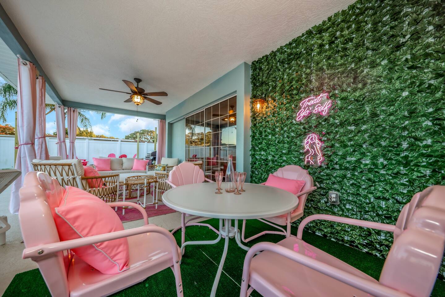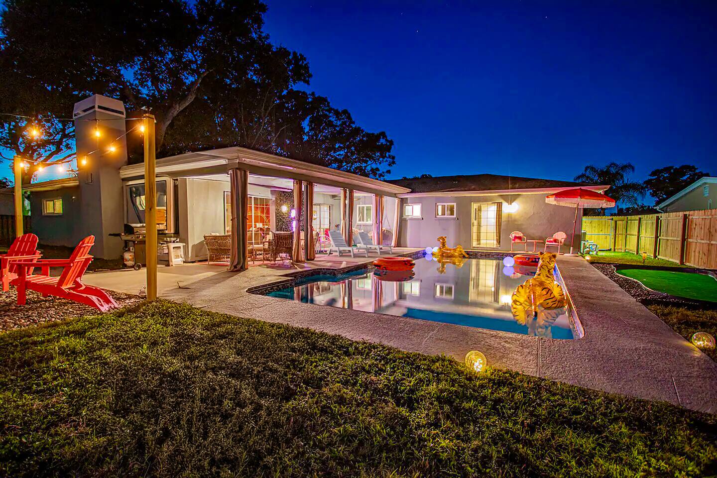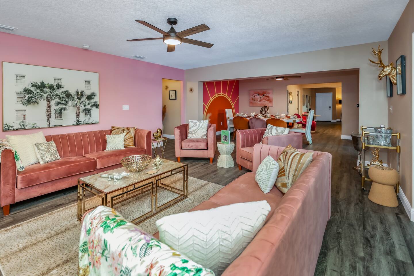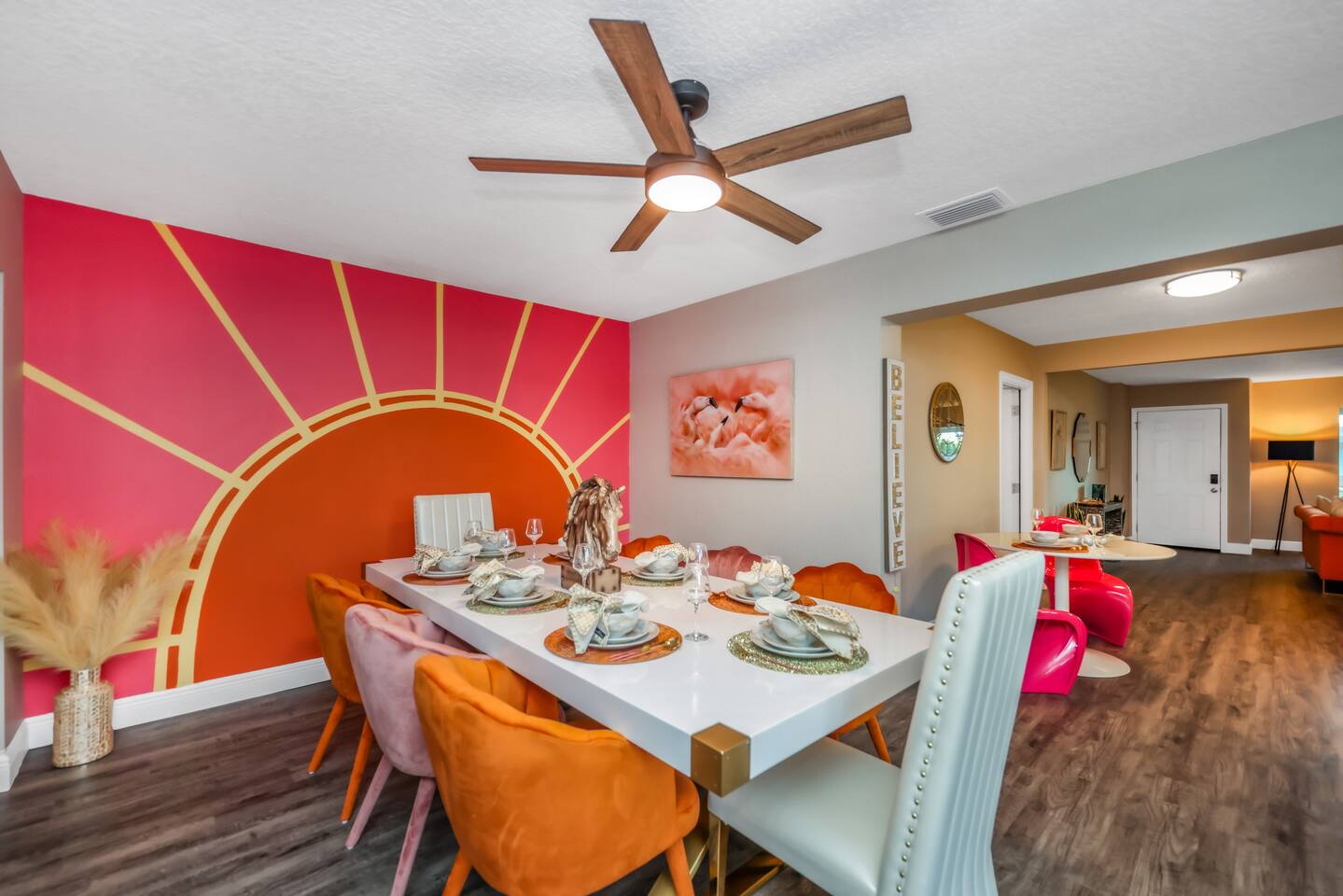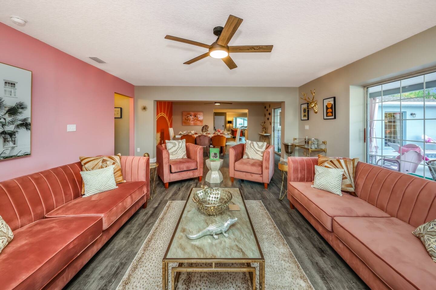 KEY FEATURES: ☀ Four large, extravagant bedrooms (1 king bed & 4 queen beds) ☀ Three modern, full bathrooms ☀ Modern, open concept kitchen with direct access to living areas ☀ Two living rooms with fun, vibrant murals! ☀ Large dining areas w/ seating for 10 (+ 2 bar seats) ☀ Large, fully fenced yard with heated pool (bring your fur babies!) ☀ Fun pool floaties, putting green, fire pit, and much more! ☀ Bonus game room! ☀ Ridiculous, over-the-top design throughout! Here Are A Few Kind Words From Our Past Guests: “This was a great place to stay! The morning light through the windows was so beautiful. Overall, just a relaxing experience. The hosts were super responsive whenever I had a question. I would stay again!” - Emily “Sabrina was very accommodating and communicative. the house is beautiful and very comfortable, close to nature hikes.” - Jennifer “This place was lovely! Exactly as pictured! Very clean and excellent host experience!!! I plan to come back again!” - Regina ☆☆ BEDROOMS ☆☆ Four large bedrooms, each with their own wild design! The master suite is a sight to be seen; completely separate wing of the house from the rest of the bedrooms, equipped with a king bed, smart TV, and opens up to the grand master ensuite bathroom, including tons of walk-in closet space! On the other end of the home, you will find the remaining three bedrooms. One of the most extravagant rooms in the house is one of the secondary bedrooms, with a queen bed dressed in white feathers. Completely ridiculous! A room this outrageous MUST have its own private bathroom, which is does! Right across the hall is the third bedroom, with another queen bed. Next up is the fourth and final bedroom, with two queen beds. These last two rooms share a bathroom right down the same hallway. ☆☆ BATHROOMS ☆☆ Three full bathrooms are spread across this four bedroom home. The master ensuite is attached directly to the master bedroom, and has two sinks, one toilet, and a walk-in shower. The second bathroom is attached to one of the secondary bedrooms, and has one sink, toilet, and a walk-in shower. The third and final bathroom is shared between the two remaining bedrooms, and has one sink, toilet, and a shower/tub combo. ☆☆ KITCHEN & DINING ☆☆ Tons of open space in the kitchen/dining area! The brand new, modern kitchen comes with everything you will need to cook elaborate meals during your vacation, with brand new stainless steel appliances, ridiculous pink utensils and accent pieces, and a Keurig + coffee pods (yes, even this is pink). Opening up to the next room over, you will find the formal dining area, with a bright, fun mural and elaborate decor surrounding the room. This space can seat 8, with an adjacent bistro table to seat 2 more, plus a couple barstool seats in the kitchen. ☆☆ LIVING ROOMS ☆☆ Two living rooms in this home! You are greeted with the first formal living room as you enter the home, with lots of comfy seating and, of course, another bright mural to welcome you into our home. At the other end of the house is the second living area, with a smart TV, lots more comfy seating, and direct access to the backyard. ☆☆ GAME ROOM ☆☆ The garage has been transformed into a game room! Packed with entertainment, you will have your choice of pool table, ping pong, or darts, along with additional high-top table seating to enjoy a drink while hanging out with your friends and family in this cool bonus room. ☆☆ OUTDOOR SPACE ☆☆ Oh, the backyard. The true centerpiece of this home! Elaborate, yet classy, you will most likely find yourself out in the backyard for the duration of your stay. Tons of seating (whether it be outdoor dining or lounging on the couches), heated pool (upon request - additional fee required), putting green, and a fire pit (wood burning)! What else could you possibly ask for? We created this space to provide you with the perfect beach vacation destination home. When not hanging out just minutes away at Clearwater Beach, you will certainly find yourself occupied by the amenities that we offer here! ★☆ Book Now & Let Us Take Care Of You In Clearwater! ☆★