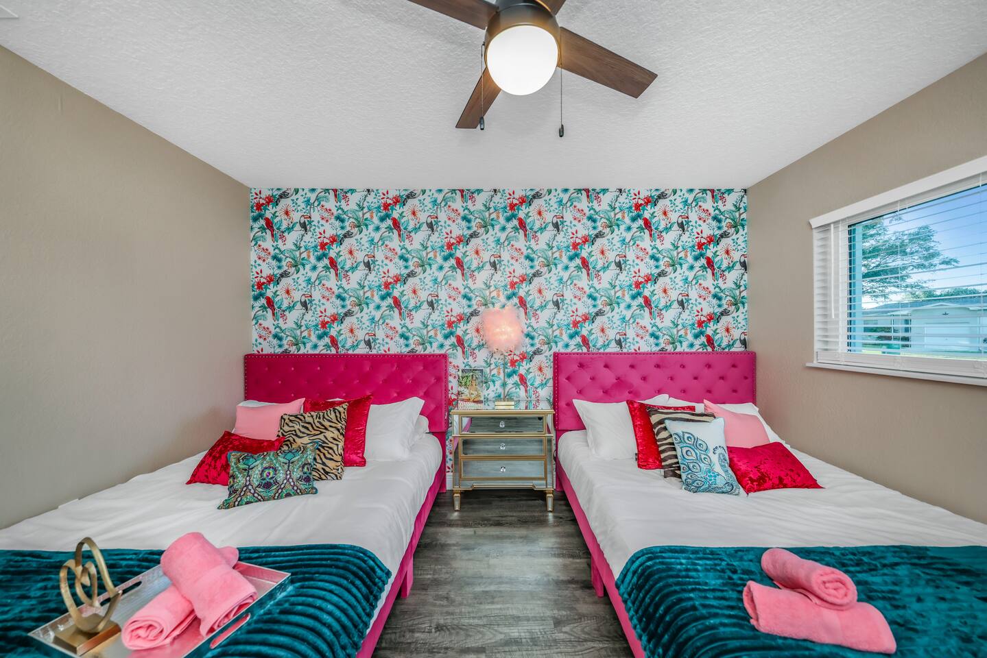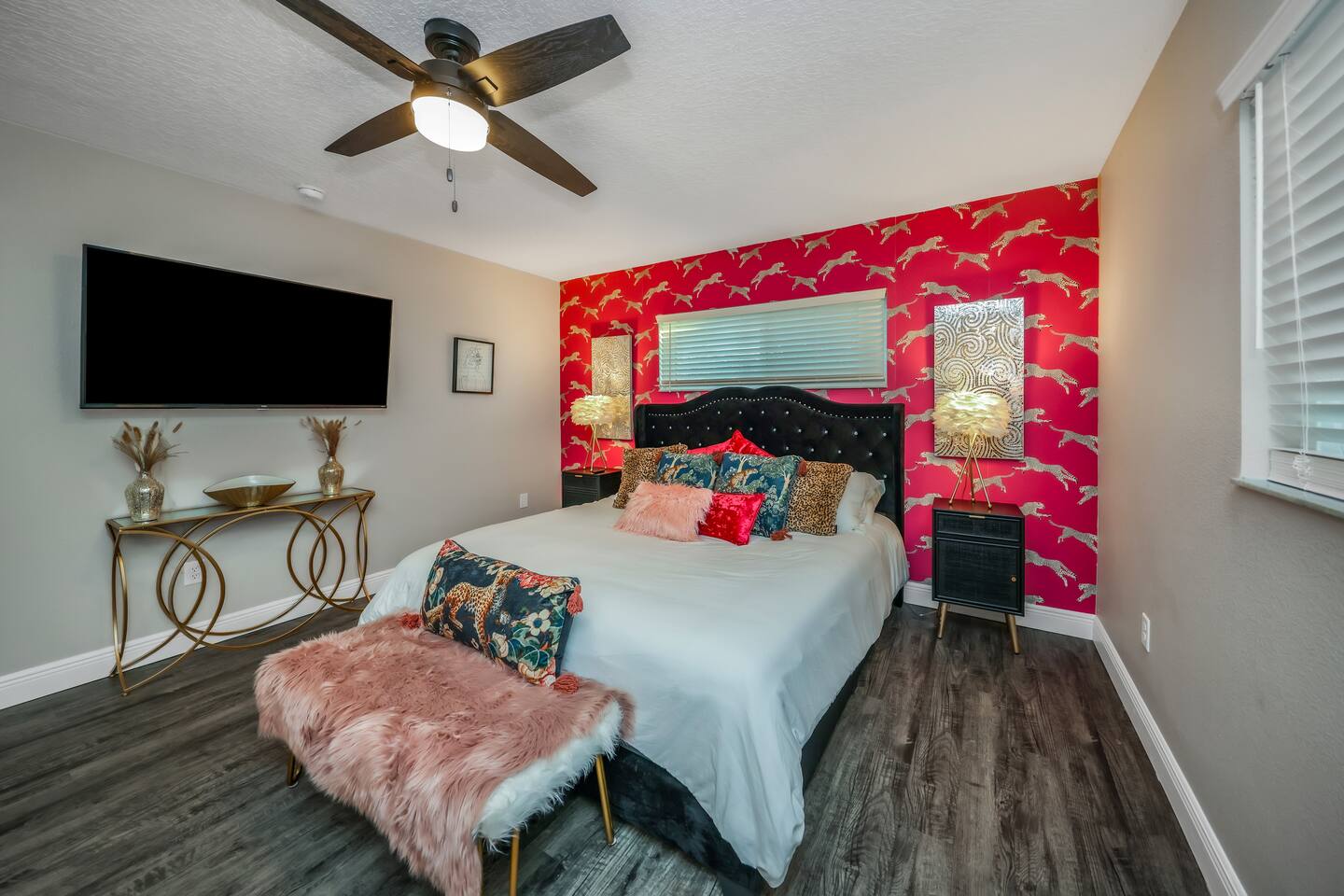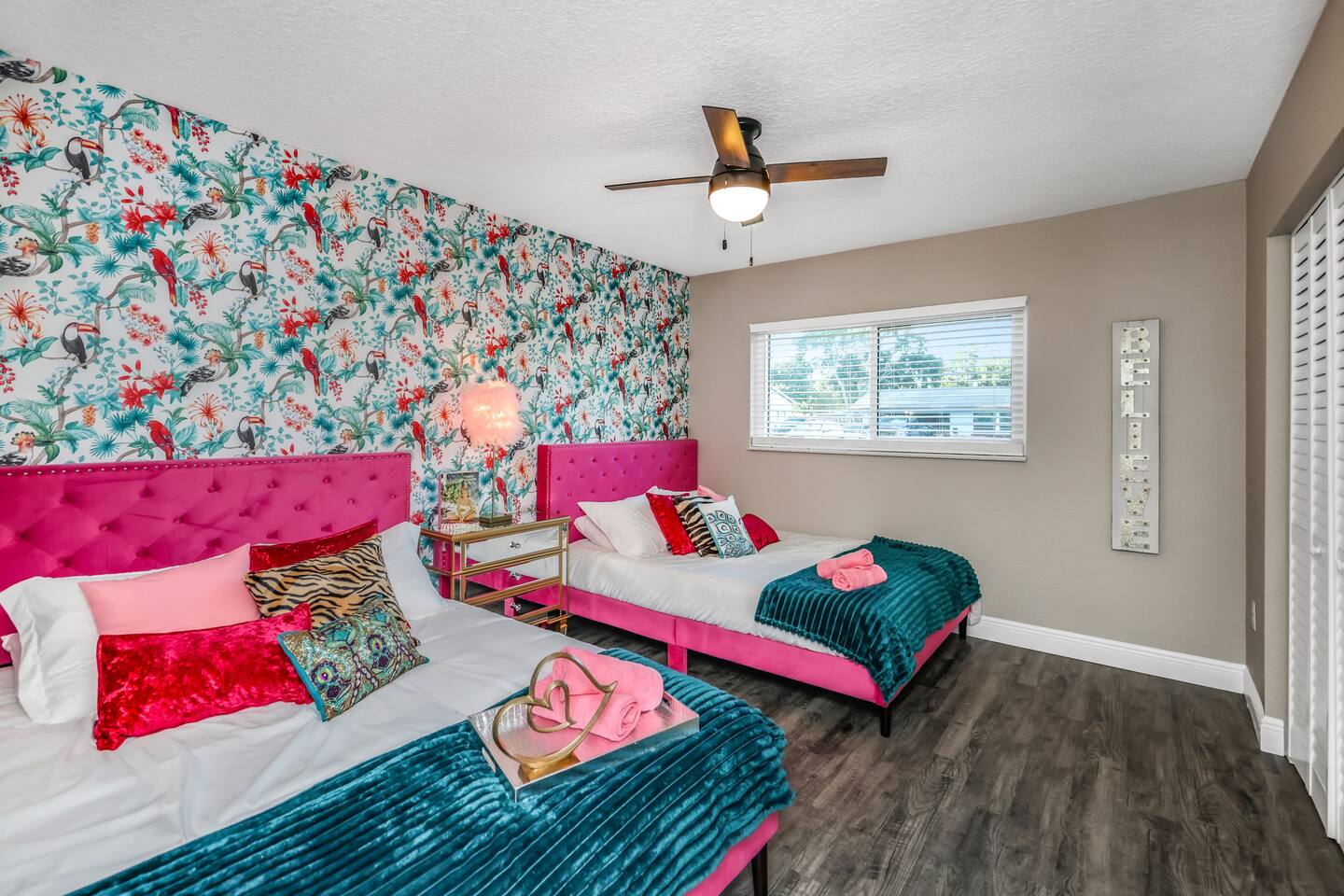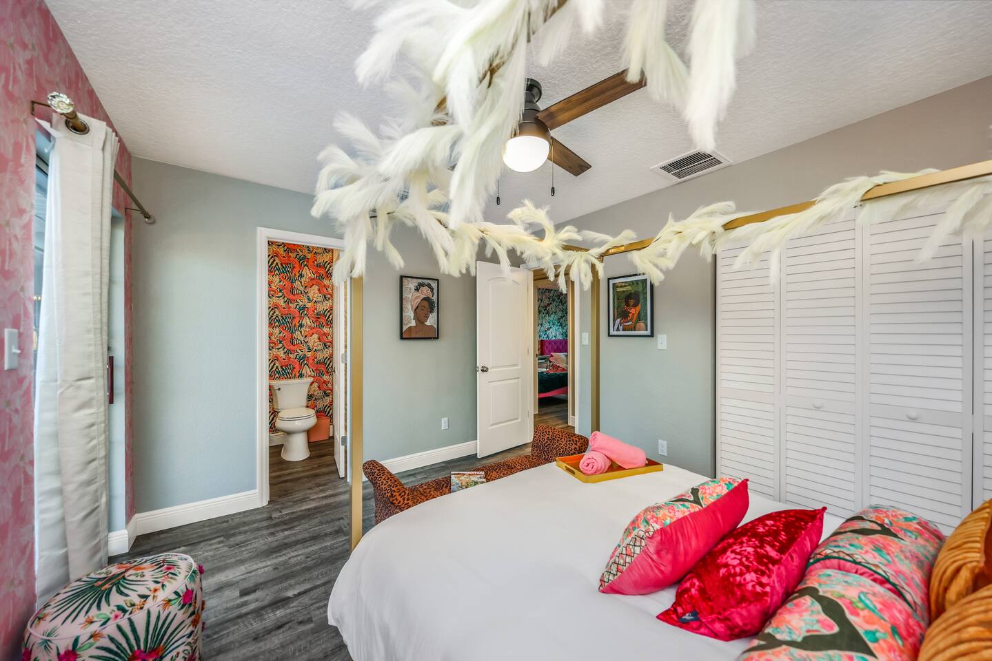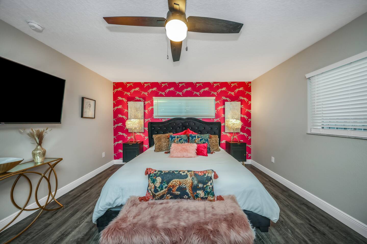 KEY FEATURES: ☀ Four large, extravagant bedrooms (1 king bed & 4 queen beds) ☀ Three modern, full bathrooms ☀ Modern, open concept kitchen with direct access to living areas ☀ Two living rooms with fun, vibrant murals! ☀ Large dining areas w/ seating for 10 (+ 2 bar seats) ☀ Large, fully fenced yard with heated pool (bring your fur babies!) ☀ Fun pool floaties, putting green, fire pit, and much more! ☀ Bonus game room! ☀ Ridiculous, over-the-top design throughout! Here Are A Few Kind Words From Our Past Guests: “This was a great place to stay! The morning light through the windows was so beautiful. Overall, just a relaxing experience. The hosts were super responsive whenever I had a question. I would stay again!” - Emily “Sabrina was very accommodating and communicative. the house is beautiful and very comfortable, close to nature hikes.” - Jennifer “This place was lovely! Exactly as pictured! Very clean and excellent host experience!!! I plan to come back again!” - Regina ☆☆ BEDROOMS ☆☆ Four large bedrooms, each with their own wild design! The master suite is a sight to be seen; completely separate wing of the house from the rest of the bedrooms, equipped with a king bed, smart TV, and opens up to the grand master ensuite bathroom, including tons of walk-in closet space! On the other end of the home, you will find the remaining three bedrooms. One of the most extravagant rooms in the house is one of the secondary bedrooms, with a queen bed dressed in white feathers. Completely ridiculous! A room this outrageous MUST have its own private bathroom, which is does! Right across the hall is the third bedroom, with another queen bed. Next up is the fourth and final bedroom, with two queen beds. These last two rooms share a bathroom right down the same hallway. ☆☆ BATHROOMS ☆☆ Three full bathrooms are spread across this four bedroom home. The master ensuite is attached directly to the master bedroom, and has two sinks, one toilet, and a walk-in shower. The second bathroom is attached to one of the secondary bedrooms, and has one sink, toilet, and a walk-in shower. The third and final bathroom is shared between the two remaining bedrooms, and has one sink, toilet, and a shower/tub combo. ☆☆ KITCHEN & DINING ☆☆ Tons of open space in the kitchen/dining area! The brand new, modern kitchen comes with everything you will need to cook elaborate meals during your vacation, with brand new stainless steel appliances, ridiculous pink utensils and accent pieces, and a Keurig + coffee pods (yes, even this is pink). Opening up to the next room over, you will find the formal dining area, with a bright, fun mural and elaborate decor surrounding the room. This space can seat 8, with an adjacent bistro table to seat 2 more, plus a couple barstool seats in the kitchen. ☆☆ LIVING ROOMS ☆☆ Two living rooms in this home! You are greeted with the first formal living room as you enter the home, with lots of comfy seating and, of course, another bright mural to welcome you into our home. At the other end of the house is the second living area, with a smart TV, lots more comfy seating, and direct access to the backyard. ☆☆ GAME ROOM ☆☆ The garage has been transformed into a game room! Packed with entertainment, you will have your choice of pool table, ping pong, or darts, along with additional high-top table seating to enjoy a drink while hanging out with your friends and family in this cool bonus room. ☆☆ OUTDOOR SPACE ☆☆ Oh, the backyard. The true centerpiece of this home! Elaborate, yet classy, you will most likely find yourself out in the backyard for the duration of your stay. Tons of seating (whether it be outdoor dining or lounging on the couches), heated pool (upon request - additional fee required), putting green, and a fire pit (wood burning)! What else could you possibly ask for? We created this space to provide you with the perfect beach vacation destination home. When not hanging out just minutes away at Clearwater Beach, you will certainly find yourself occupied by the amenities that we offer here! ★☆ Book Now & Let Us Take Care Of You In Clearwater! ☆★