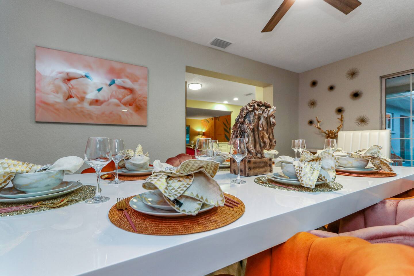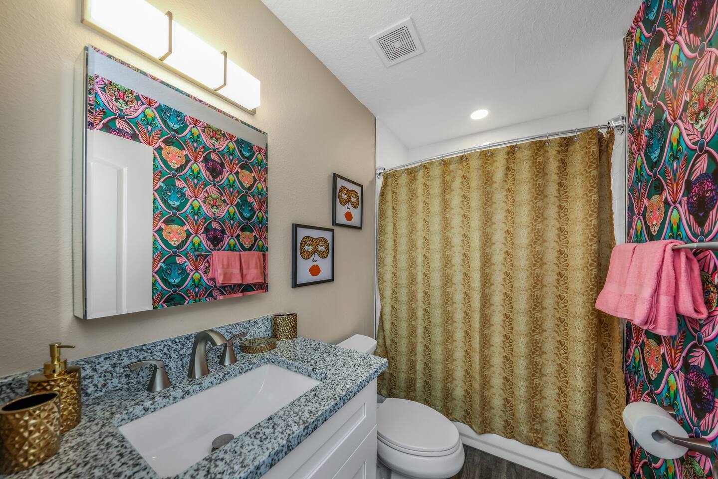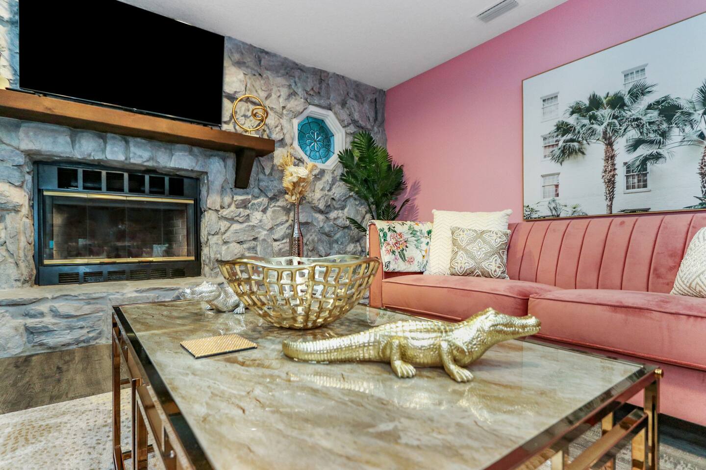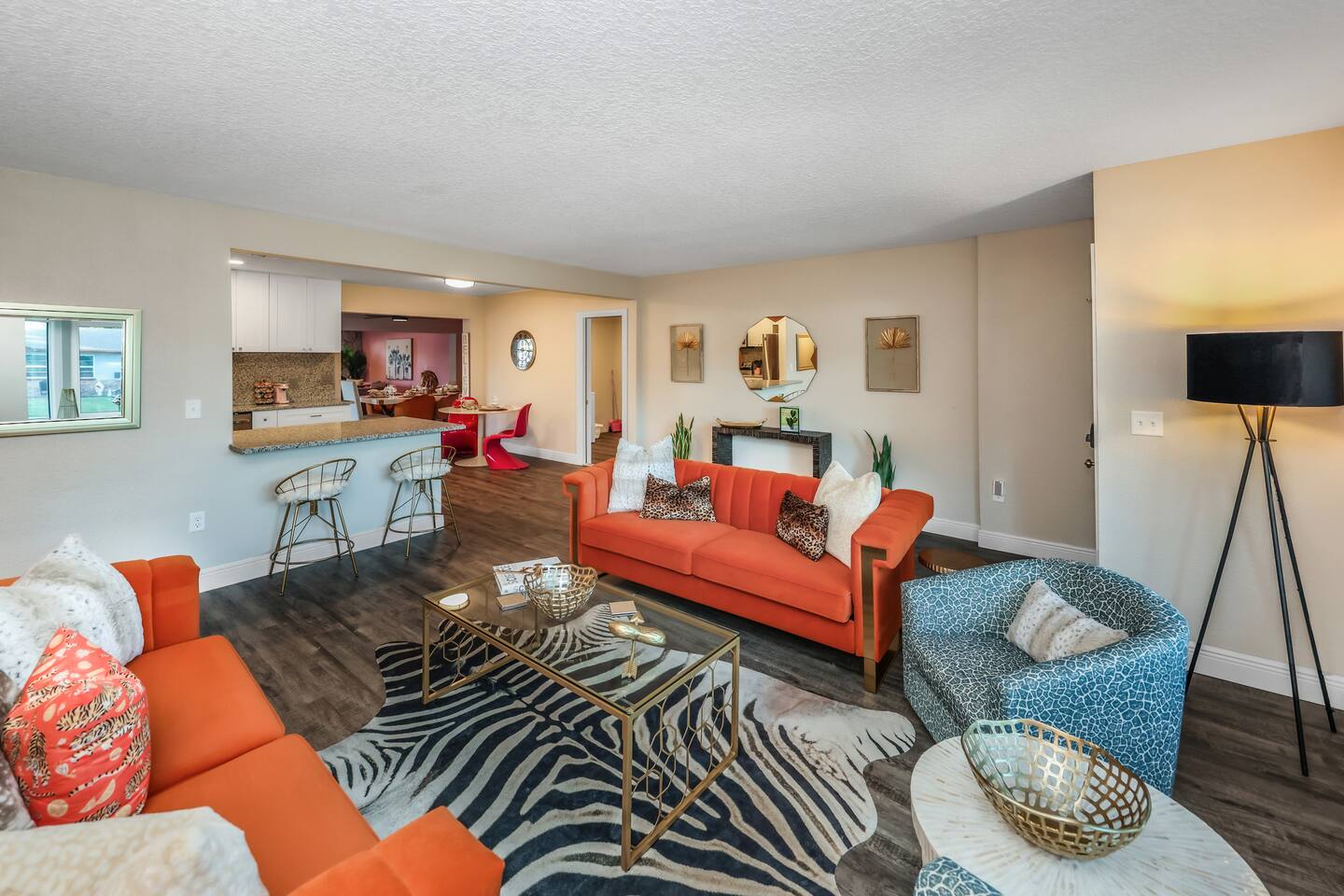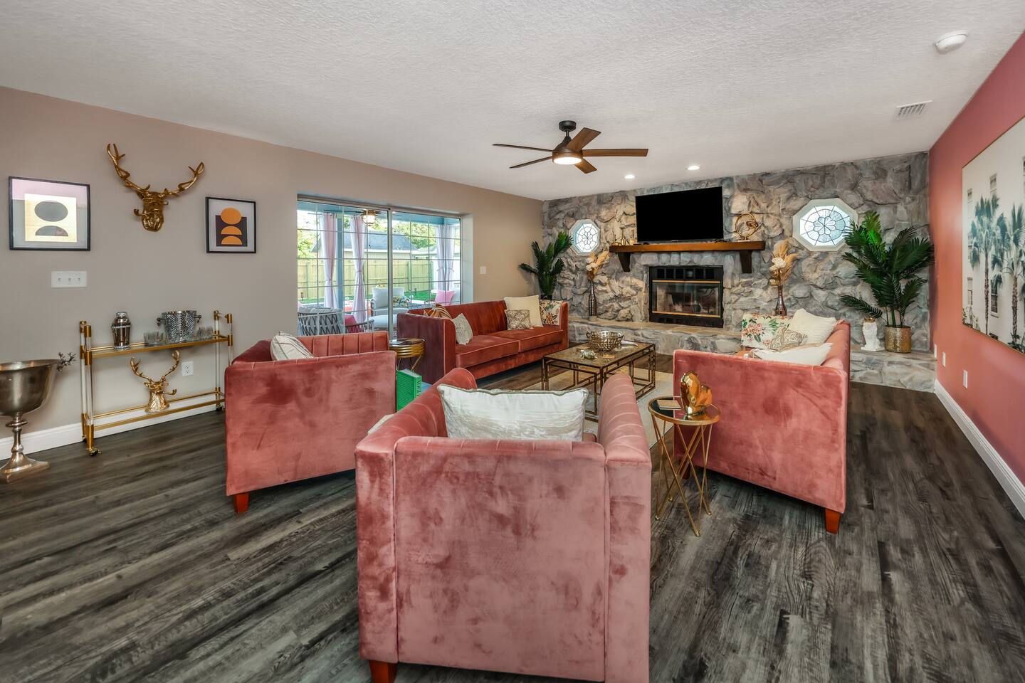 KEY FEATURES: ☀ Four large, extravagant bedrooms (1 king bed & 4 queen beds) ☀ Three modern, full bathrooms ☀ Modern, open concept kitchen with direct access to living areas ☀ Two living rooms with fun, vibrant murals! ☀ Large dining areas w/ seating for 10 (+ 2 bar seats) ☀ Large, fully fenced yard with heated pool (bring your fur babies!) ☀ Fun pool floaties, putting green, fire pit, and much more! ☀ Bonus game room! ☀ Ridiculous, over-the-top design throughout! Here Are A Few Kind Words From Our Past Guests: “This was a great place to stay! The morning light through the windows was so beautiful. Overall, just a relaxing experience. The hosts were super responsive whenever I had a question. I would stay again!” - Emily “Sabrina was very accommodating and communicative. the house is beautiful and very comfortable, close to nature hikes.” - Jennifer “This place was lovely! Exactly as pictured! Very clean and excellent host experience!!! I plan to come back again!” - Regina ☆☆ BEDROOMS ☆☆ Four large bedrooms, each with their own wild design! The master suite is a sight to be seen; completely separate wing of the house from the rest of the bedrooms, equipped with a king bed, smart TV, and opens up to the grand master ensuite bathroom, including tons of walk-in closet space! On the other end of the home, you will find the remaining three bedrooms. One of the most extravagant rooms in the house is one of the secondary bedrooms, with a queen bed dressed in white feathers. Completely ridiculous! A room this outrageous MUST have its own private bathroom, which is does! Right across the hall is the third bedroom, with another queen bed. Next up is the fourth and final bedroom, with two queen beds. These last two rooms share a bathroom right down the same hallway. ☆☆ BATHROOMS ☆☆ Three full bathrooms are spread across this four bedroom home. The master ensuite is attached directly to the master bedroom, and has two sinks, one toilet, and a walk-in shower. The second bathroom is attached to one of the secondary bedrooms, and has one sink, toilet, and a walk-in shower. The third and final bathroom is shared between the two remaining bedrooms, and has one sink, toilet, and a shower/tub combo. ☆☆ KITCHEN & DINING ☆☆ Tons of open space in the kitchen/dining area! The brand new, modern kitchen comes with everything you will need to cook elaborate meals during your vacation, with brand new stainless steel appliances, ridiculous pink utensils and accent pieces, and a Keurig + coffee pods (yes, even this is pink). Opening up to the next room over, you will find the formal dining area, with a bright, fun mural and elaborate decor surrounding the room. This space can seat 8, with an adjacent bistro table to seat 2 more, plus a couple barstool seats in the kitchen. ☆☆ LIVING ROOMS ☆☆ Two living rooms in this home! You are greeted with the first formal living room as you enter the home, with lots of comfy seating and, of course, another bright mural to welcome you into our home. At the other end of the house is the second living area, with a smart TV, lots more comfy seating, and direct access to the backyard. ☆☆ GAME ROOM ☆☆ The garage has been transformed into a game room! Packed with entertainment, you will have your choice of pool table, ping pong, or darts, along with additional high-top table seating to enjoy a drink while hanging out with your friends and family in this cool bonus room. ☆☆ OUTDOOR SPACE ☆☆ Oh, the backyard. The true centerpiece of this home! Elaborate, yet classy, you will most likely find yourself out in the backyard for the duration of your stay. Tons of seating (whether it be outdoor dining or lounging on the couches), heated pool (upon request - additional fee required), putting green, and a fire pit (wood burning)! What else could you possibly ask for? We created this space to provide you with the perfect beach vacation destination home. When not hanging out just minutes away at Clearwater Beach, you will certainly find yourself occupied by the amenities that we offer here! ★☆ Book Now & Let Us Take Care Of You In Clearwater! ☆★
