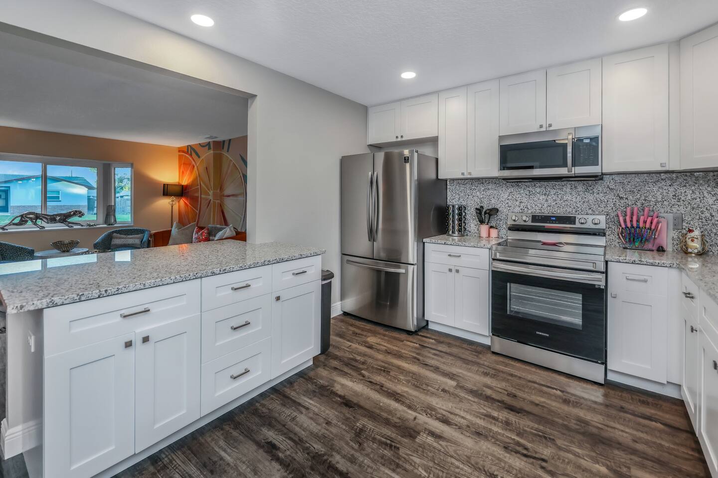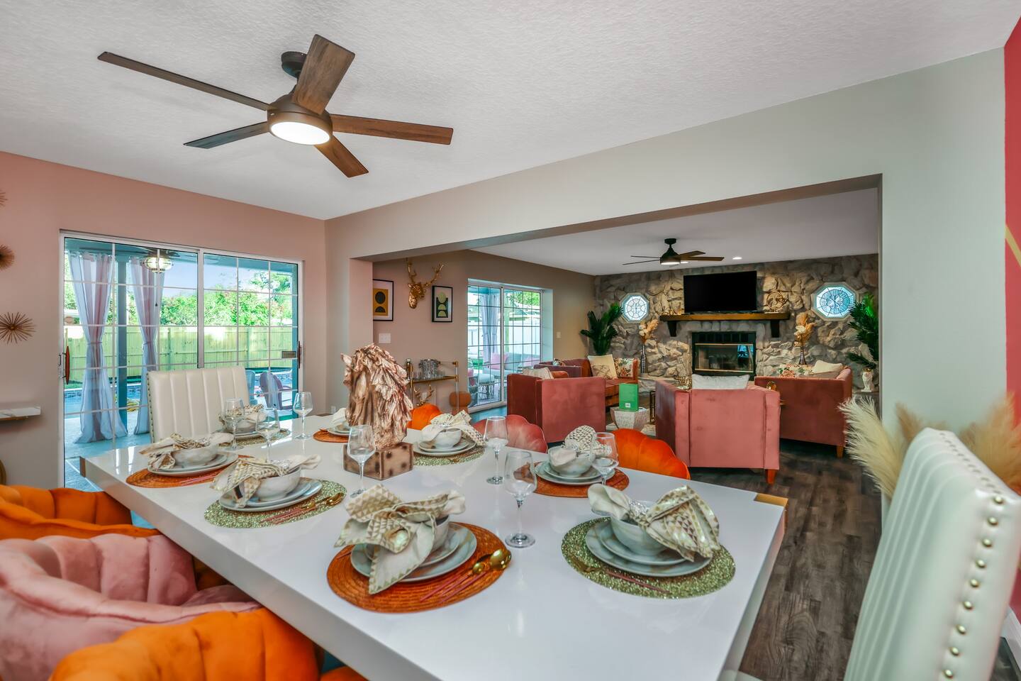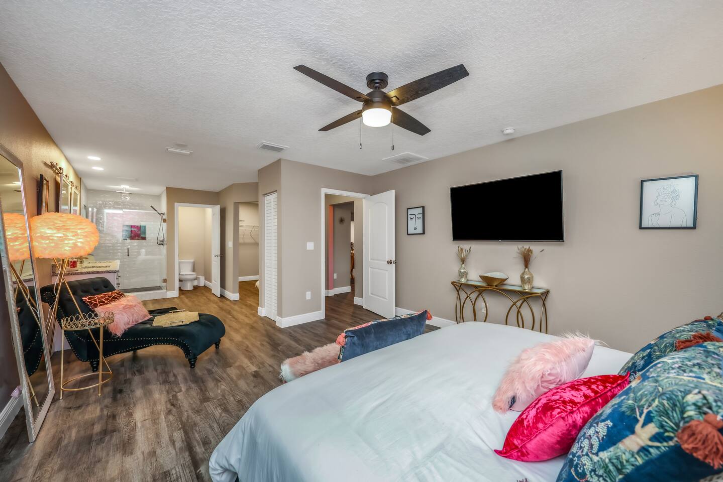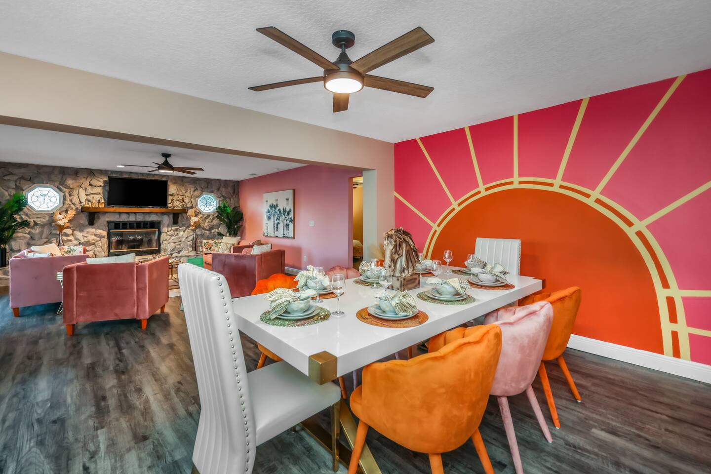 KEY FEATURES: ☀ Four large, extravagant bedrooms (1 king bed & 4 queen beds) ☀ Three modern, full bathrooms ☀ Modern, open concept kitchen with direct access to living areas ☀ Two living rooms with fun, vibrant murals! ☀ Large dining areas w/ seating for 10 (+ 2 bar seats) ☀ Large, fully fenced yard with heated pool (bring your fur babies!) ☀ Fun pool floaties, putting green, fire pit, and much more! ☀ Bonus game room! ☀ Ridiculous, over-the-top design throughout! Here Are A Few Kind Words From Our Past Guests: “This was a great place to stay! The morning light through the windows was so beautiful. Overall, just a relaxing experience. The hosts were super responsive whenever I had a question. I would stay again!” - Emily “Sabrina was very accommodating and communicative. the house is beautiful and very comfortable, close to nature hikes.” - Jennifer “This place was lovely! Exactly as pictured! Very clean and excellent host experience!!! I plan to come back again!” - Regina ☆☆ BEDROOMS ☆☆ Four large bedrooms, each with their own wild design! The master suite is a sight to be seen; completely separate wing of the house from the rest of the bedrooms, equipped with a king bed, smart TV, and opens up to the grand master ensuite bathroom, including tons of walk-in closet space! On the other end of the home, you will find the remaining three bedrooms. One of the most extravagant rooms in the house is one of the secondary bedrooms, with a queen bed dressed in white feathers. Completely ridiculous! A room this outrageous MUST have its own private bathroom, which is does! Right across the hall is the third bedroom, with another queen bed. Next up is the fourth and final bedroom, with two queen beds. These last two rooms share a bathroom right down the same hallway. ☆☆ BATHROOMS ☆☆ Three full bathrooms are spread across this four bedroom home. The master ensuite is attached directly to the master bedroom, and has two sinks, one toilet, and a walk-in shower. The second bathroom is attached to one of the secondary bedrooms, and has one sink, toilet, and a walk-in shower. The third and final bathroom is shared between the two remaining bedrooms, and has one sink, toilet, and a shower/tub combo. ☆☆ KITCHEN & DINING ☆☆ Tons of open space in the kitchen/dining area! The brand new, modern kitchen comes with everything you will need to cook elaborate meals during your vacation, with brand new stainless steel appliances, ridiculous pink utensils and accent pieces, and a Keurig + coffee pods (yes, even this is pink). Opening up to the next room over, you will find the formal dining area, with a bright, fun mural and elaborate decor surrounding the room. This space can seat 8, with an adjacent bistro table to seat 2 more, plus a couple barstool seats in the kitchen. ☆☆ LIVING ROOMS ☆☆ Two living rooms in this home! You are greeted with the first formal living room as you enter the home, with lots of comfy seating and, of course, another bright mural to welcome you into our home. At the other end of the house is the second living area, with a smart TV, lots more comfy seating, and direct access to the backyard. ☆☆ GAME ROOM ☆☆ The garage has been transformed into a game room! Packed with entertainment, you will have your choice of pool table, ping pong, or darts, along with additional high-top table seating to enjoy a drink while hanging out with your friends and family in this cool bonus room. ☆☆ OUTDOOR SPACE ☆☆ Oh, the backyard. The true centerpiece of this home! Elaborate, yet classy, you will most likely find yourself out in the backyard for the duration of your stay. Tons of seating (whether it be outdoor dining or lounging on the couches), heated pool (upon request - additional fee required), putting green, and a fire pit (wood burning)! What else could you possibly ask for? We created this space to provide you with the perfect beach vacation destination home. When not hanging out just minutes away at Clearwater Beach, you will certainly find yourself occupied by the amenities that we offer here! ★☆ Book Now & Let Us Take Care Of You In Clearwater! ☆★