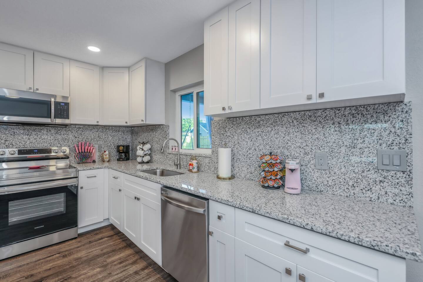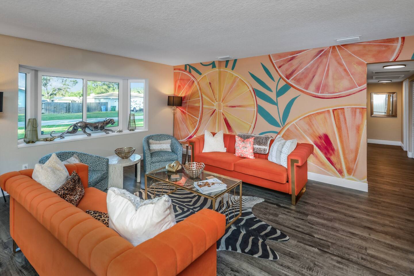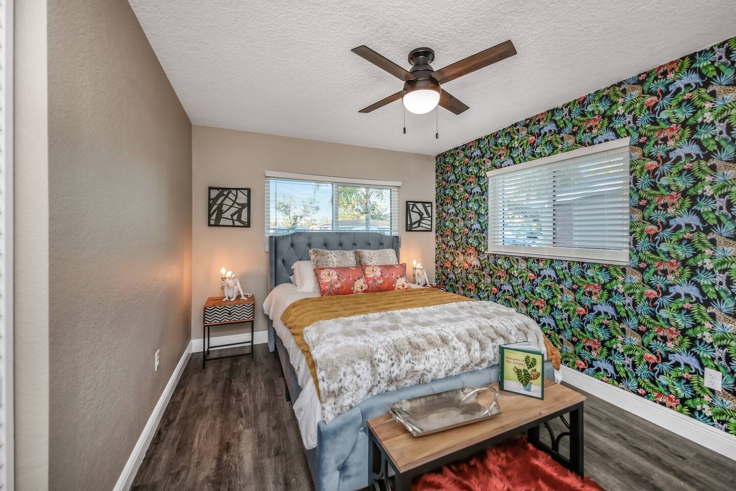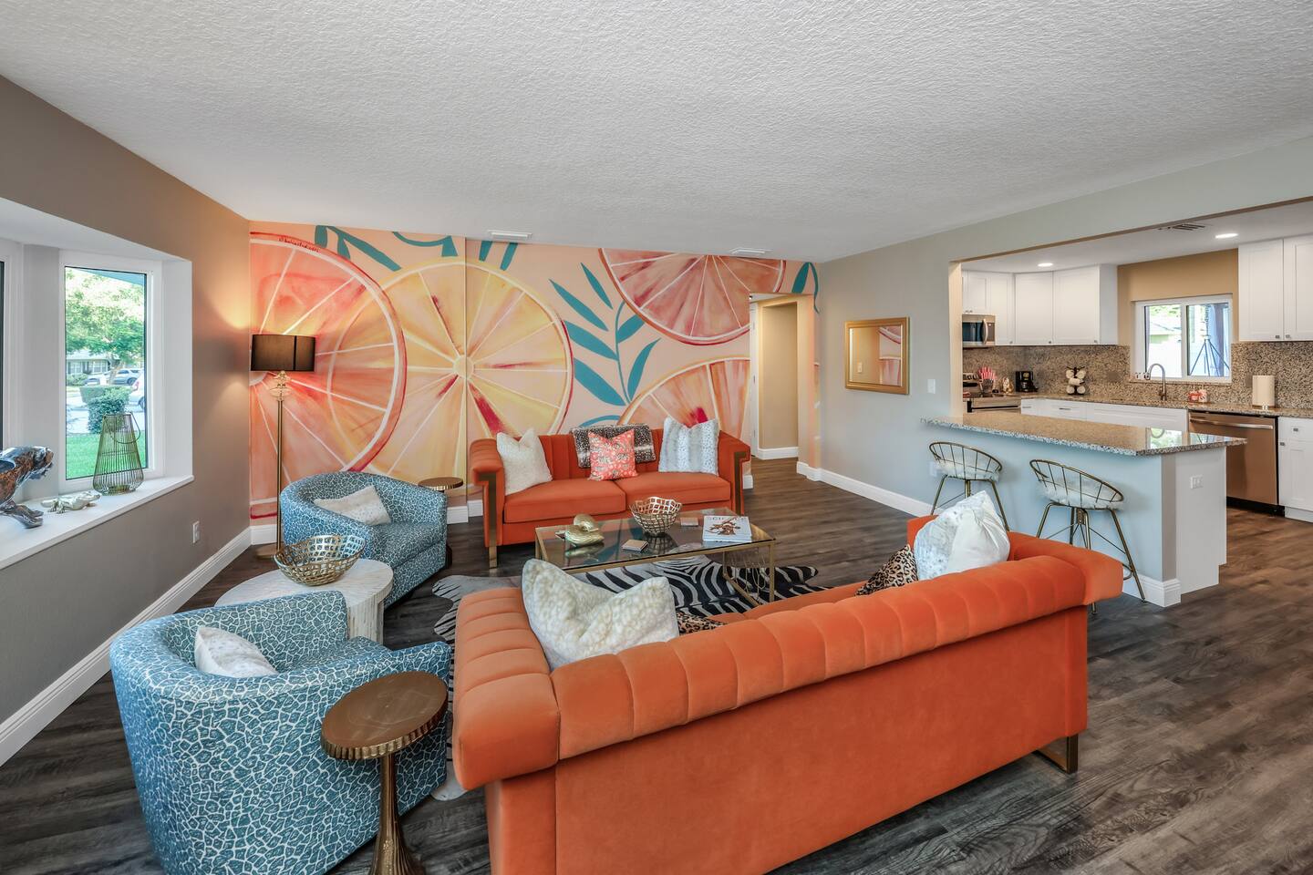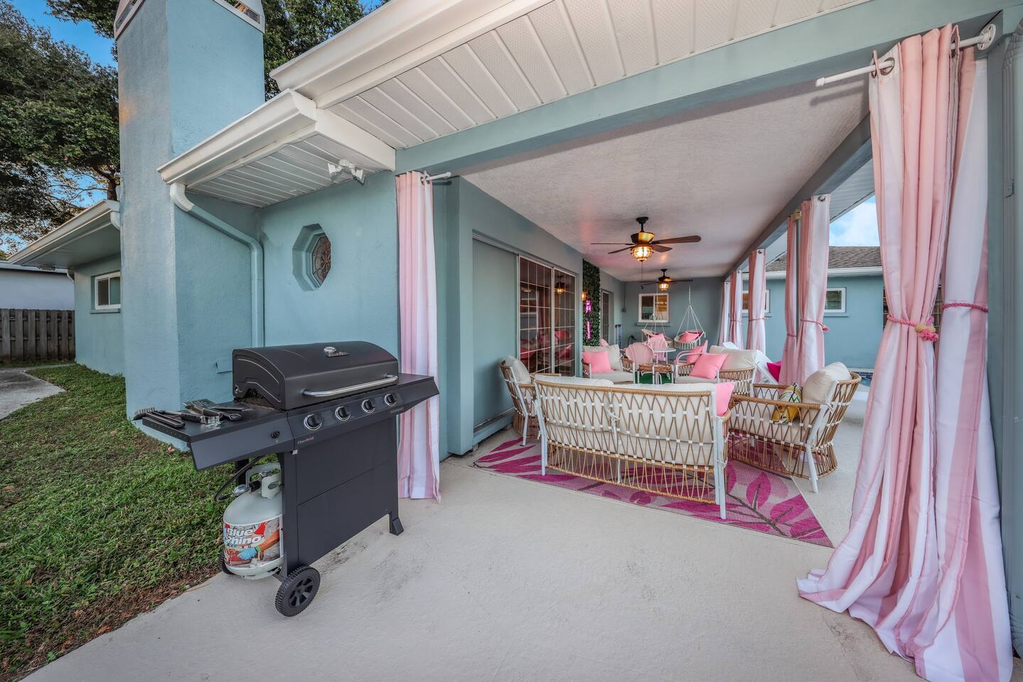 KEY FEATURES: ☀ Four large, extravagant bedrooms (1 king bed & 4 queen beds) ☀ Three modern, full bathrooms ☀ Modern, open concept kitchen with direct access to living areas ☀ Two living rooms with fun, vibrant murals! ☀ Large dining areas w/ seating for 10 (+ 2 bar seats) ☀ Large, fully fenced yard with heated pool (bring your fur babies!) ☀ Fun pool floaties, putting green, fire pit, and much more! ☀ Bonus game room! ☀ Ridiculous, over-the-top design throughout! Here Are A Few Kind Words From Our Past Guests: “This was a great place to stay! The morning light through the windows was so beautiful. Overall, just a relaxing experience. The hosts were super responsive whenever I had a question. I would stay again!” - Emily “Sabrina was very accommodating and communicative. the house is beautiful and very comfortable, close to nature hikes.” - Jennifer “This place was lovely! Exactly as pictured! Very clean and excellent host experience!!! I plan to come back again!” - Regina ☆☆ BEDROOMS ☆☆ Four large bedrooms, each with their own wild design! The master suite is a sight to be seen; completely separate wing of the house from the rest of the bedrooms, equipped with a king bed, smart TV, and opens up to the grand master ensuite bathroom, including tons of walk-in closet space! On the other end of the home, you will find the remaining three bedrooms. One of the most extravagant rooms in the house is one of the secondary bedrooms, with a queen bed dressed in white feathers. Completely ridiculous! A room this outrageous MUST have its own private bathroom, which is does! Right across the hall is the third bedroom, with another queen bed. Next up is the fourth and final bedroom, with two queen beds. These last two rooms share a bathroom right down the same hallway. ☆☆ BATHROOMS ☆☆ Three full bathrooms are spread across this four bedroom home. The master ensuite is attached directly to the master bedroom, and has two sinks, one toilet, and a walk-in shower. The second bathroom is attached to one of the secondary bedrooms, and has one sink, toilet, and a walk-in shower. The third and final bathroom is shared between the two remaining bedrooms, and has one sink, toilet, and a shower/tub combo. ☆☆ KITCHEN & DINING ☆☆ Tons of open space in the kitchen/dining area! The brand new, modern kitchen comes with everything you will need to cook elaborate meals during your vacation, with brand new stainless steel appliances, ridiculous pink utensils and accent pieces, and a Keurig + coffee pods (yes, even this is pink). Opening up to the next room over, you will find the formal dining area, with a bright, fun mural and elaborate decor surrounding the room. This space can seat 8, with an adjacent bistro table to seat 2 more, plus a couple barstool seats in the kitchen. ☆☆ LIVING ROOMS ☆☆ Two living rooms in this home! You are greeted with the first formal living room as you enter the home, with lots of comfy seating and, of course, another bright mural to welcome you into our home. At the other end of the house is the second living area, with a smart TV, lots more comfy seating, and direct access to the backyard. ☆☆ GAME ROOM ☆☆ The garage has been transformed into a game room! Packed with entertainment, you will have your choice of pool table, ping pong, or darts, along with additional high-top table seating to enjoy a drink while hanging out with your friends and family in this cool bonus room. ☆☆ OUTDOOR SPACE ☆☆ Oh, the backyard. The true centerpiece of this home! Elaborate, yet classy, you will most likely find yourself out in the backyard for the duration of your stay. Tons of seating (whether it be outdoor dining or lounging on the couches), heated pool (upon request - additional fee required), putting green, and a fire pit (wood burning)! What else could you possibly ask for? We created this space to provide you with the perfect beach vacation destination home. When not hanging out just minutes away at Clearwater Beach, you will certainly find yourself occupied by the amenities that we offer here! ★☆ Book Now & Let Us Take Care Of You In Clearwater! ☆★