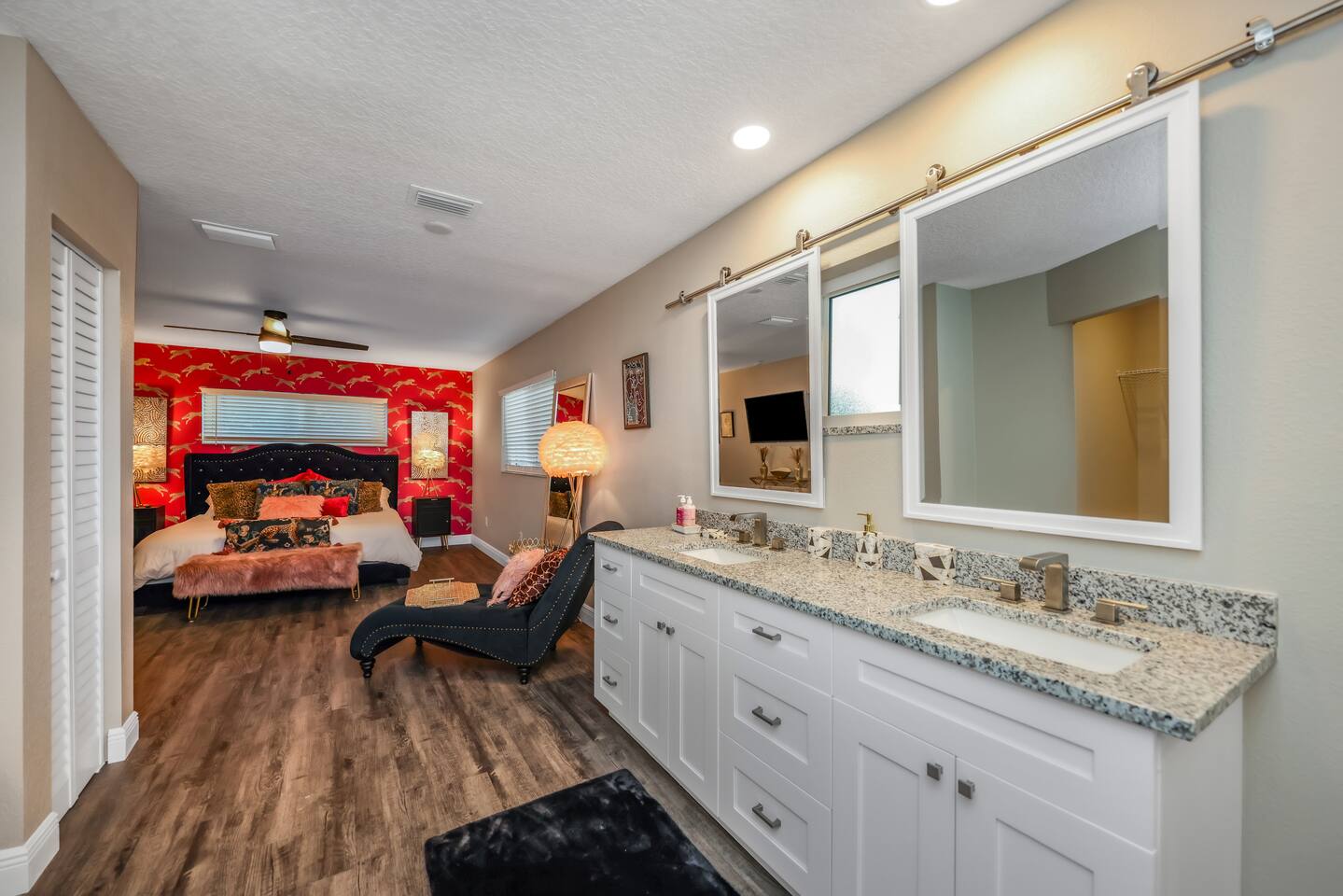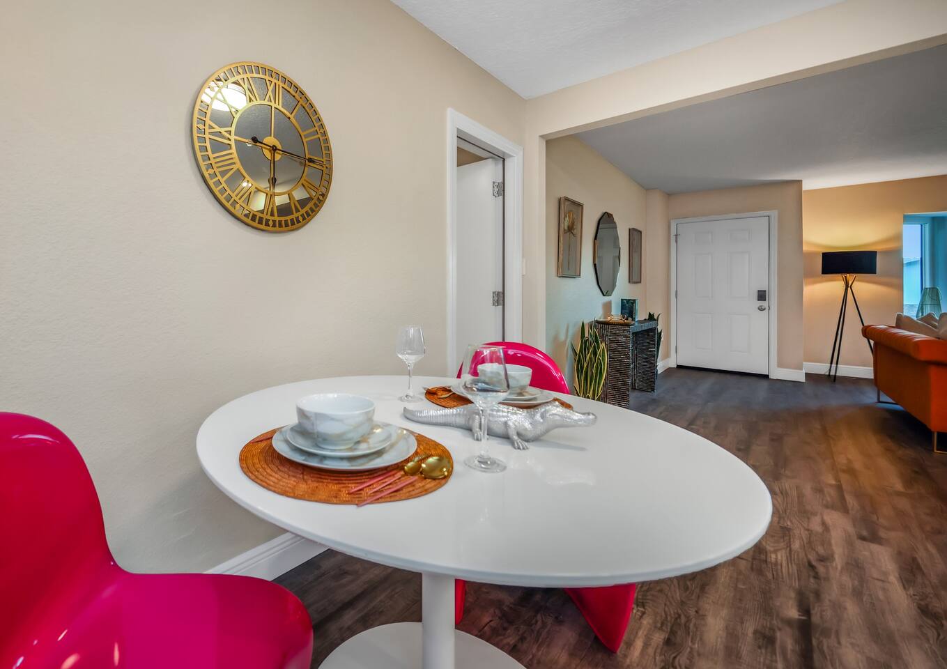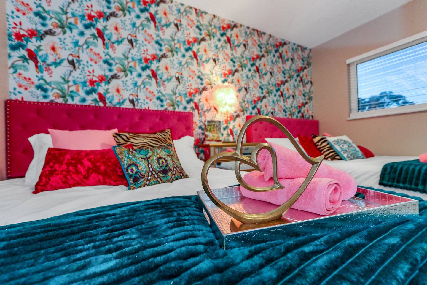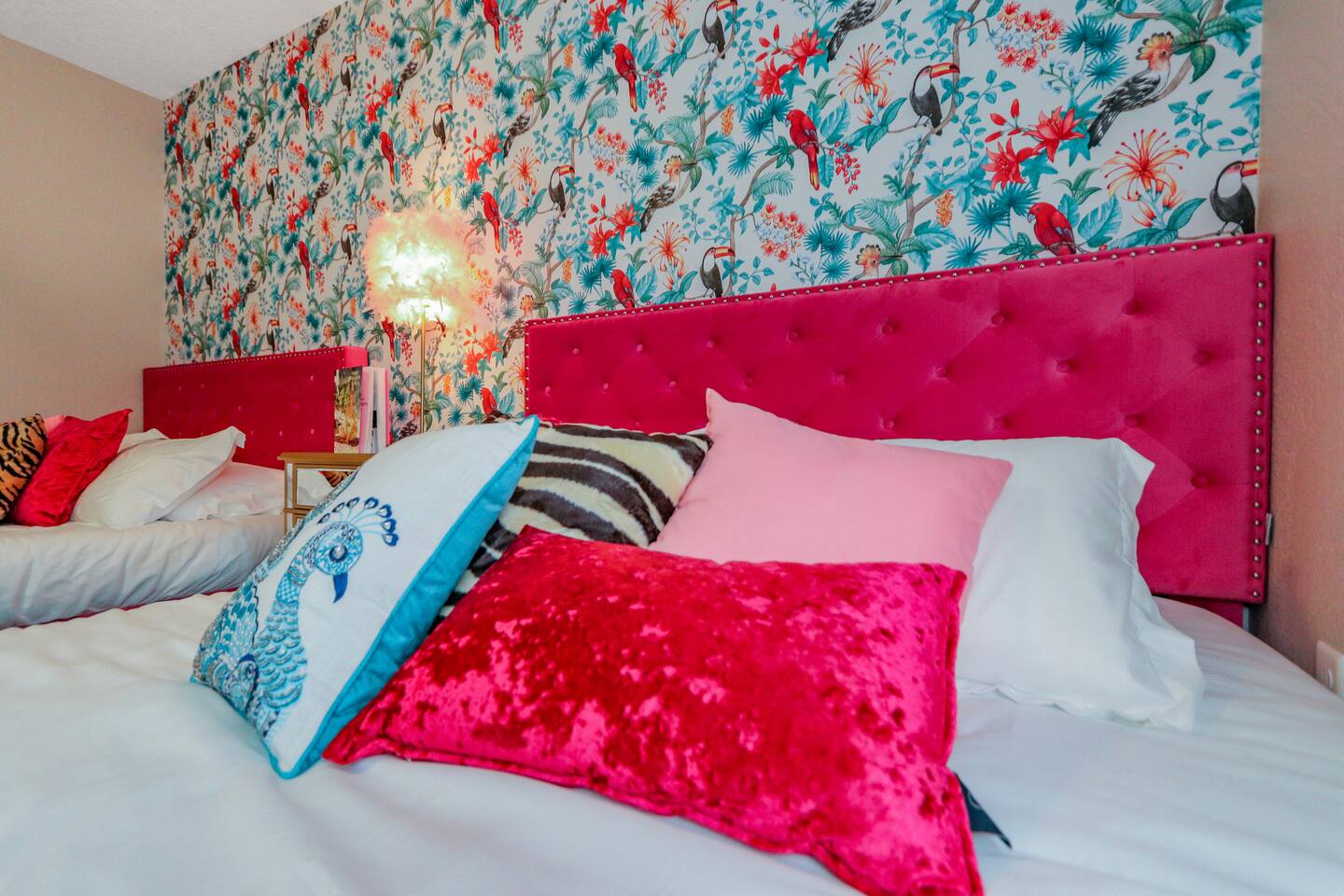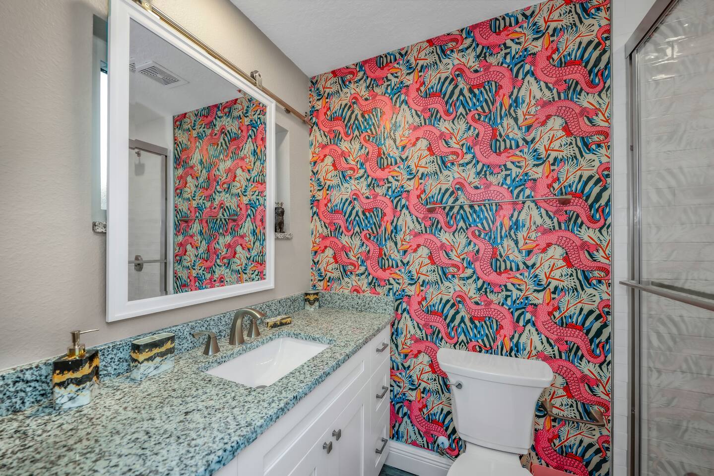 KEY FEATURES: ☀ Four large, extravagant bedrooms (1 king bed & 4 queen beds) ☀ Three modern, full bathrooms ☀ Modern, open concept kitchen with direct access to living areas ☀ Two living rooms with fun, vibrant murals! ☀ Large dining areas w/ seating for 10 (+ 2 bar seats) ☀ Large, fully fenced yard with heated pool (bring your fur babies!) ☀ Fun pool floaties, putting green, fire pit, and much more! ☀ Bonus game room! ☀ Ridiculous, over-the-top design throughout! Here Are A Few Kind Words From Our Past Guests: “This was a great place to stay! The morning light through the windows was so beautiful. Overall, just a relaxing experience. The hosts were super responsive whenever I had a question. I would stay again!” - Emily “Sabrina was very accommodating and communicative. the house is beautiful and very comfortable, close to nature hikes.” - Jennifer “This place was lovely! Exactly as pictured! Very clean and excellent host experience!!! I plan to come back again!” - Regina ☆☆ BEDROOMS ☆☆ Four large bedrooms, each with their own wild design! The master suite is a sight to be seen; completely separate wing of the house from the rest of the bedrooms, equipped with a king bed, smart TV, and opens up to the grand master ensuite bathroom, including tons of walk-in closet space! On the other end of the home, you will find the remaining three bedrooms. One of the most extravagant rooms in the house is one of the secondary bedrooms, with a queen bed dressed in white feathers. Completely ridiculous! A room this outrageous MUST have its own private bathroom, which is does! Right across the hall is the third bedroom, with another queen bed. Next up is the fourth and final bedroom, with two queen beds. These last two rooms share a bathroom right down the same hallway. ☆☆ BATHROOMS ☆☆ Three full bathrooms are spread across this four bedroom home. The master ensuite is attached directly to the master bedroom, and has two sinks, one toilet, and a walk-in shower. The second bathroom is attached to one of the secondary bedrooms, and has one sink, toilet, and a walk-in shower. The third and final bathroom is shared between the two remaining bedrooms, and has one sink, toilet, and a shower/tub combo. ☆☆ KITCHEN & DINING ☆☆ Tons of open space in the kitchen/dining area! The brand new, modern kitchen comes with everything you will need to cook elaborate meals during your vacation, with brand new stainless steel appliances, ridiculous pink utensils and accent pieces, and a Keurig + coffee pods (yes, even this is pink). Opening up to the next room over, you will find the formal dining area, with a bright, fun mural and elaborate decor surrounding the room. This space can seat 8, with an adjacent bistro table to seat 2 more, plus a couple barstool seats in the kitchen. ☆☆ LIVING ROOMS ☆☆ Two living rooms in this home! You are greeted with the first formal living room as you enter the home, with lots of comfy seating and, of course, another bright mural to welcome you into our home. At the other end of the house is the second living area, with a smart TV, lots more comfy seating, and direct access to the backyard. ☆☆ GAME ROOM ☆☆ The garage has been transformed into a game room! Packed with entertainment, you will have your choice of pool table, ping pong, or darts, along with additional high-top table seating to enjoy a drink while hanging out with your friends and family in this cool bonus room. ☆☆ OUTDOOR SPACE ☆☆ Oh, the backyard. The true centerpiece of this home! Elaborate, yet classy, you will most likely find yourself out in the backyard for the duration of your stay. Tons of seating (whether it be outdoor dining or lounging on the couches), heated pool (upon request - additional fee required), putting green, and a fire pit (wood burning)! What else could you possibly ask for? We created this space to provide you with the perfect beach vacation destination home. When not hanging out just minutes away at Clearwater Beach, you will certainly find yourself occupied by the amenities that we offer here! ★☆ Book Now & Let Us Take Care Of You In Clearwater! ☆★