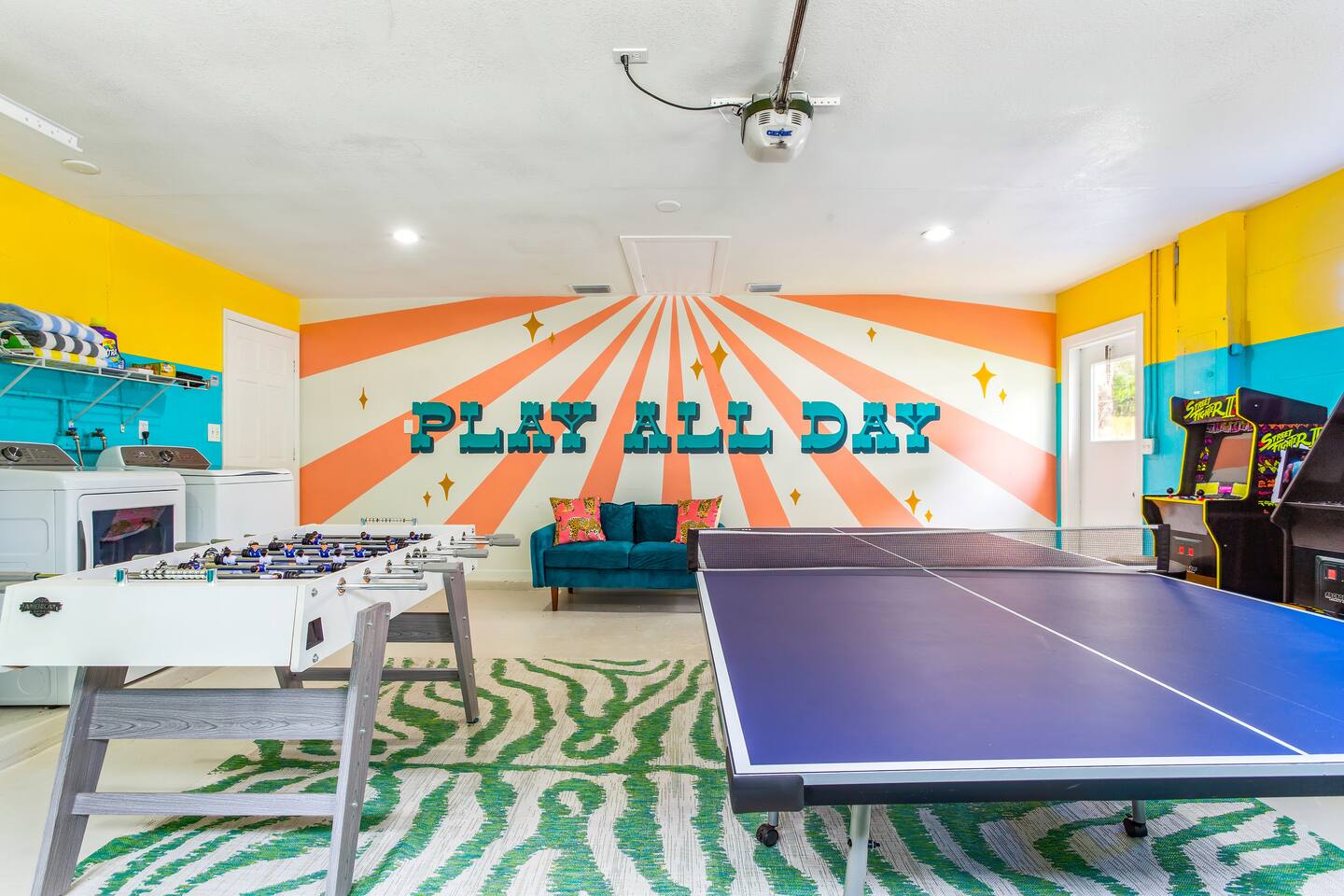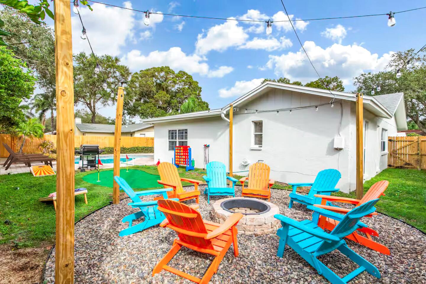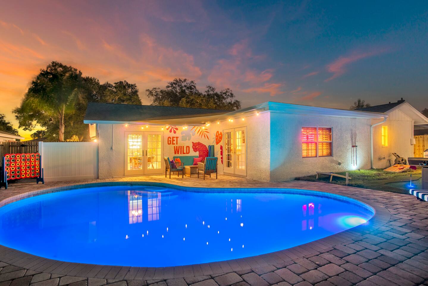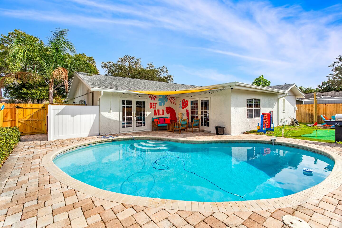 KEY FEATURES: ☀ Four spacious bedrooms; 1 king, 1 queen, & 4 full beds (two bunks) ☀ Two full bathrooms ☀ Open, modern kitchen with all the cooking essentials ☀ Bright dining room with seating for 12 (+ breakfast nook) ☀ Vibrant living room with comfy seating & beautiful design ☀ Game room with pool table, smart TV, and additional seating ☀ Additional game room with ping pong, foosball, and arcade games ☀ Fully-fenced backyard, loaded with amenities! (Heated pool, fire pit, mini golf, & more) Here Are A Few Kind Words From Our Past Guests: “This was a great place to stay! The morning light through the windows was so beautiful. Overall, just a relaxing experience. The hosts were super responsive whenever I had a question. I would stay again!” - Emily “Sabrina was very accommodating and communicative. the house is beautiful and very comfortable, close to nature hikes.” - Jennifer “This place was lovely! Exactly as pictured! Very clean and excellent host experience!!! I plan to come back again!” - Regina ☆☆ BEDROOMS ☆☆ There are four bedrooms spread across this home. The master bedroom has a king bed, while the second bedroom has a queen bed. The two remaining bedrooms have a full-over-full bunk bed in each. Every bedroom is masterfully designed to carry the tropical circus theme throughout! ☆☆ BATHROOMS ☆☆ This home has two full bathrooms. The first bathroom has a sink, toilet, and walk-in shower only, while the second bathroom has a sink, toilet, and shower/tub combo. ☆☆ KITCHEN & DINING ☆☆ The kitchen is bright & open, with new, stainless steel appliances (including a coffee station with a Keurig & coffee pods). This space opens up on both sides to the rest of the main living areas. Right across from the kitchen is the formal dining room, with enough seating to comfortably accommodate 12 (plus a breakfast nook). ☆☆ LIVING ROOM ☆☆ As you walk into the home, you'll be greeted with the living room. This space is beautifully crafted to reflect the beach-circus theme that is vibrant throughout the entire home. You'll be amazed by the big sectional couch, additional seating, and a smart TV. A great, cozy space for movie nights with your family & friends! ☆☆ GAME ROOMS ☆☆ Right across from the rest of the main living area is the first game room, equipped with a pool table, smart TV, and more seating options. This space is truly one of the centerpieces of the home. The garage has been converted into a second game room, with even more games and an additional space to hang out! Ping pong, foosball, arcade games and some additional seating makes this game room a great addition to the rest of the entertainment you'll find in this home! Even the breakfast nook doubles as some more entertainment! The hard-top table in this nook can be removed to reveal a poker table, with enough seating for 5! ☆☆ OUTDOOR SPACE ☆☆ This backyard is unbelievable; it'll take your breath away! ☀ Heated pool ☀ Mini golf ☀ Fire pit (wood burning) ☀ Corn hole ☀ Giant Jenga ☀ Giant Connect 4 ☀ Sun lounging chairs ☀ BBQ grill ☀ Additional lounge seating Total privacy & so much to do in this backyard will make this the perfect spot to stay entertained, whether you plan to use this home as a spot to relax after a day at the beach, or spend your entire vacation here at home! ★☆ Book Now & Let Us Take Care Of You In Seminole! ☆★