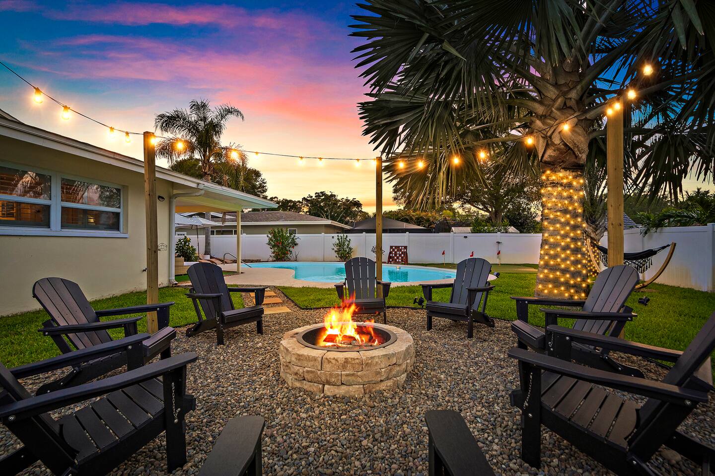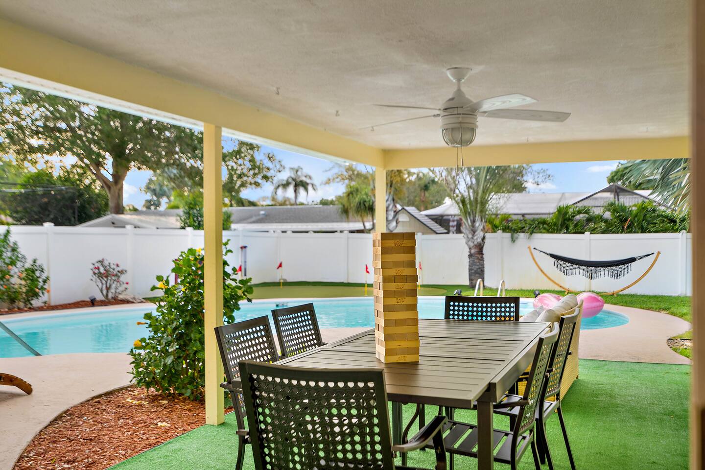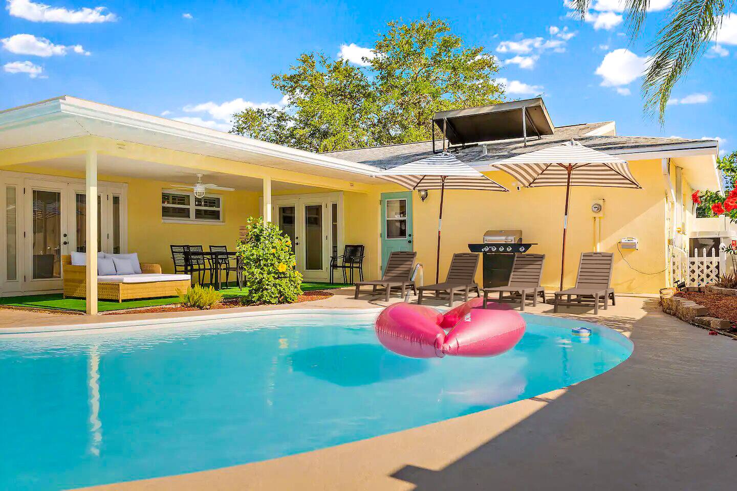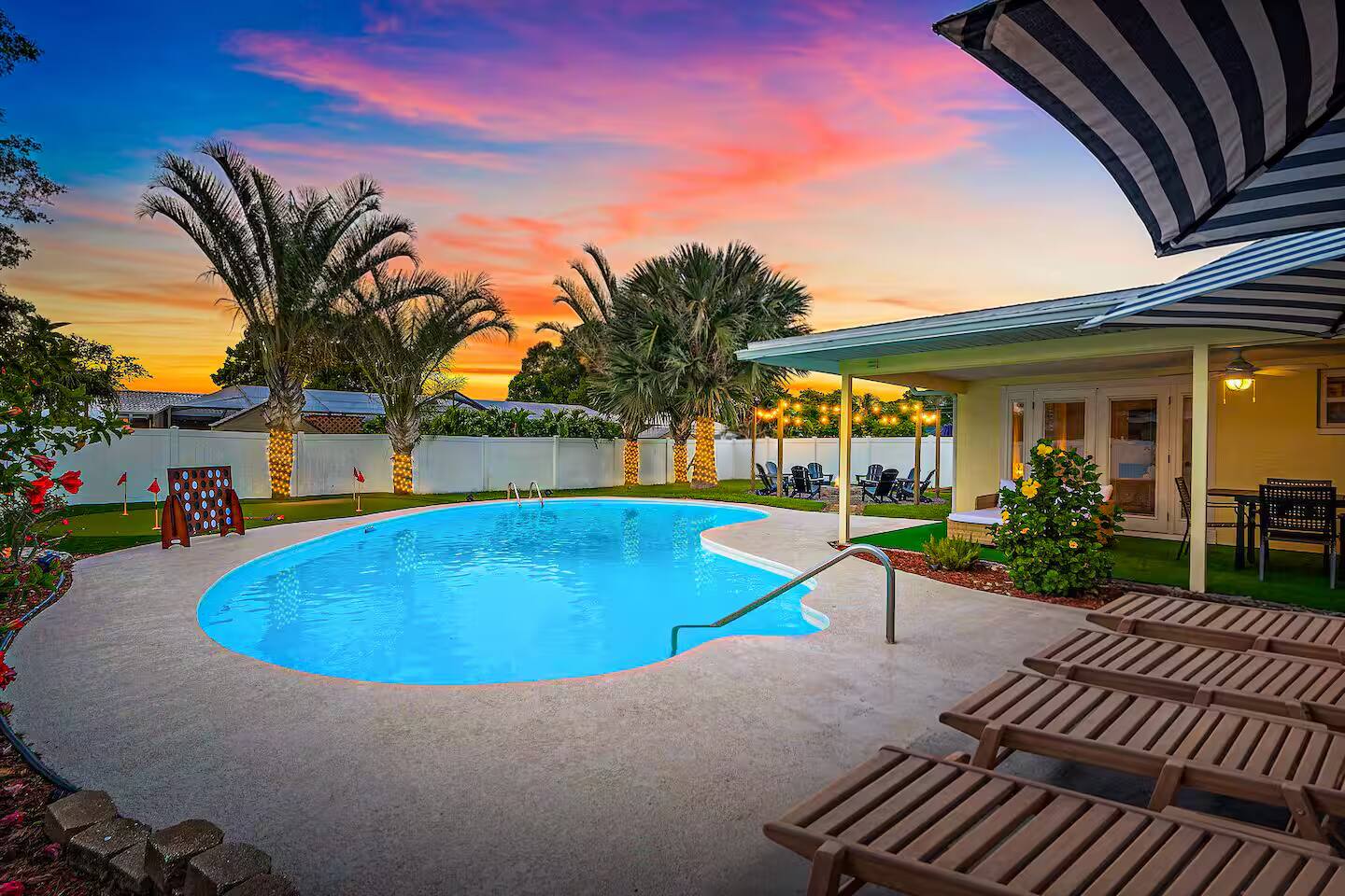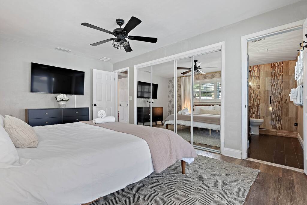 KEY FEATURES: ☀ 4 beautiful bedrooms; 1 king, 2 queens, 1 full, & 2 twin beds ☀ 2 full bathrooms ☀ Modern kitchen with new, stainless steel appliances ☀ Open living room with lots of comfy seating & smart TV ☀ Dining room with seating to comfortably accommodate 10 (+ 3 countertop seats) ☀ Fun game room with pool table, ping pong, & more ☀ Private oasis in the backyard, with heated pool, mini golf, fire pit, and much more! Here Are A Few Kind Words From Our Past Guests: “This was a great place to stay! The morning light through the windows was so beautiful. Overall, just a relaxing experience. The hosts were super responsive whenever I had a question. I would stay again!” - Emily “Sabrina was very accommodating and communicative. the house is beautiful and very comfortable, close to nature hikes.” - Jennifer “This place was lovely! Exactly as pictured! Very clean and excellent host experience!!! I plan to come back again!” - Regina ☆☆ BEDROOMS ☆☆ You'll find 4 stylish, comfy bedrooms in this home. The master bedroom is equipped with a king bed, smart TV, direct access to the backyard, and a private ensuite bathroom. Down the hall, the next two bedrooms have one queen bed in each, while the fourth bedroom has a twin-over-full bunk bed w/ a twin trundle bed underneath. ☆☆ BATHROOMS ☆☆ There are two full bathrooms in this home. The private master ensuite has a sink, toilet, and walk-in shower. The hallway bathroom has a sink, toilet, and shower/tub combo. ☆☆ KITCHEN & DINING ☆☆ The modern kitchen is located right off of the main living areas, and is loaded with all new stainless steel appliances & a coffee station (including a Keurig & coffee pods). The dining room is right next to the kitchen, with enough seating to comfortably fit 10 people, along with 3 more countertop seats in the kitchen. On top of that, the dining table unfolds to reveal a poker table! ☆☆ LIVING ROOM ☆☆ In the living room, you’ll be greeted with lots of comfy seating, a big smart TV, private workspace, and beautiful design throughout. This is the perfect spot to host your movie nights & games with your friends and family! ☆☆ GAME ROOM ☆☆ Keep your family and friends entertained throughout your stay in our amenity-filled game room! Pool table, ping pong, arcade games, smart TV, & lots of seating. Whether your reason for staying is to explore the town or stay at home and relax, this place will be the perfect spot to unwind! ☆☆ OUTDOOR SPACE ☆☆ This backyard is everything you could ask for, and more! ☀ Heated pool ☀ Mini golf ☀ Fire pit ☀ Corn hole ☀ Giant Connect 4 ☀ Giant Jenga ☀ BBQ grill ☀ Sun lounging chairs ☀ Covered outdoor lounge seating ☀ Covered outdoor dining There is so much to do here, that all of your friends & family will be thoroughly entertained throughout your entire stay. No matter the season, this backyard has it all. Book your stay with us today and you will NOT be disappointed. Get ready for a vacation you will never forget! ★☆ Book Now & Let Us Take Care Of You In Clearwater! ☆★