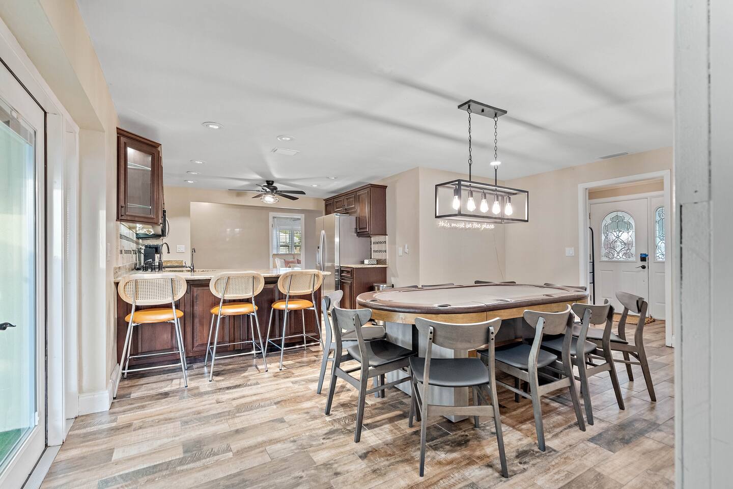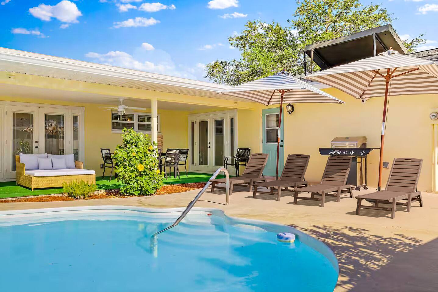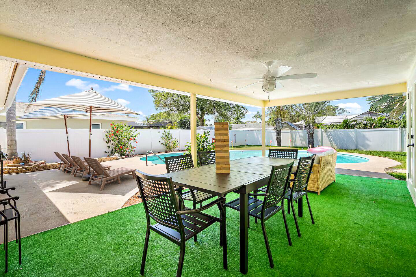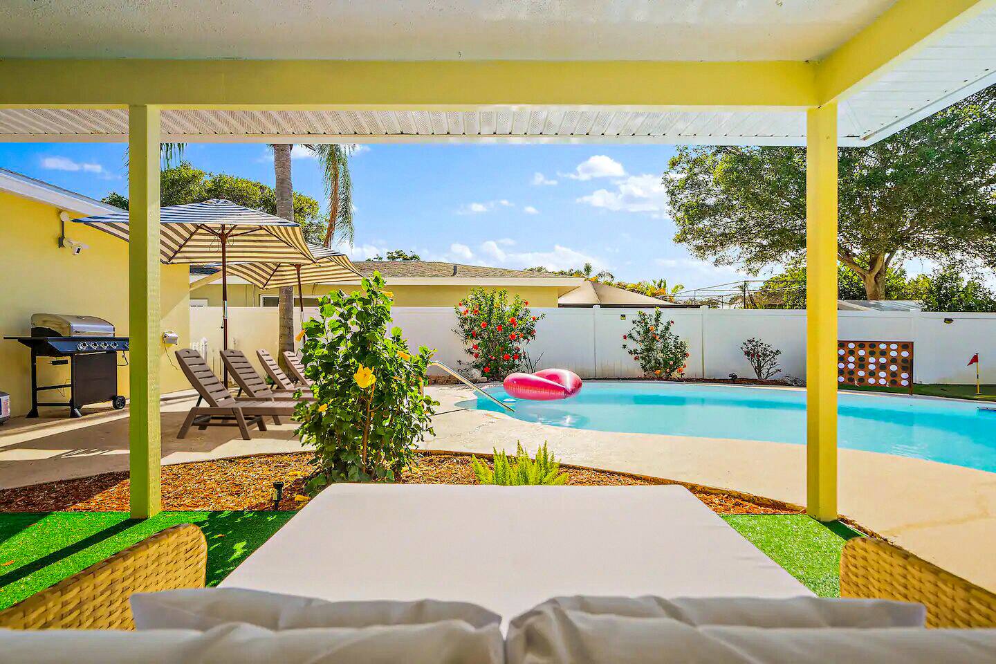 KEY FEATURES: ☀ 4 beautiful bedrooms; 1 king, 2 queens, 1 full, & 2 twin beds ☀ 2 full bathrooms ☀ Modern kitchen with new, stainless steel appliances ☀ Open living room with lots of comfy seating & smart TV ☀ Dining room with seating to comfortably accommodate 10 (+ 3 countertop seats) ☀ Fun game room with pool table, ping pong, & more ☀ Private oasis in the backyard, with heated pool, mini golf, fire pit, and much more! Here Are A Few Kind Words From Our Past Guests: “This was a great place to stay! The morning light through the windows was so beautiful. Overall, just a relaxing experience. The hosts were super responsive whenever I had a question. I would stay again!” - Emily “Sabrina was very accommodating and communicative. the house is beautiful and very comfortable, close to nature hikes.” - Jennifer “This place was lovely! Exactly as pictured! Very clean and excellent host experience!!! I plan to come back again!” - Regina ☆☆ BEDROOMS ☆☆ You'll find 4 stylish, comfy bedrooms in this home. The master bedroom is equipped with a king bed, smart TV, direct access to the backyard, and a private ensuite bathroom. Down the hall, the next two bedrooms have one queen bed in each, while the fourth bedroom has a twin-over-full bunk bed w/ a twin trundle bed underneath. ☆☆ BATHROOMS ☆☆ There are two full bathrooms in this home. The private master ensuite has a sink, toilet, and walk-in shower. The hallway bathroom has a sink, toilet, and shower/tub combo. ☆☆ KITCHEN & DINING ☆☆ The modern kitchen is located right off of the main living areas, and is loaded with all new stainless steel appliances & a coffee station (including a Keurig & coffee pods). The dining room is right next to the kitchen, with enough seating to comfortably fit 10 people, along with 3 more countertop seats in the kitchen. On top of that, the dining table unfolds to reveal a poker table! ☆☆ LIVING ROOM ☆☆ In the living room, you’ll be greeted with lots of comfy seating, a big smart TV, private workspace, and beautiful design throughout. This is the perfect spot to host your movie nights & games with your friends and family! ☆☆ GAME ROOM ☆☆ Keep your family and friends entertained throughout your stay in our amenity-filled game room! Pool table, ping pong, arcade games, smart TV, & lots of seating. Whether your reason for staying is to explore the town or stay at home and relax, this place will be the perfect spot to unwind! ☆☆ OUTDOOR SPACE ☆☆ This backyard is everything you could ask for, and more! ☀ Heated pool ☀ Mini golf ☀ Fire pit ☀ Corn hole ☀ Giant Connect 4 ☀ Giant Jenga ☀ BBQ grill ☀ Sun lounging chairs ☀ Covered outdoor lounge seating ☀ Covered outdoor dining There is so much to do here, that all of your friends & family will be thoroughly entertained throughout your entire stay. No matter the season, this backyard has it all. Book your stay with us today and you will NOT be disappointed. Get ready for a vacation you will never forget! ★☆ Book Now & Let Us Take Care Of You In Clearwater! ☆★
