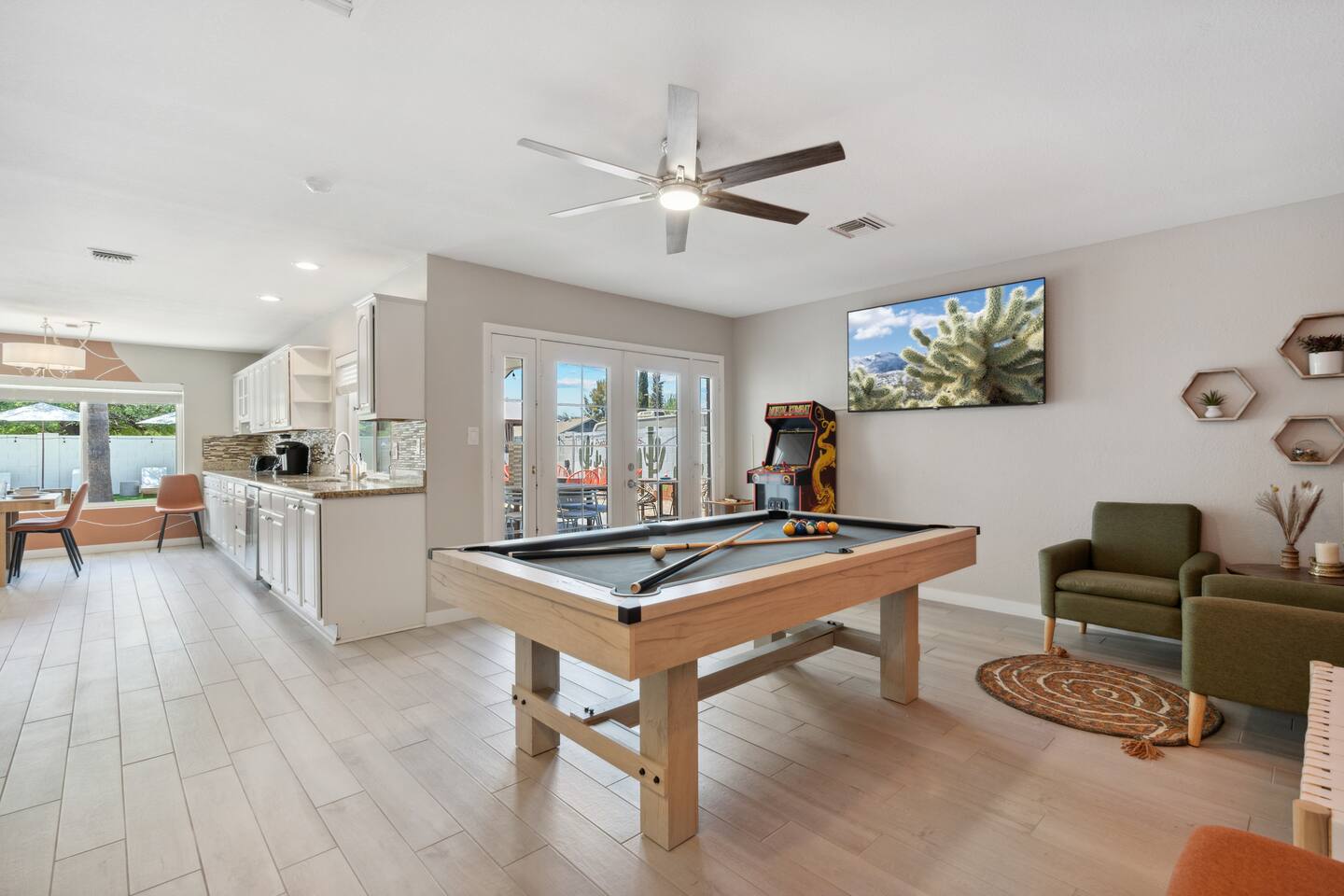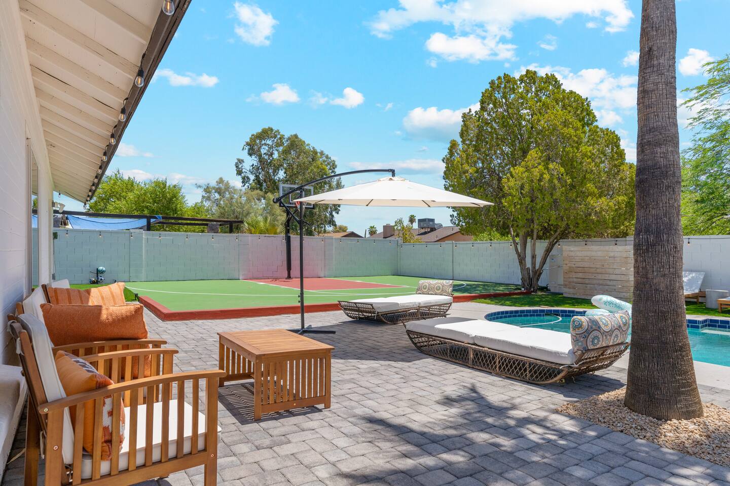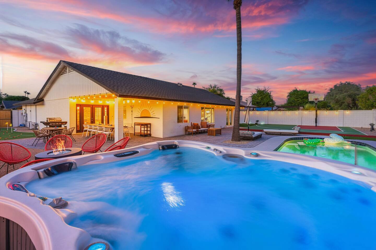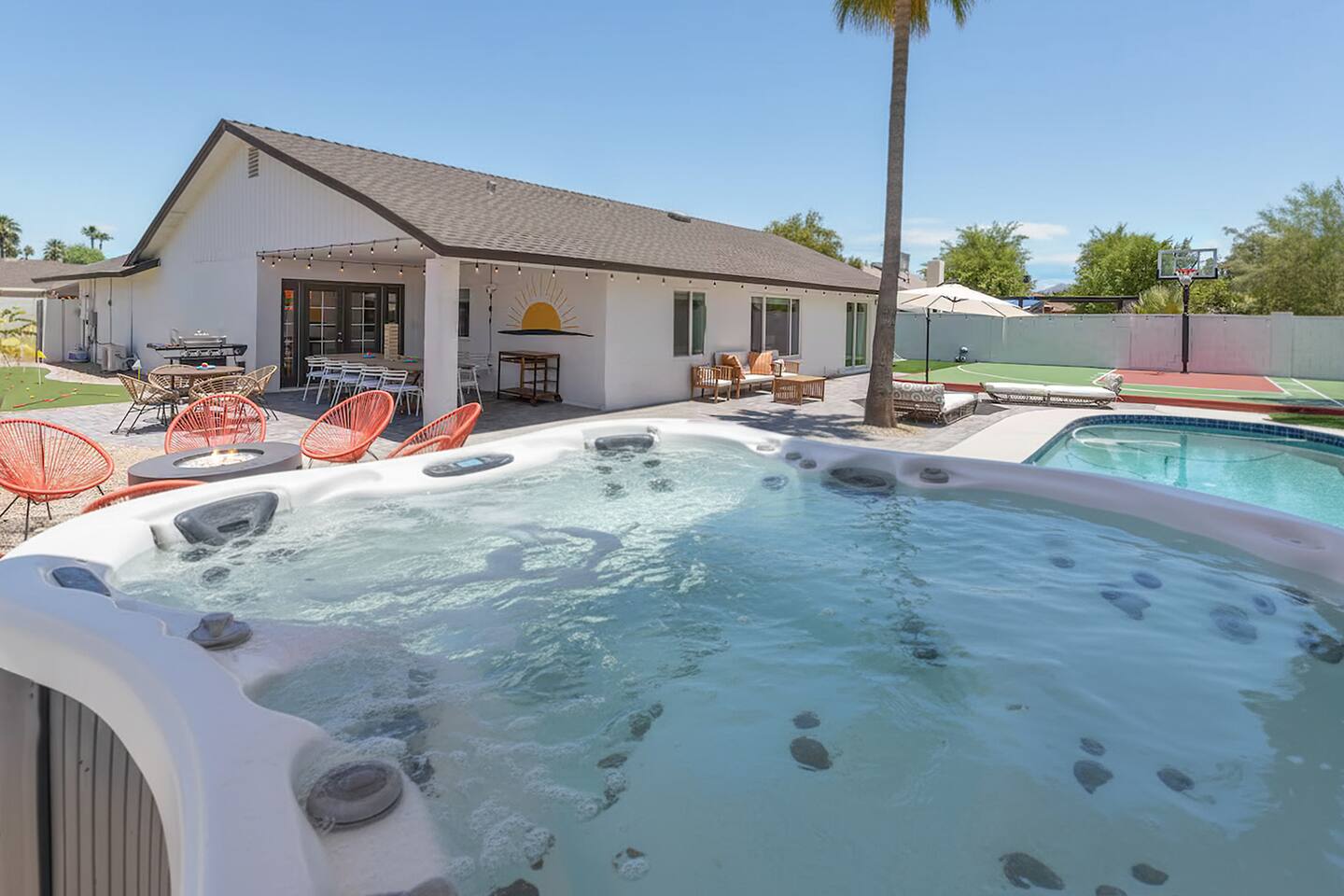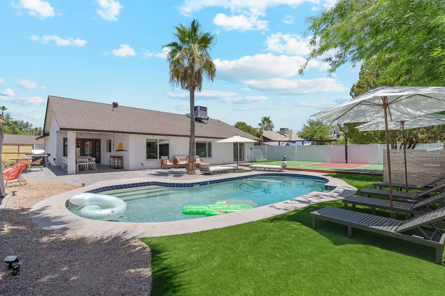 KEY FEATURES: ☀ 5 beautiful bedrooms 4 queens, 2 fulls, 3 twins, & 1 trundle bed ☀ 2 full bathrooms ☀ Modern kitchen with new, stainless steel appliances ☀ Open living room with lots of comfy seating & smart TV ☀ Dining room with seating to comfortably accommodate 12 ☀ Fun game room with pool table, arcade games, & smart TV ☀ AMAZING backyard; heated pool, hot tub, basketball, mini golf, and much more! Here Are A Few Kind Words From Our Past Guests: “This was a great place to stay! The morning light through the windows was so beautiful. Overall, just a relaxing experience. The hosts were super responsive whenever I had a question. I would stay again!” - Emily “Sabrina was very accommodating and communicative. the house is beautiful and very comfortable, close to nature hikes.” - Jennifer “This place was lovely! Exactly as pictured! Very clean and excellent host experience!!! I plan to come back again!” - Regina ☆☆ BEDROOMS ☆☆ This home has 5 gorgeous bedrooms. The master bedroom has a queen bed, smart TV, direct access to the backyard, and a private attached ensuite bathroom. Down the hall, there are two more bedrooms with 1 queen bed in each, and a fourth bedroom with a twin-over-full bunk bed. On the other end of the home is the largest bedroom, equipped with a queen, full, 2 twins, & a trundle bed, along with some comfy lounge seating, smart TV, and games! ☆☆ BATHROOMS ☆☆ There are two full bathrooms in this home. The master ensuite bathroom has a sink, toilet, and shower/tub combo. The hallway bathroom also has a sink, toilet, and shower/tub combo. ☆☆ KITCHEN & DINING ☆☆ The modern kitchen is located right off of the main living areas, and is loaded with all new stainless steel appliances & a coffee station (including a Keurig & coffee pods). The dining room is right next to the kitchen, with enough seating to comfortably fit 12 people. ☆☆ LIVING ROOM ☆☆ In the living room, you’ll be greeted with lots of comfy seating, a big smart TV, beautiful design, and lots of natural light with views of the resort-style backyard. This is the perfect spot to host your movie nights & games with your friends and family! ☆☆ GAME ROOM ☆☆ Keep your family and friends entertained throughout your stay in our amenity-filled game room! Pool table, arcade games, board games, card games, and a smart TV. Whether your reason for staying is to explore the town or stay at home and relax, this place will be the perfect spot to unwind! ☆☆ OUTDOOR SPACE ☆☆ This backyard is everything you could ask for, and more! ☀ Heated pool ☀ Hot tub ☀ Basketball court ☀ Mini golf ☀ Corn hole ☀ Fire pit ☀ Giant Jenga ☀ Giant Connect 4 ☀ BBQ grill ☀ Outdoor lounge seating ☀ Sun bathing chairs ☀ Covered outdoor dining There is so much to do here, that all of your friends & family will be thoroughly entertained throughout your entire stay. No matter the season, this backyard has it all. Book your stay with us today and you will NOT be disappointed. Get ready for a vacation you will never forget! ★☆ Book Now & Let Us Take Care Of You In Scottsdale! ☆★