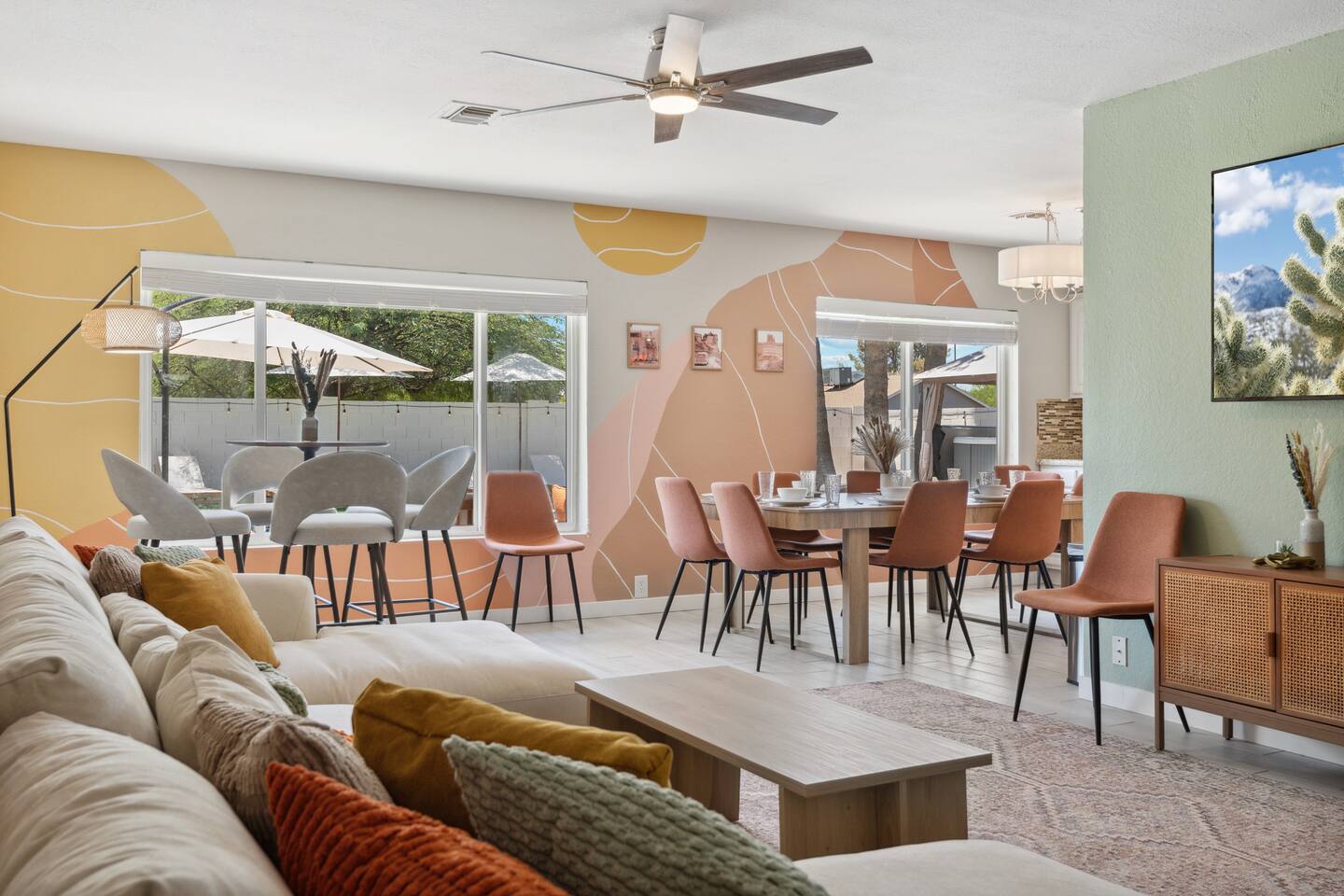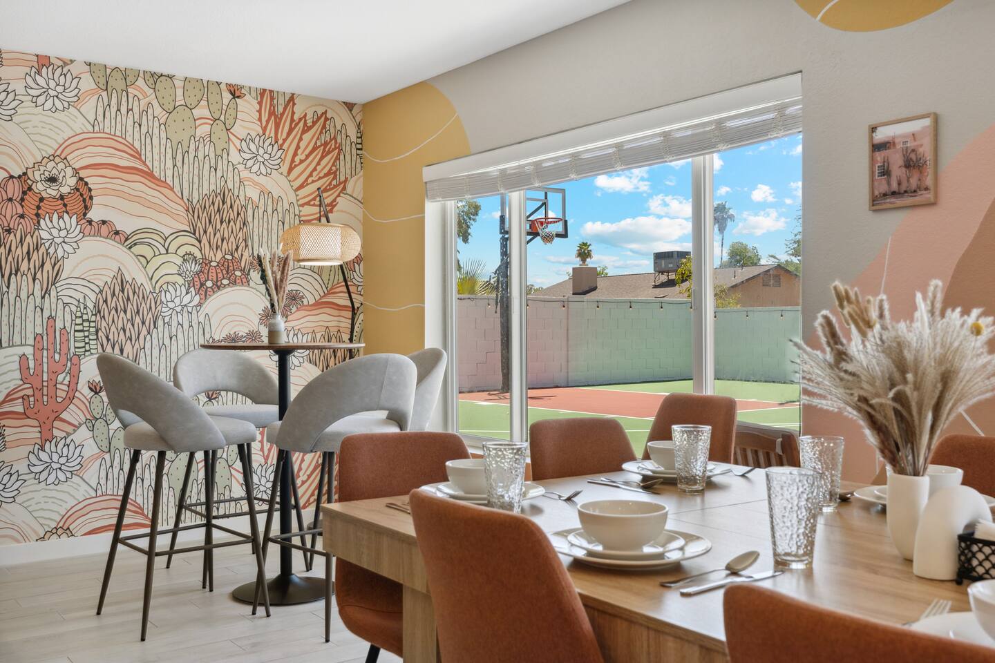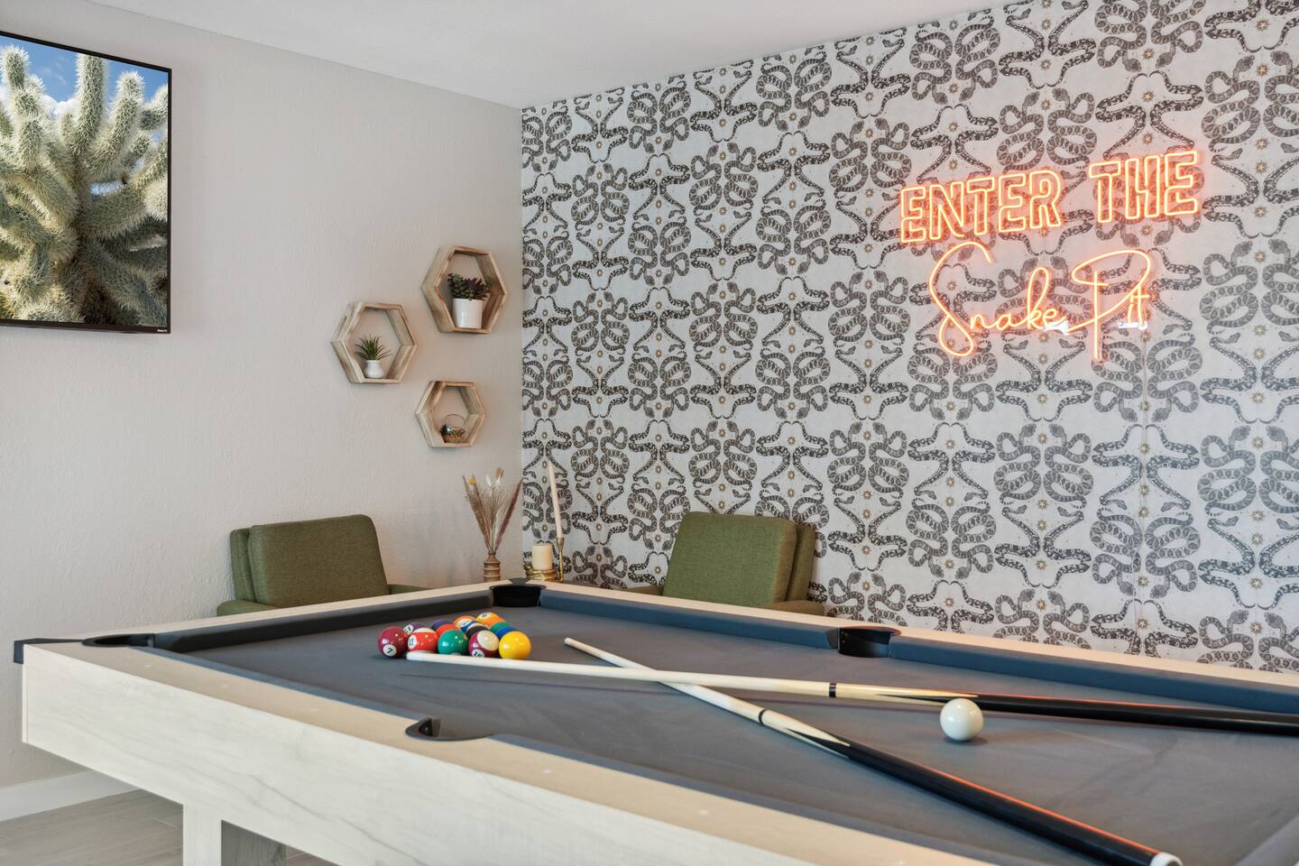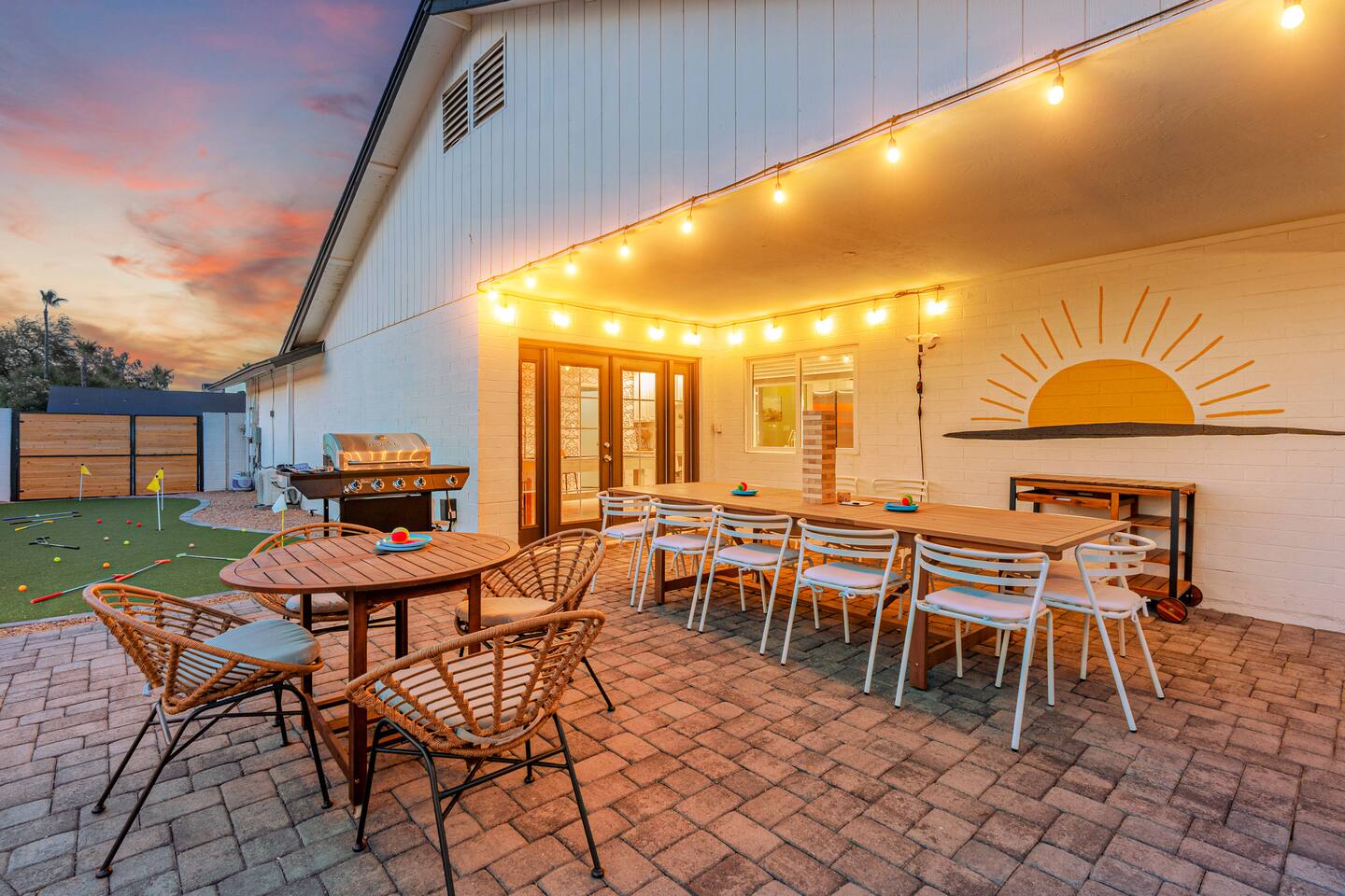 KEY FEATURES: ☀ 5 beautiful bedrooms 4 queens, 2 fulls, 3 twins, & 1 trundle bed ☀ 2 full bathrooms ☀ Modern kitchen with new, stainless steel appliances ☀ Open living room with lots of comfy seating & smart TV ☀ Dining room with seating to comfortably accommodate 12 ☀ Fun game room with pool table, arcade games, & smart TV ☀ AMAZING backyard; heated pool, hot tub, basketball, mini golf, and much more! Here Are A Few Kind Words From Our Past Guests: “This was a great place to stay! The morning light through the windows was so beautiful. Overall, just a relaxing experience. The hosts were super responsive whenever I had a question. I would stay again!” - Emily “Sabrina was very accommodating and communicative. the house is beautiful and very comfortable, close to nature hikes.” - Jennifer “This place was lovely! Exactly as pictured! Very clean and excellent host experience!!! I plan to come back again!” - Regina ☆☆ BEDROOMS ☆☆ This home has 5 gorgeous bedrooms. The master bedroom has a queen bed, smart TV, direct access to the backyard, and a private attached ensuite bathroom. Down the hall, there are two more bedrooms with 1 queen bed in each, and a fourth bedroom with a twin-over-full bunk bed. On the other end of the home is the largest bedroom, equipped with a queen, full, 2 twins, & a trundle bed, along with some comfy lounge seating, smart TV, and games! ☆☆ BATHROOMS ☆☆ There are two full bathrooms in this home. The master ensuite bathroom has a sink, toilet, and shower/tub combo. The hallway bathroom also has a sink, toilet, and shower/tub combo. ☆☆ KITCHEN & DINING ☆☆ The modern kitchen is located right off of the main living areas, and is loaded with all new stainless steel appliances & a coffee station (including a Keurig & coffee pods). The dining room is right next to the kitchen, with enough seating to comfortably fit 12 people. ☆☆ LIVING ROOM ☆☆ In the living room, you’ll be greeted with lots of comfy seating, a big smart TV, beautiful design, and lots of natural light with views of the resort-style backyard. This is the perfect spot to host your movie nights & games with your friends and family! ☆☆ GAME ROOM ☆☆ Keep your family and friends entertained throughout your stay in our amenity-filled game room! Pool table, arcade games, board games, card games, and a smart TV. Whether your reason for staying is to explore the town or stay at home and relax, this place will be the perfect spot to unwind! ☆☆ OUTDOOR SPACE ☆☆ This backyard is everything you could ask for, and more! ☀ Heated pool ☀ Hot tub ☀ Basketball court ☀ Mini golf ☀ Corn hole ☀ Fire pit ☀ Giant Jenga ☀ Giant Connect 4 ☀ BBQ grill ☀ Outdoor lounge seating ☀ Sun bathing chairs ☀ Covered outdoor dining There is so much to do here, that all of your friends & family will be thoroughly entertained throughout your entire stay. No matter the season, this backyard has it all. Book your stay with us today and you will NOT be disappointed. Get ready for a vacation you will never forget! ★☆ Book Now & Let Us Take Care Of You In Scottsdale! ☆★
