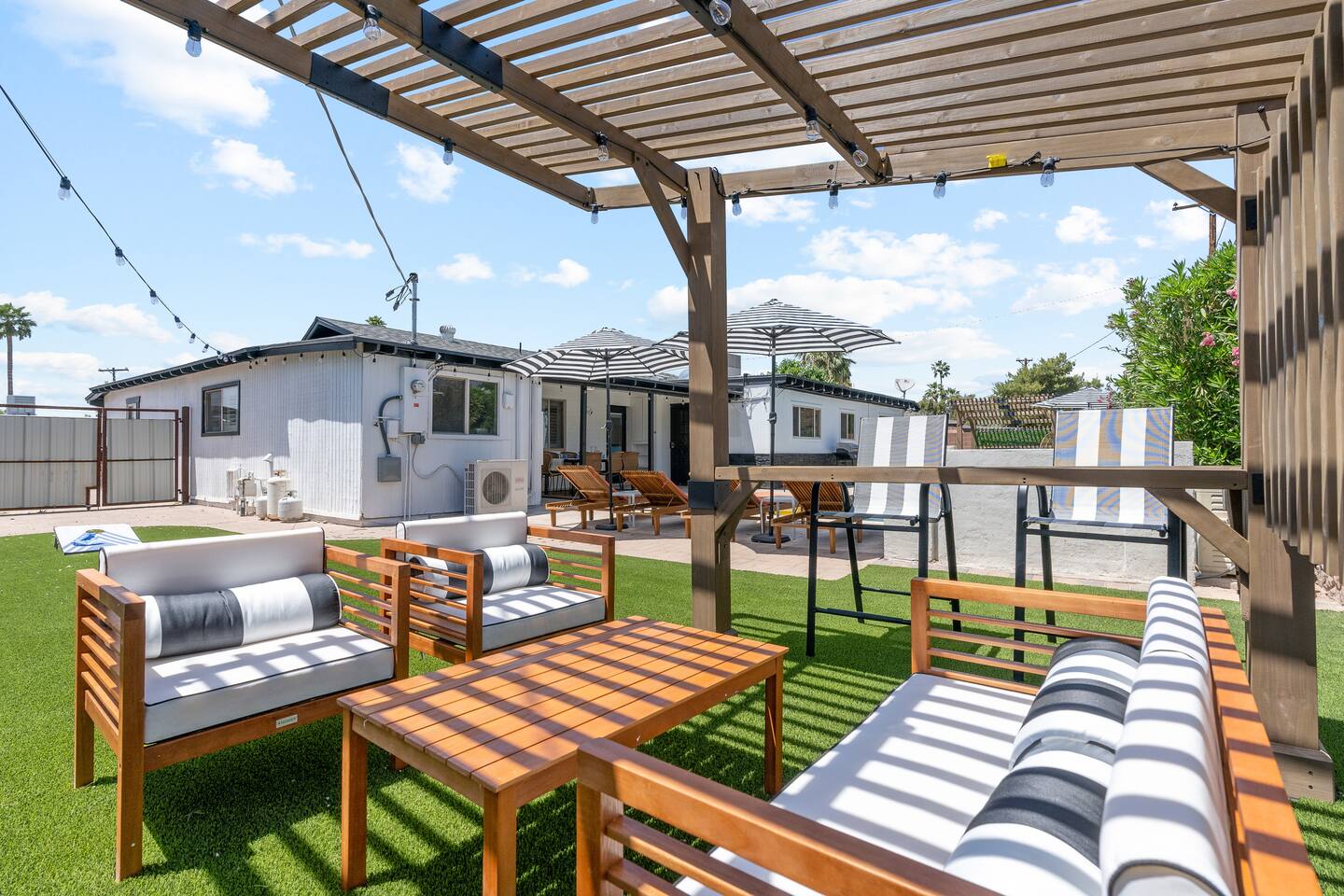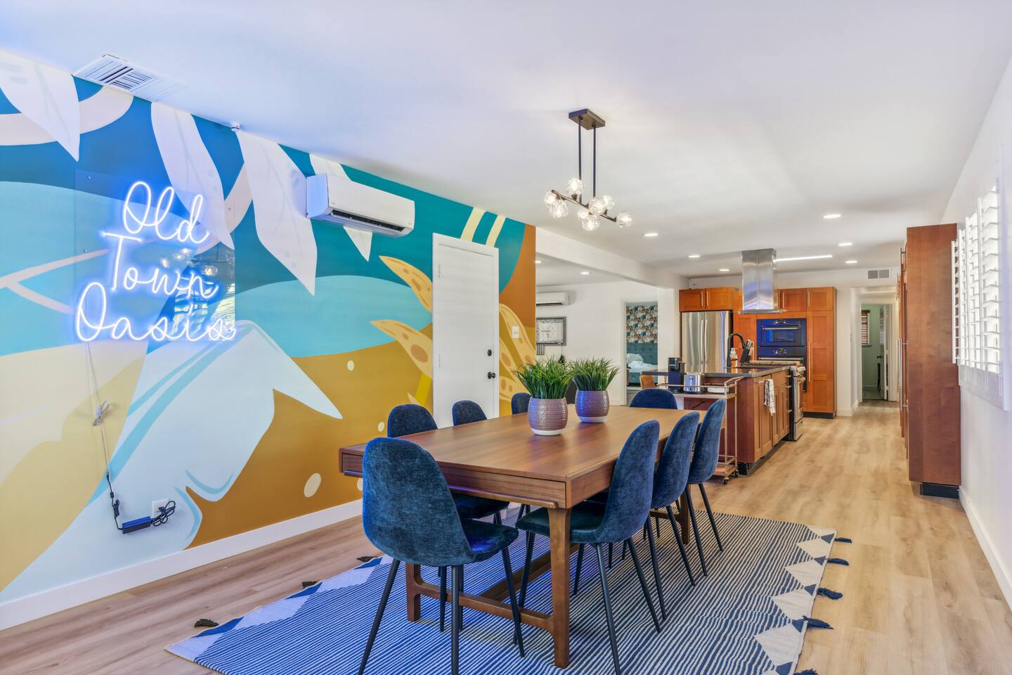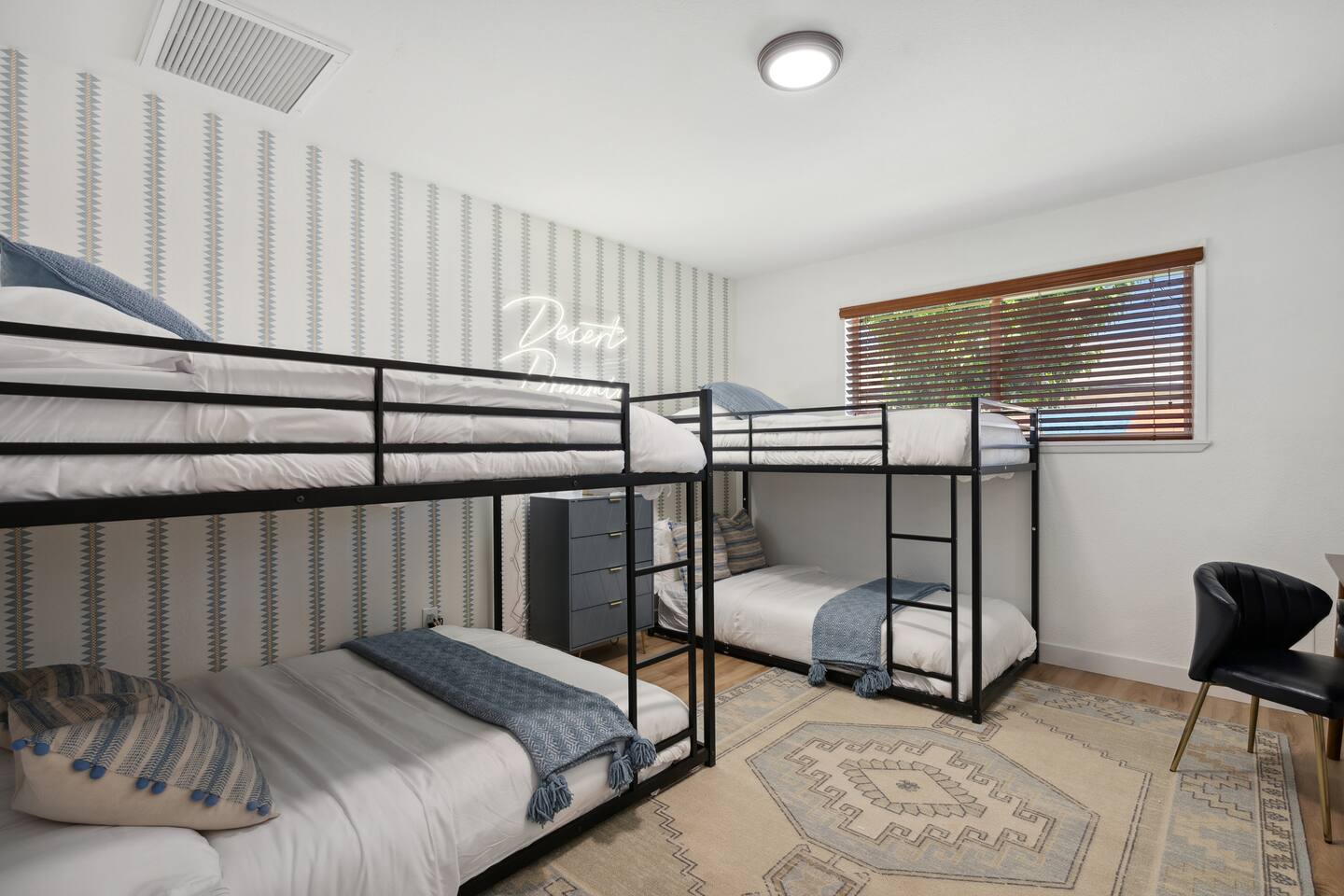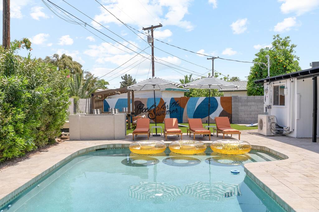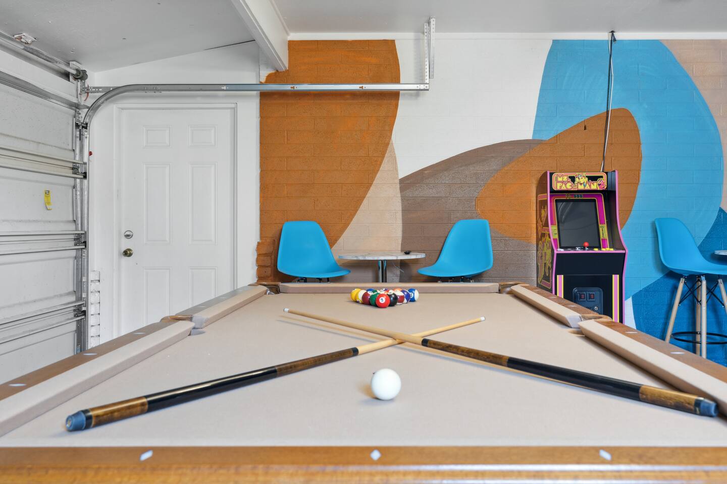 KEY FEATURES: ☀ 4 beautiful bedrooms; 1 king, 2 queens, 2 fulls (bunk), & 2 twins (bunk) ☀ 3 full bathrooms ☀ Modern, open kitchen with new appliances ☀ Great space for entertaining in the living room with lots of comfy seating & smart TV ☀ Dining room with seating to comfortably accommodate 8 (plus 4 countertop seats & outdoor dining) ☀ Fun, vibrant game room with pool table, foosball, arcade games, sauna, and more! ☀ AMAZING backyard, loaded with amenities!; heated pool, hot tub, mini golf, fire pit, and so much more! Here Are A Few Kind Words From Our Past Guests: “This was a great place to stay! The morning light through the windows was so beautiful. Overall, just a relaxing experience. The hosts were super responsive whenever I had a question. I would stay again!” - Emily “Sabrina was very accommodating and communicative. the house is beautiful and very comfortable, close to nature hikes.” - Jennifer “This place was lovely! Exactly as pictured! Very clean and excellent host experience!!! I plan to come back again!” - Regina ☆☆ BEDROOMS ☆☆ This home has four beautifully designed bedrooms. Right off of the main living space is the master bedroom, with a king bed, sitting area, smart TV, and private ensuite bathroom. On the other end of the open living area are the three remaining bedrooms. The next bedroom has a queen bed, private ensuite bathroom, and direct access to the amazing backyard. As you go down the hallway, you'll find the two remaining bedrooms; one with a king bed, the other with two bunk beds (two full beds & two twin beds). These last two bedrooms share one full bathroom, accessible from the hallway. ☆☆ BATHROOMS ☆☆ There are three full bathrooms in this home. The master ensuite bathroom is modern and luxurious, with a sink, toilet, and walk-in shower. The secondary bedroom's private ensuite bathroom also has a similar layout, with a sink, toilet, and walk-in shower. The third bathroom, which is accessible from the hallway, has a sink, toilet, and shower/tub combo. ☆☆ KITCHEN & DINING ☆☆ The modern kitchen is located right off of the main living areas, and is loaded with all the kitchen essentials & a coffee station (including a Keurig & coffee pods). It opens up to the rest of the living area, making this a great spot for entertaining! The dining room is right next to the kitchen, with enough seating to comfortably fit 8 people, plus 4 countertop seats in the kitchen & more dining options outside. ☆☆ LIVING ROOM ☆☆ In the living room, you’ll be greeted with lots of comfy seating, a big smart TV, and fun, vibrant design throughout! This is the perfect spot to host your movie nights & games with your friends and family, or to unwind together after exploring a night out in the town, or even just to relax after a full day of activities in the backyard! ☆☆ GAME ROOM ☆☆ Keep your family and friends entertained throughout your stay in our amenity-filled game room! Pool table, foosball, arcade games, sauna, high-top seating, and a smart TV. Whether your reason for staying is to explore the town or stay at home and relax, this place will be the perfect spot to enjoy! ☆☆ OUTDOOR SPACE ☆☆ This backyard is everything you could ask for, and more! ☀ Heated pool ☀ Hot tub (+ bar seating around hot tub; super cool!) ☀ Mini golf ☀ Fire pit ☀ Corn hole ☀ BBQ grill ☀ Sun lounging chairs ☀ Covered outdoor lounge seating ☀ Covered outdoor dining area There is so much to do here, that all of your friends & family will be thoroughly entertained throughout your entire stay. No matter the season, this backyard has it all. Book your stay with us today and you will NOT be disappointed. Get ready for a vacation you will never forget! ★☆ Book Now & Let Us Take Care Of You In Scottsdale! ☆★