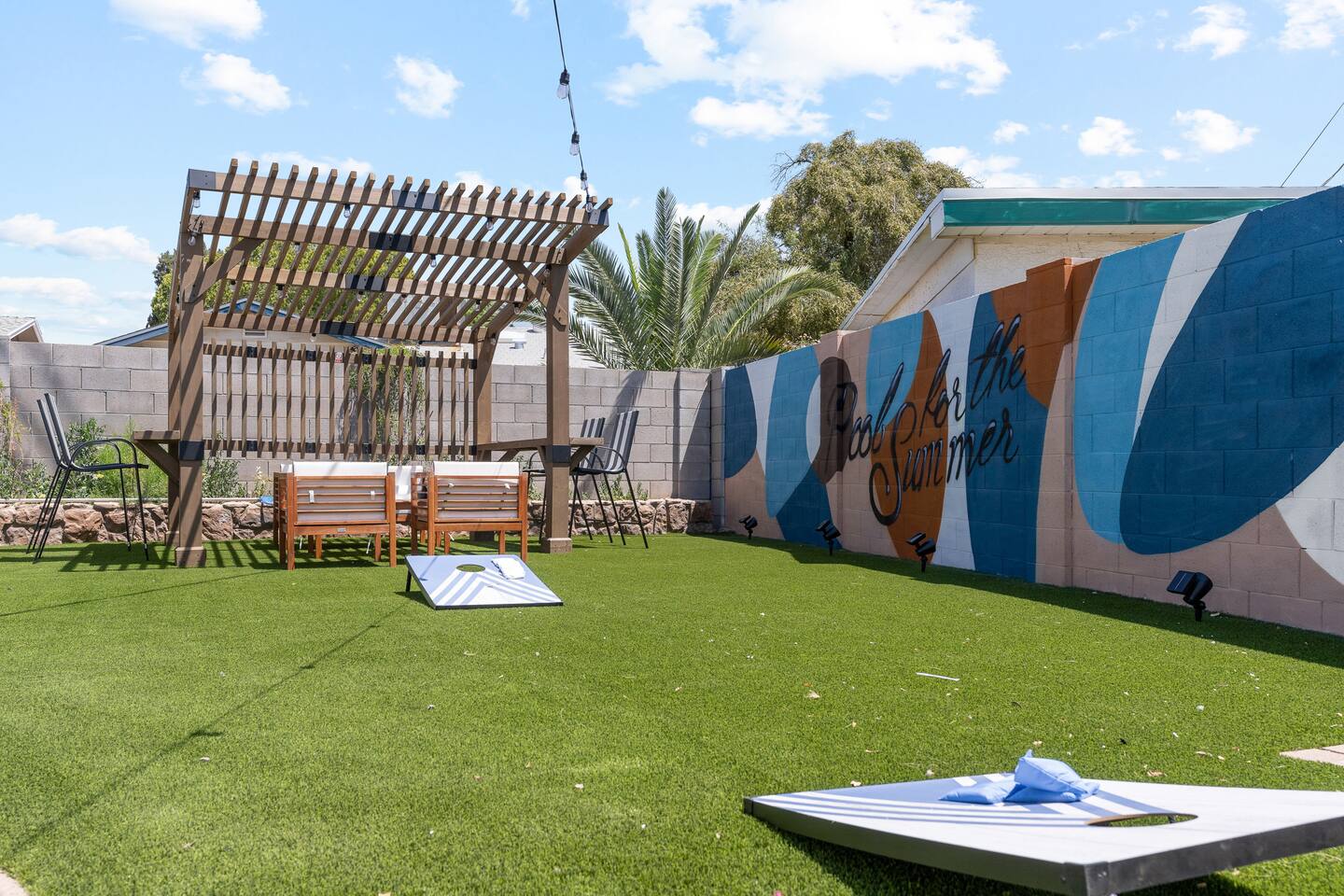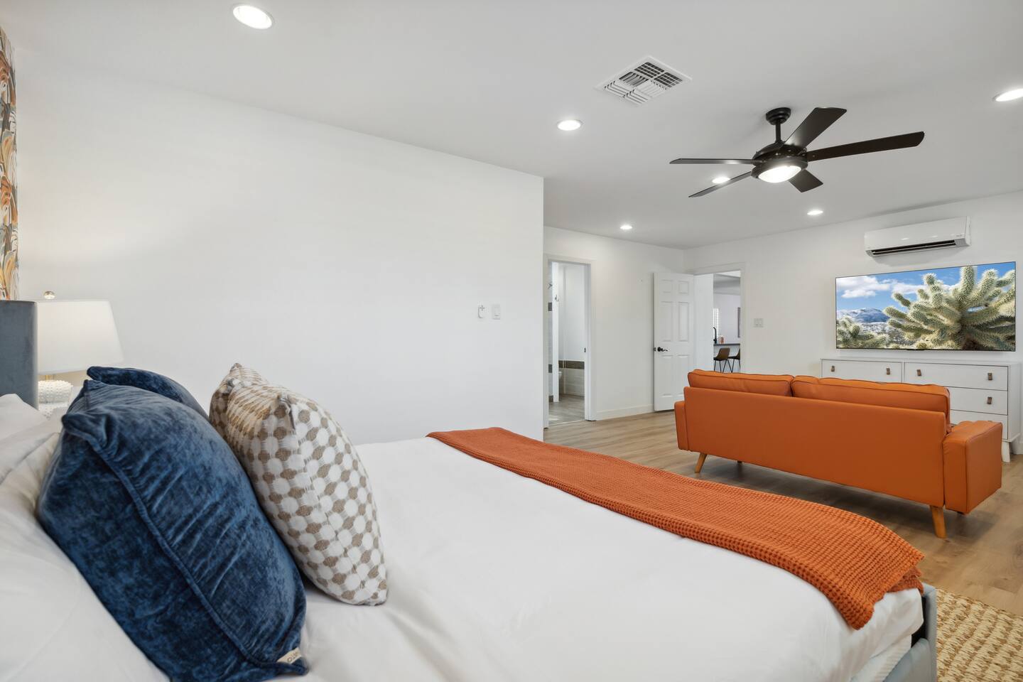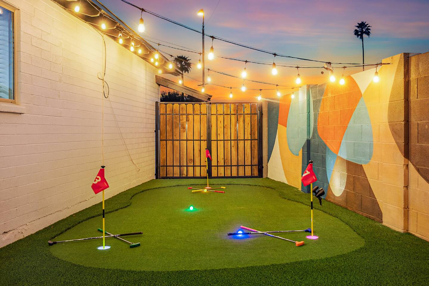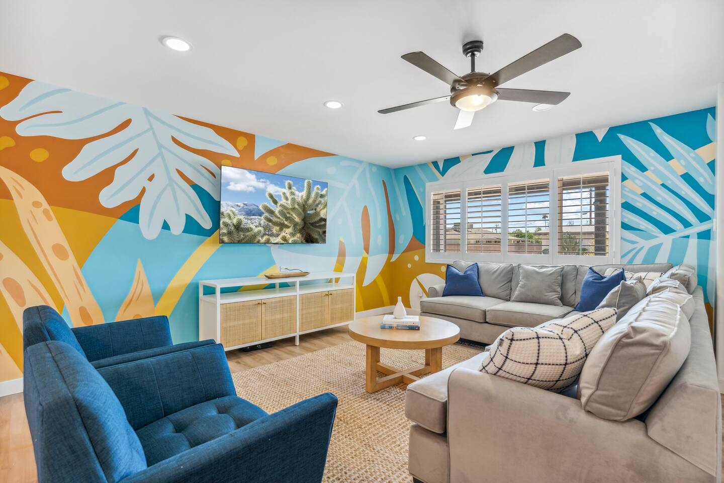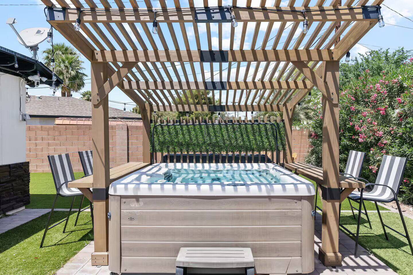 KEY FEATURES: ☀ 4 beautiful bedrooms; 1 king, 2 queens, 2 fulls (bunk), & 2 twins (bunk) ☀ 3 full bathrooms ☀ Modern, open kitchen with new appliances ☀ Great space for entertaining in the living room with lots of comfy seating & smart TV ☀ Dining room with seating to comfortably accommodate 8 (plus 4 countertop seats & outdoor dining) ☀ Fun, vibrant game room with pool table, foosball, arcade games, sauna, and more! ☀ AMAZING backyard, loaded with amenities!; heated pool, hot tub, mini golf, fire pit, and so much more! Here Are A Few Kind Words From Our Past Guests: “This was a great place to stay! The morning light through the windows was so beautiful. Overall, just a relaxing experience. The hosts were super responsive whenever I had a question. I would stay again!” - Emily “Sabrina was very accommodating and communicative. the house is beautiful and very comfortable, close to nature hikes.” - Jennifer “This place was lovely! Exactly as pictured! Very clean and excellent host experience!!! I plan to come back again!” - Regina ☆☆ BEDROOMS ☆☆ This home has four beautifully designed bedrooms. Right off of the main living space is the master bedroom, with a king bed, sitting area, smart TV, and private ensuite bathroom. On the other end of the open living area are the three remaining bedrooms. The next bedroom has a queen bed, private ensuite bathroom, and direct access to the amazing backyard. As you go down the hallway, you'll find the two remaining bedrooms; one with a king bed, the other with two bunk beds (two full beds & two twin beds). These last two bedrooms share one full bathroom, accessible from the hallway. ☆☆ BATHROOMS ☆☆ There are three full bathrooms in this home. The master ensuite bathroom is modern and luxurious, with a sink, toilet, and walk-in shower. The secondary bedroom's private ensuite bathroom also has a similar layout, with a sink, toilet, and walk-in shower. The third bathroom, which is accessible from the hallway, has a sink, toilet, and shower/tub combo. ☆☆ KITCHEN & DINING ☆☆ The modern kitchen is located right off of the main living areas, and is loaded with all the kitchen essentials & a coffee station (including a Keurig & coffee pods). It opens up to the rest of the living area, making this a great spot for entertaining! The dining room is right next to the kitchen, with enough seating to comfortably fit 8 people, plus 4 countertop seats in the kitchen & more dining options outside. ☆☆ LIVING ROOM ☆☆ In the living room, you’ll be greeted with lots of comfy seating, a big smart TV, and fun, vibrant design throughout! This is the perfect spot to host your movie nights & games with your friends and family, or to unwind together after exploring a night out in the town, or even just to relax after a full day of activities in the backyard! ☆☆ GAME ROOM ☆☆ Keep your family and friends entertained throughout your stay in our amenity-filled game room! Pool table, foosball, arcade games, sauna, high-top seating, and a smart TV. Whether your reason for staying is to explore the town or stay at home and relax, this place will be the perfect spot to enjoy! ☆☆ OUTDOOR SPACE ☆☆ This backyard is everything you could ask for, and more! ☀ Heated pool ☀ Hot tub (+ bar seating around hot tub; super cool!) ☀ Mini golf ☀ Fire pit ☀ Corn hole ☀ BBQ grill ☀ Sun lounging chairs ☀ Covered outdoor lounge seating ☀ Covered outdoor dining area There is so much to do here, that all of your friends & family will be thoroughly entertained throughout your entire stay. No matter the season, this backyard has it all. Book your stay with us today and you will NOT be disappointed. Get ready for a vacation you will never forget! ★☆ Book Now & Let Us Take Care Of You In Scottsdale! ☆★