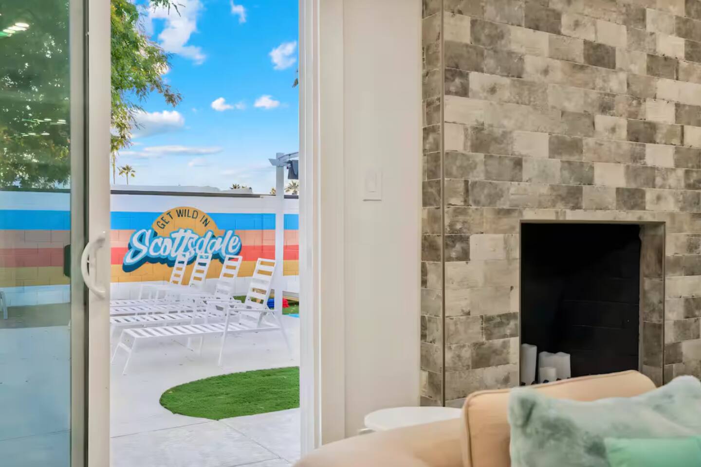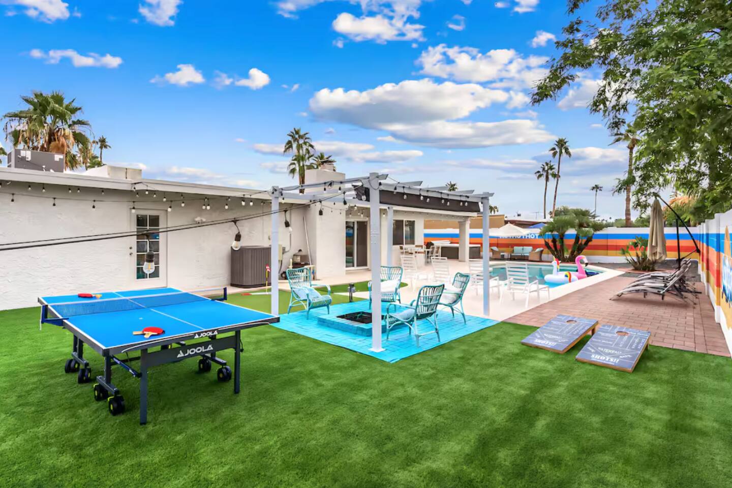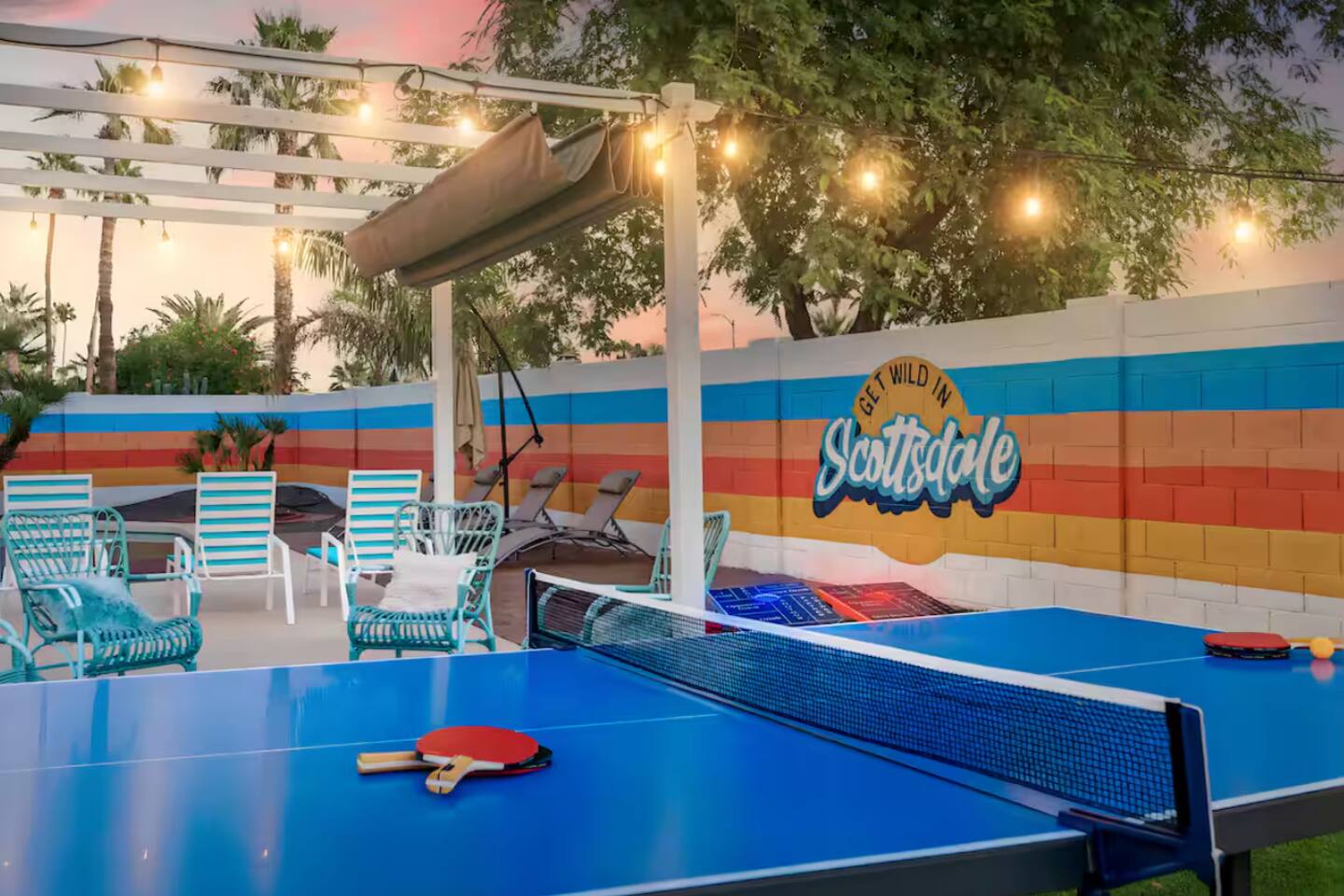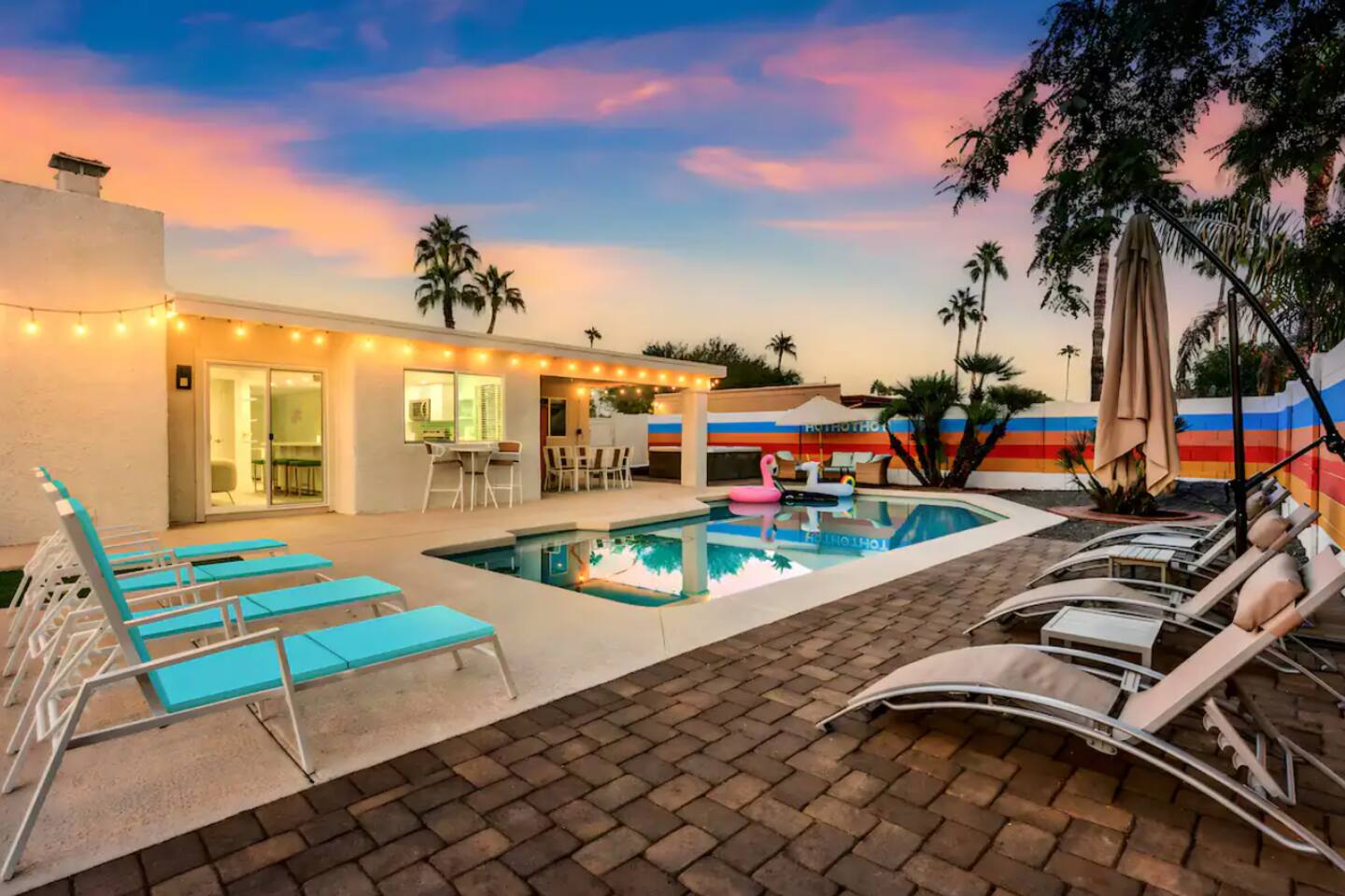 **Request a booking to receive a 3D tour!** KEY FEATURES: ☀ Large, fully fenced yard with heated pool, fire pit, and more ☀ 4 large bedrooms; 2 queens, 4 fulls, 1 twin ☀ 2 full bathrooms + 1 half bath ☀ Modern kitchen w/ stainless steel appliances ☀ Open-concept living area w/ jaw-dropping murals + tons of natural light ☀ Private backyard w/ heated pool + fire pit ☀ High-speed WiFi + Smart TV ☀ Located in a great neighborhood just a short drive from all that Scottsdale has to offer! Here Are A Few Kind Words From Our Past Guests: “This was a great place to stay! The morning light through the windows was so beautiful. Overall, just a relaxing experience. The hosts were super responsive whenever I had a question. I would stay again!”- Emily “Sabrina was very accommodating and communicative. the house is beautiful and very comfortable, close to nature hikes.”- Jennifer “This place was lovely! Exactly as pictured! Very clean and excellent host experience!!! I plan to come back again!”- Regina ☆☆ BEDROOMS ☆☆ Four of the most beautifully designed bedrooms you will find! The master bedroom can sleep up to 8, with four full beds (two bunks) and an attached ensuite bathroom. Right down the hall are the remaining three bedrooms. Two of the other bedrooms have one queen bed in each, while the last one has one twin daybed. Each room takes on a fun, unique design, with vibrant murals and wallpaper, a wall of flowers, and bright neon signs. Such a vibrant, yet peaceful design! ☆☆ BATHROOMS ☆☆ Two and a half gorgeous, completely remodeled bathrooms. One is attached the the master bedroom, and comes fully equipped with two sinks, a walk-in shower, and a stand-alone tub. The next bathroom has access directly from the hallway, and is shared by the remaining bedrooms. This second bathroom has 1 sink and a shower/tub combo. The half bathroom is located right off of the living space, conveniently placed for easy access to the main gathering area in this home. ☆☆ KITCHEN & DINING ☆☆ You will be BLOWN AWAY when you walk into this home and you are greeted by the hyper-realistic mural on the large dining room wall. On top of this, the dining room has tons of space and opens right up to the rest of the living area in this home. You will enjoy your classy, 5-course dinners right here in the dining room, right next to the flower wall and fun neon sign (and of course, classy art and decor spread throughout this space). The next room over is the modern, completely remodeled kitchen, equipped with all brand new stainless steel appliances (and, of course, a stocked coffee station with a Keurig, coffee pods, and unique, classy coffee mugs). This space is made for entertaining - this whole area opens up to the rest of the home, so you will never miss a beat cooking in the kitchen while the rest of the group is gathered in the living room! ☆☆ LIVING ROOM ☆☆ Let the family and friends gather around the 65 inch smart TV in this grand, open living room! The modern, vibrant design continues here with lots of comfy seating gathered around the fireplace (non-operational) and direct access to the backyard, with even more fun amenities! ☆☆ BACKYARD ☆☆ Let the entertainment continue as you walk out into the private, open yard space! Here you will find a heated pool (heating available upon request), fire pit (wood-burning), lounge chairs and a bright blue mural, perfect for those influencer photo-ops. Welcome to your true Scottsdale Escape - your dream destination awaits! ★☆ Book Today & Let Us Take Care Of You In Scottsdale! ☆★