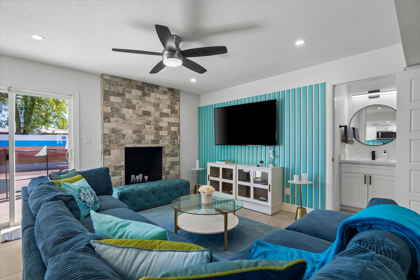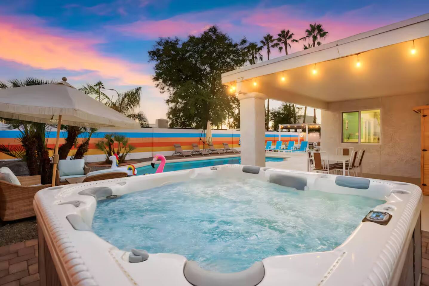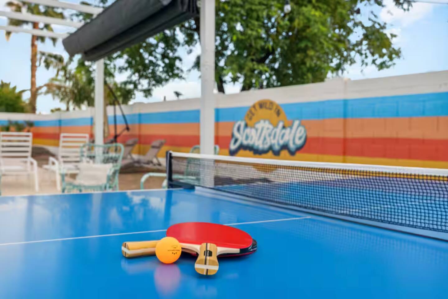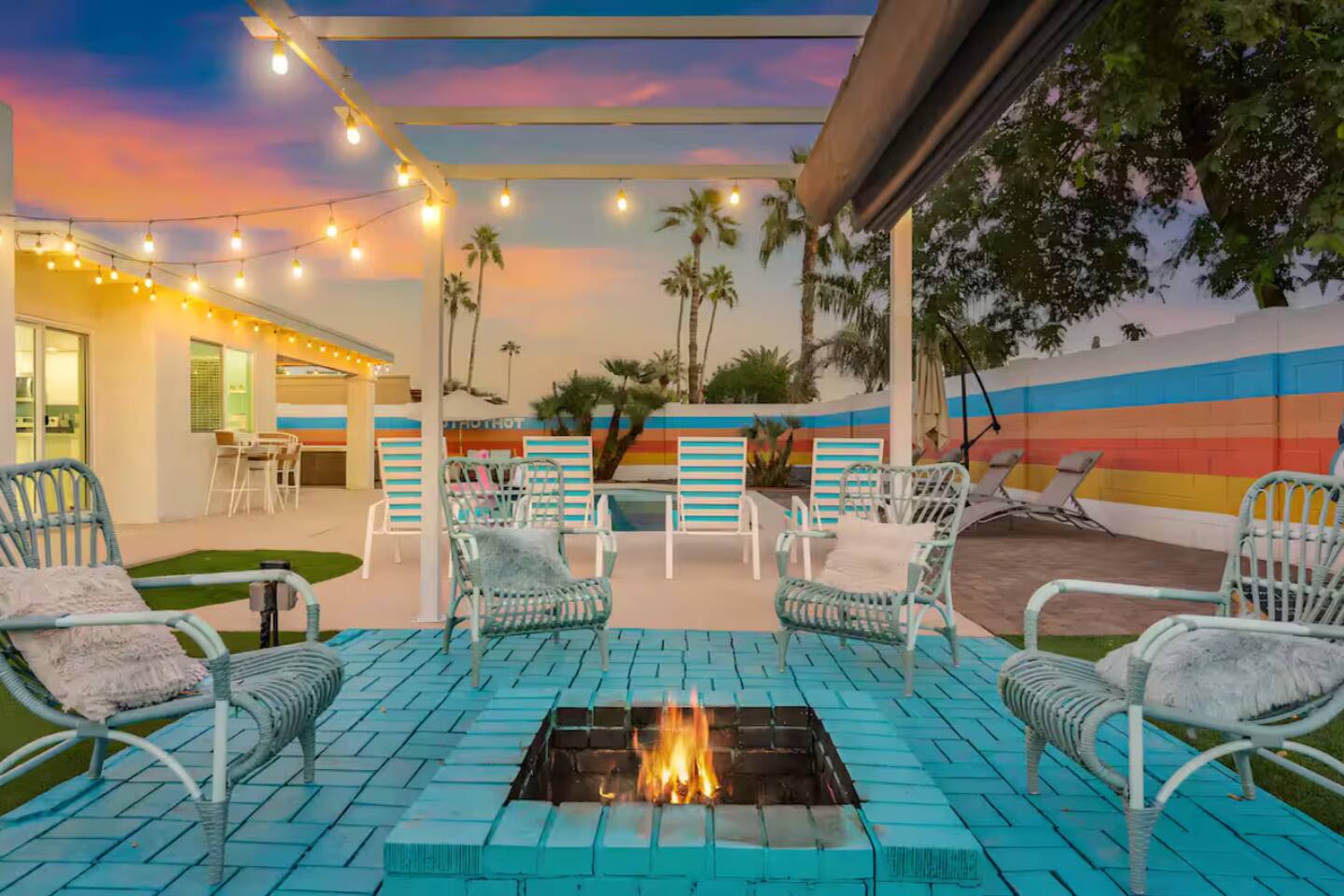 **Request a booking to receive a 3D tour!** KEY FEATURES: ☀ Large, fully fenced yard with heated pool, fire pit, and more ☀ 4 large bedrooms; 2 queens, 4 fulls, 1 twin ☀ 2 full bathrooms + 1 half bath ☀ Modern kitchen w/ stainless steel appliances ☀ Open-concept living area w/ jaw-dropping murals + tons of natural light ☀ Private backyard w/ heated pool + fire pit ☀ High-speed WiFi + Smart TV ☀ Located in a great neighborhood just a short drive from all that Scottsdale has to offer! Here Are A Few Kind Words From Our Past Guests: “This was a great place to stay! The morning light through the windows was so beautiful. Overall, just a relaxing experience. The hosts were super responsive whenever I had a question. I would stay again!”- Emily “Sabrina was very accommodating and communicative. the house is beautiful and very comfortable, close to nature hikes.”- Jennifer “This place was lovely! Exactly as pictured! Very clean and excellent host experience!!! I plan to come back again!”- Regina ☆☆ BEDROOMS ☆☆ Four of the most beautifully designed bedrooms you will find! The master bedroom can sleep up to 8, with four full beds (two bunks) and an attached ensuite bathroom. Right down the hall are the remaining three bedrooms. Two of the other bedrooms have one queen bed in each, while the last one has one twin daybed. Each room takes on a fun, unique design, with vibrant murals and wallpaper, a wall of flowers, and bright neon signs. Such a vibrant, yet peaceful design! ☆☆ BATHROOMS ☆☆ Two and a half gorgeous, completely remodeled bathrooms. One is attached the the master bedroom, and comes fully equipped with two sinks, a walk-in shower, and a stand-alone tub. The next bathroom has access directly from the hallway, and is shared by the remaining bedrooms. This second bathroom has 1 sink and a shower/tub combo. The half bathroom is located right off of the living space, conveniently placed for easy access to the main gathering area in this home. ☆☆ KITCHEN & DINING ☆☆ You will be BLOWN AWAY when you walk into this home and you are greeted by the hyper-realistic mural on the large dining room wall. On top of this, the dining room has tons of space and opens right up to the rest of the living area in this home. You will enjoy your classy, 5-course dinners right here in the dining room, right next to the flower wall and fun neon sign (and of course, classy art and decor spread throughout this space). The next room over is the modern, completely remodeled kitchen, equipped with all brand new stainless steel appliances (and, of course, a stocked coffee station with a Keurig, coffee pods, and unique, classy coffee mugs). This space is made for entertaining - this whole area opens up to the rest of the home, so you will never miss a beat cooking in the kitchen while the rest of the group is gathered in the living room! ☆☆ LIVING ROOM ☆☆ Let the family and friends gather around the 65 inch smart TV in this grand, open living room! The modern, vibrant design continues here with lots of comfy seating gathered around the fireplace (non-operational) and direct access to the backyard, with even more fun amenities! ☆☆ BACKYARD ☆☆ Let the entertainment continue as you walk out into the private, open yard space! Here you will find a heated pool (heating available upon request), fire pit (wood-burning), lounge chairs and a bright blue mural, perfect for those influencer photo-ops. Welcome to your true Scottsdale Escape - your dream destination awaits! ★☆ Book Today & Let Us Take Care Of You In Scottsdale! ☆★
