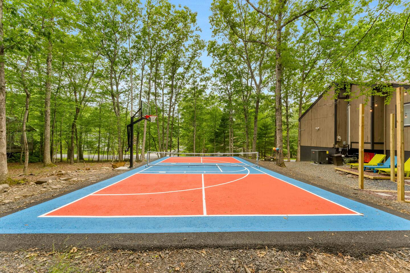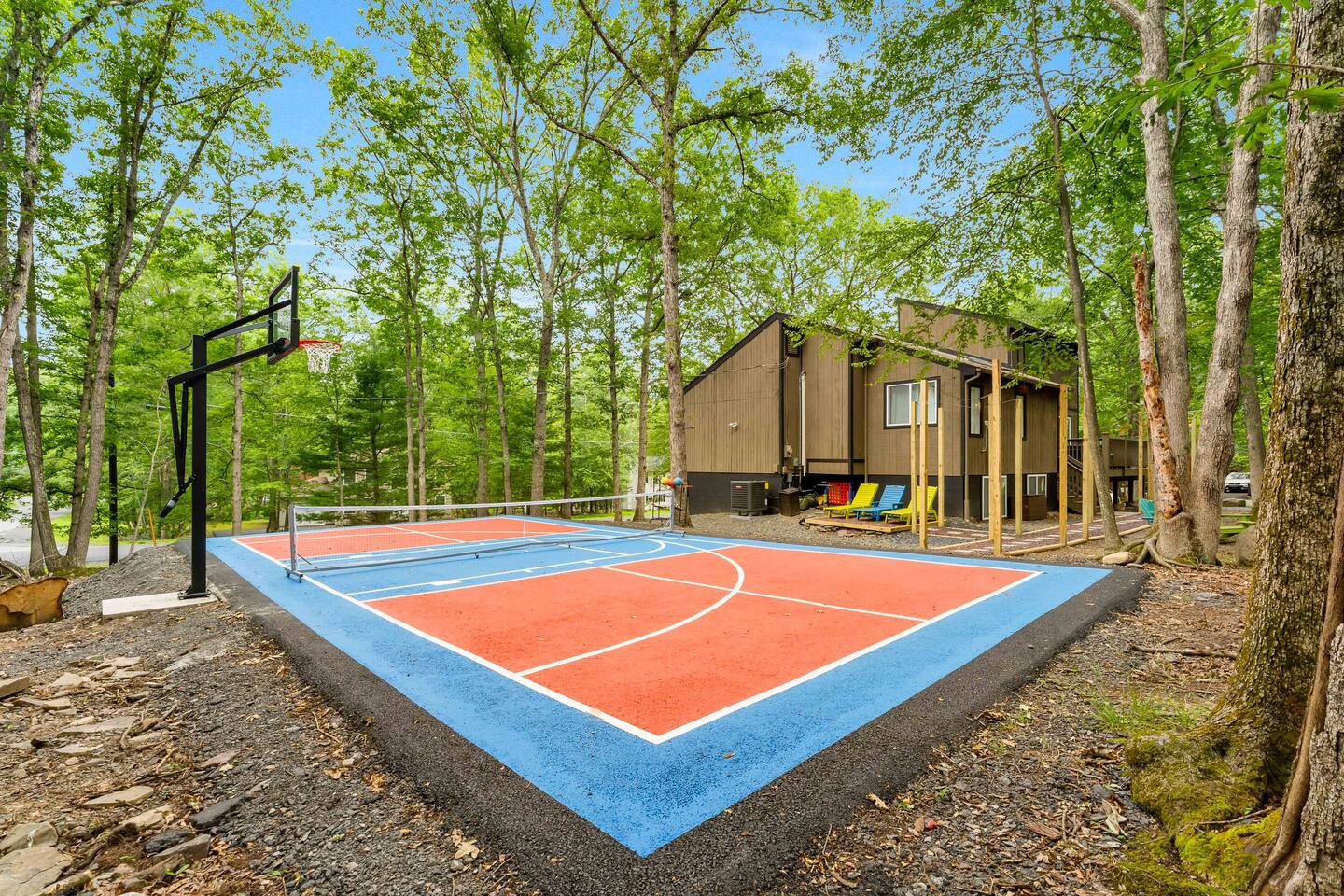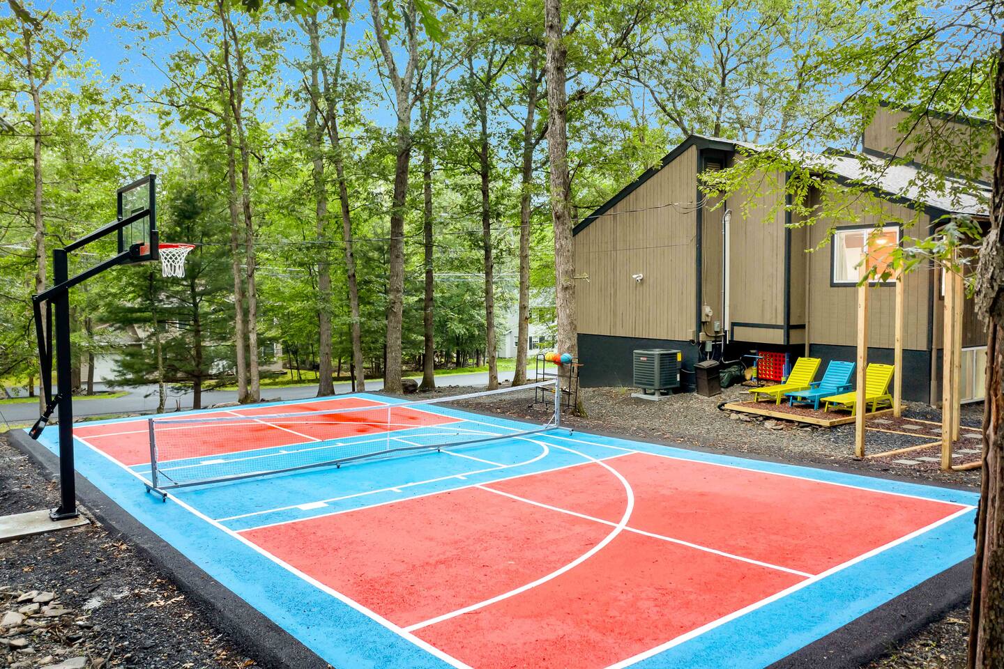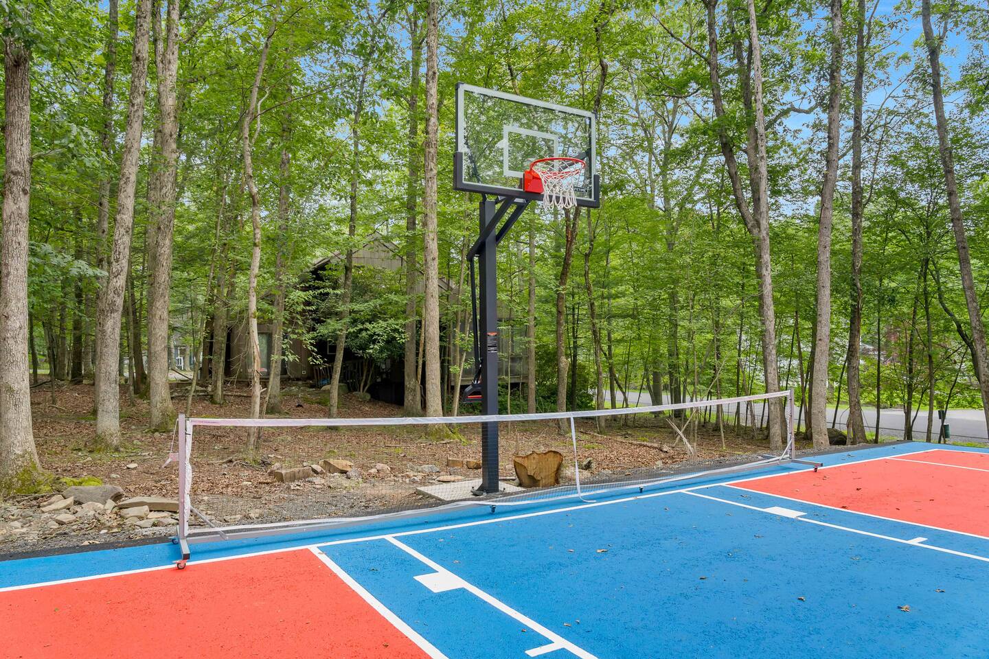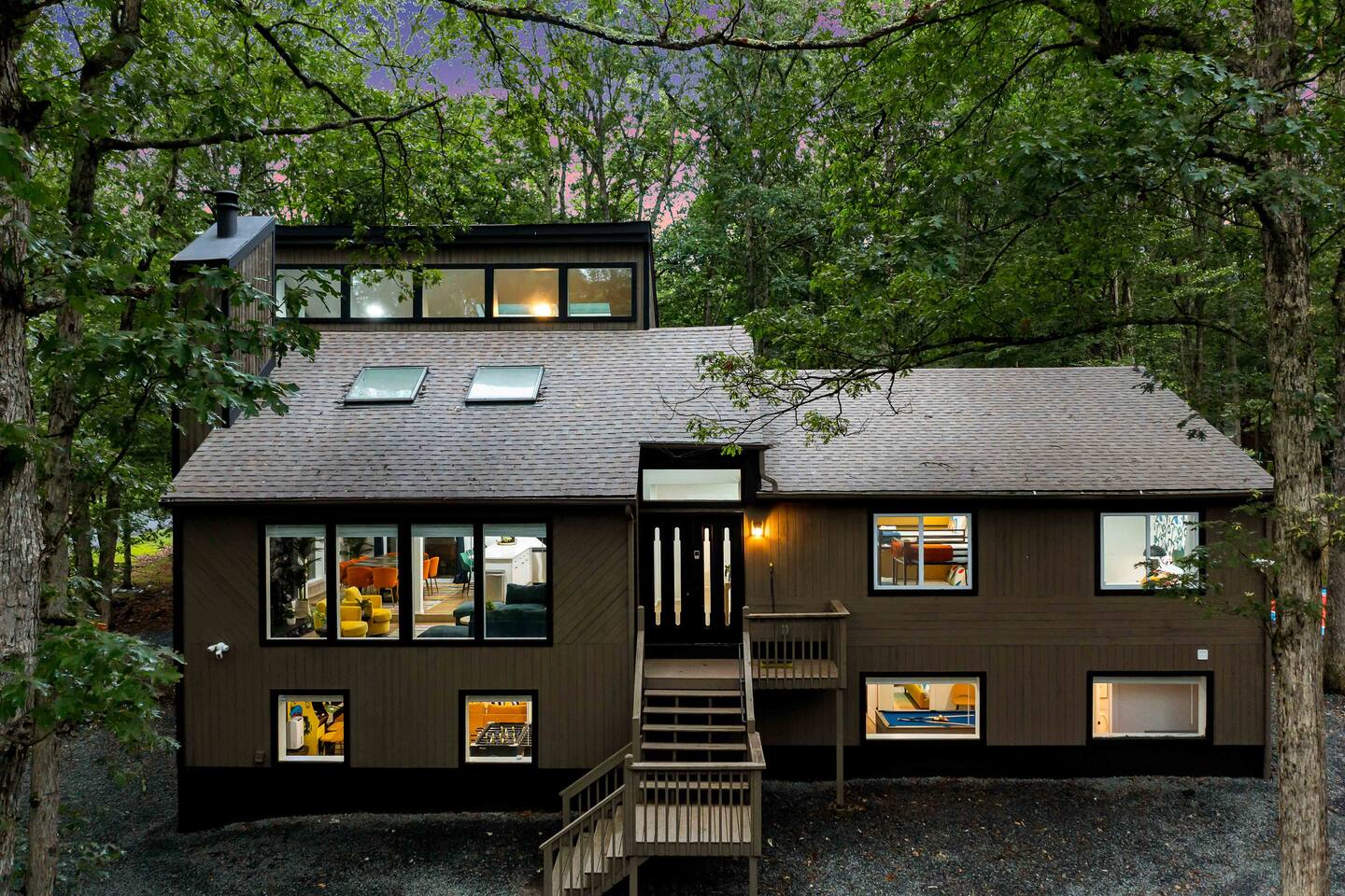 **During the summer months (Memorial Day weekend - Labor Day weekend), you will receive amenity badges that allow you to access the following amenities. If you’re staying with us outside of these dates, these amenities will be closed.** ☀ Lakes (with beach access - swimming allowed!) ☀ Pools ☀ Tennis courts ☀ Basketball courts ☀ Volleyball courts ☀ Dog park ☀ Playground areas KEY FEATURES: ☀ 5 beautiful bedrooms; 4 kings & 4 twin beds (2 twin-over-twin bunks) ☀ 3 full, modern bathrooms ☀ New, modern kitchen ☀ HUGE living room with lots of comfy seating & smart TV ☀ Stylish dining room that opens up to the rest of the living space ☀ Super fun game rooms with pool table, poker table, air hockey, & more! ☀ A private MOVIE THEATER with a massive projector screen ☀ A private back deck with a fire pit & outdoor dining ☀ A private pickleball/basketball court right in the backyard! Here Are A Few Kind Words From Our Past Guests: “This was a great place to stay! The morning light through the windows was so beautiful. Overall, just a relaxing experience. The hosts were super responsive whenever I had a question. I would stay again!” - Emily “Sabrina was very accommodating and communicative. the house is beautiful and very comfortable, close to nature hikes.” - Jennifer “This place was lovely! Exactly as pictured! Very clean and excellent host experience!!! I plan to come back again!” - Regina ☆☆ BEDROOMS ☆☆ These 5 bedrooms in this home are truly designed for style & comfort, each with their own smart TV! There are 3 bedrooms on the main level. The master bedroom has a king bed, seating area, and a private ensuite bathroom. The second bedroom has two twin-over-twin bunk beds (4 twin beds total) — each bunk has a 150-pound weight limit. The third bedroom has a king bed. Downstairs, the fourth & fifth bedrooms have 1 king bed in each. ☆☆ BATHROOMS ☆☆ There are 3 full, modern bathrooms throughout this home. On the main floor, the master ensuite bathroom has a sink, toilet, walk-in shower, and soaking tub. Right down the hall, the second bathroom has a sink, toilet, and shower/tub combo. Downstairs, the third bathroom has a sink, toilet, and walk-in shower only. ☆☆ KITCHEN & DINING ☆☆ The new, modern kitchen is located right off of the main living areas, and is loaded with all you'll need during your stay (including a coffee maker & coffee pods). The dining room is right next to the kitchen, with enough seating to comfortably fit 8 more people (+ 4 countertop seats & outdoor dining). This space is truly sleek & stylish! ☆☆ LIVING ROOM ☆☆ In the living room, you’ll be greeted with tall vaulted ceilings, WALLS of windows, skylights, lots of comfy seating & a big smart TV. This is the perfect spot to gather with your friends and family! ☆☆ GAME ROOMS ☆☆ The main game room space is located on the lower level, filled with a pool table/ping pong table combo, shuffleboard, air hockey, foosball, arcade games, Giant Connect 4, a big smart TV, and lots of seating throughout. Such a fun space to provide you with all the entertainment you need during your stay! As you enter the loft, you will find a wonderful surprise of a truly unique poker room, filled with a poker table & a wall of 4 TVs, perfect for watching all of your favorite sports at once! ☆☆ MOVIE THEATER ☆☆ Right next to the game room is your very own, private movie theater! With a huge sectional couch and a HUGE projector screen, this is a DREAM spot to host your movie nights with your friends and family! ★☆ Book Now & Let Us Take Care Of You In The Poconos! ☆★