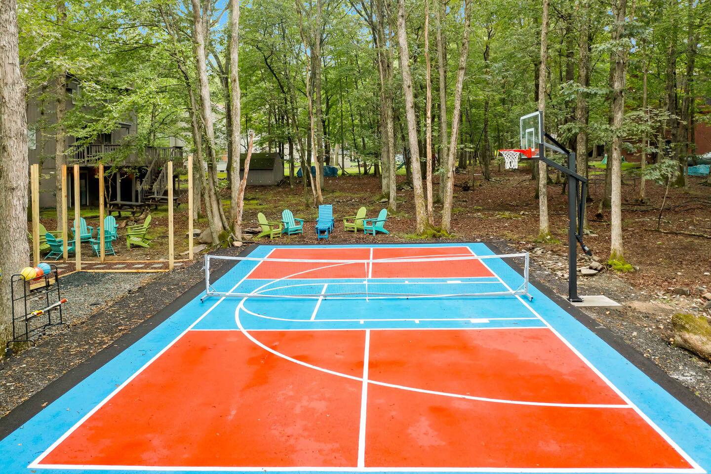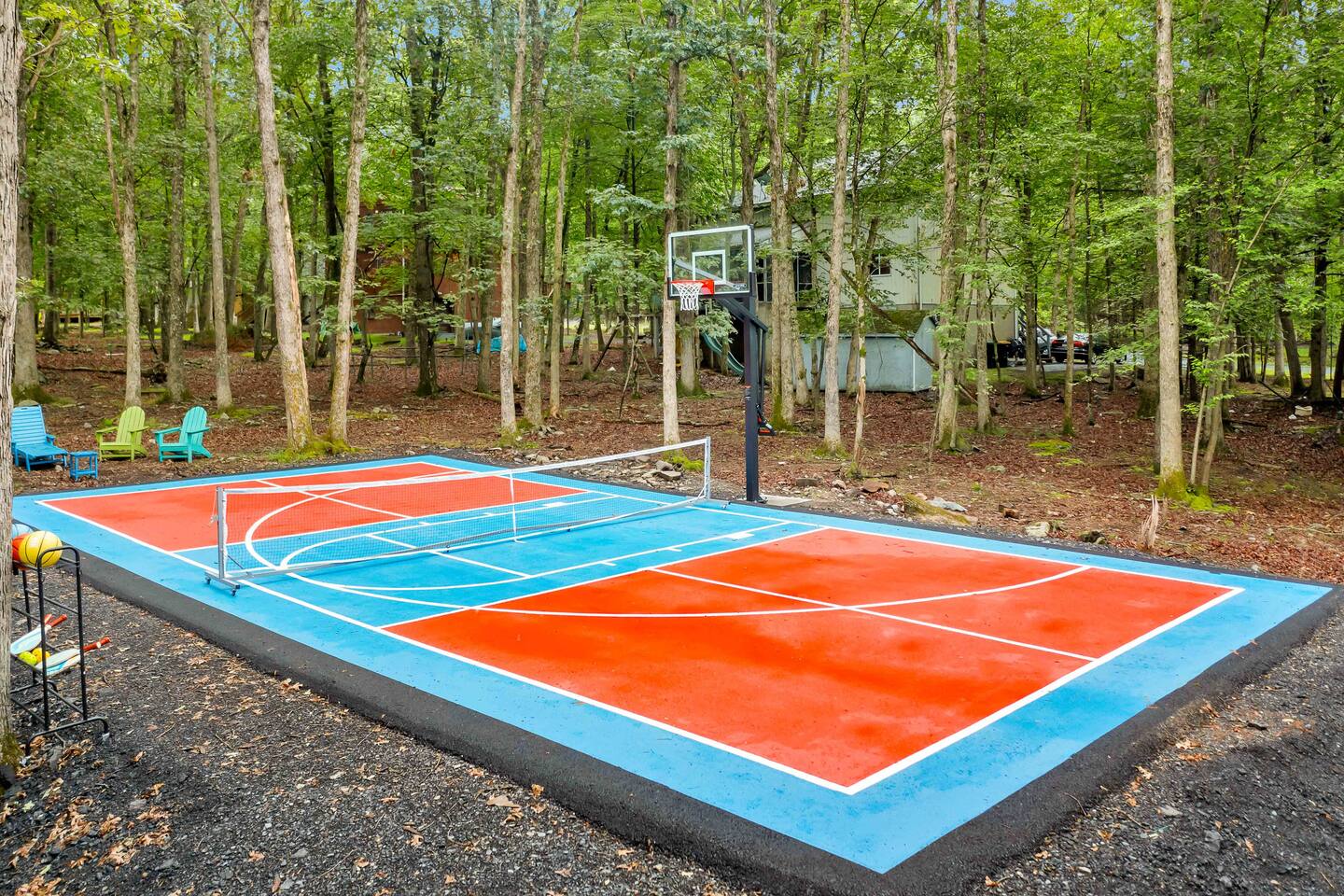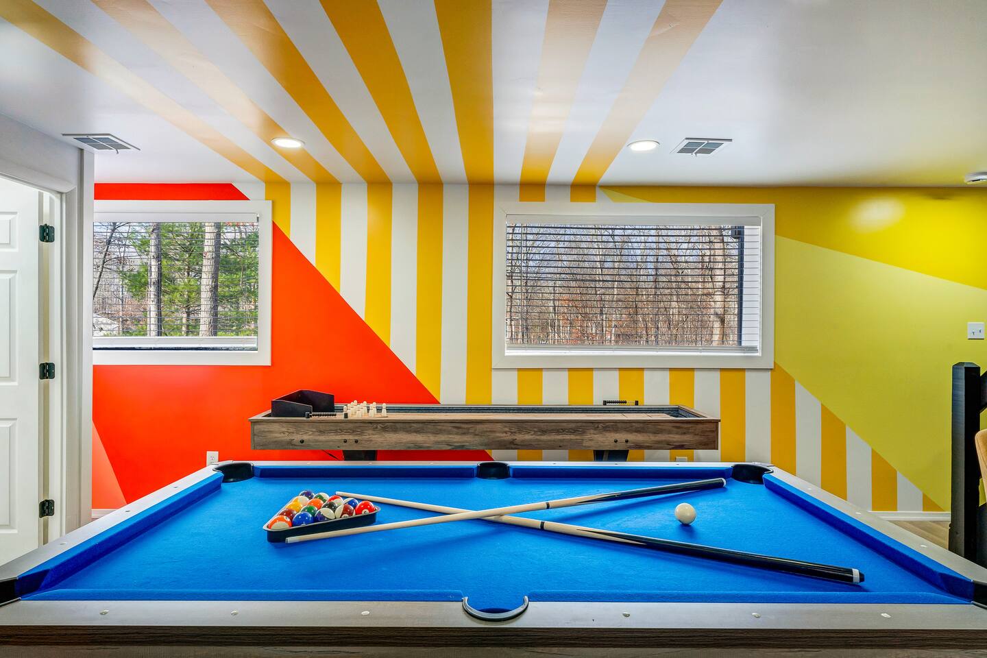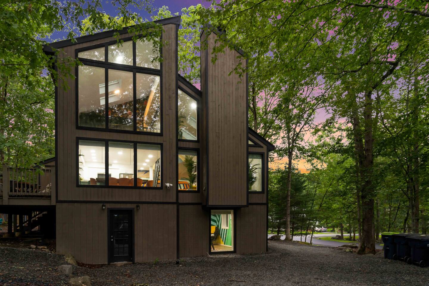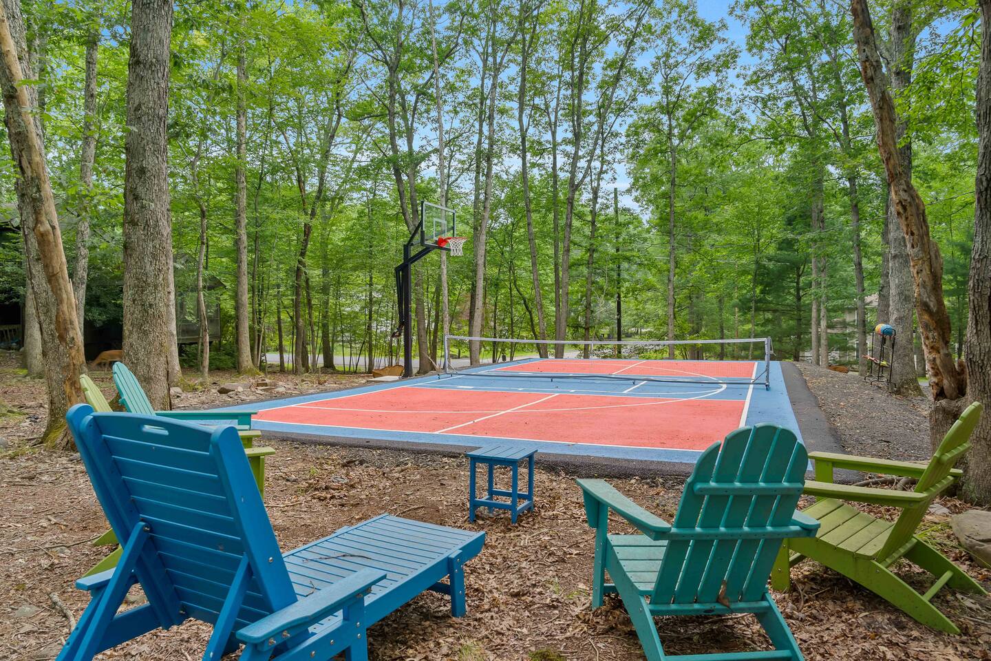 **During the summer months (Memorial Day weekend - Labor Day weekend), you will receive amenity badges that allow you to access the following amenities. If you’re staying with us outside of these dates, these amenities will be closed.** ☀ Lakes (with beach access - swimming allowed!) ☀ Pools ☀ Tennis courts ☀ Basketball courts ☀ Volleyball courts ☀ Dog park ☀ Playground areas KEY FEATURES: ☀ 5 beautiful bedrooms; 4 kings & 4 twin beds (2 twin-over-twin bunks) ☀ 3 full, modern bathrooms ☀ New, modern kitchen ☀ HUGE living room with lots of comfy seating & smart TV ☀ Stylish dining room that opens up to the rest of the living space ☀ Super fun game rooms with pool table, poker table, air hockey, & more! ☀ A private MOVIE THEATER with a massive projector screen ☀ A private back deck with a fire pit & outdoor dining ☀ A private pickleball/basketball court right in the backyard! Here Are A Few Kind Words From Our Past Guests: “This was a great place to stay! The morning light through the windows was so beautiful. Overall, just a relaxing experience. The hosts were super responsive whenever I had a question. I would stay again!” - Emily “Sabrina was very accommodating and communicative. the house is beautiful and very comfortable, close to nature hikes.” - Jennifer “This place was lovely! Exactly as pictured! Very clean and excellent host experience!!! I plan to come back again!” - Regina ☆☆ BEDROOMS ☆☆ These 5 bedrooms in this home are truly designed for style & comfort, each with their own smart TV! There are 3 bedrooms on the main level. The master bedroom has a king bed, seating area, and a private ensuite bathroom. The second bedroom has two twin-over-twin bunk beds (4 twin beds total) — each bunk has a 150-pound weight limit. The third bedroom has a king bed. Downstairs, the fourth & fifth bedrooms have 1 king bed in each. ☆☆ BATHROOMS ☆☆ There are 3 full, modern bathrooms throughout this home. On the main floor, the master ensuite bathroom has a sink, toilet, walk-in shower, and soaking tub. Right down the hall, the second bathroom has a sink, toilet, and shower/tub combo. Downstairs, the third bathroom has a sink, toilet, and walk-in shower only. ☆☆ KITCHEN & DINING ☆☆ The new, modern kitchen is located right off of the main living areas, and is loaded with all you'll need during your stay (including a coffee maker & coffee pods). The dining room is right next to the kitchen, with enough seating to comfortably fit 8 more people (+ 4 countertop seats & outdoor dining). This space is truly sleek & stylish! ☆☆ LIVING ROOM ☆☆ In the living room, you’ll be greeted with tall vaulted ceilings, WALLS of windows, skylights, lots of comfy seating & a big smart TV. This is the perfect spot to gather with your friends and family! ☆☆ GAME ROOMS ☆☆ The main game room space is located on the lower level, filled with a pool table/ping pong table combo, shuffleboard, air hockey, foosball, arcade games, Giant Connect 4, a big smart TV, and lots of seating throughout. Such a fun space to provide you with all the entertainment you need during your stay! As you enter the loft, you will find a wonderful surprise of a truly unique poker room, filled with a poker table & a wall of 4 TVs, perfect for watching all of your favorite sports at once! ☆☆ MOVIE THEATER ☆☆ Right next to the game room is your very own, private movie theater! With a huge sectional couch and a HUGE projector screen, this is a DREAM spot to host your movie nights with your friends and family! ★☆ Book Now & Let Us Take Care Of You In The Poconos! ☆★