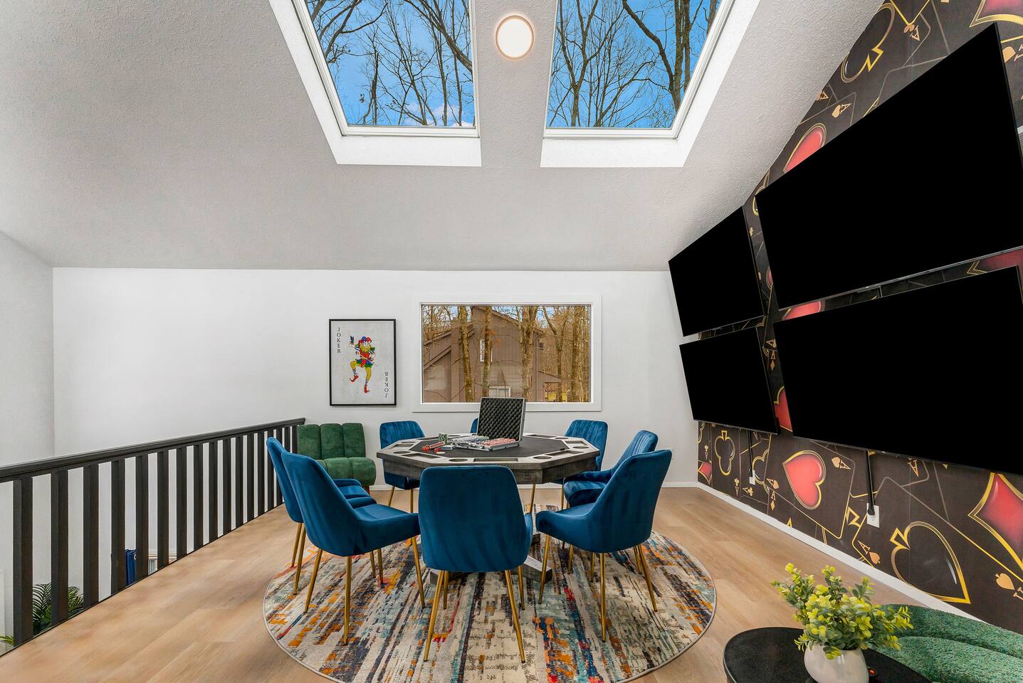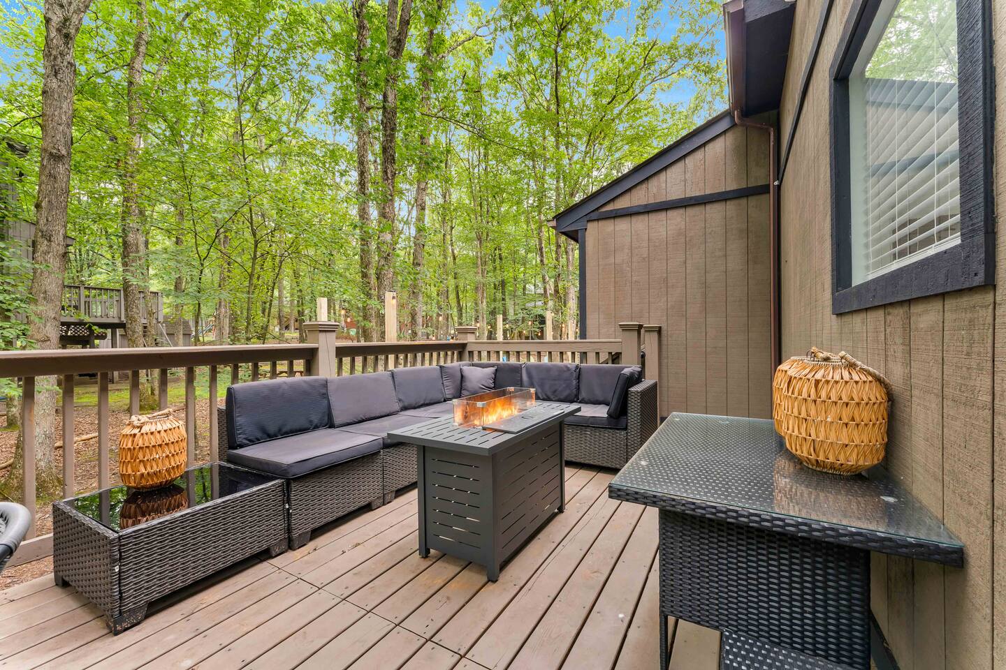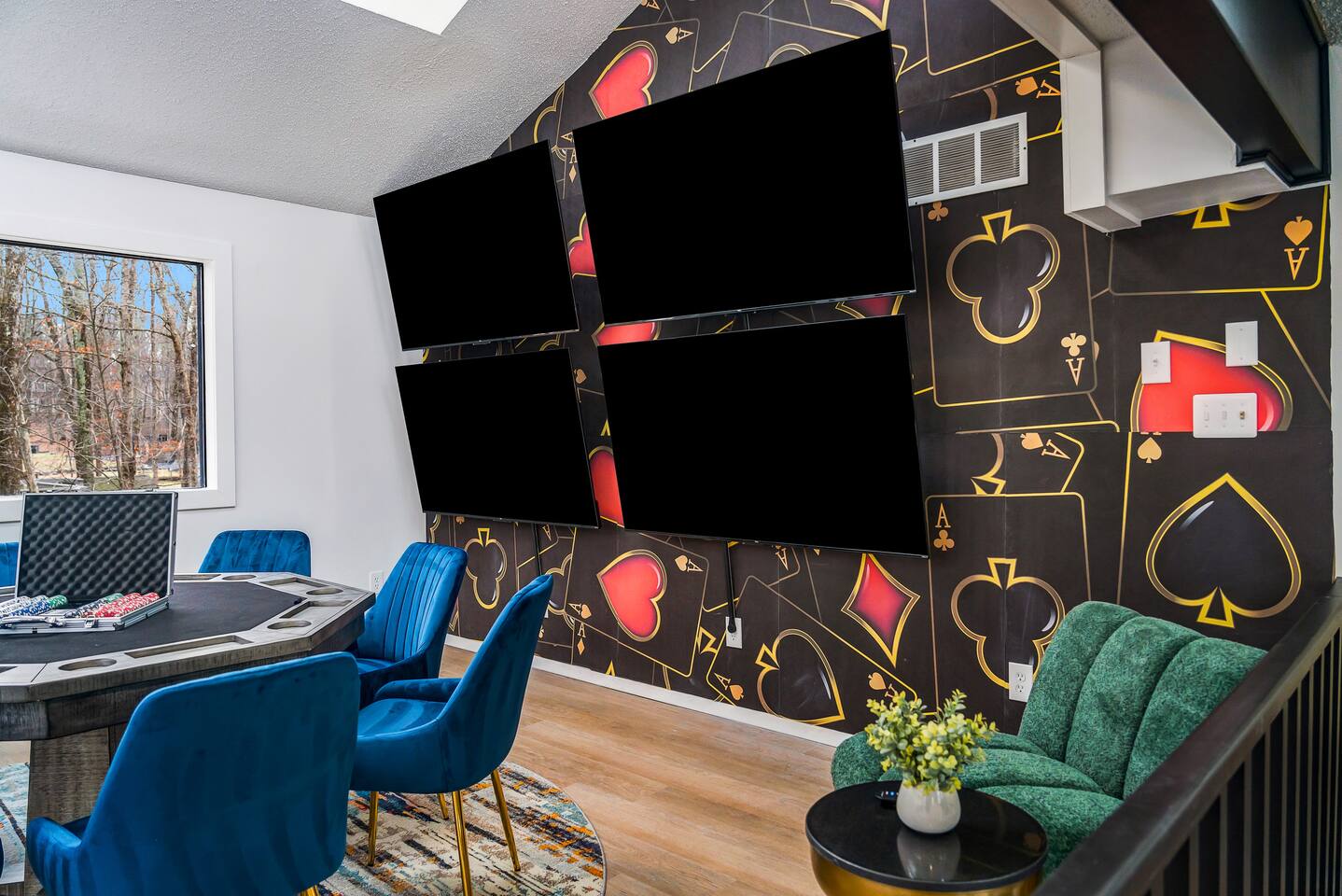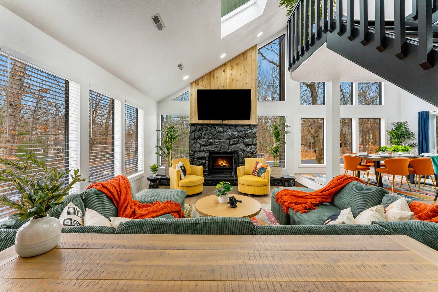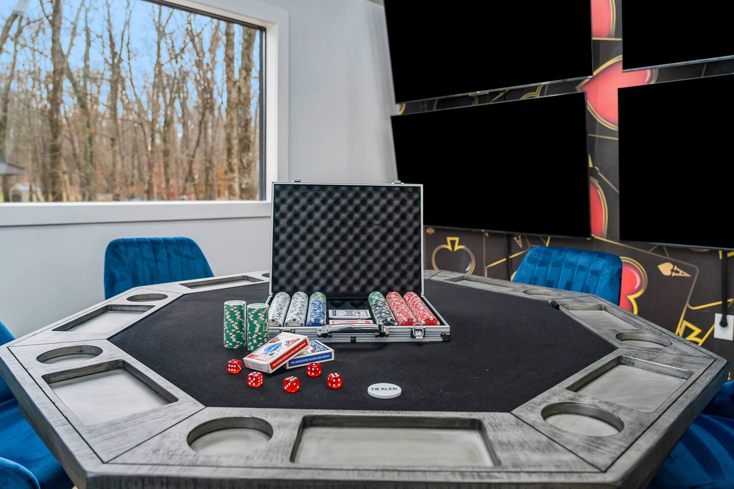 **During the summer months (Memorial Day weekend - Labor Day weekend), you will receive amenity badges that allow you to access the following amenities. If you’re staying with us outside of these dates, these amenities will be closed.** ☀ Lakes (with beach access - swimming allowed!) ☀ Pools ☀ Tennis courts ☀ Basketball courts ☀ Volleyball courts ☀ Dog park ☀ Playground areas KEY FEATURES: ☀ 5 beautiful bedrooms; 4 kings & 4 twin beds (2 twin-over-twin bunks) ☀ 3 full, modern bathrooms ☀ New, modern kitchen ☀ HUGE living room with lots of comfy seating & smart TV ☀ Stylish dining room that opens up to the rest of the living space ☀ Super fun game rooms with pool table, poker table, air hockey, & more! ☀ A private MOVIE THEATER with a massive projector screen ☀ A private back deck with a fire pit & outdoor dining ☀ A private pickleball/basketball court right in the backyard! Here Are A Few Kind Words From Our Past Guests: “This was a great place to stay! The morning light through the windows was so beautiful. Overall, just a relaxing experience. The hosts were super responsive whenever I had a question. I would stay again!” - Emily “Sabrina was very accommodating and communicative. the house is beautiful and very comfortable, close to nature hikes.” - Jennifer “This place was lovely! Exactly as pictured! Very clean and excellent host experience!!! I plan to come back again!” - Regina ☆☆ BEDROOMS ☆☆ These 5 bedrooms in this home are truly designed for style & comfort, each with their own smart TV! There are 3 bedrooms on the main level. The master bedroom has a king bed, seating area, and a private ensuite bathroom. The second bedroom has two twin-over-twin bunk beds (4 twin beds total) — each bunk has a 150-pound weight limit. The third bedroom has a king bed. Downstairs, the fourth & fifth bedrooms have 1 king bed in each. ☆☆ BATHROOMS ☆☆ There are 3 full, modern bathrooms throughout this home. On the main floor, the master ensuite bathroom has a sink, toilet, walk-in shower, and soaking tub. Right down the hall, the second bathroom has a sink, toilet, and shower/tub combo. Downstairs, the third bathroom has a sink, toilet, and walk-in shower only. ☆☆ KITCHEN & DINING ☆☆ The new, modern kitchen is located right off of the main living areas, and is loaded with all you'll need during your stay (including a coffee maker & coffee pods). The dining room is right next to the kitchen, with enough seating to comfortably fit 8 more people (+ 4 countertop seats & outdoor dining). This space is truly sleek & stylish! ☆☆ LIVING ROOM ☆☆ In the living room, you’ll be greeted with tall vaulted ceilings, WALLS of windows, skylights, lots of comfy seating & a big smart TV. This is the perfect spot to gather with your friends and family! ☆☆ GAME ROOMS ☆☆ The main game room space is located on the lower level, filled with a pool table/ping pong table combo, shuffleboard, air hockey, foosball, arcade games, Giant Connect 4, a big smart TV, and lots of seating throughout. Such a fun space to provide you with all the entertainment you need during your stay! As you enter the loft, you will find a wonderful surprise of a truly unique poker room, filled with a poker table & a wall of 4 TVs, perfect for watching all of your favorite sports at once! ☆☆ MOVIE THEATER ☆☆ Right next to the game room is your very own, private movie theater! With a huge sectional couch and a HUGE projector screen, this is a DREAM spot to host your movie nights with your friends and family! ★☆ Book Now & Let Us Take Care Of You In The Poconos! ☆★