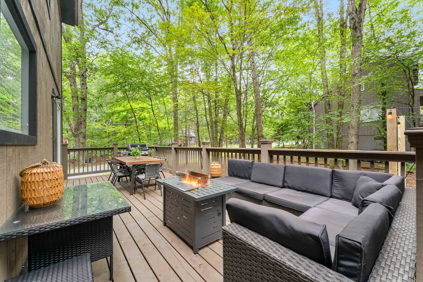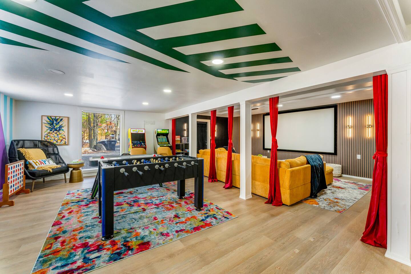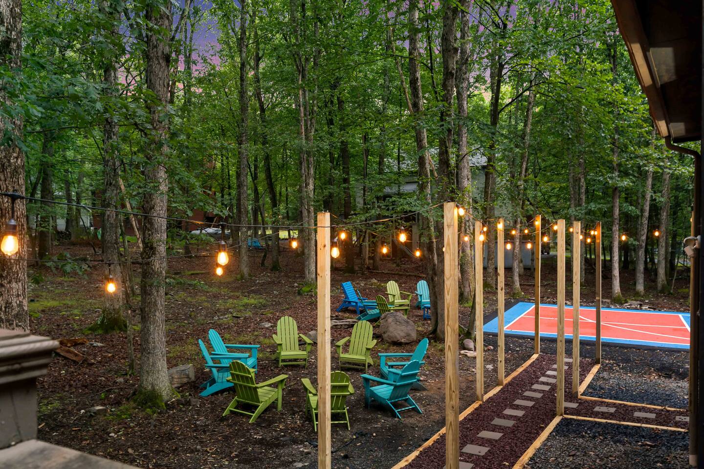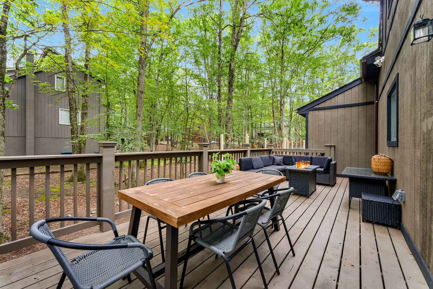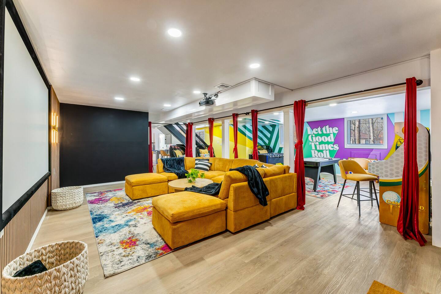 **During the summer months (Memorial Day weekend - Labor Day weekend), you will receive amenity badges that allow you to access the following amenities. If you’re staying with us outside of these dates, these amenities will be closed.** ☀ Lakes (with beach access - swimming allowed!) ☀ Pools ☀ Tennis courts ☀ Basketball courts ☀ Volleyball courts ☀ Dog park ☀ Playground areas KEY FEATURES: ☀ 5 beautiful bedrooms; 4 kings & 4 twin beds (2 twin-over-twin bunks) ☀ 3 full, modern bathrooms ☀ New, modern kitchen ☀ HUGE living room with lots of comfy seating & smart TV ☀ Stylish dining room that opens up to the rest of the living space ☀ Super fun game rooms with pool table, poker table, air hockey, & more! ☀ A private MOVIE THEATER with a massive projector screen ☀ A private back deck with a fire pit & outdoor dining ☀ A private pickleball/basketball court right in the backyard! Here Are A Few Kind Words From Our Past Guests: “This was a great place to stay! The morning light through the windows was so beautiful. Overall, just a relaxing experience. The hosts were super responsive whenever I had a question. I would stay again!” - Emily “Sabrina was very accommodating and communicative. the house is beautiful and very comfortable, close to nature hikes.” - Jennifer “This place was lovely! Exactly as pictured! Very clean and excellent host experience!!! I plan to come back again!” - Regina ☆☆ BEDROOMS ☆☆ These 5 bedrooms in this home are truly designed for style & comfort, each with their own smart TV! There are 3 bedrooms on the main level. The master bedroom has a king bed, seating area, and a private ensuite bathroom. The second bedroom has two twin-over-twin bunk beds (4 twin beds total) — each bunk has a 150-pound weight limit. The third bedroom has a king bed. Downstairs, the fourth & fifth bedrooms have 1 king bed in each. ☆☆ BATHROOMS ☆☆ There are 3 full, modern bathrooms throughout this home. On the main floor, the master ensuite bathroom has a sink, toilet, walk-in shower, and soaking tub. Right down the hall, the second bathroom has a sink, toilet, and shower/tub combo. Downstairs, the third bathroom has a sink, toilet, and walk-in shower only. ☆☆ KITCHEN & DINING ☆☆ The new, modern kitchen is located right off of the main living areas, and is loaded with all you'll need during your stay (including a coffee maker & coffee pods). The dining room is right next to the kitchen, with enough seating to comfortably fit 8 more people (+ 4 countertop seats & outdoor dining). This space is truly sleek & stylish! ☆☆ LIVING ROOM ☆☆ In the living room, you’ll be greeted with tall vaulted ceilings, WALLS of windows, skylights, lots of comfy seating & a big smart TV. This is the perfect spot to gather with your friends and family! ☆☆ GAME ROOMS ☆☆ The main game room space is located on the lower level, filled with a pool table/ping pong table combo, shuffleboard, air hockey, foosball, arcade games, Giant Connect 4, a big smart TV, and lots of seating throughout. Such a fun space to provide you with all the entertainment you need during your stay! As you enter the loft, you will find a wonderful surprise of a truly unique poker room, filled with a poker table & a wall of 4 TVs, perfect for watching all of your favorite sports at once! ☆☆ MOVIE THEATER ☆☆ Right next to the game room is your very own, private movie theater! With a huge sectional couch and a HUGE projector screen, this is a DREAM spot to host your movie nights with your friends and family! ★☆ Book Now & Let Us Take Care Of You In The Poconos! ☆★