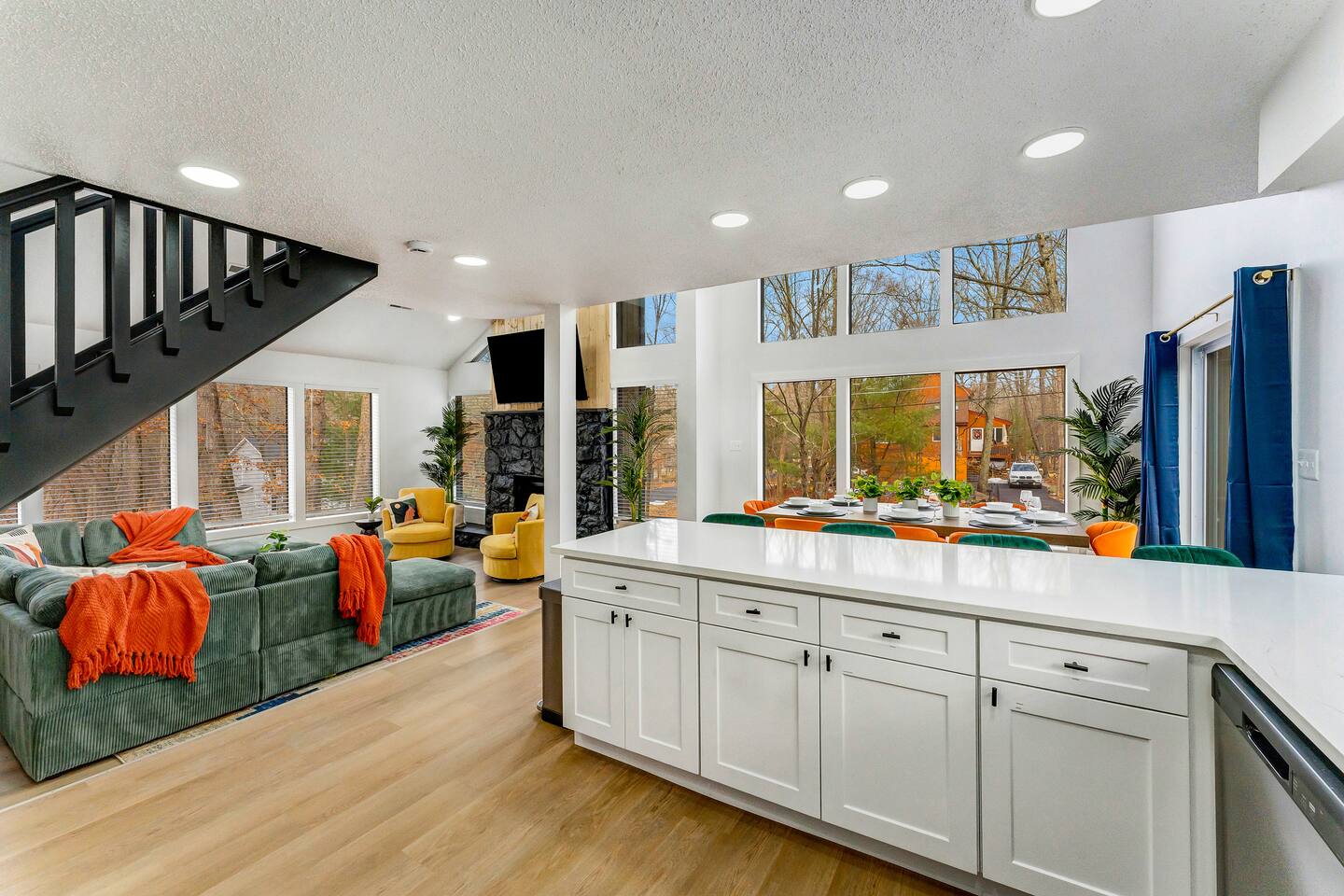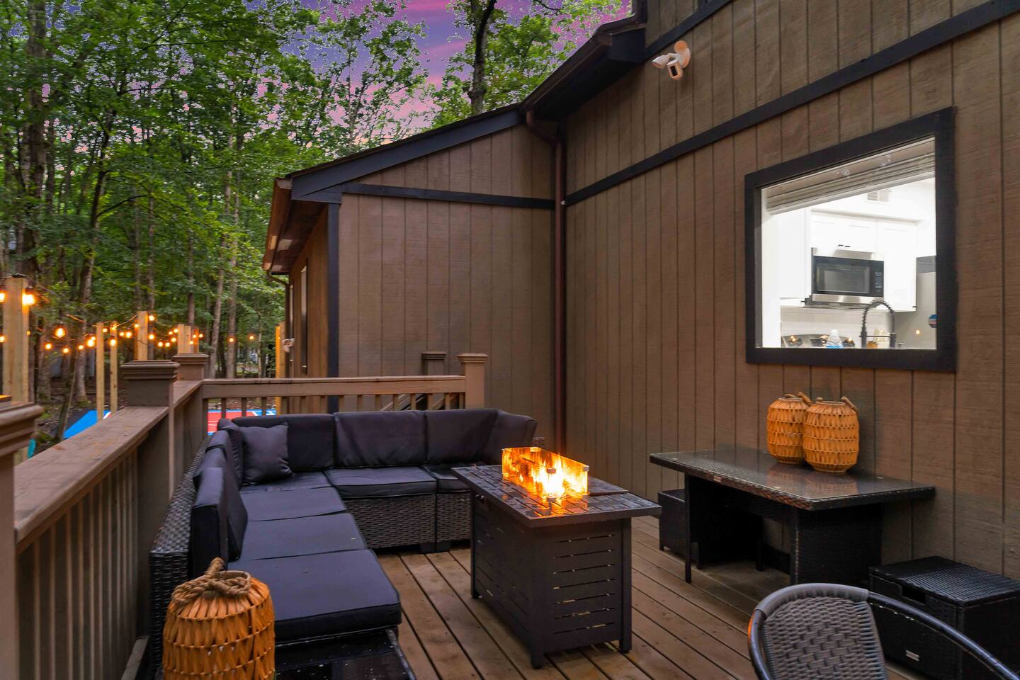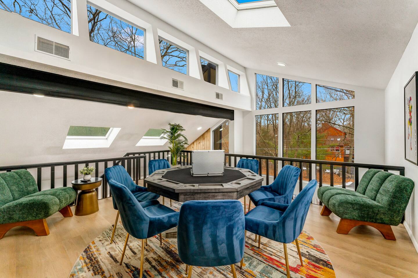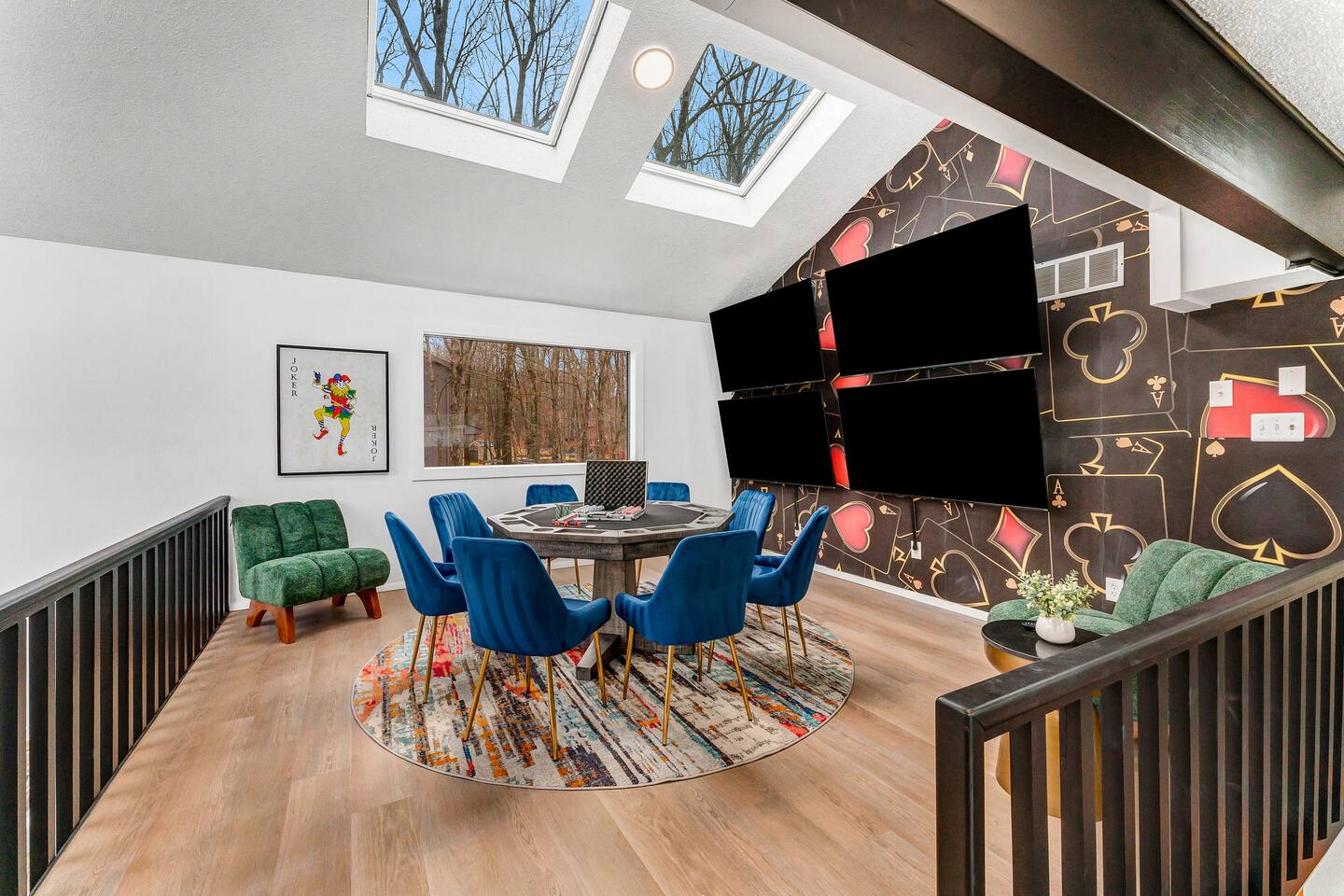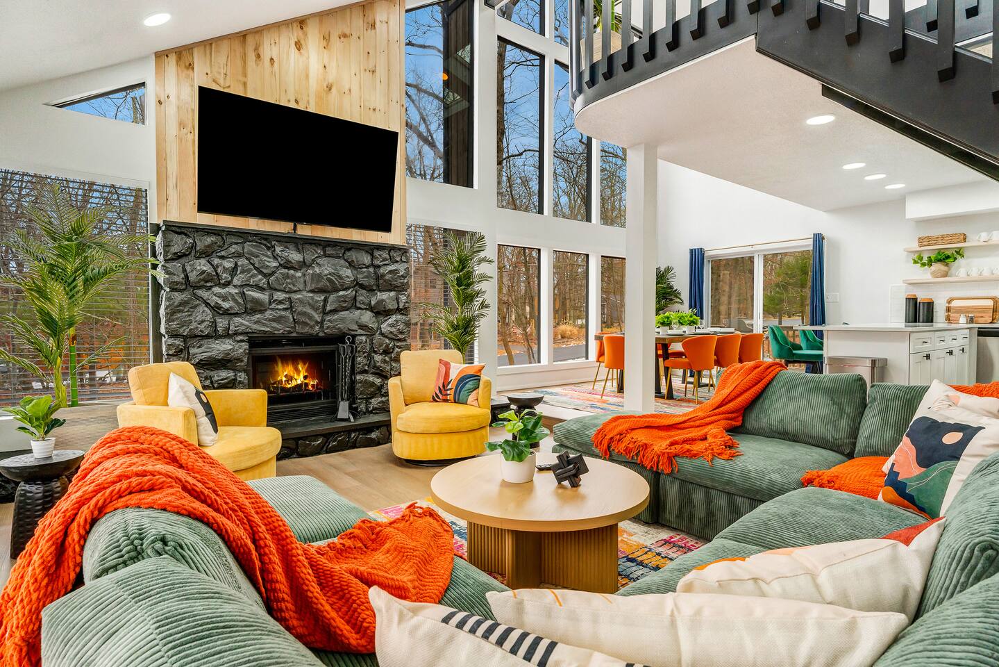 **During the summer months (Memorial Day weekend - Labor Day weekend), you will receive amenity badges that allow you to access the following amenities. If you’re staying with us outside of these dates, these amenities will be closed.** ☀ Lakes (with beach access - swimming allowed!) ☀ Pools ☀ Tennis courts ☀ Basketball courts ☀ Volleyball courts ☀ Dog park ☀ Playground areas KEY FEATURES: ☀ 5 beautiful bedrooms; 4 kings & 4 twin beds (2 twin-over-twin bunks) ☀ 3 full, modern bathrooms ☀ New, modern kitchen ☀ HUGE living room with lots of comfy seating & smart TV ☀ Stylish dining room that opens up to the rest of the living space ☀ Super fun game rooms with pool table, poker table, air hockey, & more! ☀ A private MOVIE THEATER with a massive projector screen ☀ A private back deck with a fire pit & outdoor dining ☀ A private pickleball/basketball court right in the backyard! Here Are A Few Kind Words From Our Past Guests: “This was a great place to stay! The morning light through the windows was so beautiful. Overall, just a relaxing experience. The hosts were super responsive whenever I had a question. I would stay again!” - Emily “Sabrina was very accommodating and communicative. the house is beautiful and very comfortable, close to nature hikes.” - Jennifer “This place was lovely! Exactly as pictured! Very clean and excellent host experience!!! I plan to come back again!” - Regina ☆☆ BEDROOMS ☆☆ These 5 bedrooms in this home are truly designed for style & comfort, each with their own smart TV! There are 3 bedrooms on the main level. The master bedroom has a king bed, seating area, and a private ensuite bathroom. The second bedroom has two twin-over-twin bunk beds (4 twin beds total) — each bunk has a 150-pound weight limit. The third bedroom has a king bed. Downstairs, the fourth & fifth bedrooms have 1 king bed in each. ☆☆ BATHROOMS ☆☆ There are 3 full, modern bathrooms throughout this home. On the main floor, the master ensuite bathroom has a sink, toilet, walk-in shower, and soaking tub. Right down the hall, the second bathroom has a sink, toilet, and shower/tub combo. Downstairs, the third bathroom has a sink, toilet, and walk-in shower only. ☆☆ KITCHEN & DINING ☆☆ The new, modern kitchen is located right off of the main living areas, and is loaded with all you'll need during your stay (including a coffee maker & coffee pods). The dining room is right next to the kitchen, with enough seating to comfortably fit 8 more people (+ 4 countertop seats & outdoor dining). This space is truly sleek & stylish! ☆☆ LIVING ROOM ☆☆ In the living room, you’ll be greeted with tall vaulted ceilings, WALLS of windows, skylights, lots of comfy seating & a big smart TV. This is the perfect spot to gather with your friends and family! ☆☆ GAME ROOMS ☆☆ The main game room space is located on the lower level, filled with a pool table/ping pong table combo, shuffleboard, air hockey, foosball, arcade games, Giant Connect 4, a big smart TV, and lots of seating throughout. Such a fun space to provide you with all the entertainment you need during your stay! As you enter the loft, you will find a wonderful surprise of a truly unique poker room, filled with a poker table & a wall of 4 TVs, perfect for watching all of your favorite sports at once! ☆☆ MOVIE THEATER ☆☆ Right next to the game room is your very own, private movie theater! With a huge sectional couch and a HUGE projector screen, this is a DREAM spot to host your movie nights with your friends and family! ★☆ Book Now & Let Us Take Care Of You In The Poconos! ☆★