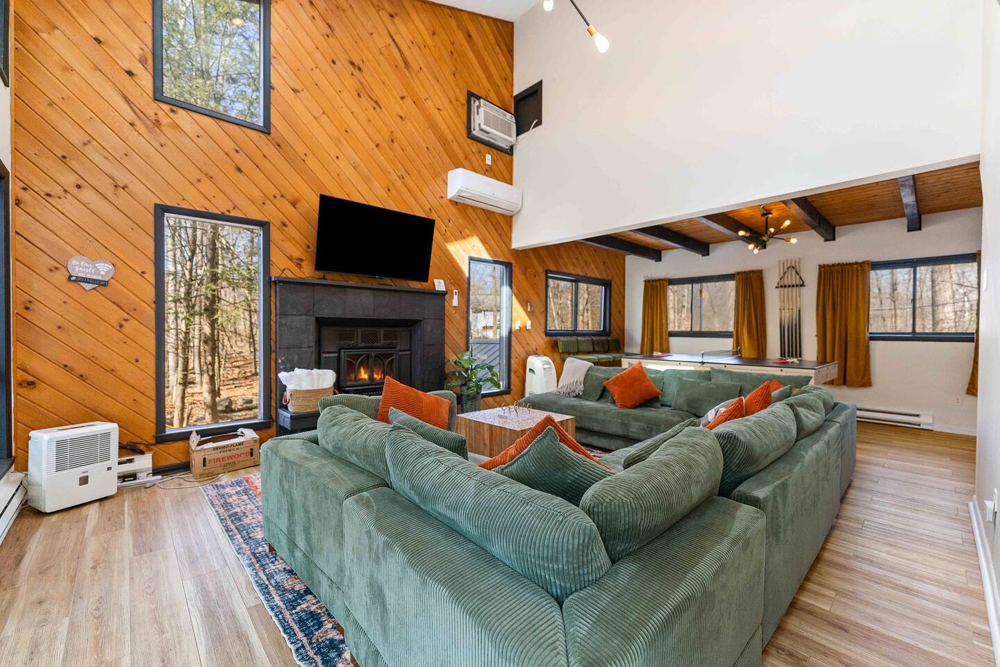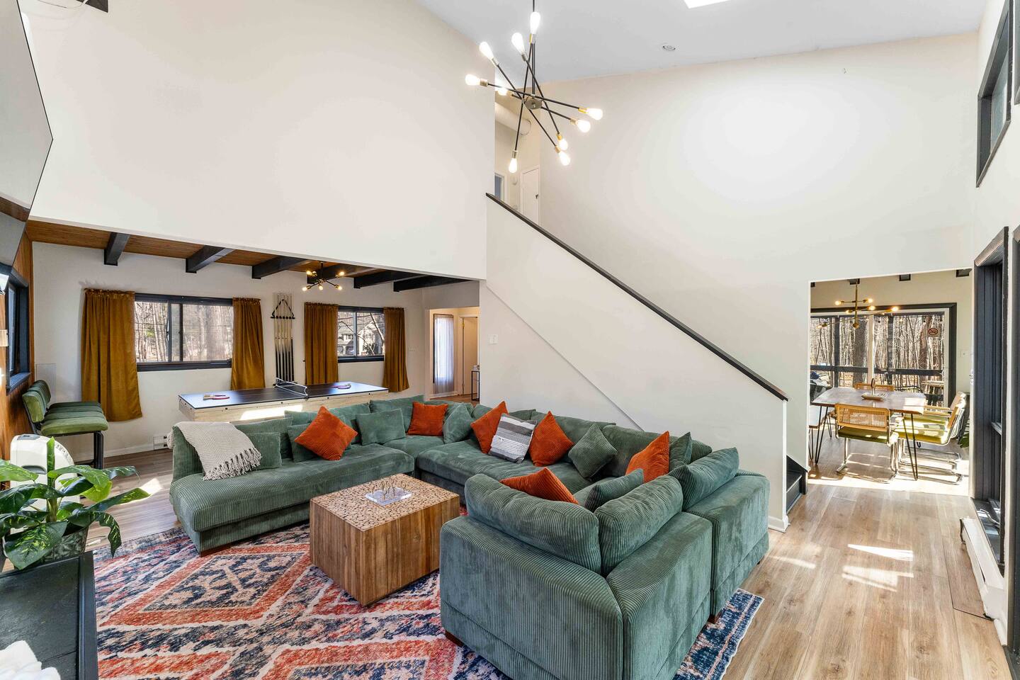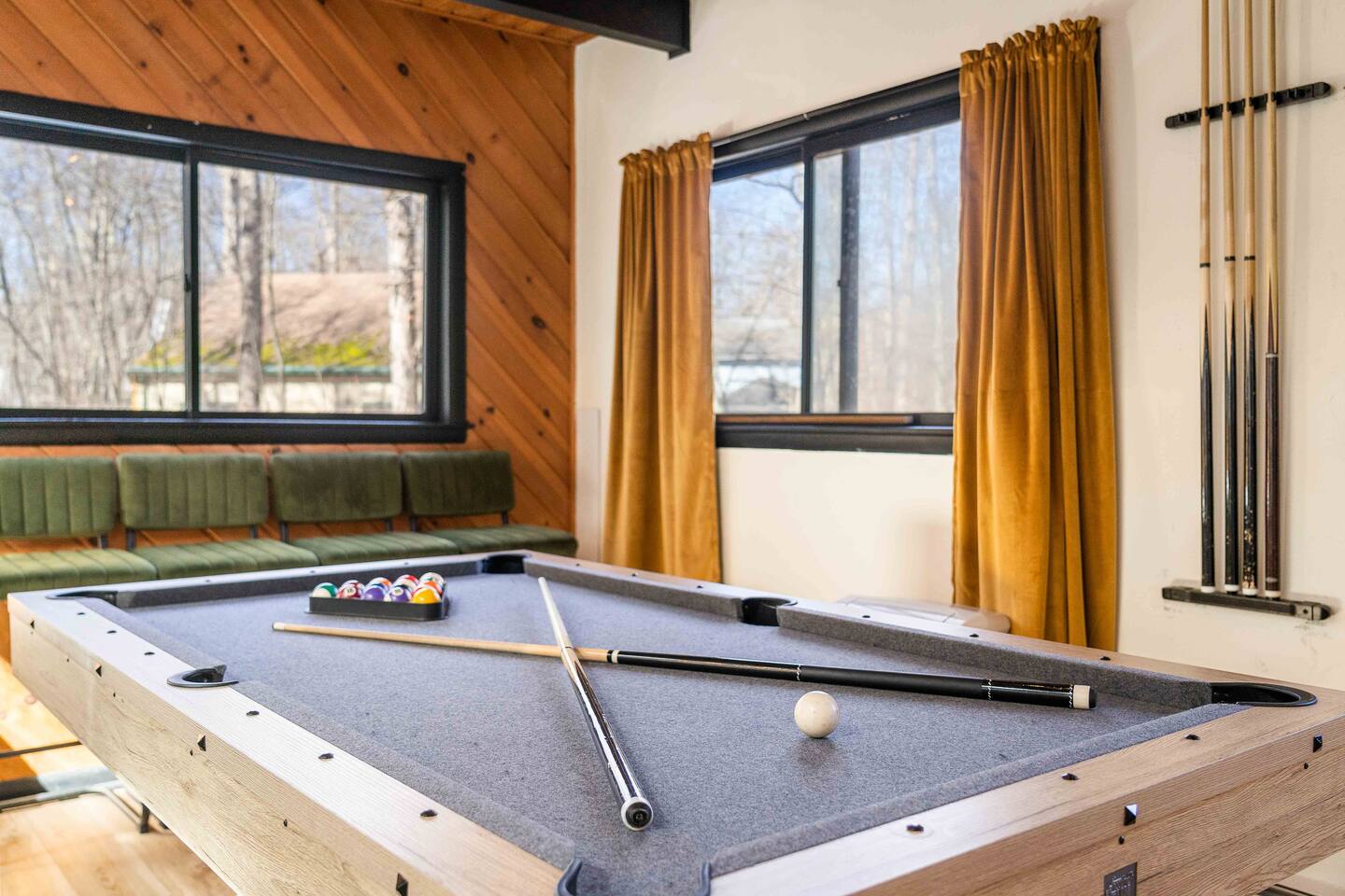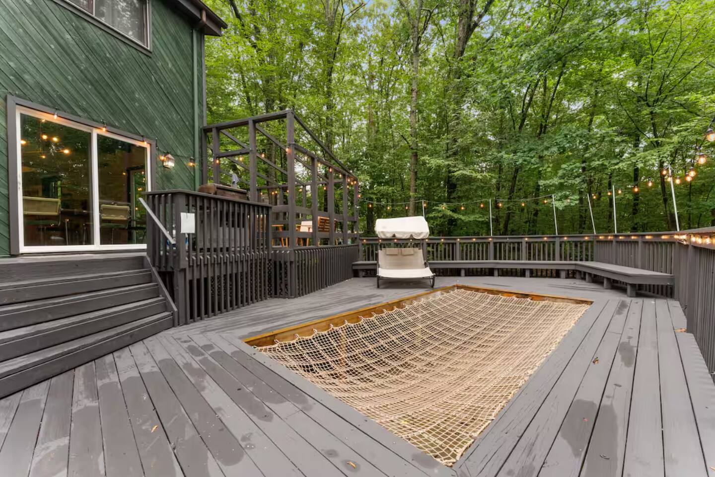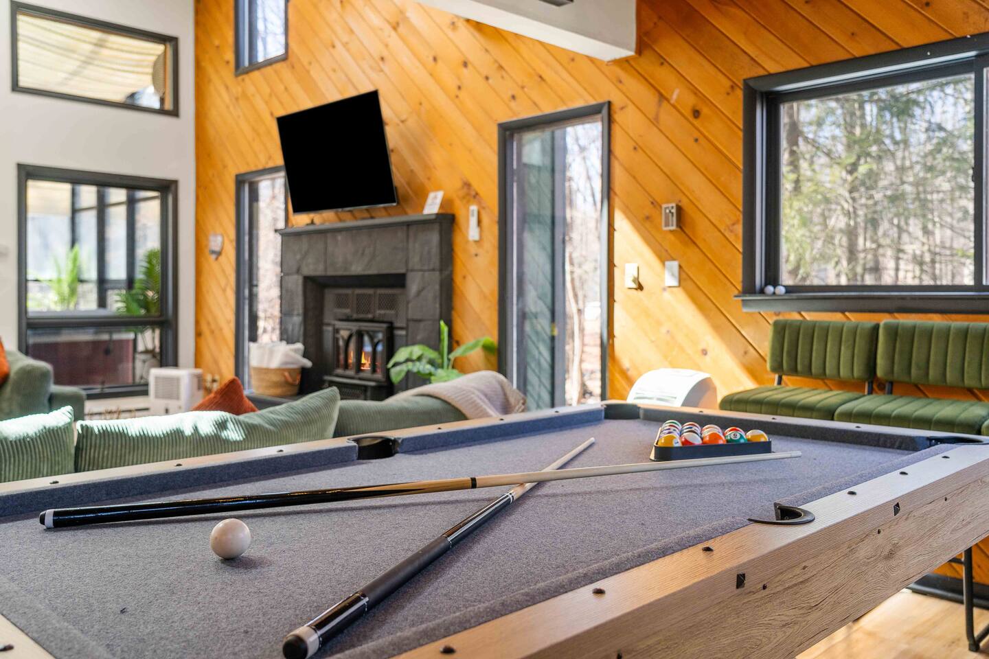 **During the summer months (Memorial Day weekend - Labor Day weekend), you will receive amenity badges that allow you to access the following amenities. If you’re staying with us outside of these dates, these amenities will be closed.** ☀ Lakes (with beach access - swimming allowed!) ☀ Pools ☀ Tennis courts ☀ Basketball courts ☀ Volleyball courts ☀ Dog park ☀ Playground areas KEY FEATURES: ☀ 5 gorgeous bedrooms; 4 kings, 1 full, and 2 twin beds (including one full-over-twin trundle) ☀ 3 full bathrooms; 1 on each floor! ☀ Modern kitchen ☀ Open, lofty living room with tall ceilings & comfy seating ☀ Beautiful dining area with direct access to the living room & back deck ☀ Private sunroom lounge chairs ☀ Stunning wraparound deck with gorgeous views of the surrounding forest & hot tub ☀ Massive net built into the deck to provide an immersive hammock experience ☀ Amenities loaded all around the outdoor space Here Are A Few Kind Words From Our Past Guests: “This was a great place to stay! The morning light through the windows was so beautiful. Overall, just a relaxing experience. The hosts were super responsive whenever I had a question. I would stay again!” - Emily “Sabrina was very accommodating and communicative. the house is beautiful and very comfortable, close to nature hikes.” - Jennifer “This place was lovely! Exactly as pictured! Very clean and excellent host experience!!! I plan to come back again!” - Regina ☆☆ BEDROOMS ☆☆ Right off of the game room on the bottom floor is a bedroom with a king bed & ensuite bathroom. Right across the hall is a second bedroom with a twin bed + a full-over-twin trundle. The top floor is filled with the remaining three bedrooms, each with king beds & gorgeous views of the Poconos forest. ☆☆ BATHROOMS ☆☆ Each floor has its own bathroom! On the bottom floor, the king bedroom has its own ensuite. The main level has a full common bathroom that is shared with the living spaces & kitchen. The top level has another full bathroom that is shared between all 3 remaining bedrooms. ☆☆ KITCHEN & DINING ☆☆ Beautiful, completely remodeled space! Modern appliances and open concept that flows into the dining room, with direct access to both the living space & out onto the deck. ☆☆ LIVING ROOM ☆☆ STUNNING central living room! Opens up right into the rest of the house, with high vaulted ceilings and beautiful modern design, coupled with the original cabin-charm of this house. Comfy seating, a smart TV, and lots of natural light pouring in, you will not want to leave this space! Right downstairs is an additional bonus lounge! With games (foosball and shuffleboard), more comfy seating, and another smart TV. This is such a unique space that you can enjoy under the snow falling on the lofty skylights, or as the sun beams shine through the walls of windows, no matter the season! ☆☆ OUTDOOR SPACE ☆☆ This is an outdoor space unlike any other in the Poconos! HUGE deck, tons of seating all around, lounge seating inside the sunroom, and a MASSIVE built-in net on the lower level of the deck, the provide you a fully immersive hammock experience as you enjoy the serene surrounding nature and listen to the peaceful sounds of the nearby running creek! Right down the steps from the deck, there is a private hot tub that backs up to the serene woodlands. Along with the peaceful setting of this home, you will also be able to enjoy grilling on the outdoor BBQ, cozying up next to the fire pit (propane), and exploring all around the private serenity of this home, as it's located at the end of a cul-de-sac with no other homes behind it! ★☆ Book Now & Let Us Take Care Of You In The Poconos! ☆★