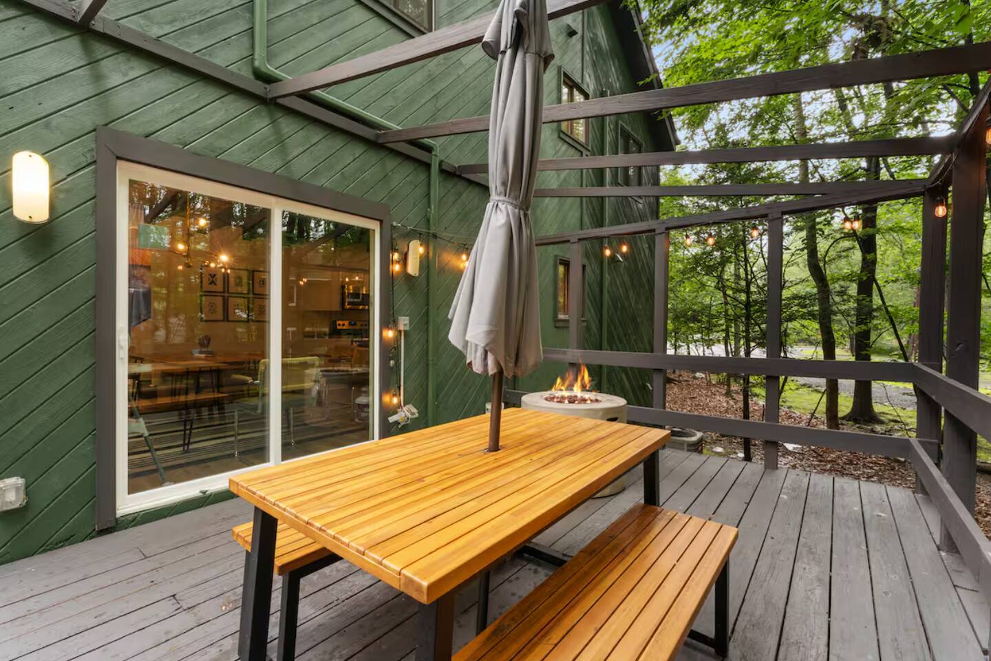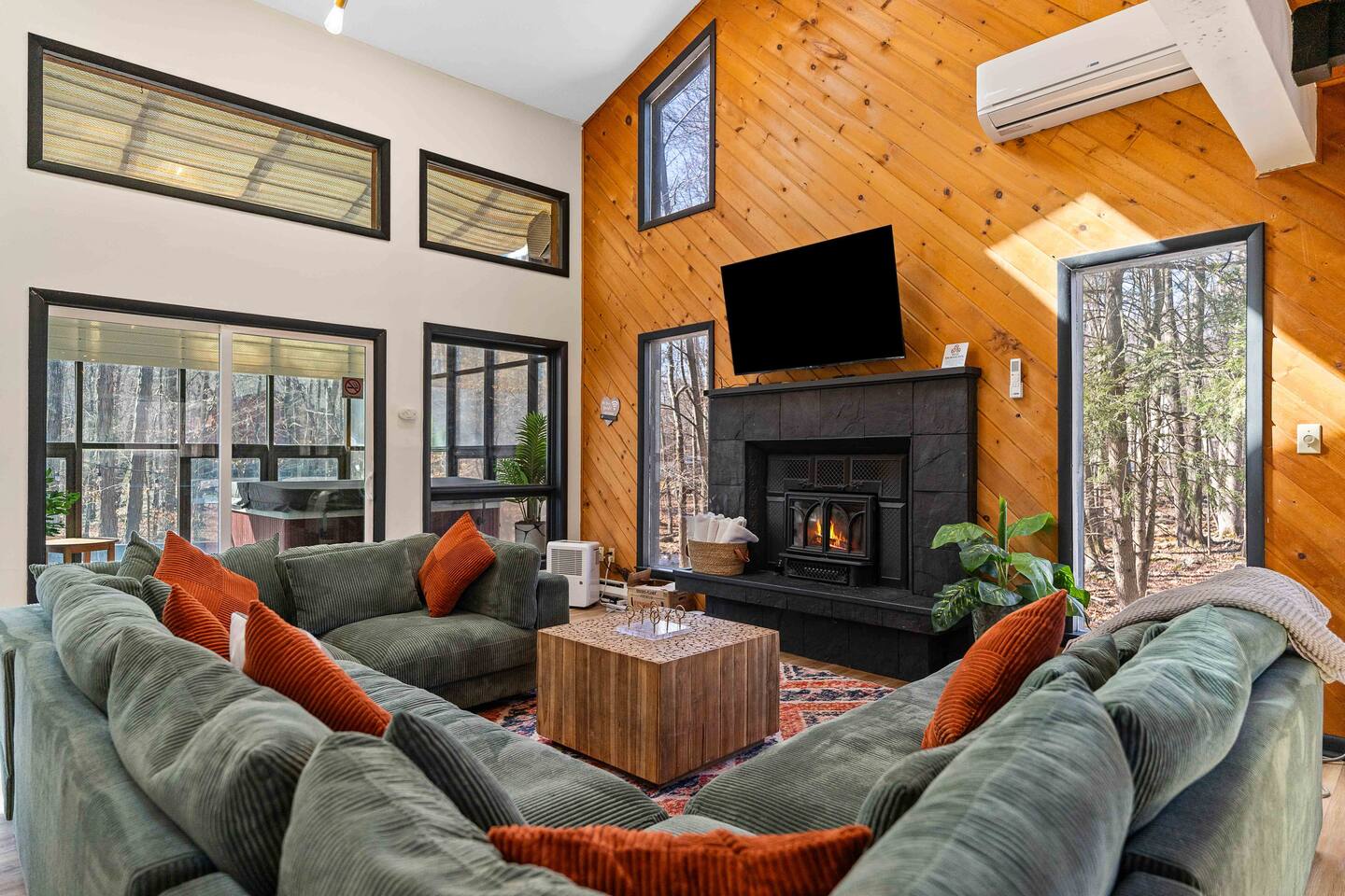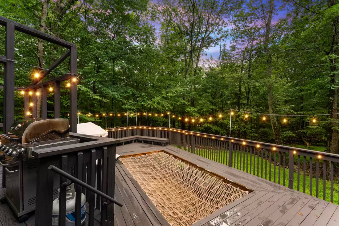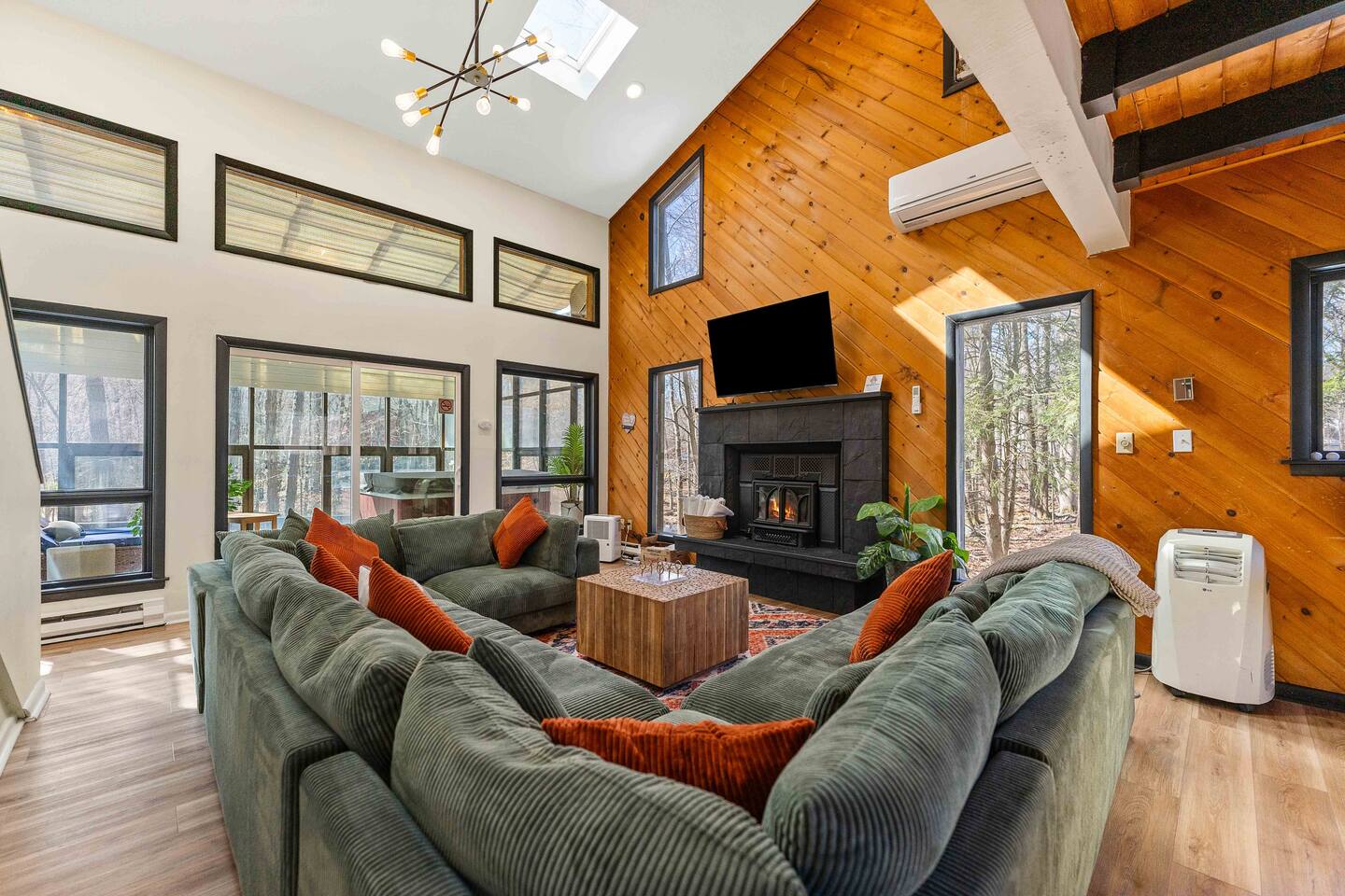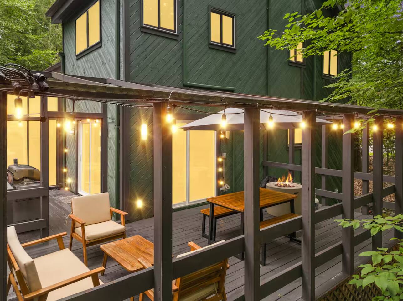 **During the summer months (Memorial Day weekend - Labor Day weekend), you will receive amenity badges that allow you to access the following amenities. If you’re staying with us outside of these dates, these amenities will be closed.** ☀ Lakes (with beach access - swimming allowed!) ☀ Pools ☀ Tennis courts ☀ Basketball courts ☀ Volleyball courts ☀ Dog park ☀ Playground areas KEY FEATURES: ☀ 5 gorgeous bedrooms; 4 kings, 1 full, and 2 twin beds (including one full-over-twin trundle) ☀ 3 full bathrooms; 1 on each floor! ☀ Modern kitchen ☀ Open, lofty living room with tall ceilings & comfy seating ☀ Beautiful dining area with direct access to the living room & back deck ☀ Private sunroom lounge chairs ☀ Stunning wraparound deck with gorgeous views of the surrounding forest & hot tub ☀ Massive net built into the deck to provide an immersive hammock experience ☀ Amenities loaded all around the outdoor space Here Are A Few Kind Words From Our Past Guests: “This was a great place to stay! The morning light through the windows was so beautiful. Overall, just a relaxing experience. The hosts were super responsive whenever I had a question. I would stay again!” - Emily “Sabrina was very accommodating and communicative. the house is beautiful and very comfortable, close to nature hikes.” - Jennifer “This place was lovely! Exactly as pictured! Very clean and excellent host experience!!! I plan to come back again!” - Regina ☆☆ BEDROOMS ☆☆ Right off of the game room on the bottom floor is a bedroom with a king bed & ensuite bathroom. Right across the hall is a second bedroom with a twin bed + a full-over-twin trundle. The top floor is filled with the remaining three bedrooms, each with king beds & gorgeous views of the Poconos forest. ☆☆ BATHROOMS ☆☆ Each floor has its own bathroom! On the bottom floor, the king bedroom has its own ensuite. The main level has a full common bathroom that is shared with the living spaces & kitchen. The top level has another full bathroom that is shared between all 3 remaining bedrooms. ☆☆ KITCHEN & DINING ☆☆ Beautiful, completely remodeled space! Modern appliances and open concept that flows into the dining room, with direct access to both the living space & out onto the deck. ☆☆ LIVING ROOM ☆☆ STUNNING central living room! Opens up right into the rest of the house, with high vaulted ceilings and beautiful modern design, coupled with the original cabin-charm of this house. Comfy seating, a smart TV, and lots of natural light pouring in, you will not want to leave this space! Right downstairs is an additional bonus lounge! With games (foosball and shuffleboard), more comfy seating, and another smart TV. This is such a unique space that you can enjoy under the snow falling on the lofty skylights, or as the sun beams shine through the walls of windows, no matter the season! ☆☆ OUTDOOR SPACE ☆☆ This is an outdoor space unlike any other in the Poconos! HUGE deck, tons of seating all around, lounge seating inside the sunroom, and a MASSIVE built-in net on the lower level of the deck, the provide you a fully immersive hammock experience as you enjoy the serene surrounding nature and listen to the peaceful sounds of the nearby running creek! Right down the steps from the deck, there is a private hot tub that backs up to the serene woodlands. Along with the peaceful setting of this home, you will also be able to enjoy grilling on the outdoor BBQ, cozying up next to the fire pit (propane), and exploring all around the private serenity of this home, as it's located at the end of a cul-de-sac with no other homes behind it! ★☆ Book Now & Let Us Take Care Of You In The Poconos! ☆★