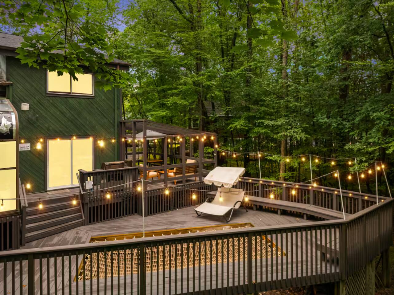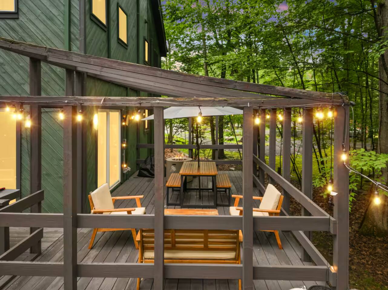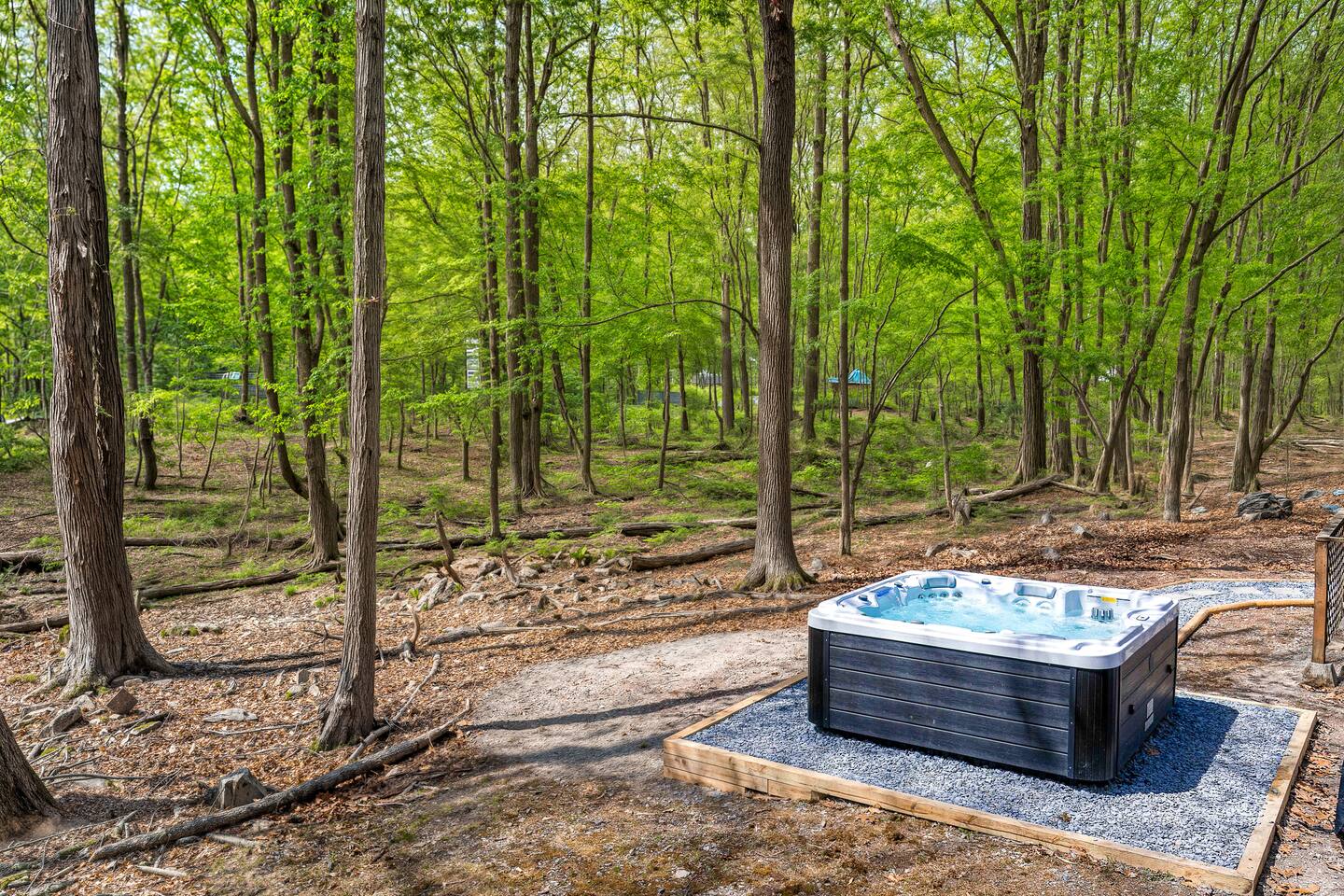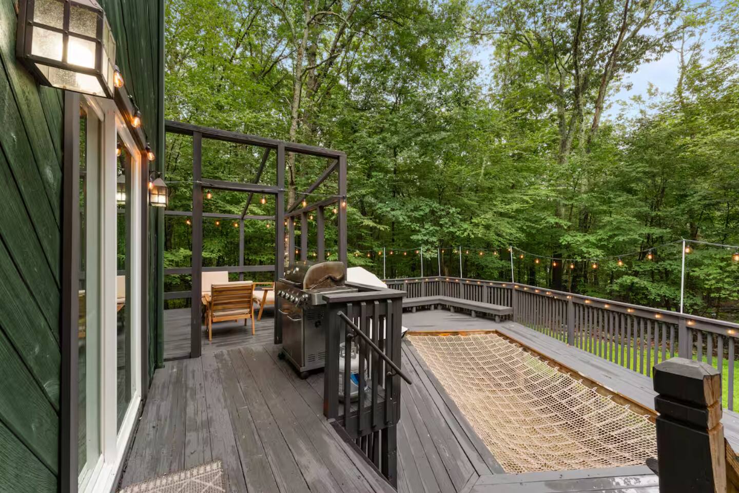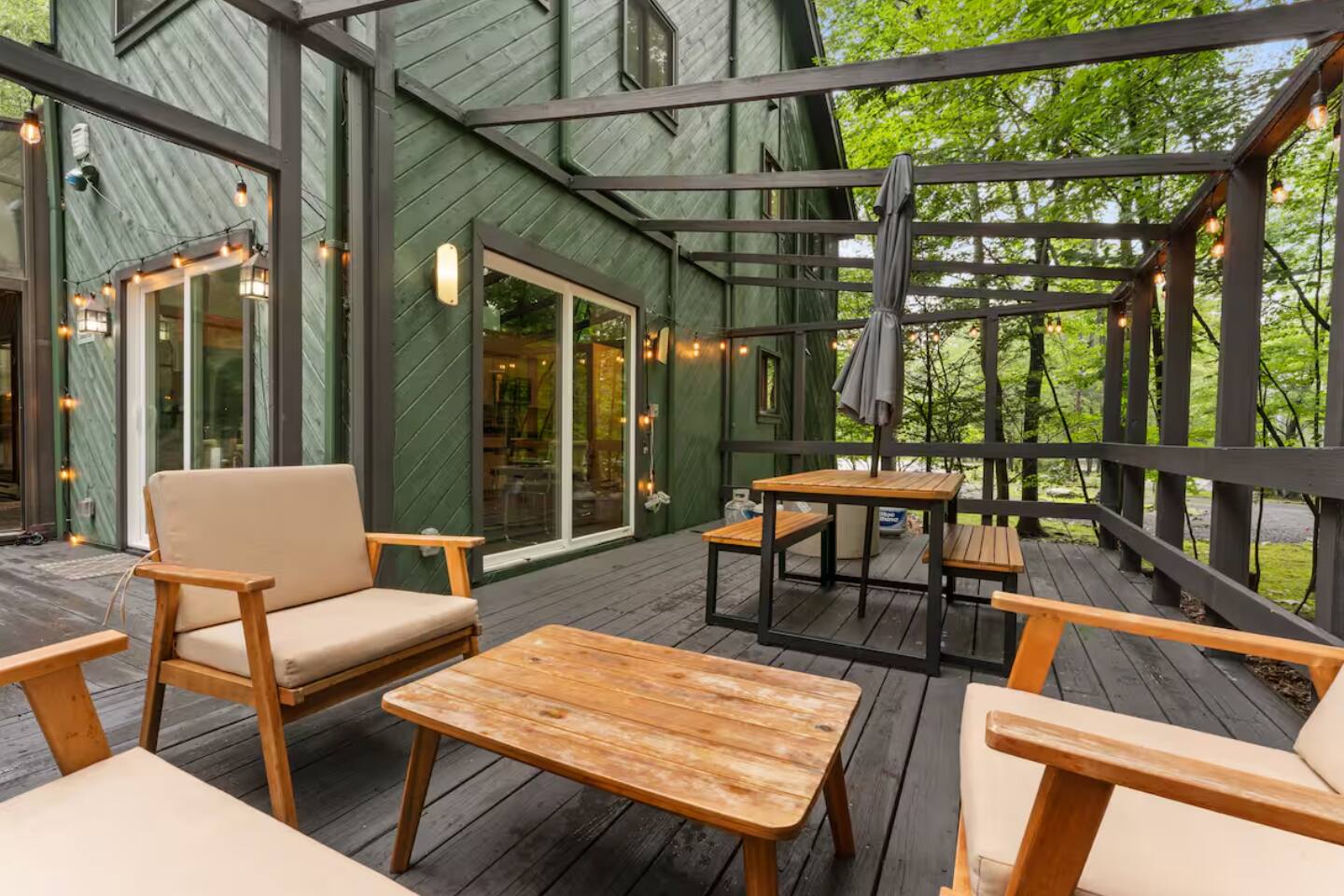 **During the summer months (Memorial Day weekend - Labor Day weekend), you will receive amenity badges that allow you to access the following amenities. If you’re staying with us outside of these dates, these amenities will be closed.** ☀ Lakes (with beach access - swimming allowed!) ☀ Pools ☀ Tennis courts ☀ Basketball courts ☀ Volleyball courts ☀ Dog park ☀ Playground areas KEY FEATURES: ☀ 5 gorgeous bedrooms; 4 kings, 1 full, and 2 twin beds (including one full-over-twin trundle) ☀ 3 full bathrooms; 1 on each floor! ☀ Modern kitchen ☀ Open, lofty living room with tall ceilings & comfy seating ☀ Beautiful dining area with direct access to the living room & back deck ☀ Private sunroom lounge chairs ☀ Stunning wraparound deck with gorgeous views of the surrounding forest & hot tub ☀ Massive net built into the deck to provide an immersive hammock experience ☀ Amenities loaded all around the outdoor space Here Are A Few Kind Words From Our Past Guests: “This was a great place to stay! The morning light through the windows was so beautiful. Overall, just a relaxing experience. The hosts were super responsive whenever I had a question. I would stay again!” - Emily “Sabrina was very accommodating and communicative. the house is beautiful and very comfortable, close to nature hikes.” - Jennifer “This place was lovely! Exactly as pictured! Very clean and excellent host experience!!! I plan to come back again!” - Regina ☆☆ BEDROOMS ☆☆ Right off of the game room on the bottom floor is a bedroom with a king bed & ensuite bathroom. Right across the hall is a second bedroom with a twin bed + a full-over-twin trundle. The top floor is filled with the remaining three bedrooms, each with king beds & gorgeous views of the Poconos forest. ☆☆ BATHROOMS ☆☆ Each floor has its own bathroom! On the bottom floor, the king bedroom has its own ensuite. The main level has a full common bathroom that is shared with the living spaces & kitchen. The top level has another full bathroom that is shared between all 3 remaining bedrooms. ☆☆ KITCHEN & DINING ☆☆ Beautiful, completely remodeled space! Modern appliances and open concept that flows into the dining room, with direct access to both the living space & out onto the deck. ☆☆ LIVING ROOM ☆☆ STUNNING central living room! Opens up right into the rest of the house, with high vaulted ceilings and beautiful modern design, coupled with the original cabin-charm of this house. Comfy seating, a smart TV, and lots of natural light pouring in, you will not want to leave this space! Right downstairs is an additional bonus lounge! With games (foosball and shuffleboard), more comfy seating, and another smart TV. This is such a unique space that you can enjoy under the snow falling on the lofty skylights, or as the sun beams shine through the walls of windows, no matter the season! ☆☆ OUTDOOR SPACE ☆☆ This is an outdoor space unlike any other in the Poconos! HUGE deck, tons of seating all around, lounge seating inside the sunroom, and a MASSIVE built-in net on the lower level of the deck, the provide you a fully immersive hammock experience as you enjoy the serene surrounding nature and listen to the peaceful sounds of the nearby running creek! Right down the steps from the deck, there is a private hot tub that backs up to the serene woodlands. Along with the peaceful setting of this home, you will also be able to enjoy grilling on the outdoor BBQ, cozying up next to the fire pit (propane), and exploring all around the private serenity of this home, as it's located at the end of a cul-de-sac with no other homes behind it! ★☆ Book Now & Let Us Take Care Of You In The Poconos! ☆★