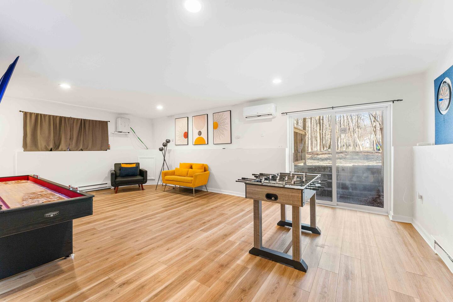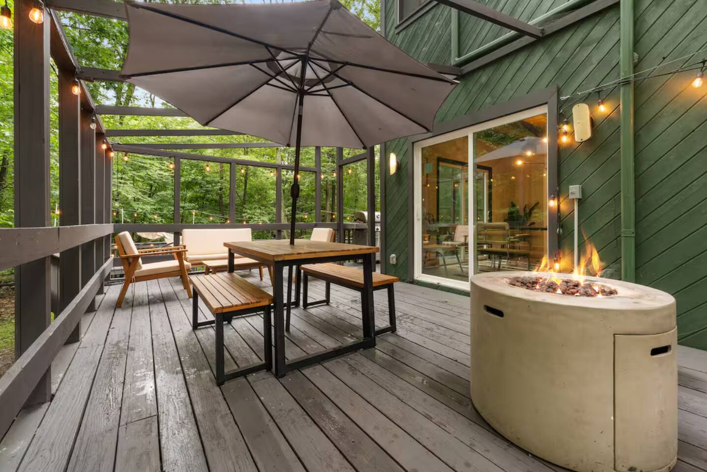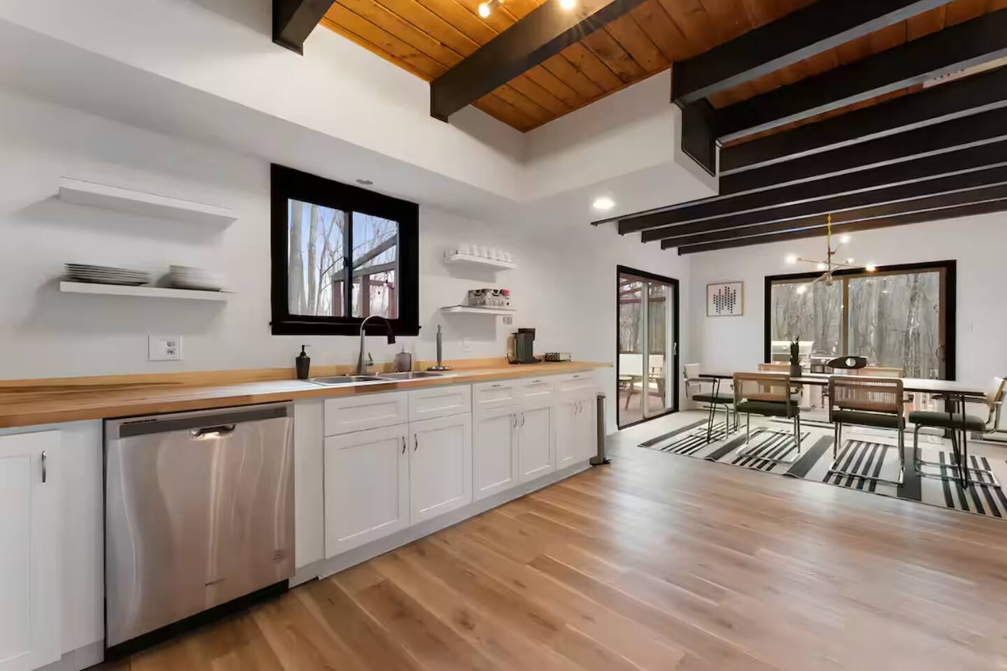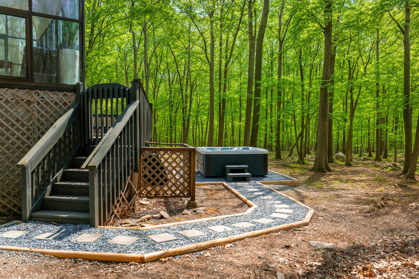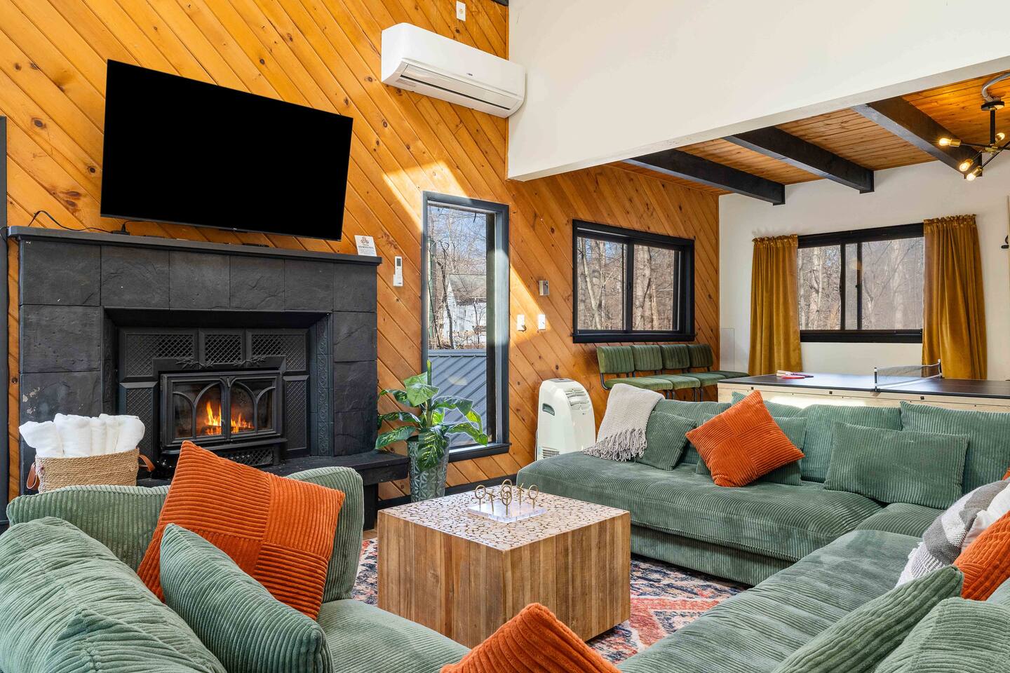 **During the summer months (Memorial Day weekend - Labor Day weekend), you will receive amenity badges that allow you to access the following amenities. If you’re staying with us outside of these dates, these amenities will be closed.** ☀ Lakes (with beach access - swimming allowed!) ☀ Pools ☀ Tennis courts ☀ Basketball courts ☀ Volleyball courts ☀ Dog park ☀ Playground areas KEY FEATURES: ☀ 5 gorgeous bedrooms; 4 kings, 1 full, and 2 twin beds (including one full-over-twin trundle) ☀ 3 full bathrooms; 1 on each floor! ☀ Modern kitchen ☀ Open, lofty living room with tall ceilings & comfy seating ☀ Beautiful dining area with direct access to the living room & back deck ☀ Private sunroom lounge chairs ☀ Stunning wraparound deck with gorgeous views of the surrounding forest & hot tub ☀ Massive net built into the deck to provide an immersive hammock experience ☀ Amenities loaded all around the outdoor space Here Are A Few Kind Words From Our Past Guests: “This was a great place to stay! The morning light through the windows was so beautiful. Overall, just a relaxing experience. The hosts were super responsive whenever I had a question. I would stay again!” - Emily “Sabrina was very accommodating and communicative. the house is beautiful and very comfortable, close to nature hikes.” - Jennifer “This place was lovely! Exactly as pictured! Very clean and excellent host experience!!! I plan to come back again!” - Regina ☆☆ BEDROOMS ☆☆ Right off of the game room on the bottom floor is a bedroom with a king bed & ensuite bathroom. Right across the hall is a second bedroom with a twin bed + a full-over-twin trundle. The top floor is filled with the remaining three bedrooms, each with king beds & gorgeous views of the Poconos forest. ☆☆ BATHROOMS ☆☆ Each floor has its own bathroom! On the bottom floor, the king bedroom has its own ensuite. The main level has a full common bathroom that is shared with the living spaces & kitchen. The top level has another full bathroom that is shared between all 3 remaining bedrooms. ☆☆ KITCHEN & DINING ☆☆ Beautiful, completely remodeled space! Modern appliances and open concept that flows into the dining room, with direct access to both the living space & out onto the deck. ☆☆ LIVING ROOM ☆☆ STUNNING central living room! Opens up right into the rest of the house, with high vaulted ceilings and beautiful modern design, coupled with the original cabin-charm of this house. Comfy seating, a smart TV, and lots of natural light pouring in, you will not want to leave this space! Right downstairs is an additional bonus lounge! With games (foosball and shuffleboard), more comfy seating, and another smart TV. This is such a unique space that you can enjoy under the snow falling on the lofty skylights, or as the sun beams shine through the walls of windows, no matter the season! ☆☆ OUTDOOR SPACE ☆☆ This is an outdoor space unlike any other in the Poconos! HUGE deck, tons of seating all around, lounge seating inside the sunroom, and a MASSIVE built-in net on the lower level of the deck, the provide you a fully immersive hammock experience as you enjoy the serene surrounding nature and listen to the peaceful sounds of the nearby running creek! Right down the steps from the deck, there is a private hot tub that backs up to the serene woodlands. Along with the peaceful setting of this home, you will also be able to enjoy grilling on the outdoor BBQ, cozying up next to the fire pit (propane), and exploring all around the private serenity of this home, as it's located at the end of a cul-de-sac with no other homes behind it! ★☆ Book Now & Let Us Take Care Of You In The Poconos! ☆★