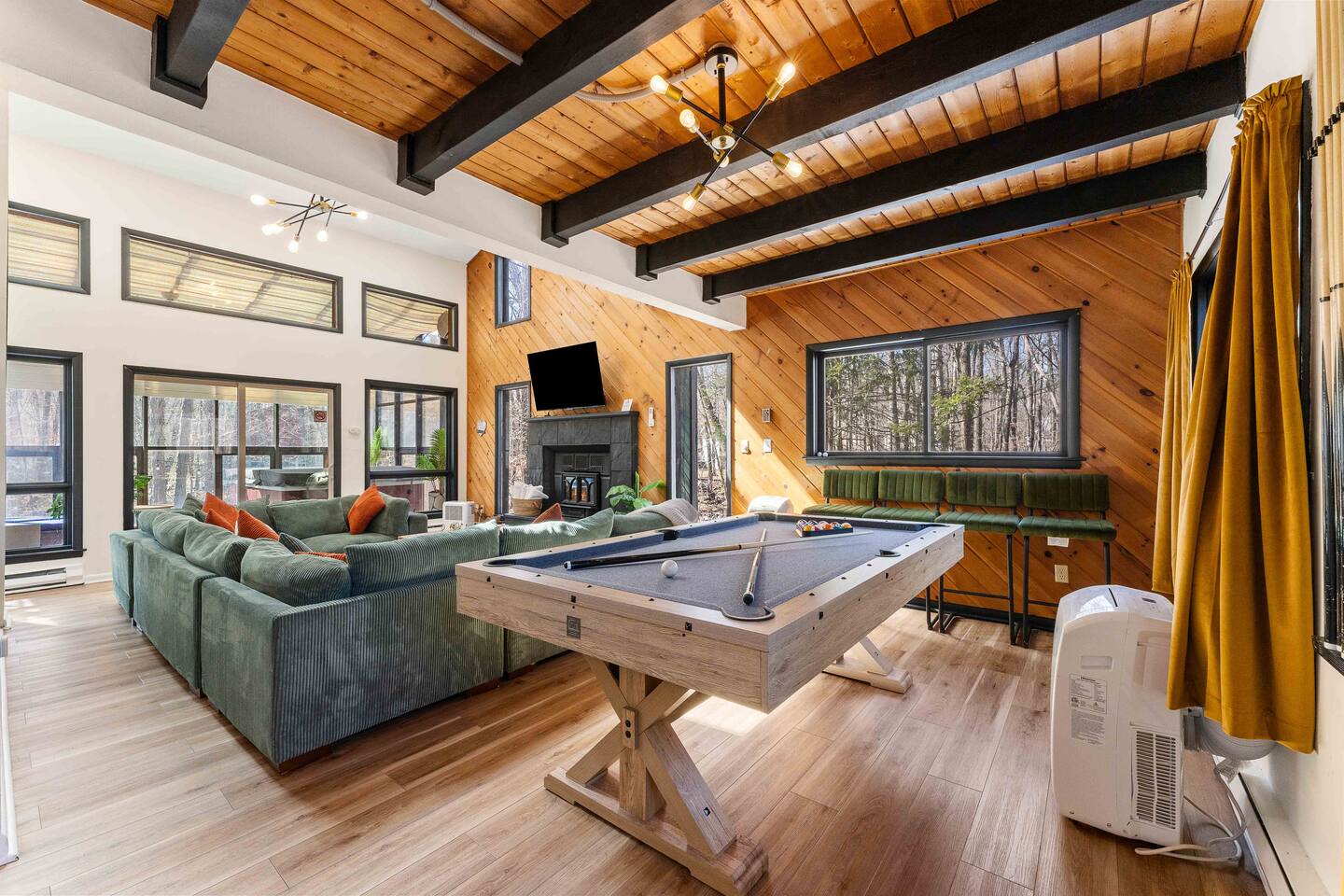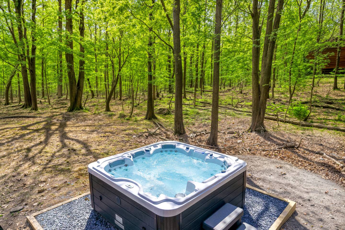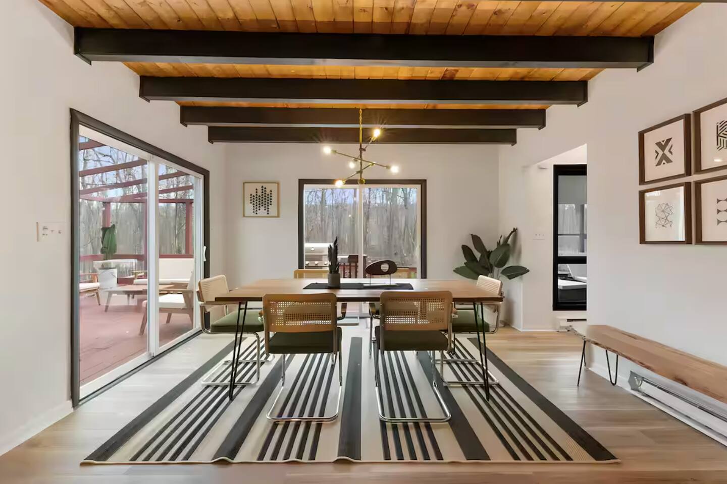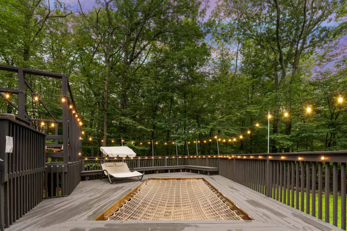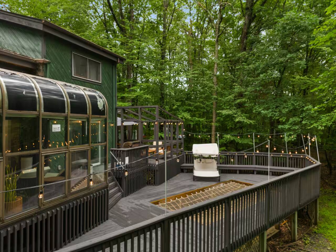 **During the summer months (Memorial Day weekend - Labor Day weekend), you will receive amenity badges that allow you to access the following amenities. If you’re staying with us outside of these dates, these amenities will be closed.** ☀ Lakes (with beach access - swimming allowed!) ☀ Pools ☀ Tennis courts ☀ Basketball courts ☀ Volleyball courts ☀ Dog park ☀ Playground areas KEY FEATURES: ☀ 5 gorgeous bedrooms; 4 kings, 1 full, and 2 twin beds (including one full-over-twin trundle) ☀ 3 full bathrooms; 1 on each floor! ☀ Modern kitchen ☀ Open, lofty living room with tall ceilings & comfy seating ☀ Beautiful dining area with direct access to the living room & back deck ☀ Private sunroom lounge chairs ☀ Stunning wraparound deck with gorgeous views of the surrounding forest & hot tub ☀ Massive net built into the deck to provide an immersive hammock experience ☀ Amenities loaded all around the outdoor space Here Are A Few Kind Words From Our Past Guests: “This was a great place to stay! The morning light through the windows was so beautiful. Overall, just a relaxing experience. The hosts were super responsive whenever I had a question. I would stay again!” - Emily “Sabrina was very accommodating and communicative. the house is beautiful and very comfortable, close to nature hikes.” - Jennifer “This place was lovely! Exactly as pictured! Very clean and excellent host experience!!! I plan to come back again!” - Regina ☆☆ BEDROOMS ☆☆ Right off of the game room on the bottom floor is a bedroom with a king bed & ensuite bathroom. Right across the hall is a second bedroom with a twin bed + a full-over-twin trundle. The top floor is filled with the remaining three bedrooms, each with king beds & gorgeous views of the Poconos forest. ☆☆ BATHROOMS ☆☆ Each floor has its own bathroom! On the bottom floor, the king bedroom has its own ensuite. The main level has a full common bathroom that is shared with the living spaces & kitchen. The top level has another full bathroom that is shared between all 3 remaining bedrooms. ☆☆ KITCHEN & DINING ☆☆ Beautiful, completely remodeled space! Modern appliances and open concept that flows into the dining room, with direct access to both the living space & out onto the deck. ☆☆ LIVING ROOM ☆☆ STUNNING central living room! Opens up right into the rest of the house, with high vaulted ceilings and beautiful modern design, coupled with the original cabin-charm of this house. Comfy seating, a smart TV, and lots of natural light pouring in, you will not want to leave this space! Right downstairs is an additional bonus lounge! With games (foosball and shuffleboard), more comfy seating, and another smart TV. This is such a unique space that you can enjoy under the snow falling on the lofty skylights, or as the sun beams shine through the walls of windows, no matter the season! ☆☆ OUTDOOR SPACE ☆☆ This is an outdoor space unlike any other in the Poconos! HUGE deck, tons of seating all around, lounge seating inside the sunroom, and a MASSIVE built-in net on the lower level of the deck, the provide you a fully immersive hammock experience as you enjoy the serene surrounding nature and listen to the peaceful sounds of the nearby running creek! Right down the steps from the deck, there is a private hot tub that backs up to the serene woodlands. Along with the peaceful setting of this home, you will also be able to enjoy grilling on the outdoor BBQ, cozying up next to the fire pit (propane), and exploring all around the private serenity of this home, as it's located at the end of a cul-de-sac with no other homes behind it! ★☆ Book Now & Let Us Take Care Of You In The Poconos! ☆★